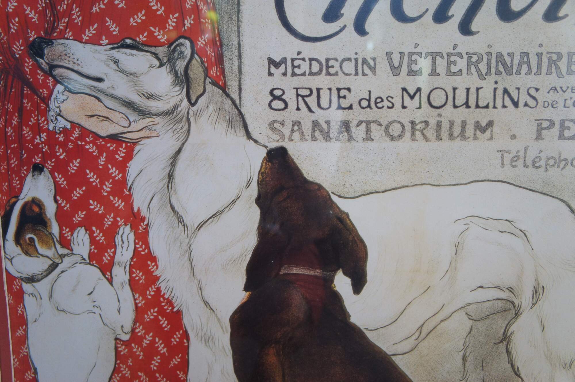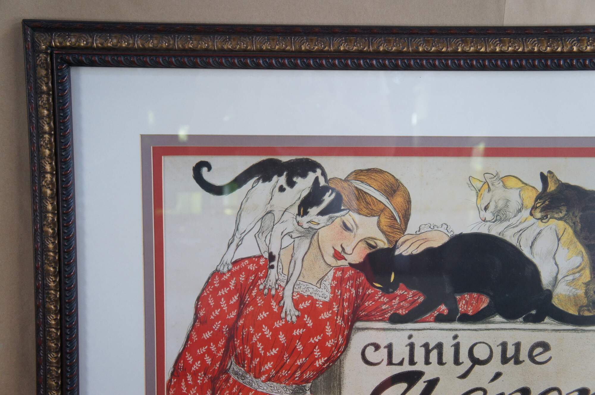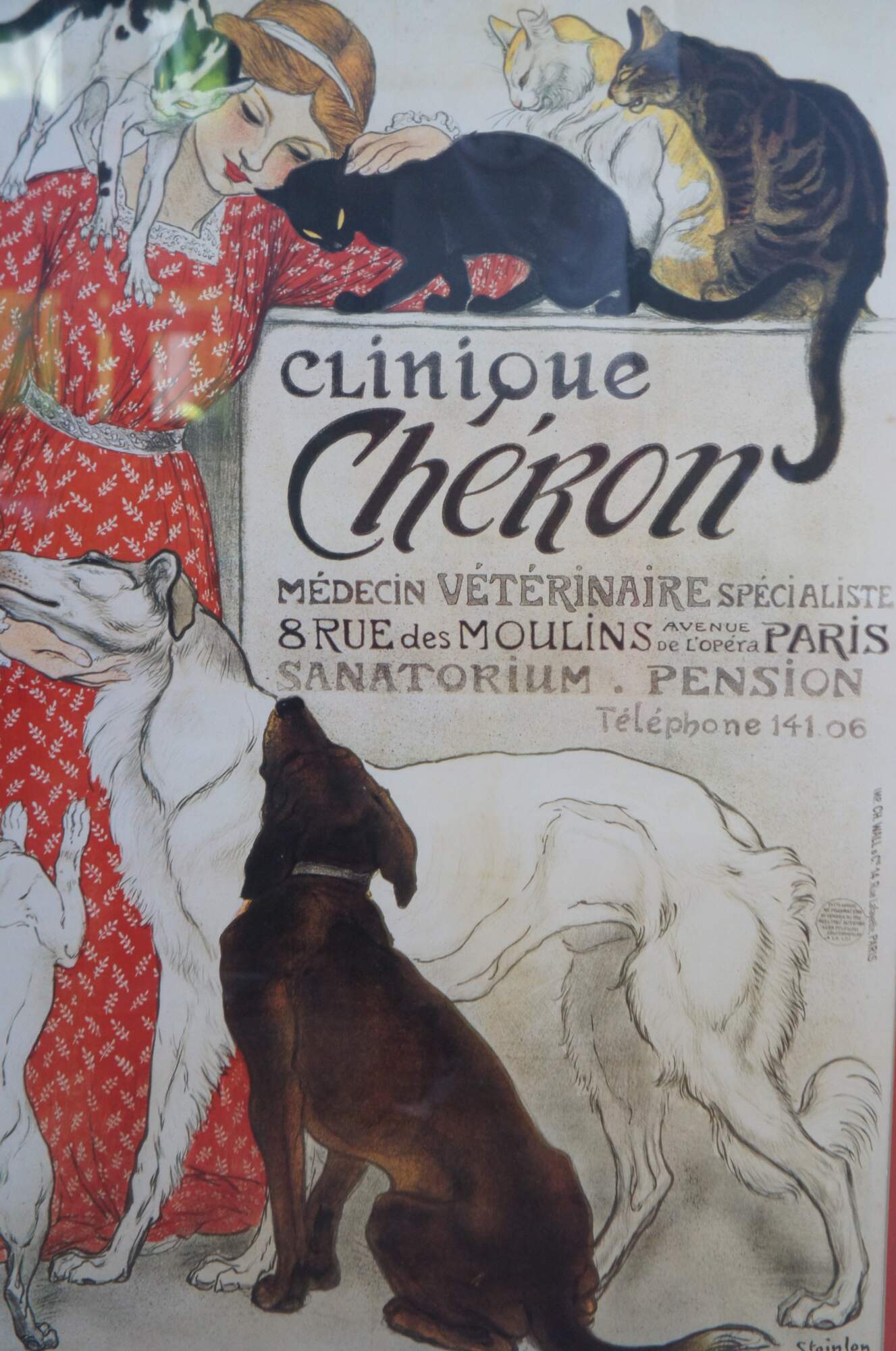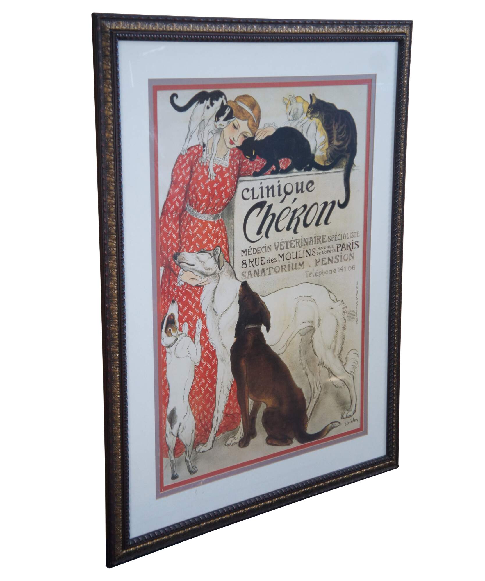 Vintage Bassett Fine Art framed print of Steinlens Clinique Cheron in Paris France. The advertisement for Veterinary Medicine features a woman in a red dress posing with cats and dogs. Bassett Fine Art, a Division of Bassett Mirror Co, Item 9300-644