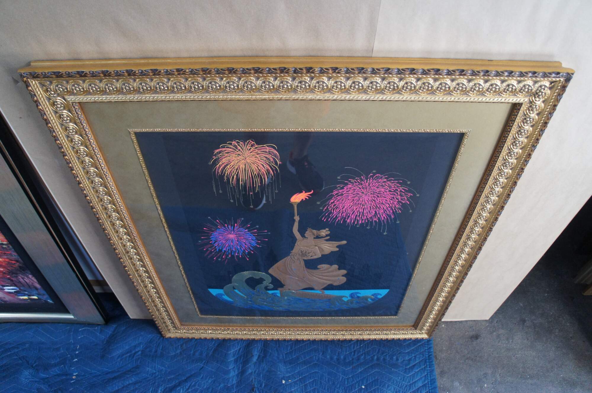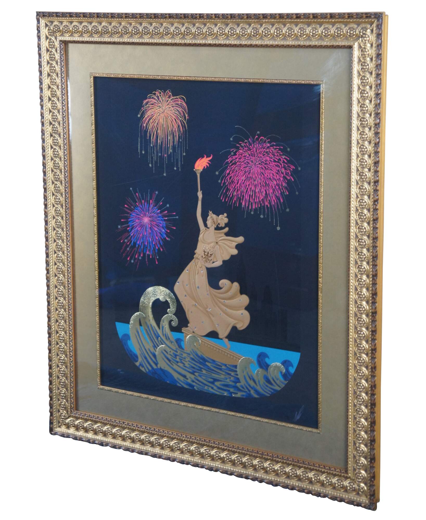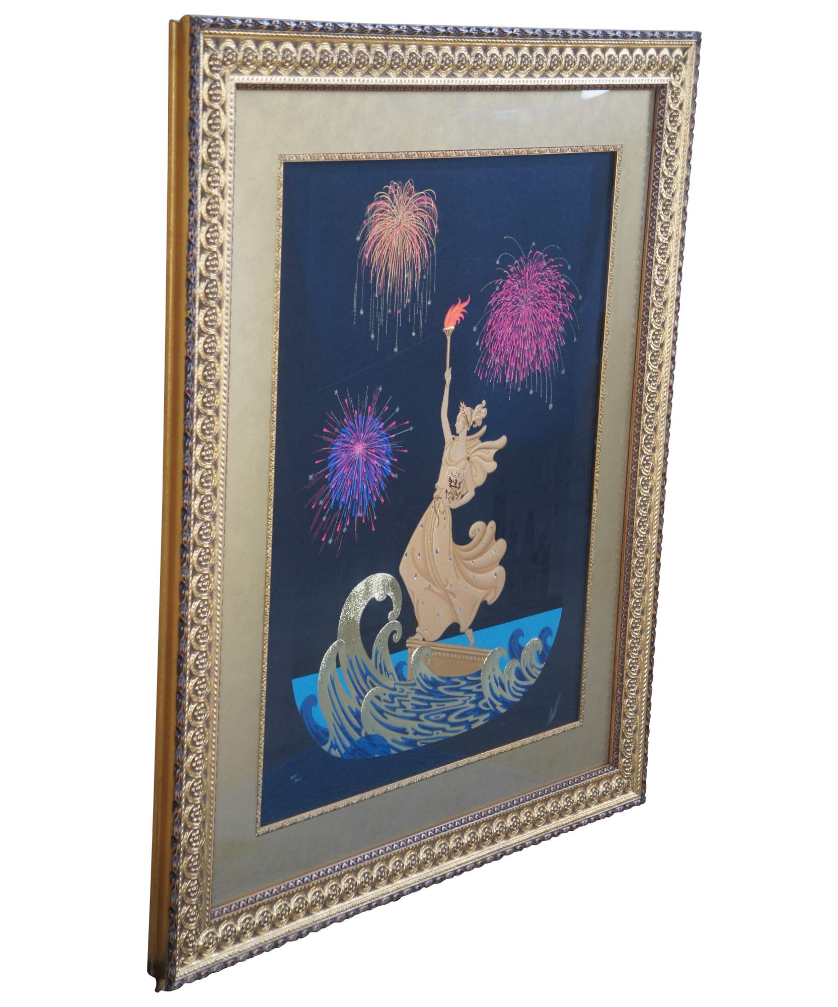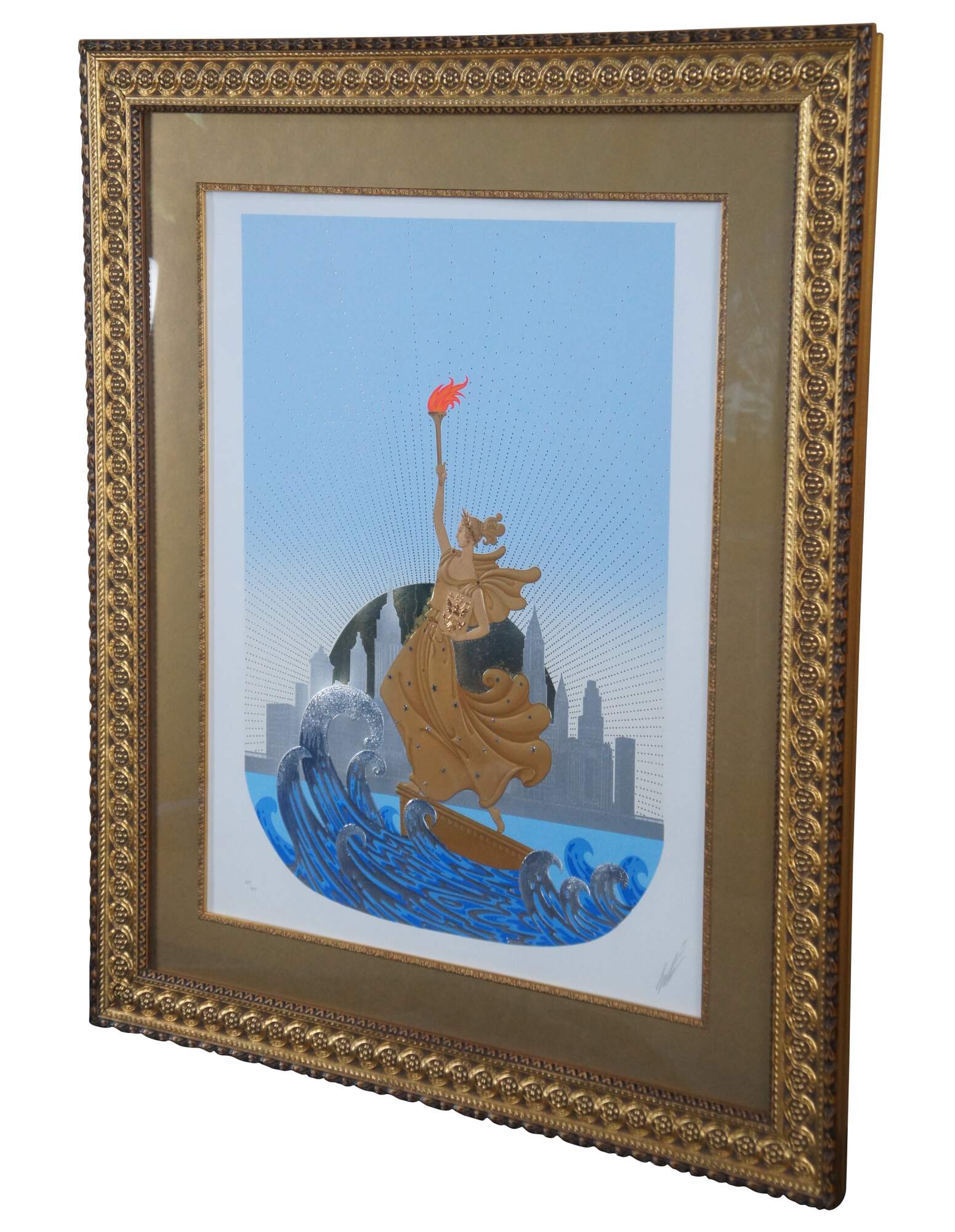 Vintage pair of embossed metallic Art Deco style serigraphs by Erte, circa 1986. The prints feature the famous Statue of Liberty in both day and night settings. The day print features a seascape with her majesty surfing the waves with her outstretched torch against a sunrise and silhouette of New York City. The night print shows similar, with fireworks lighting up the night sky. Both signed lower right and numbered 227 of 300. Framed in ornate gold with an infinity flower / floral motif.