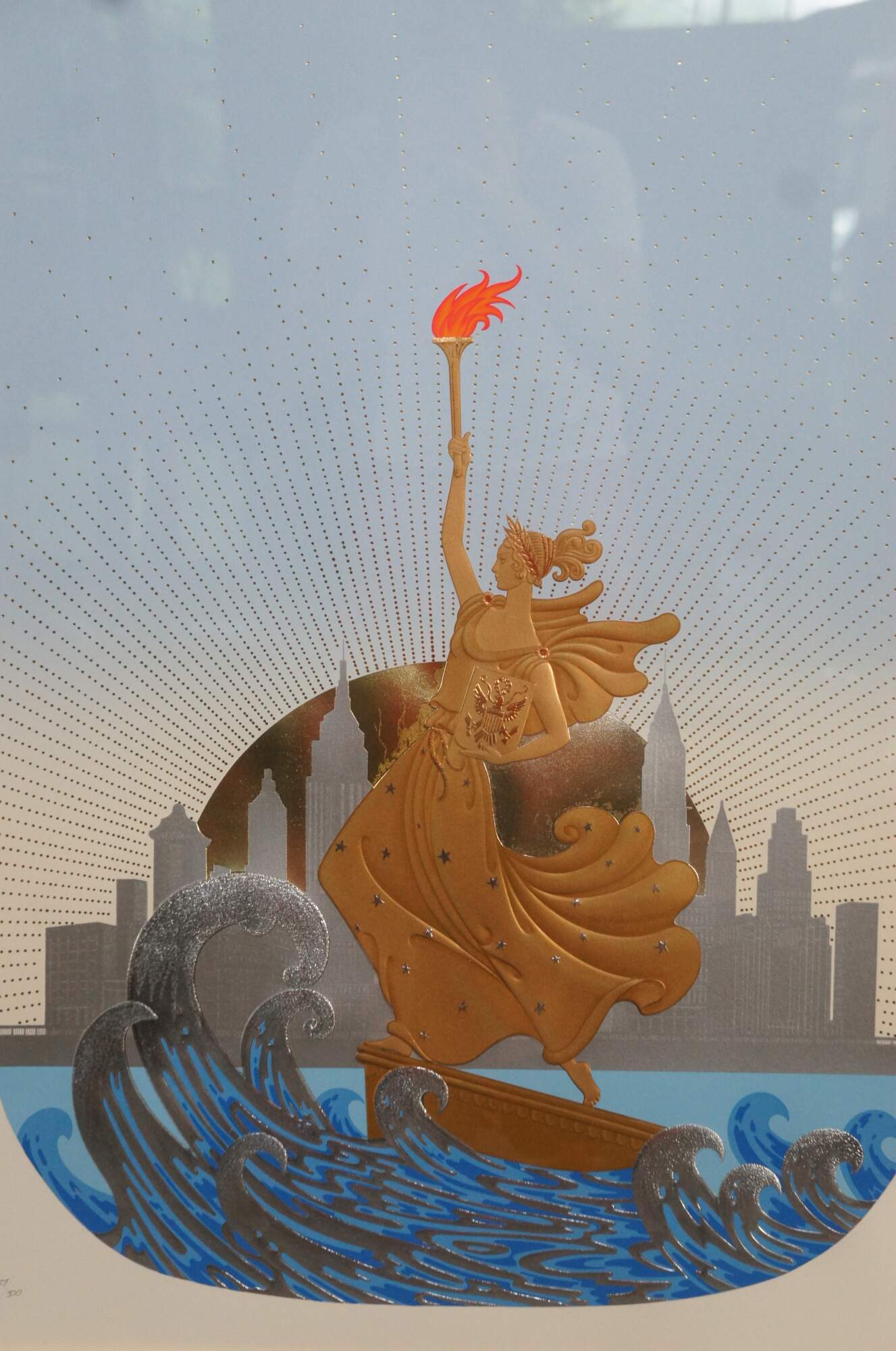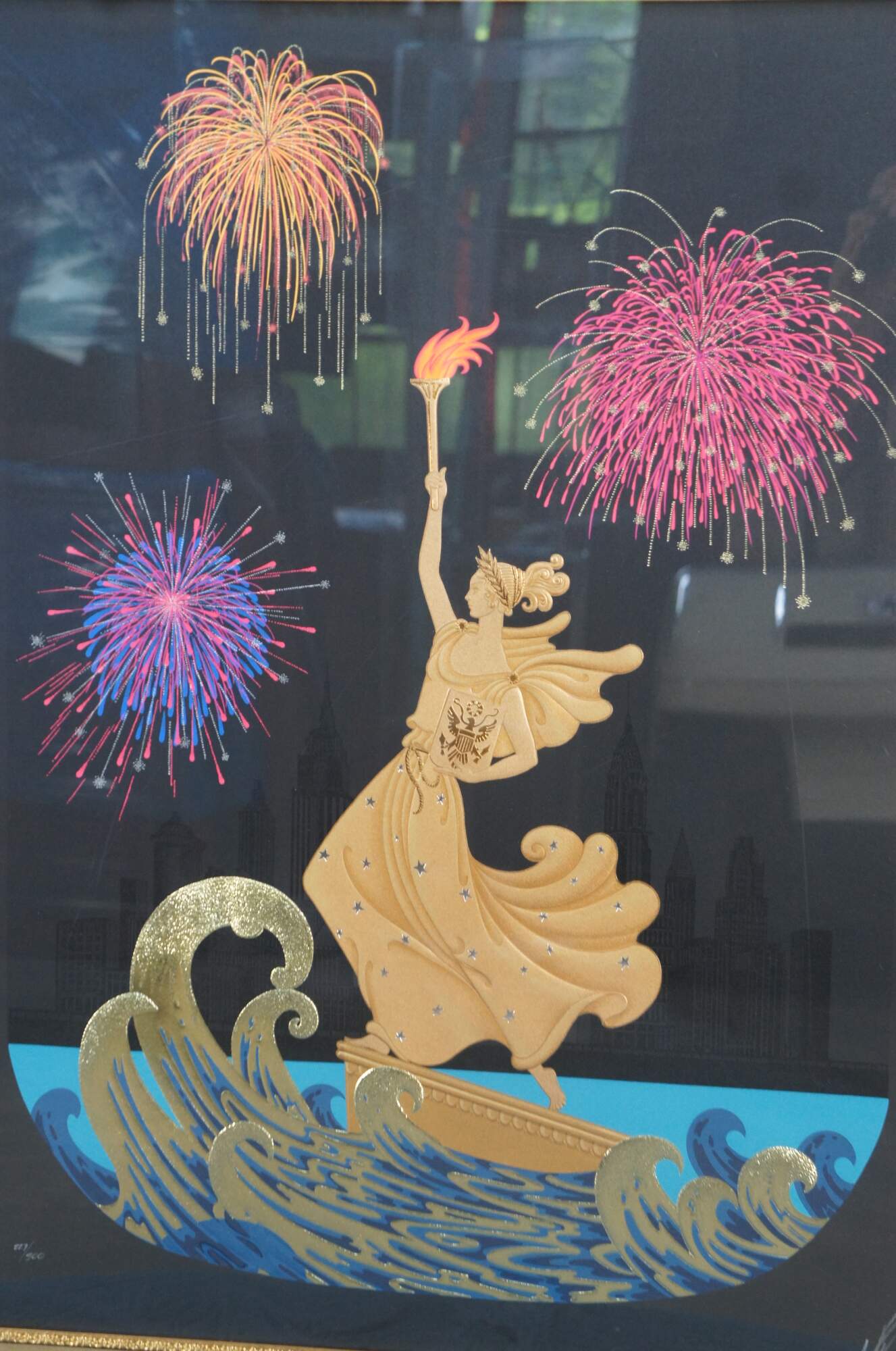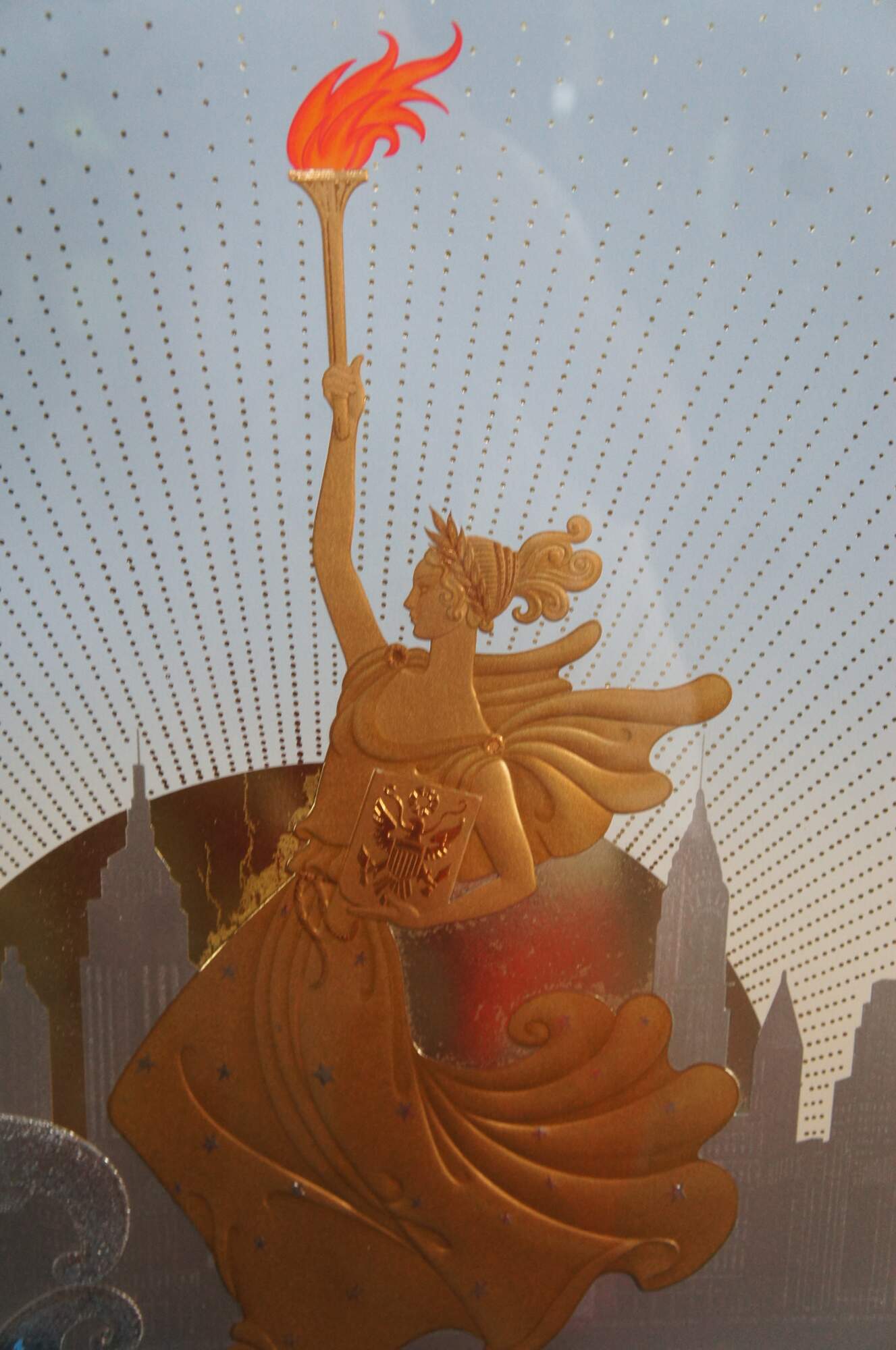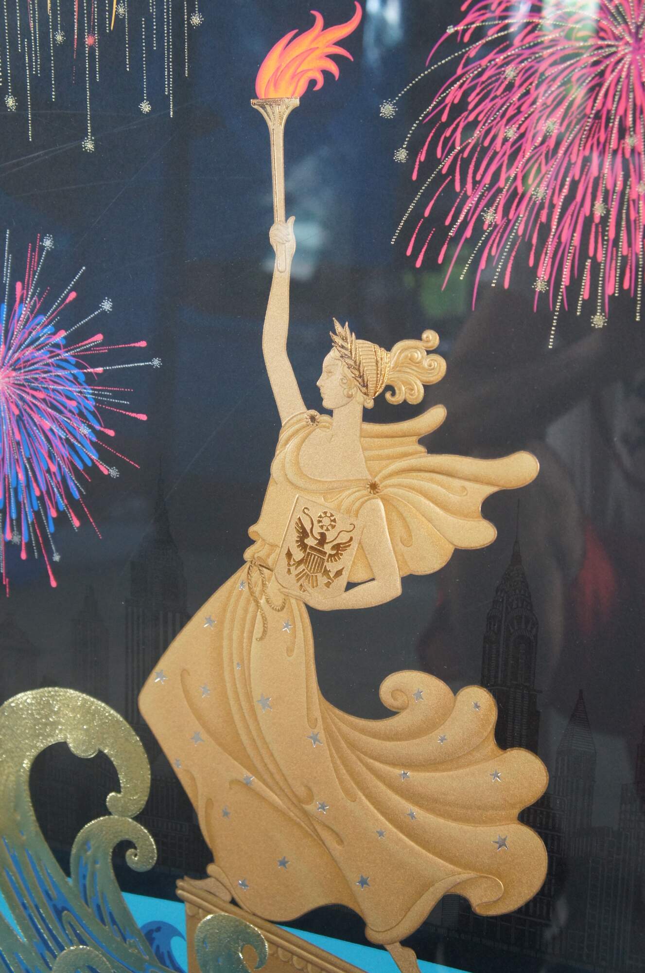 Vintage pair of embossed metallic Art Deco style serigraphs by Erte, circa 1986. The prints feature the famous Statue of Liberty in both day and night settings. The day print features a seascape with her majesty surfing the waves with her outstretched torch against a sunrise and silhouette of New York City. The night print shows similar, with fireworks lighting up the night sky. Both signed lower right and numbered 227 of 300. Framed in ornate gold with an infinity flower / floral motif.