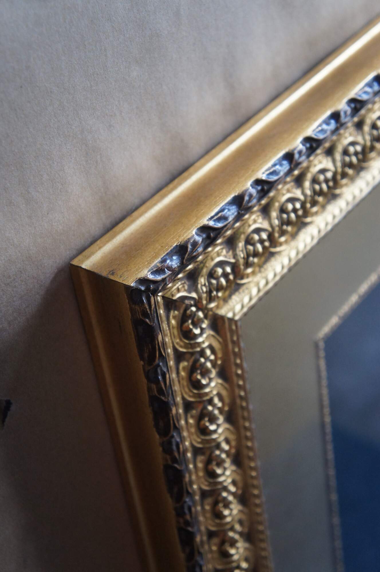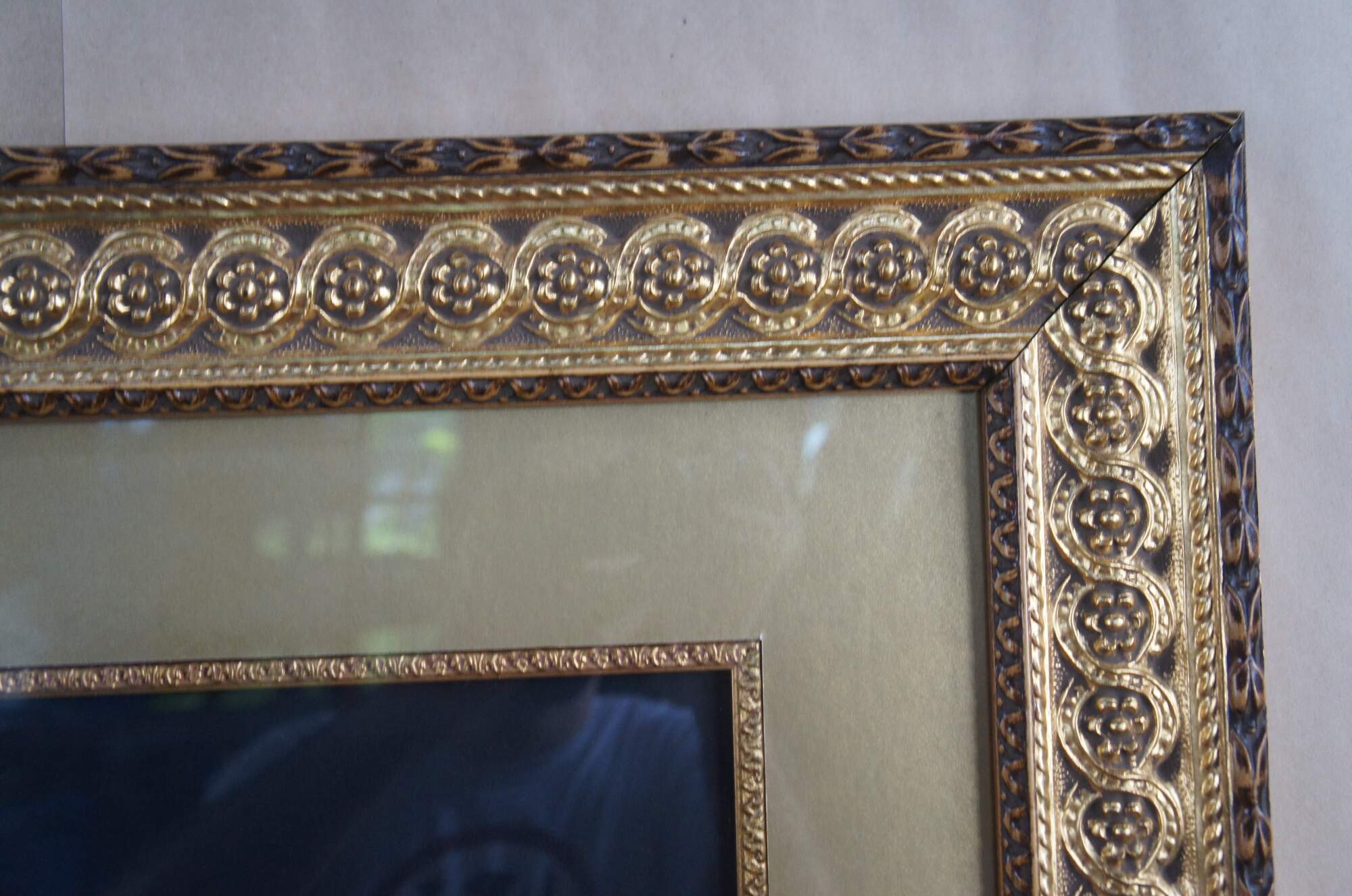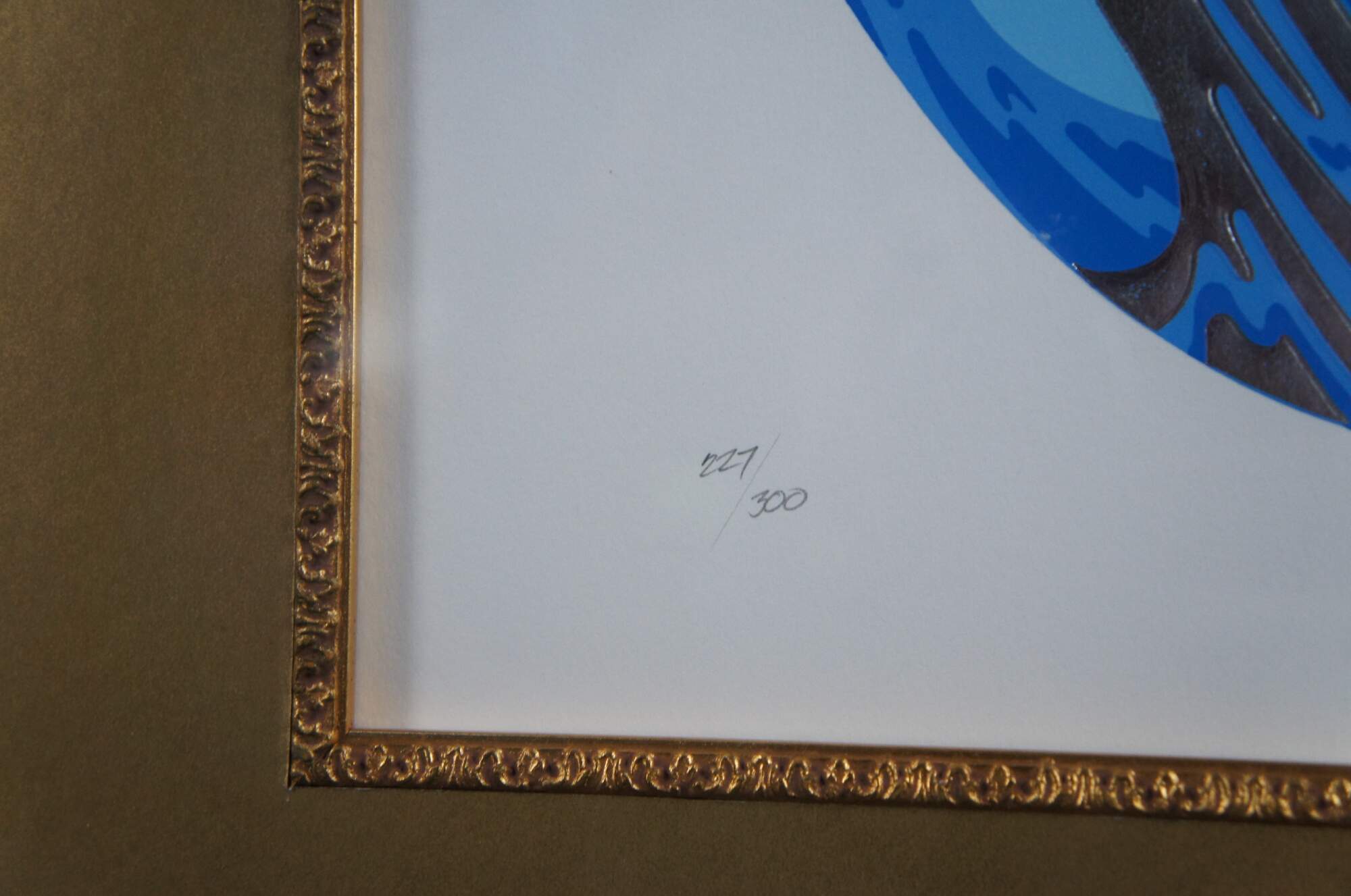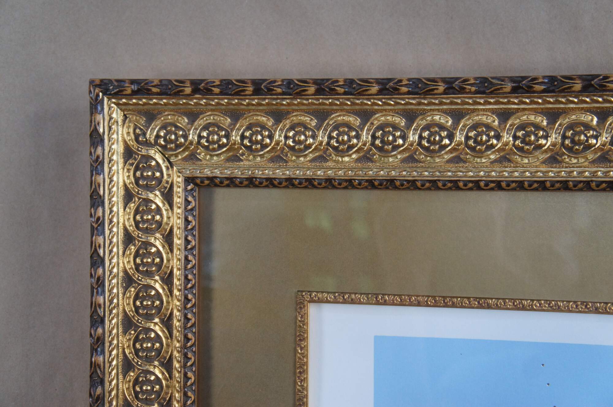 Vintage pair of embossed metallic Art Deco style serigraphs by Erte, circa 1986. The prints feature the famous Statue of Liberty in both day and night settings. The day print features a seascape with her majesty surfing the waves with her outstretched torch against a sunrise and silhouette of New York City. The night print shows similar, with fireworks lighting up the night sky. Both signed lower right and numbered 227 of 300. Framed in ornate gold with an infinity flower / floral motif.