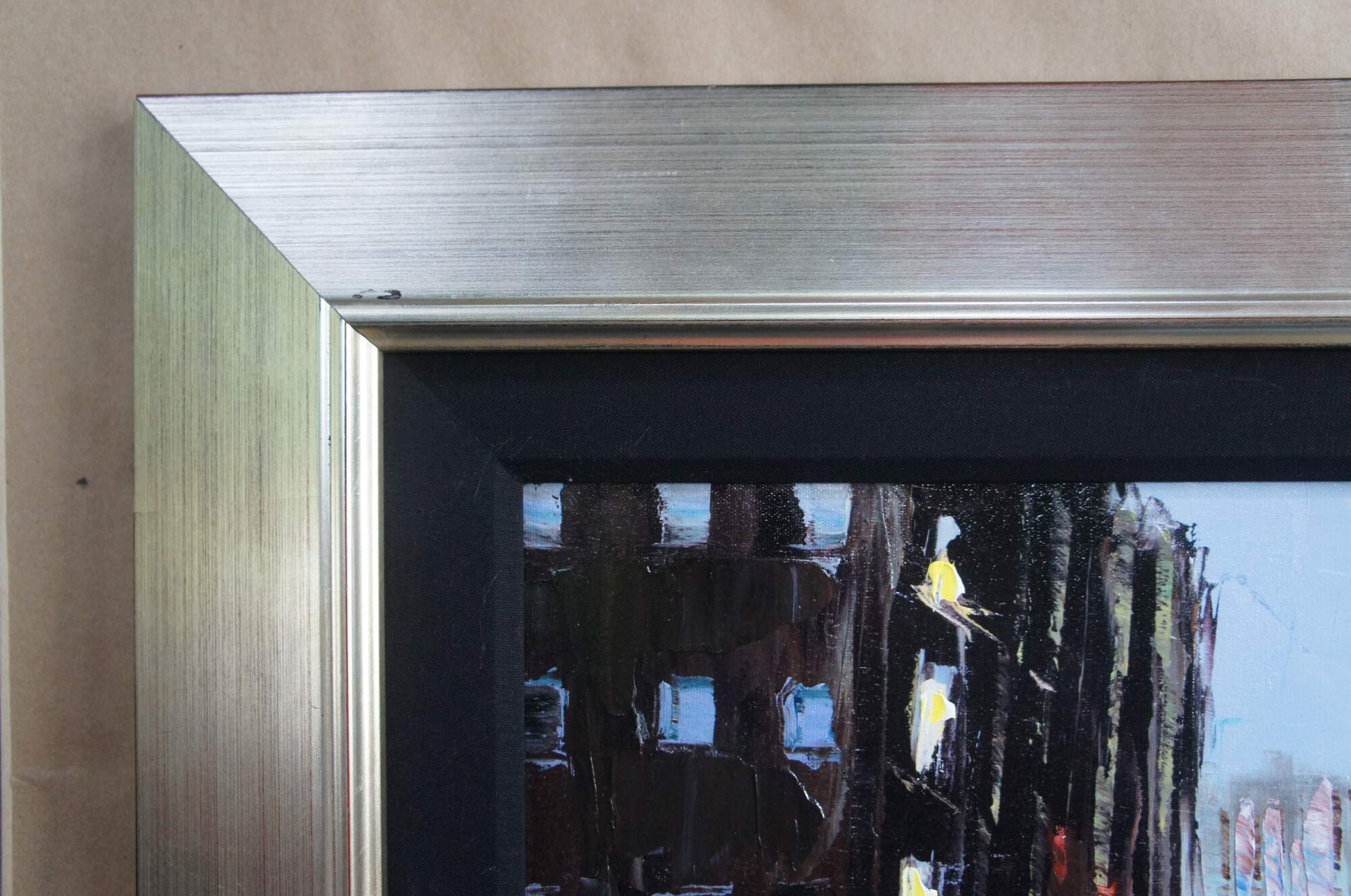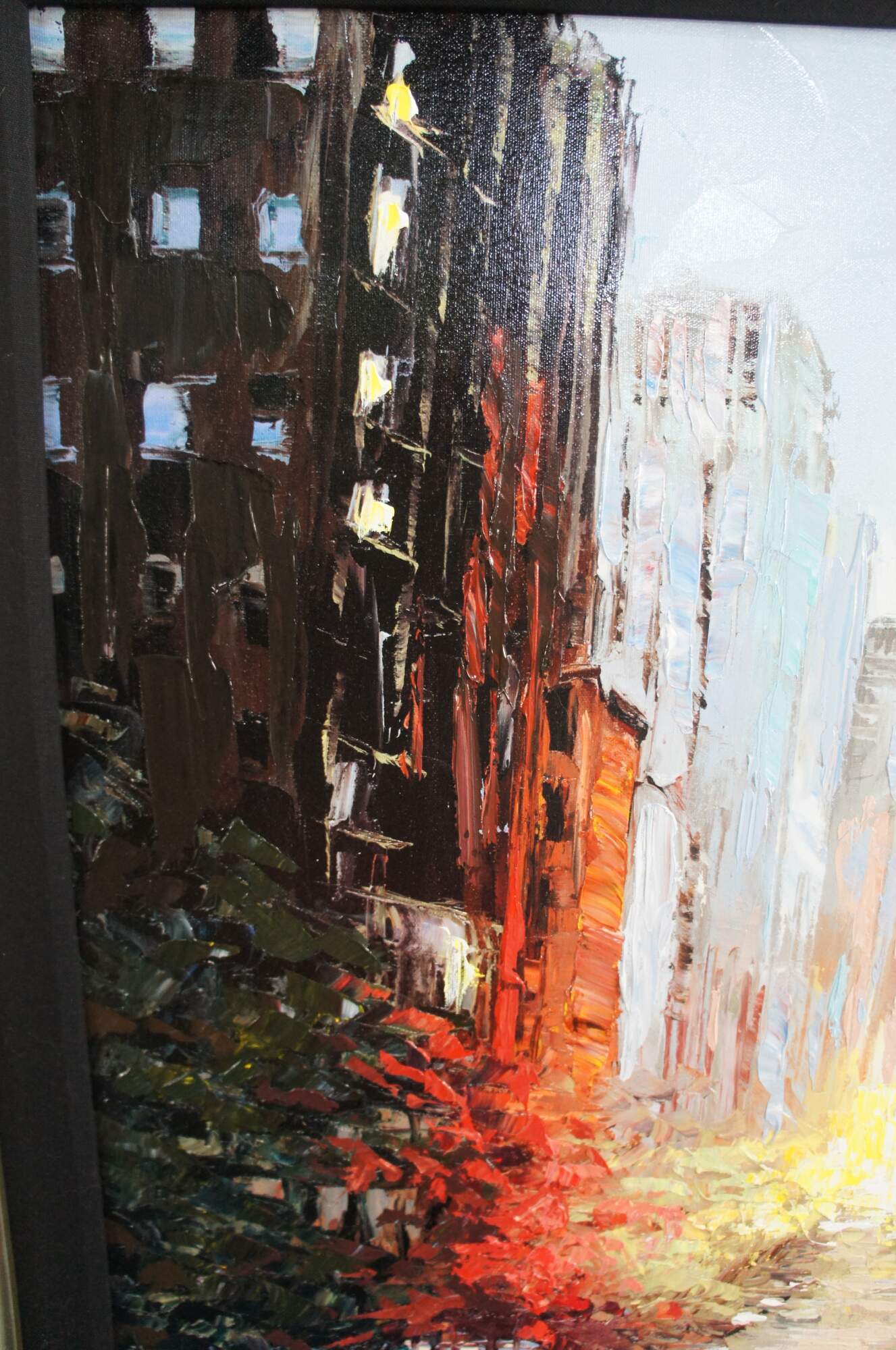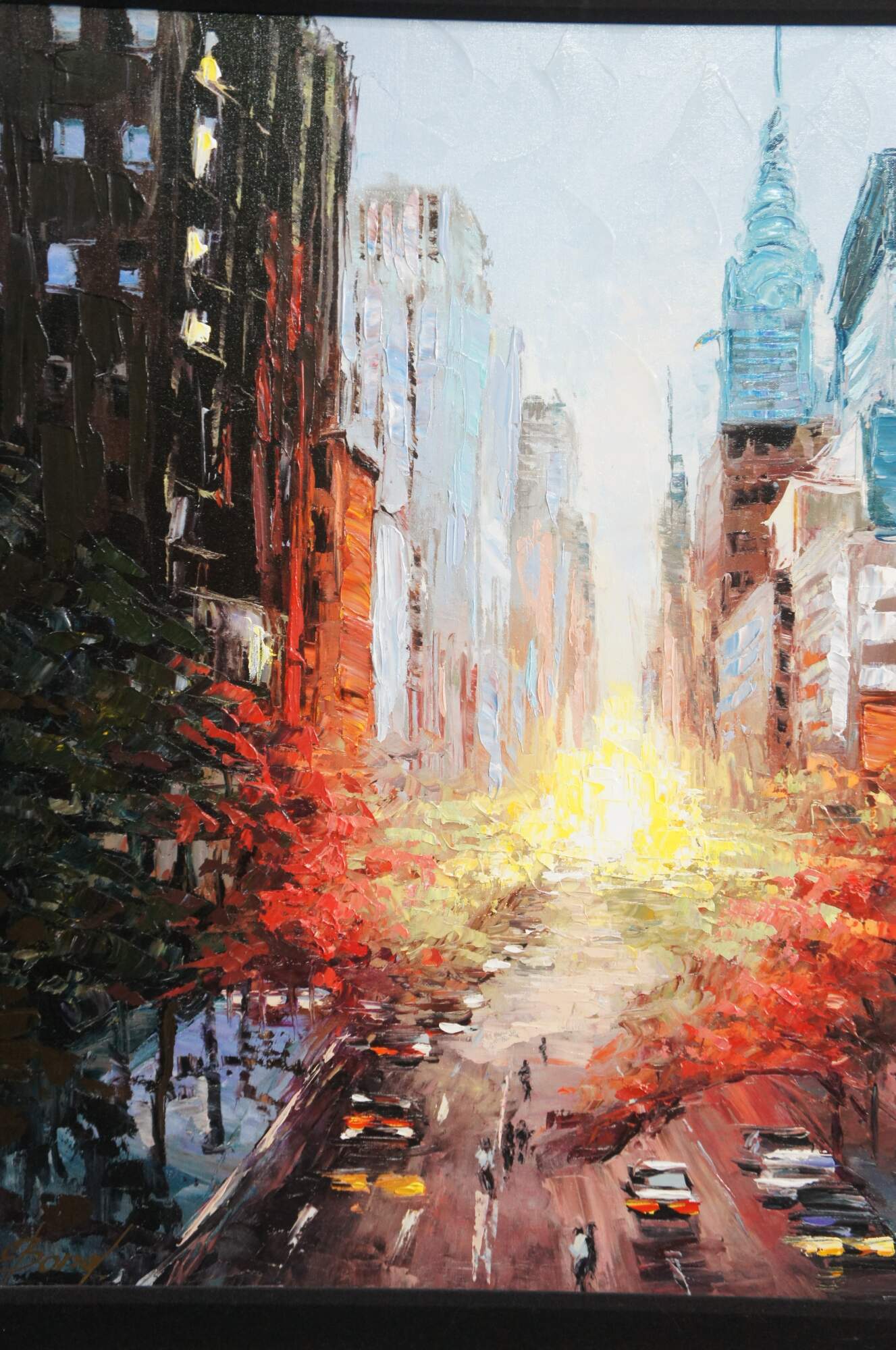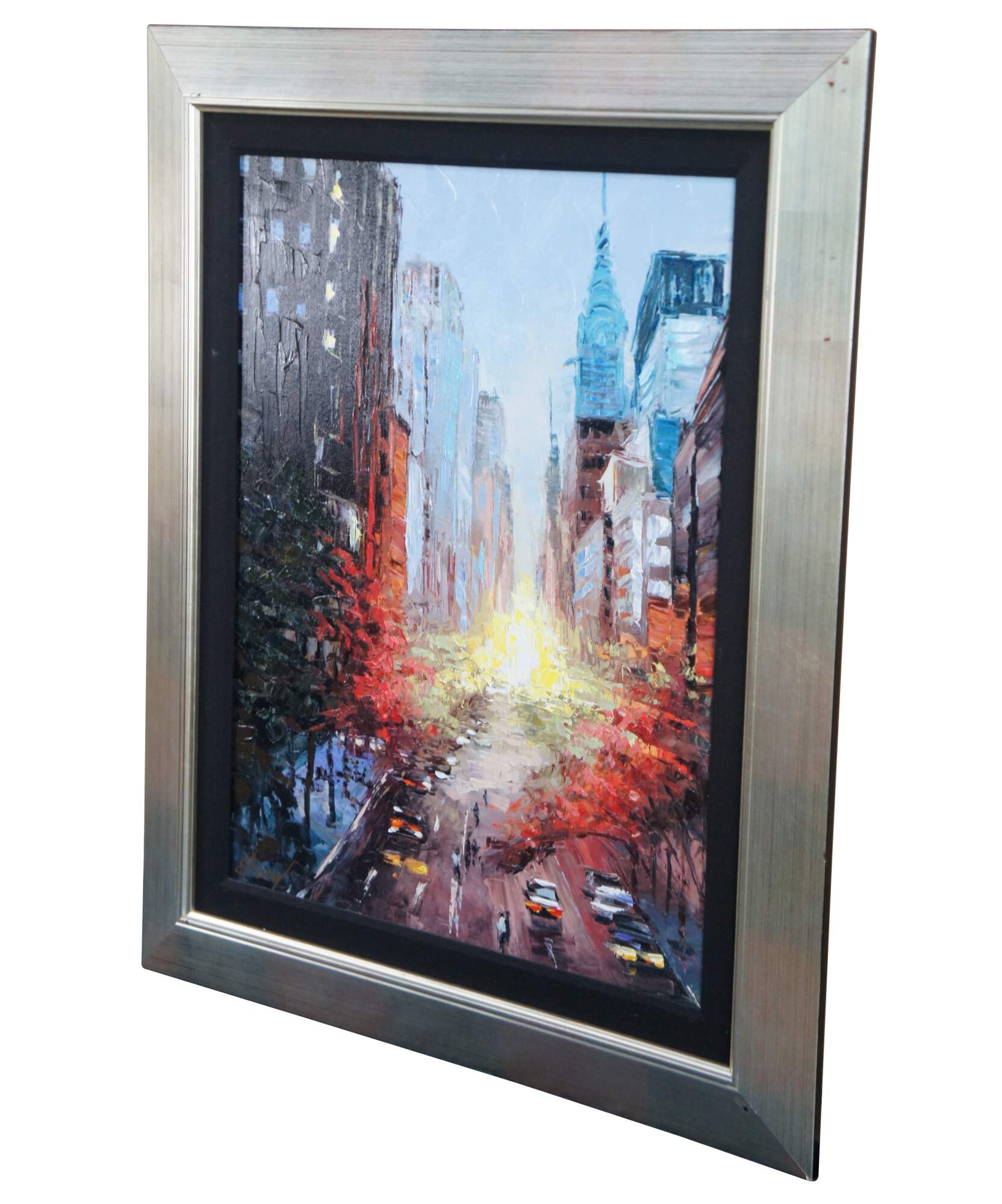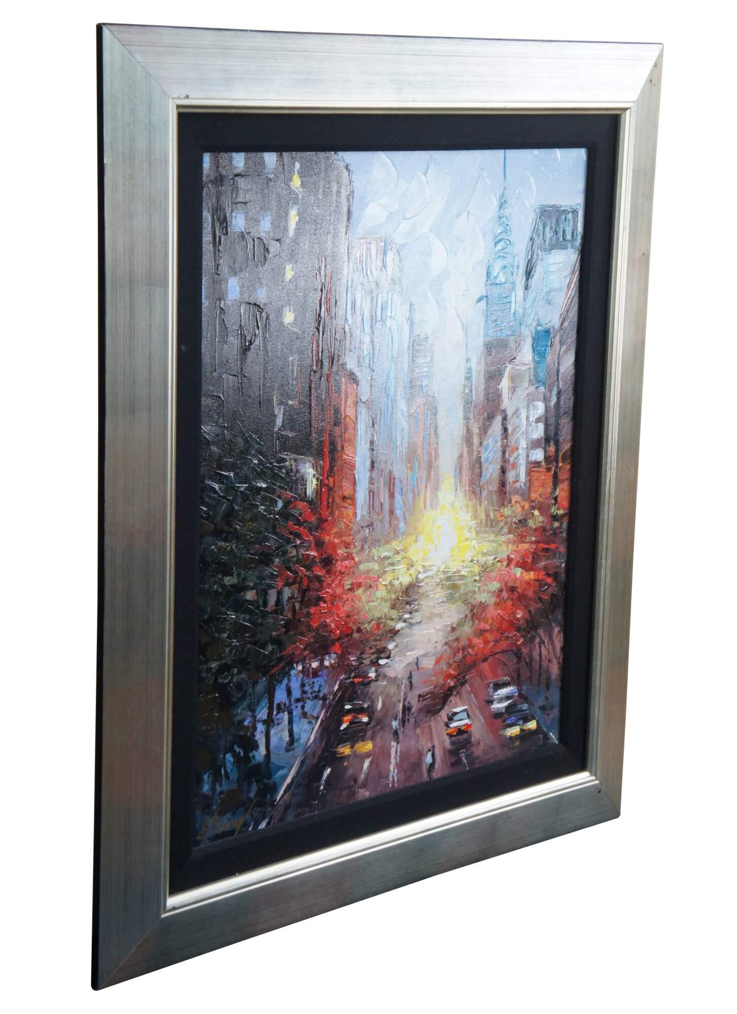 Large and impressive acrylic giclee on canvas by Elena Bond featuring an impressionist cityscape street scene of the sunset in New York. Purchased from Wentworth Gallery in Boca Raton.
