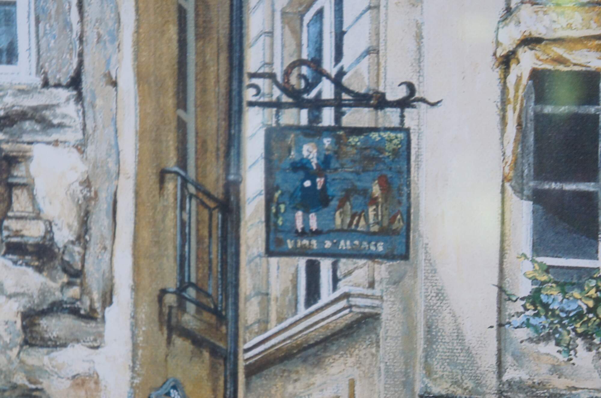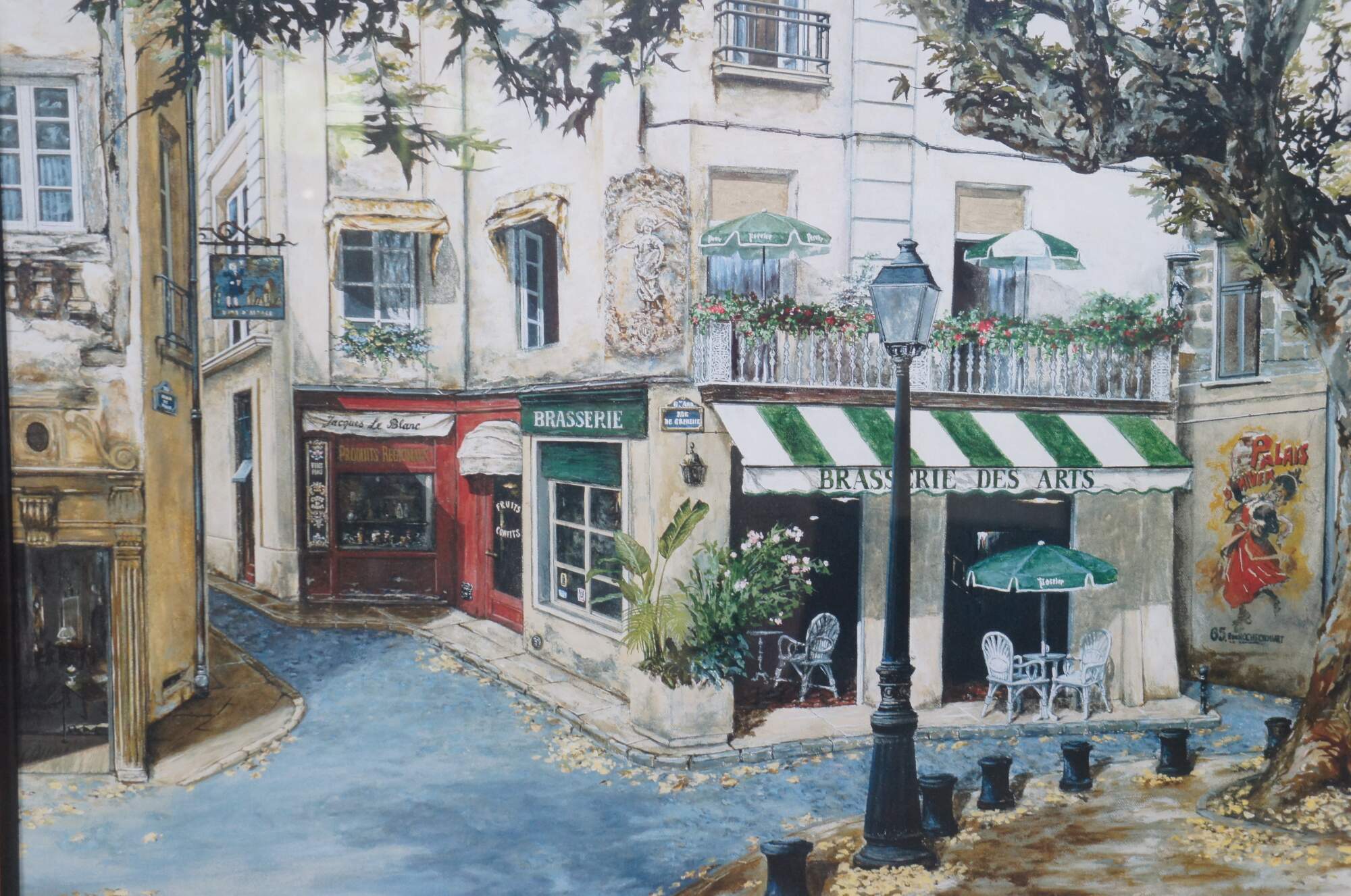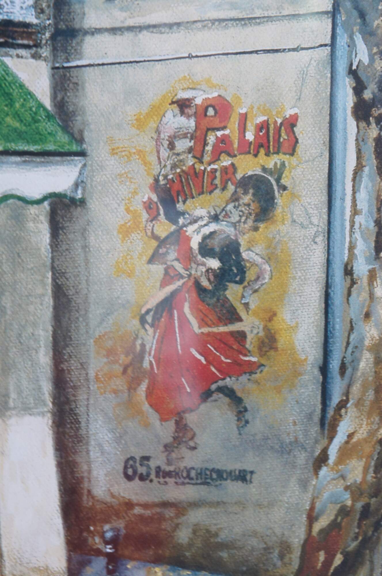 Vintage cityscape print of Paris France, by Jose Candia. The fall street scene features the restaurant Brasserie des Arts and a liquore store Jacques Le Blanc. A rooftop patio with flowers and umbrellas overlooks an advertising movie poster for PALAIS/ D'HIVER/ 65, Rue ROCHECHOUART which translates to Palace, Winter and features a woman roller skating. Signed lower right.
