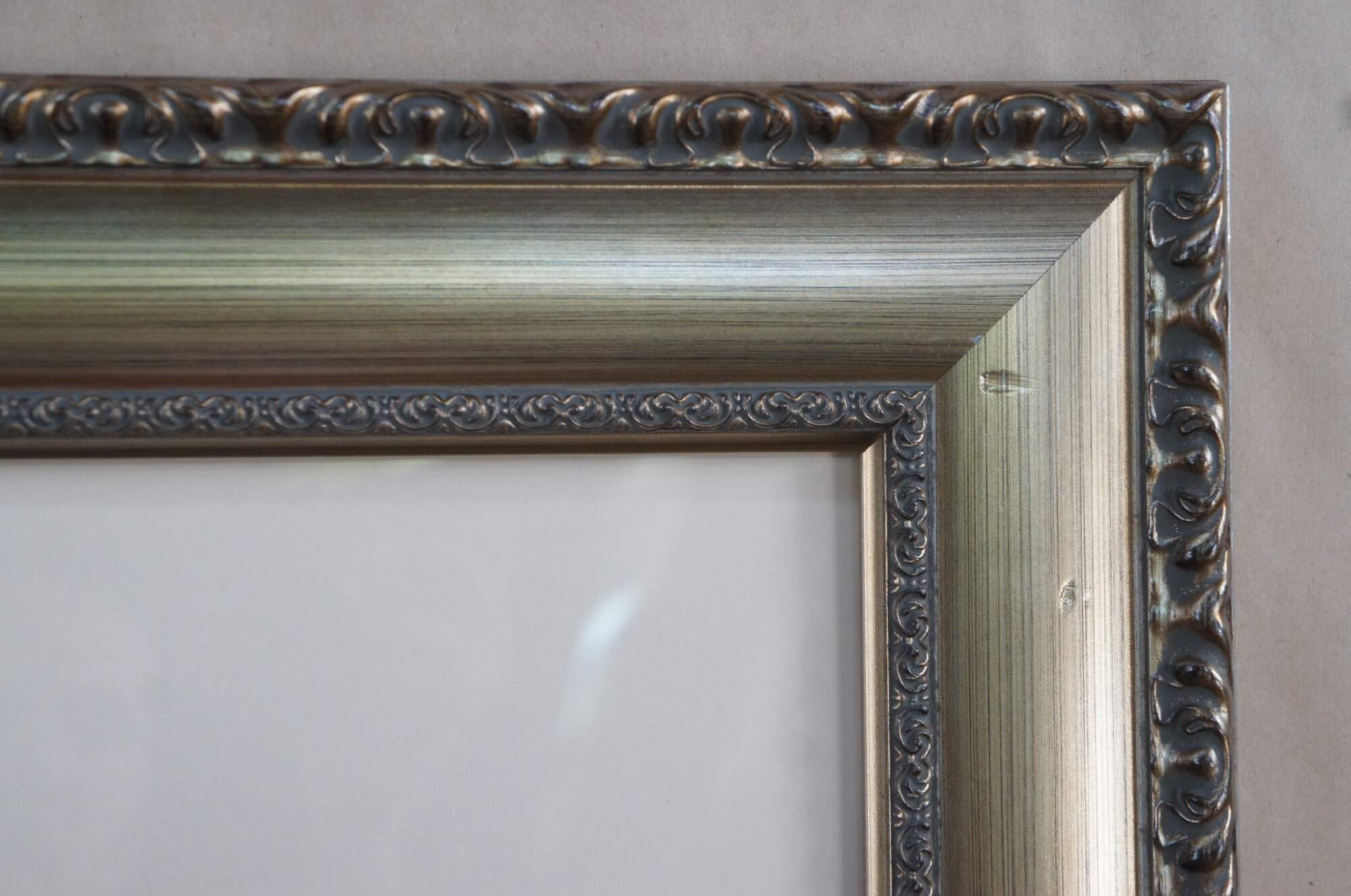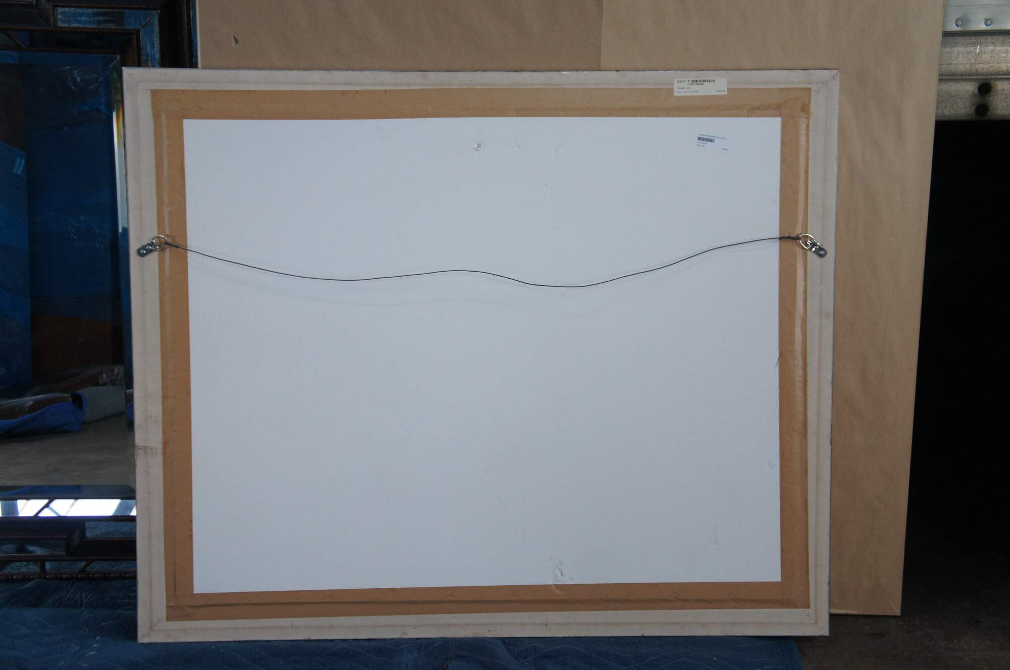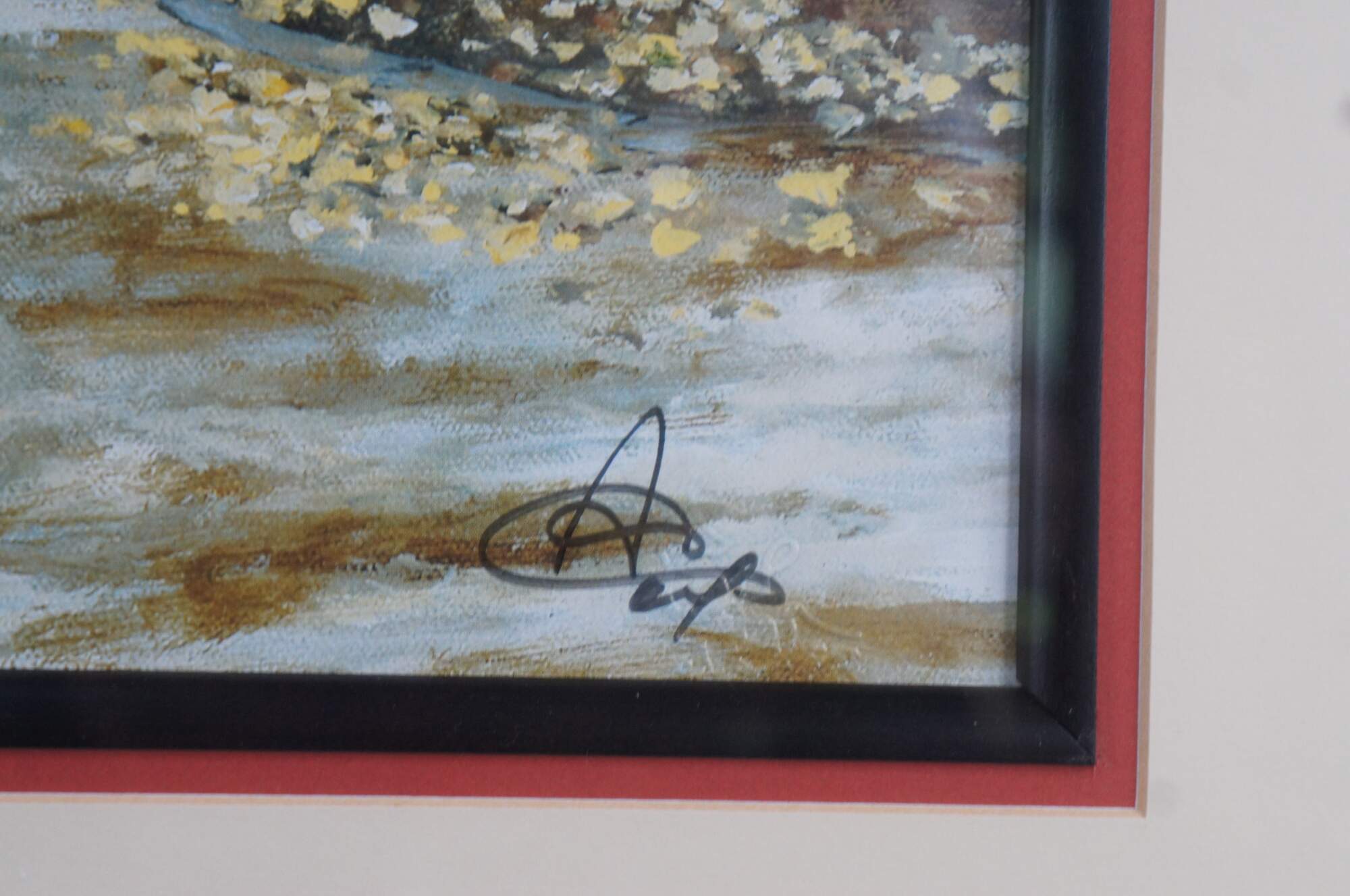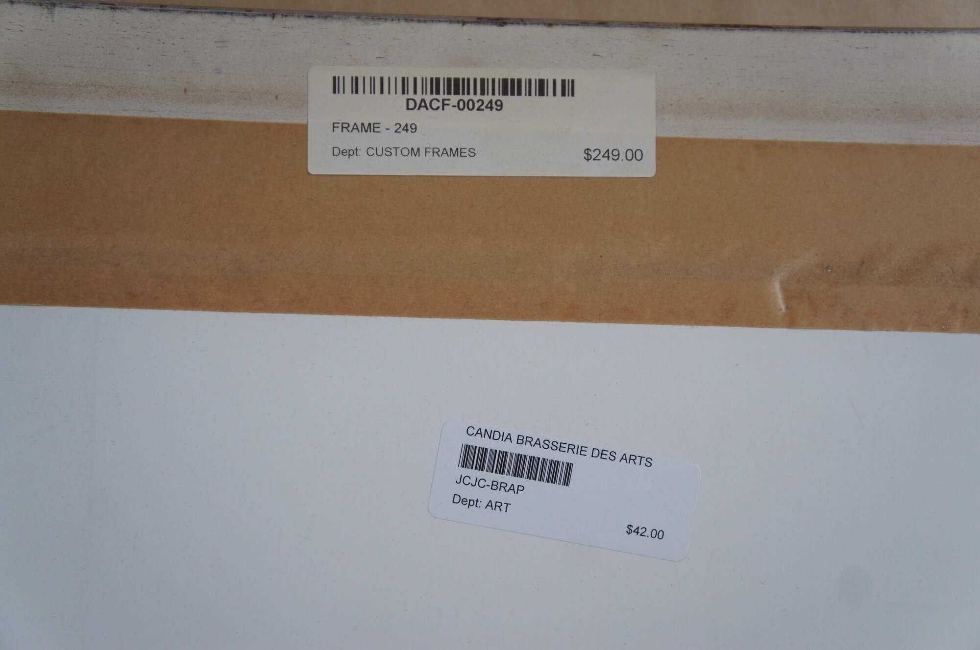Vintage cityscape print of Paris France, by Jose Candia. The fall street scene features the restaurant Brasserie des Arts and a liquore store Jacques Le Blanc. A rooftop patio with flowers and umbrellas overlooks an advertising movie poster for PALAIS/ D'HIVER/ 65, Rue ROCHECHOUART which translates to Palace, Winter and features a woman roller skating. Signed lower right.