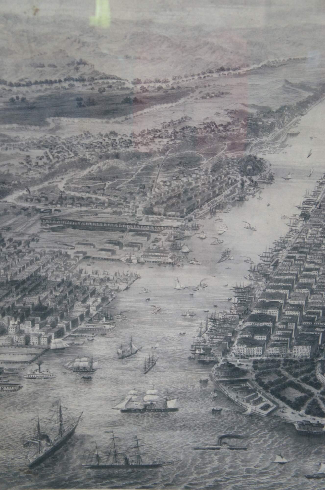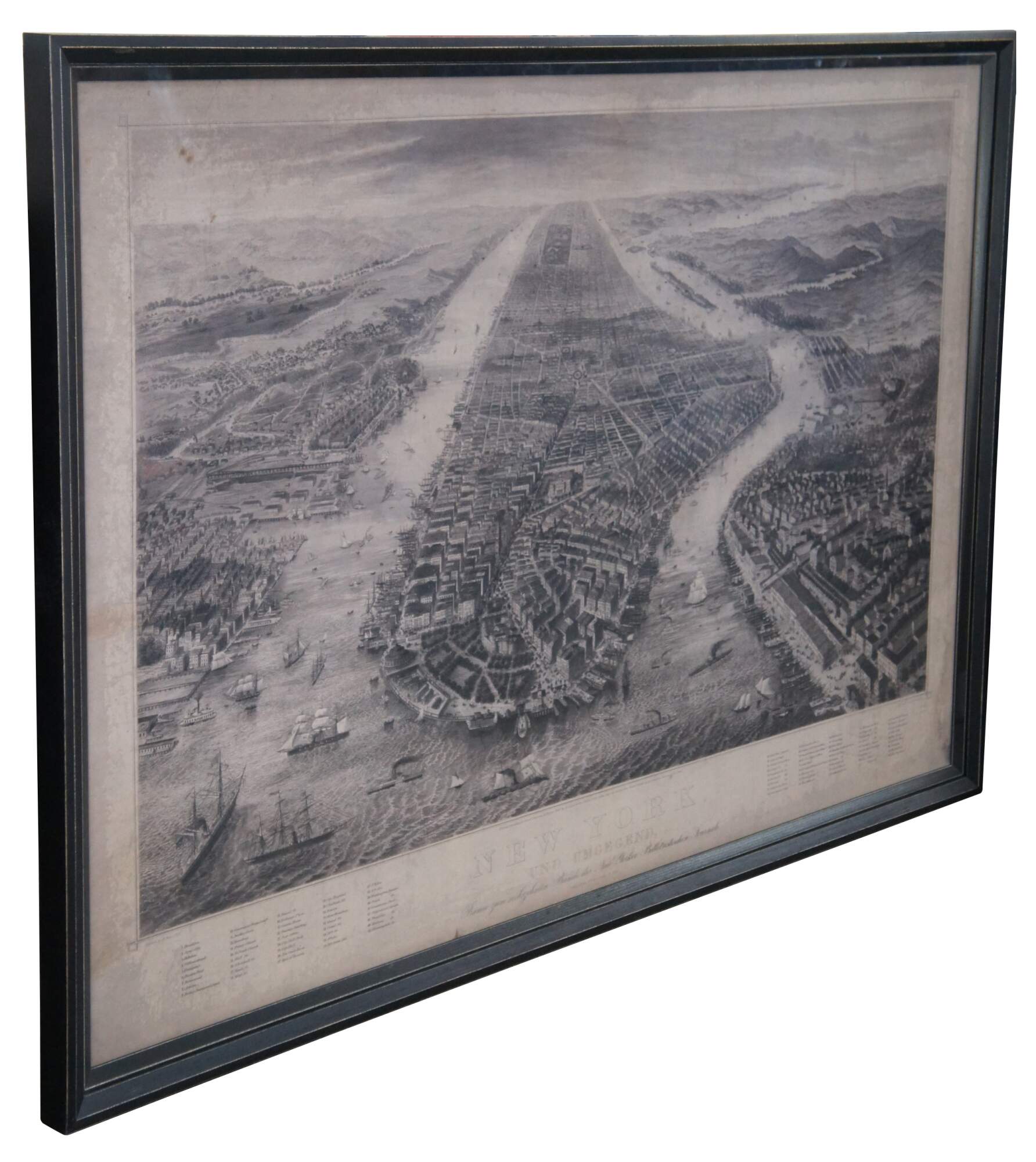 A large and impressive Restoration Hardware framed library map of Old Manhattan, New York. Features a panoramic view, after the original engraving by R. Kupfers in 1986.