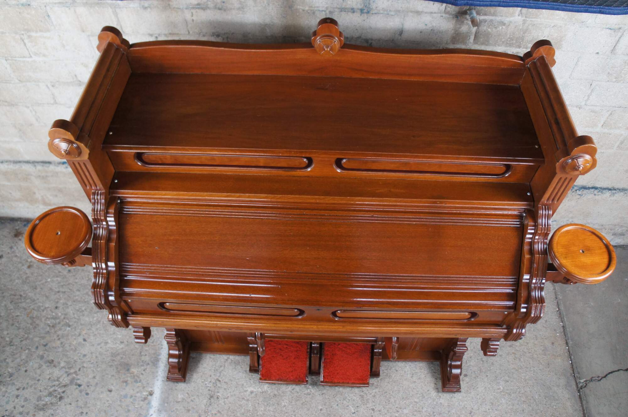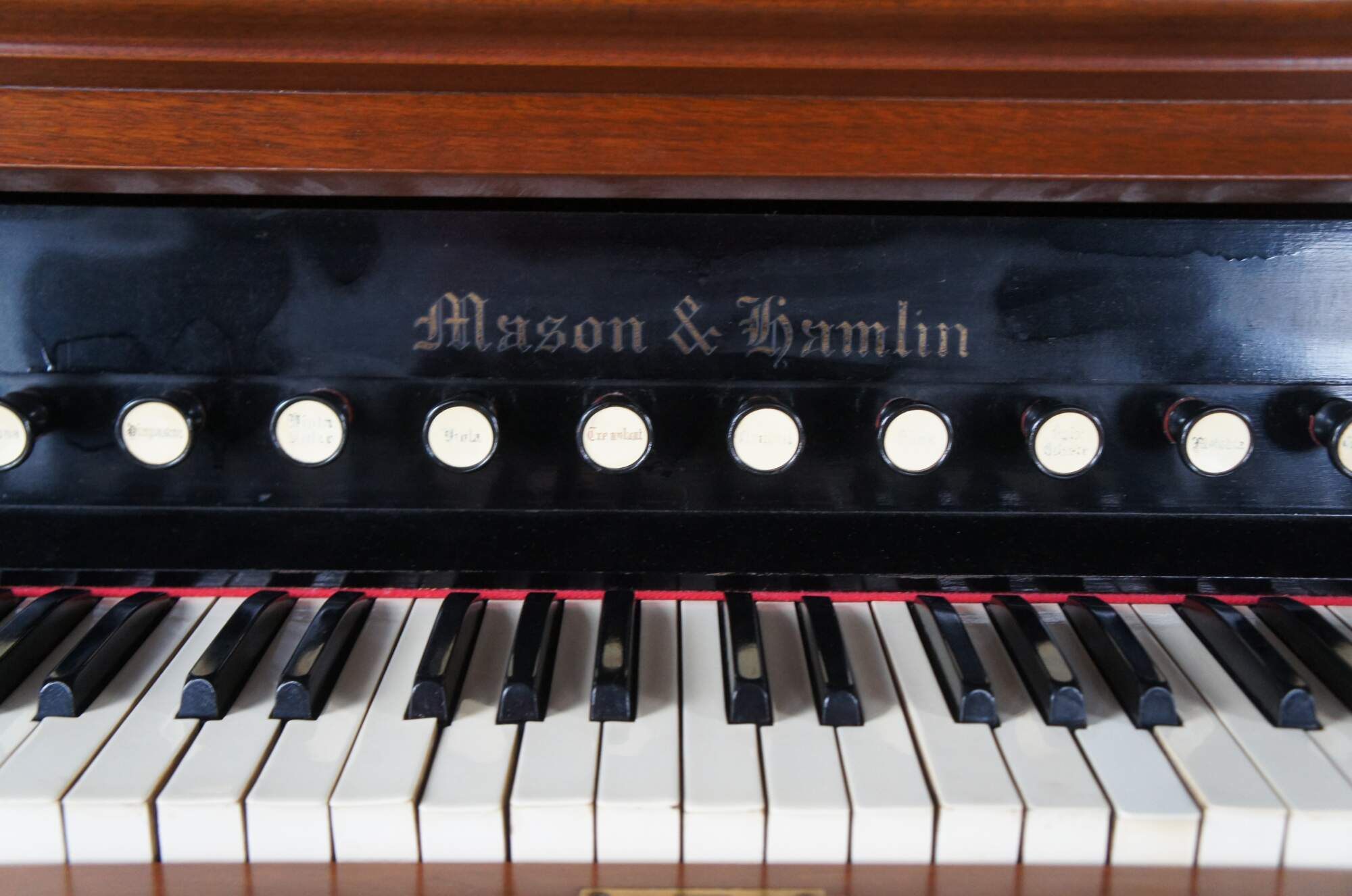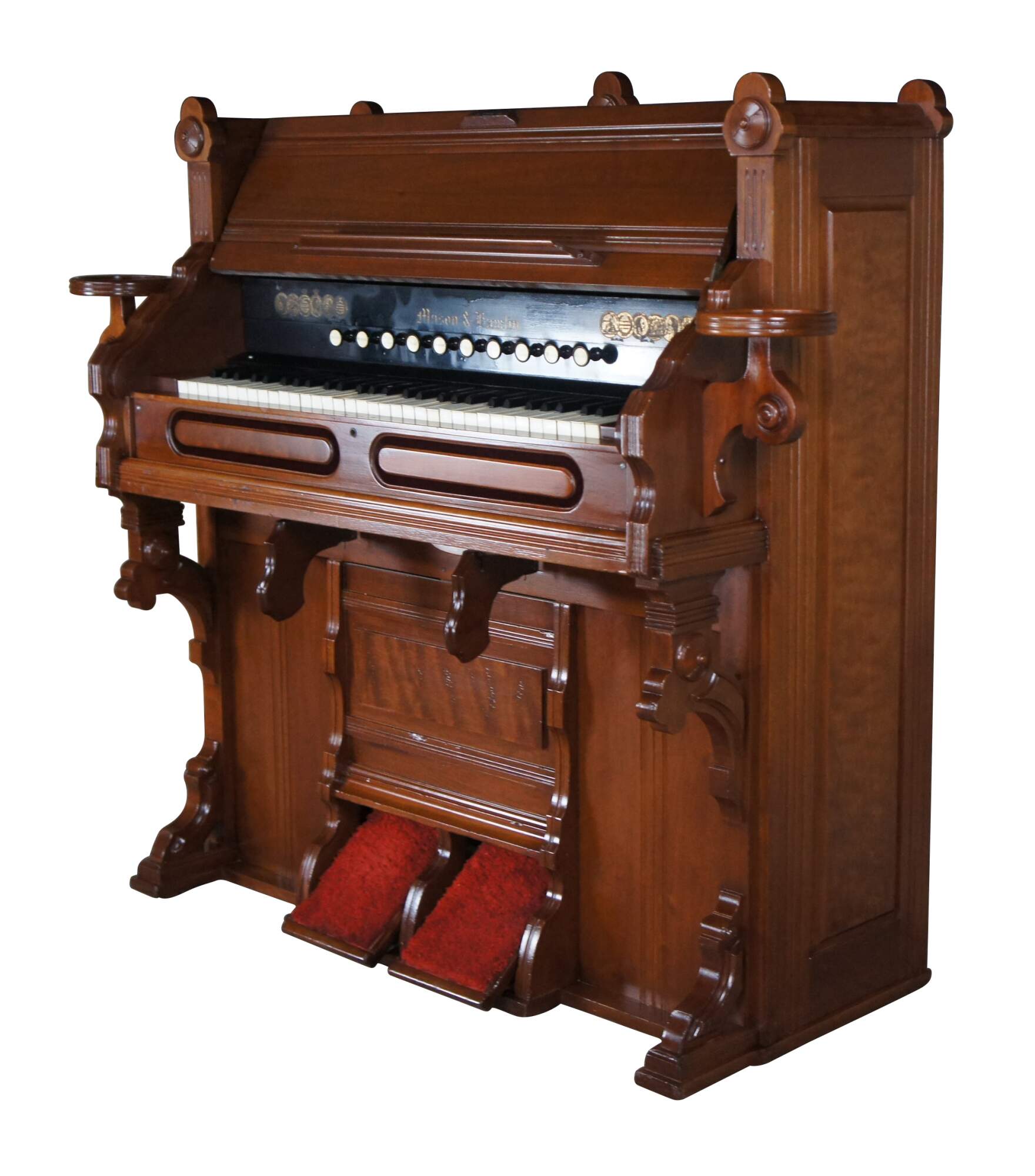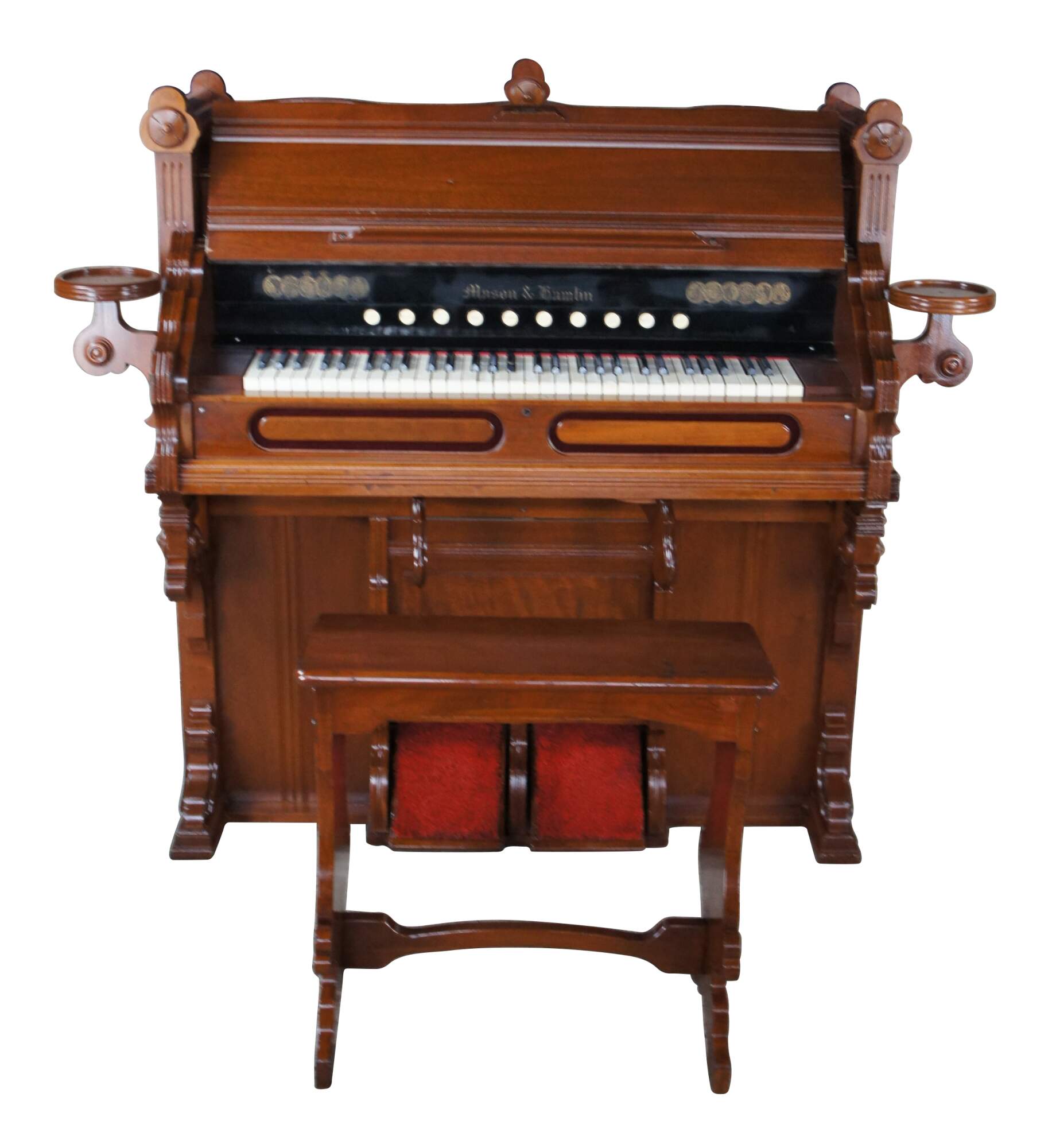 This reed organ was made by Mason & Hamlin in Boston, Massachusetts, cirfca 1890s. It is a parlor / Chapel model with a with a single keyboard, two knee swells, and two pedals. Made from walnut with burled and carved accents. Neatly flanked by candle holders along the outside of the body. Includes bench seat. The organ’s stop list is as follows:
