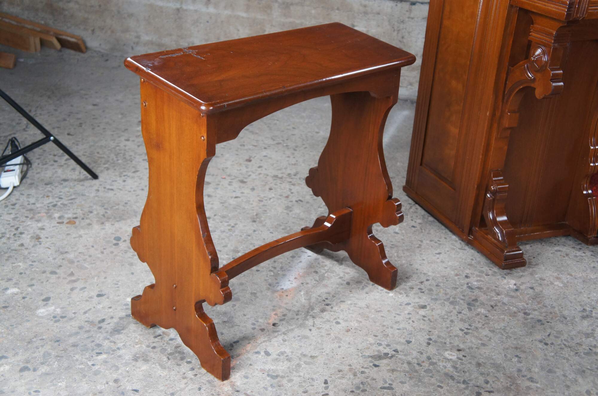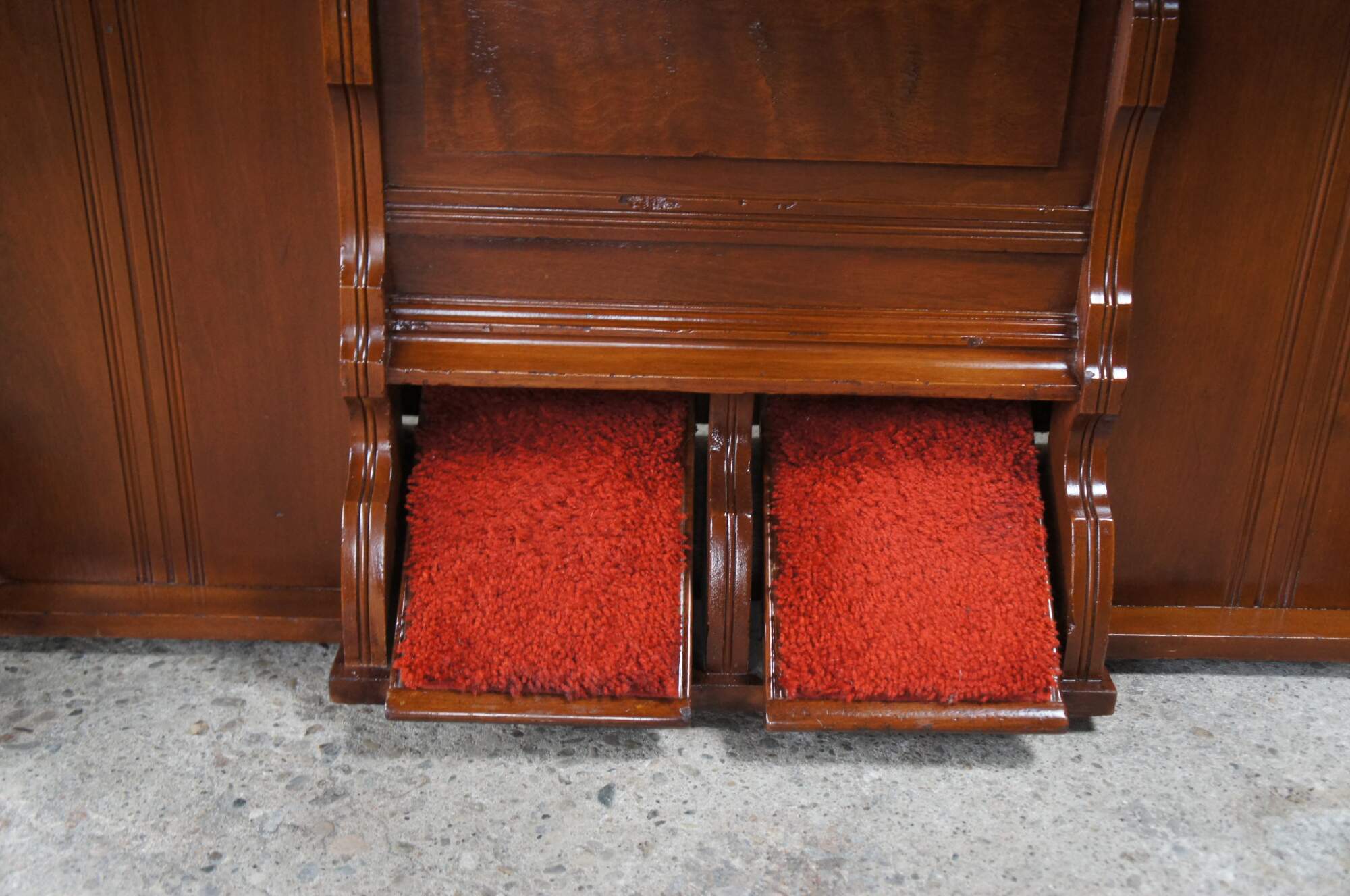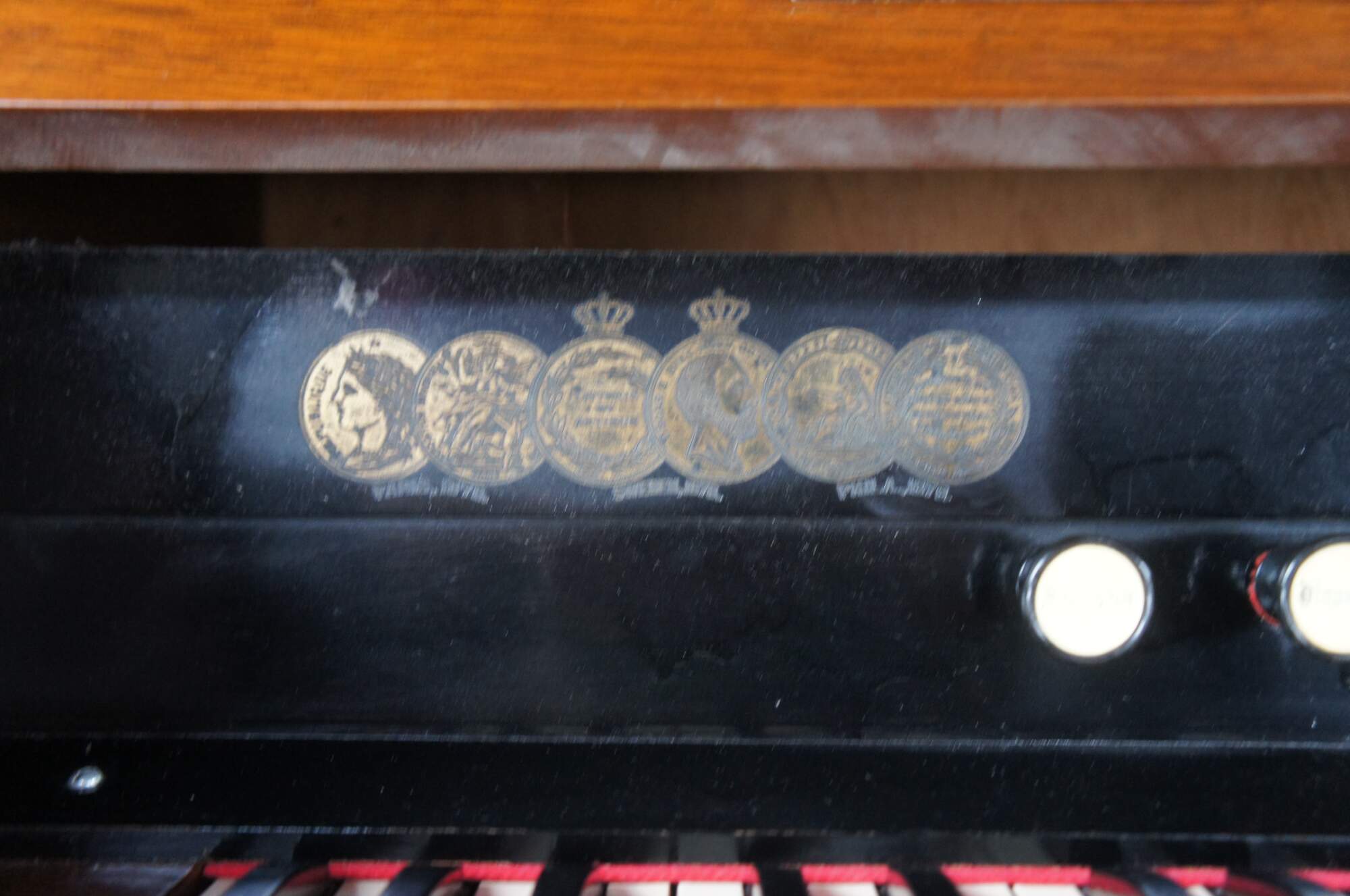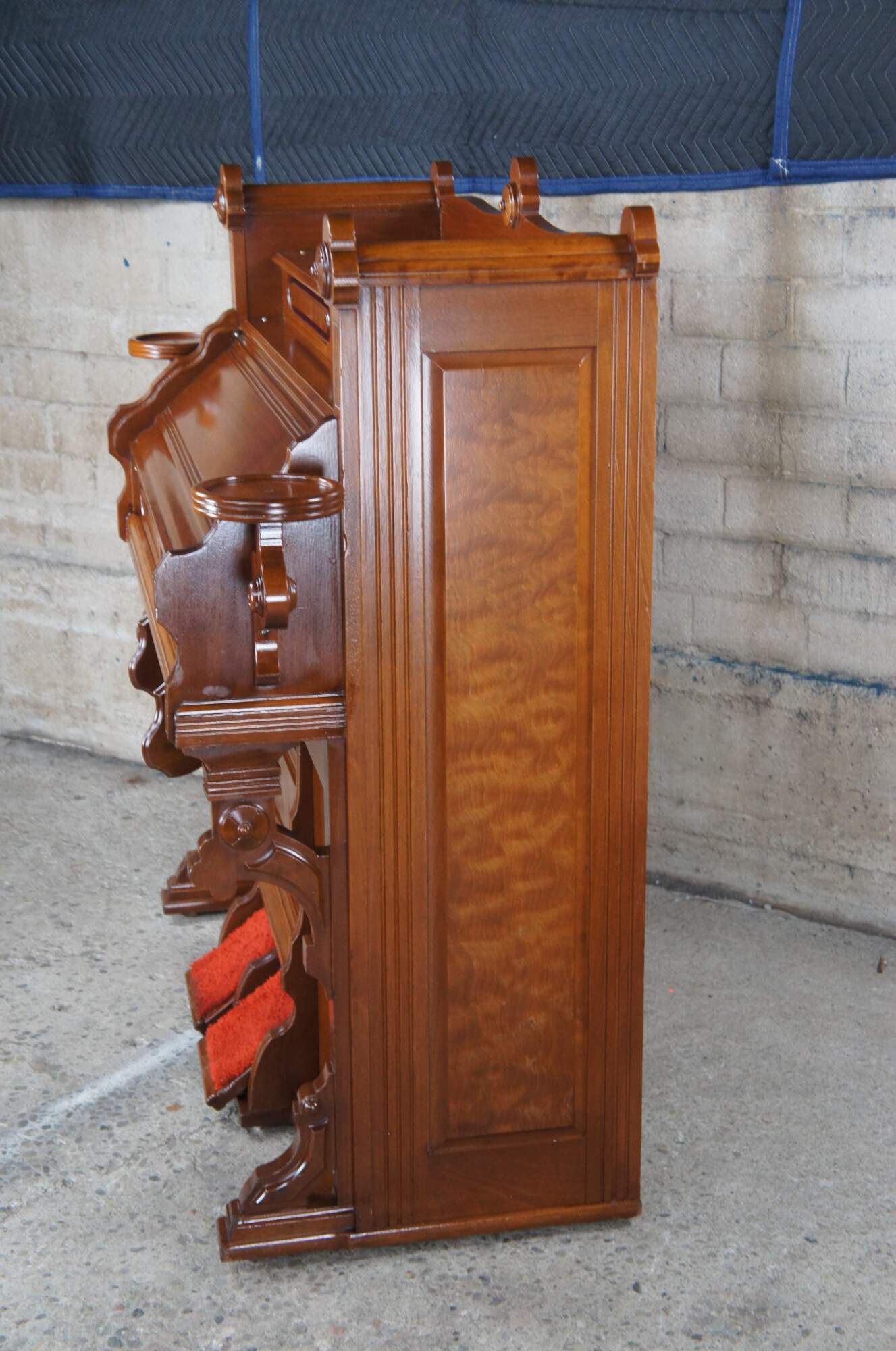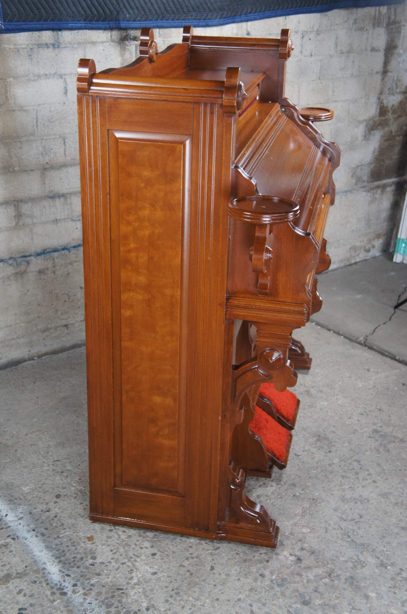 This reed organ was made by Mason & Hamlin in Boston, Massachusetts, cirfca 1890s. It is a parlor / Chapel model with a with a single keyboard, two knee swells, and two pedals. Made from walnut with burled and carved accents. Neatly flanked by candle holders along the outside of the body. Includes bench seat. The organ’s stop list is as follows: