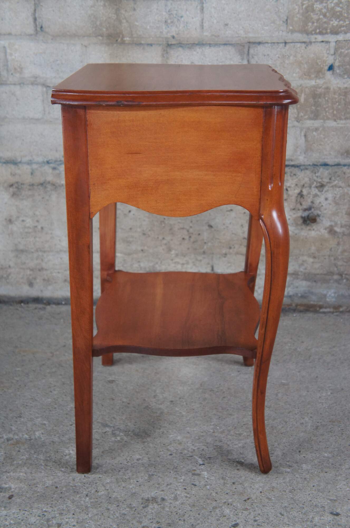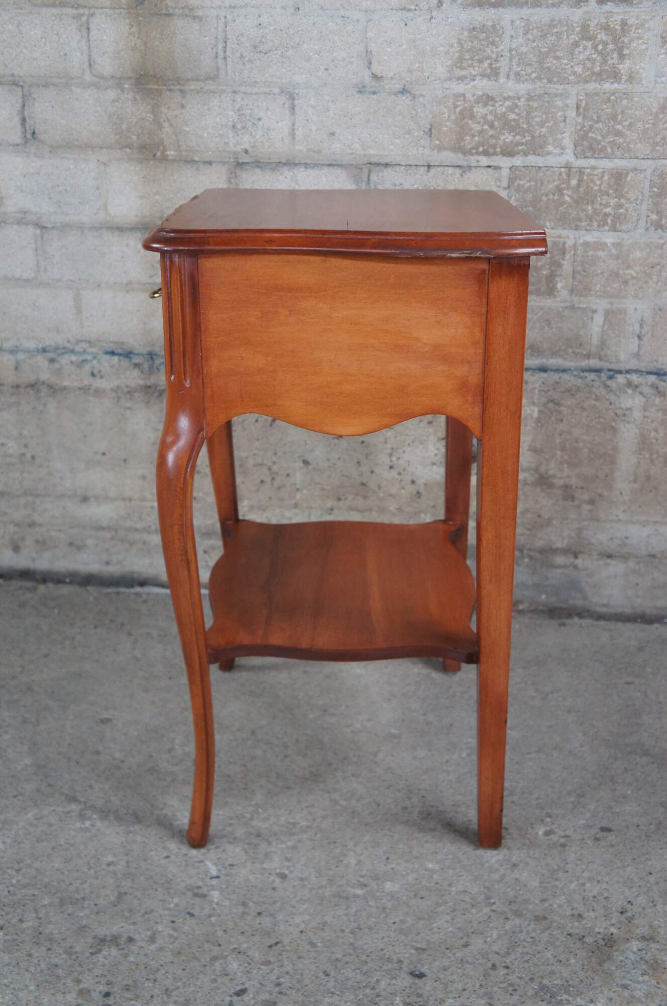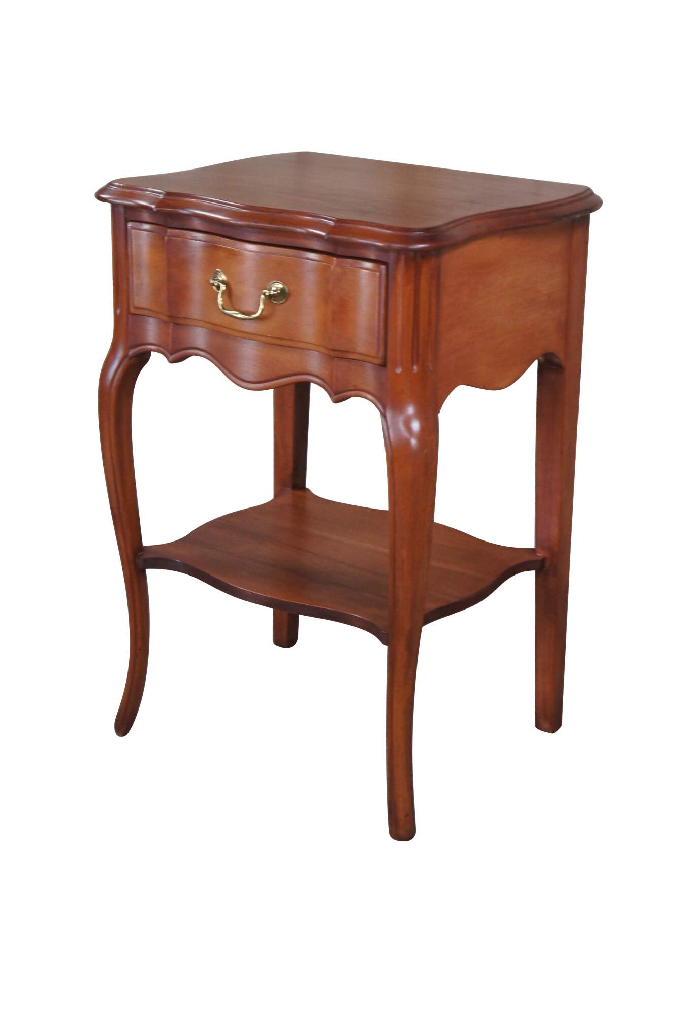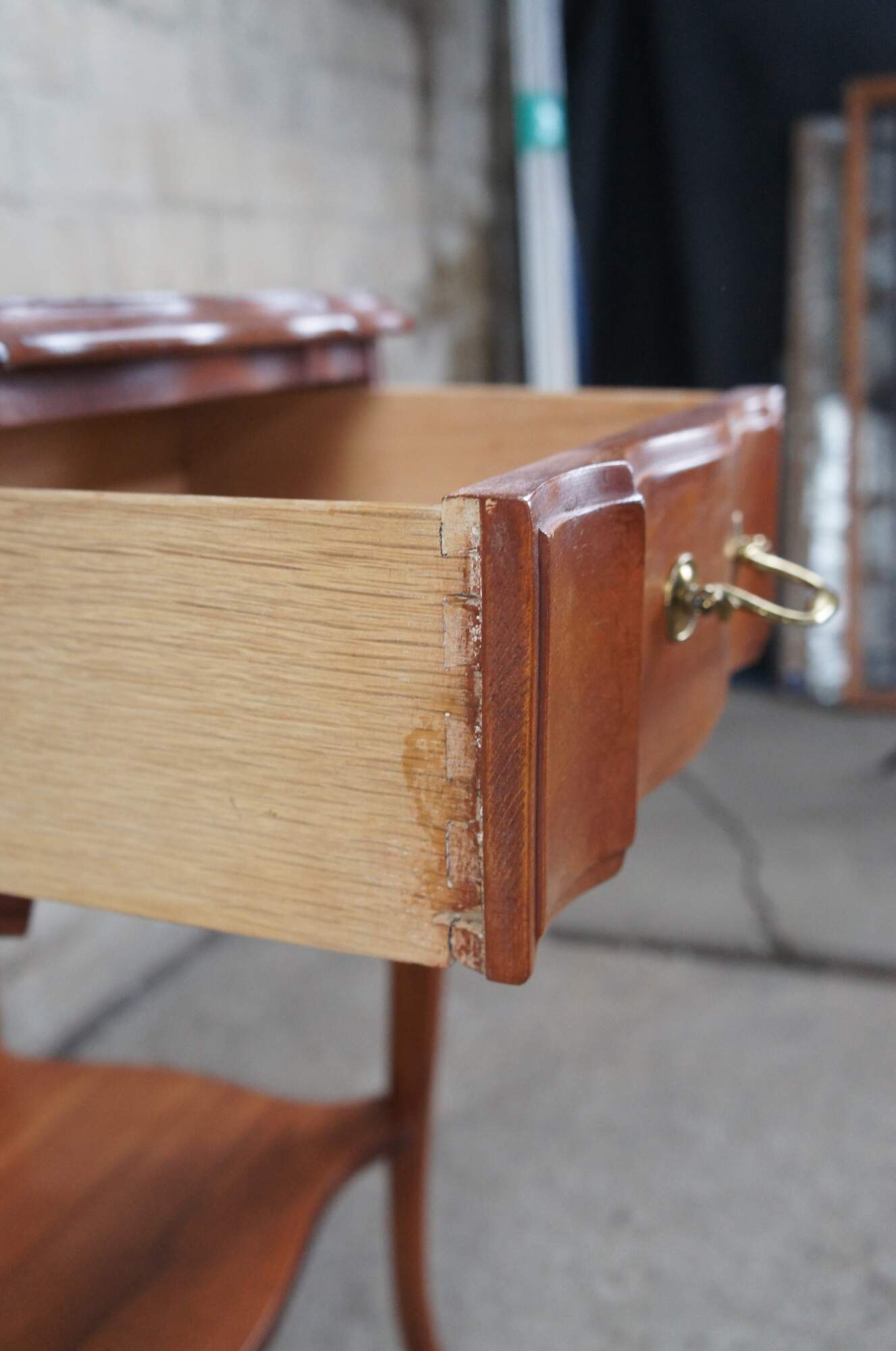 Mid century French Provincial occasional table. Made of mahogany featuring serpentine form with one drawer and lower shelf. Features brass bale hardware and cabriole legs.