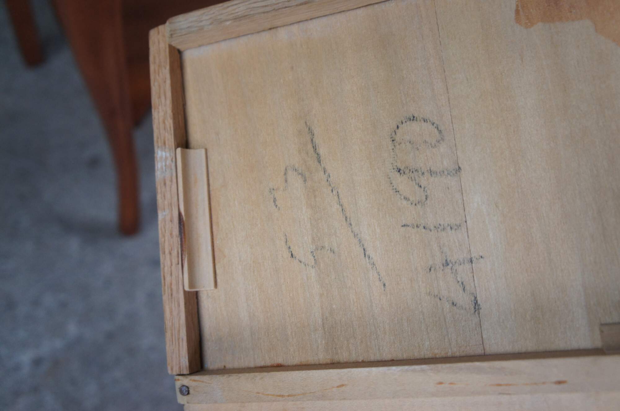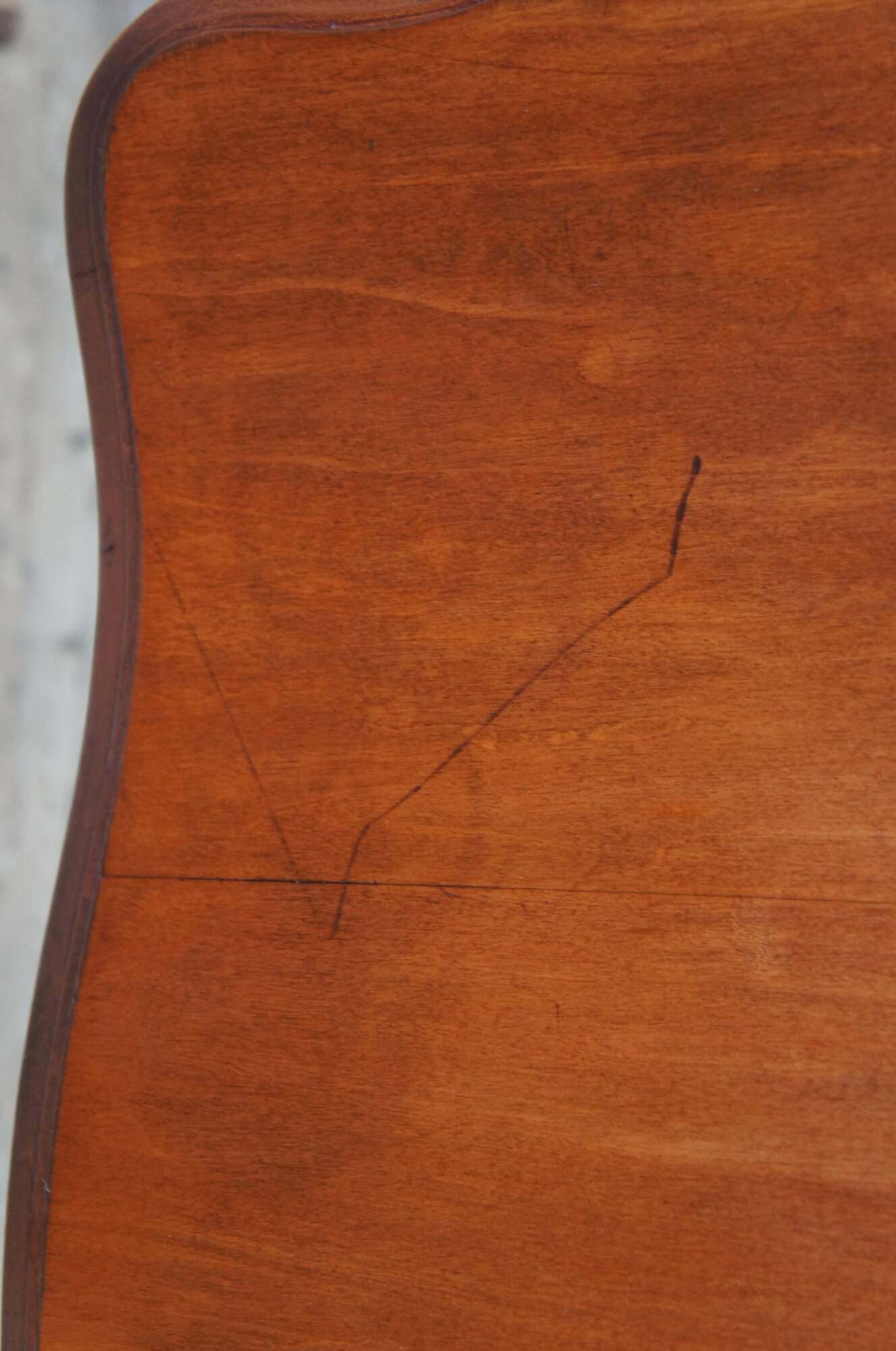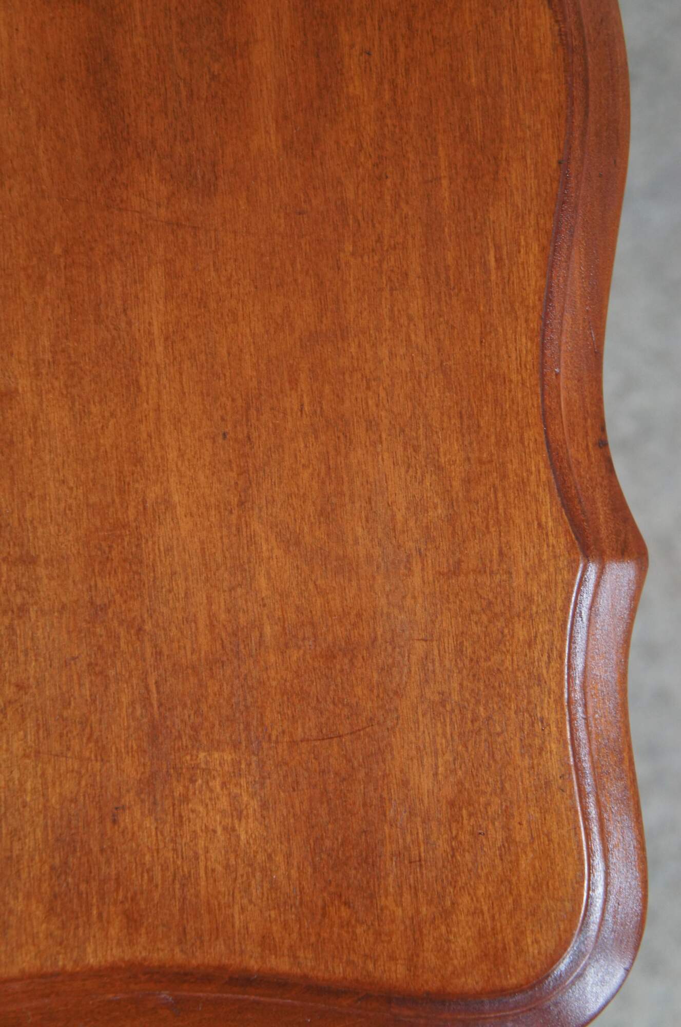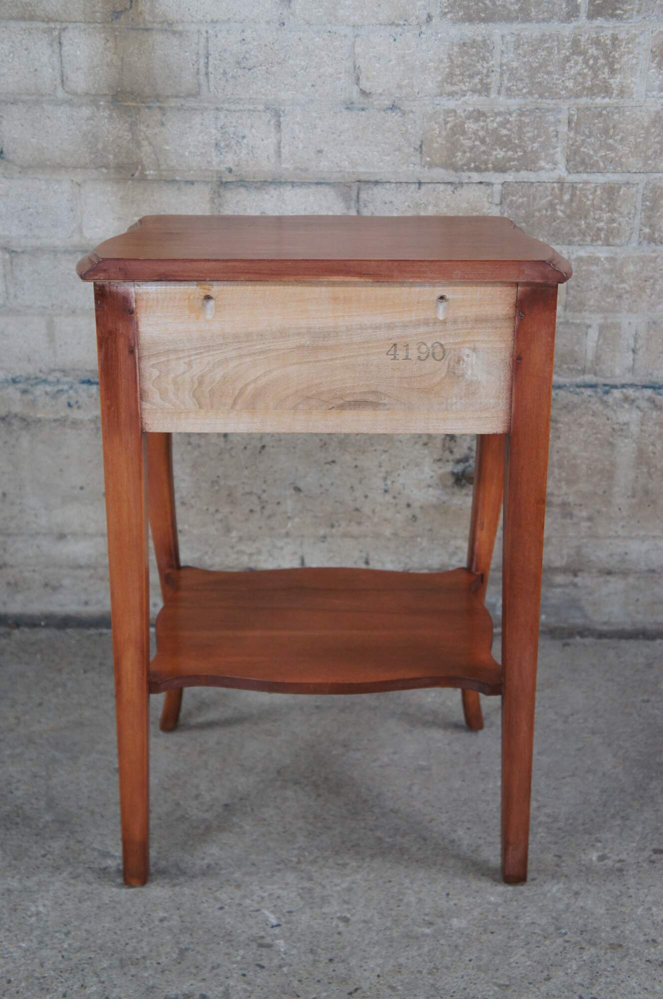 Mid century French Provincial occasional table. Made of mahogany featuring serpentine form with one drawer and lower shelf. Features brass bale hardware and cabriole legs.