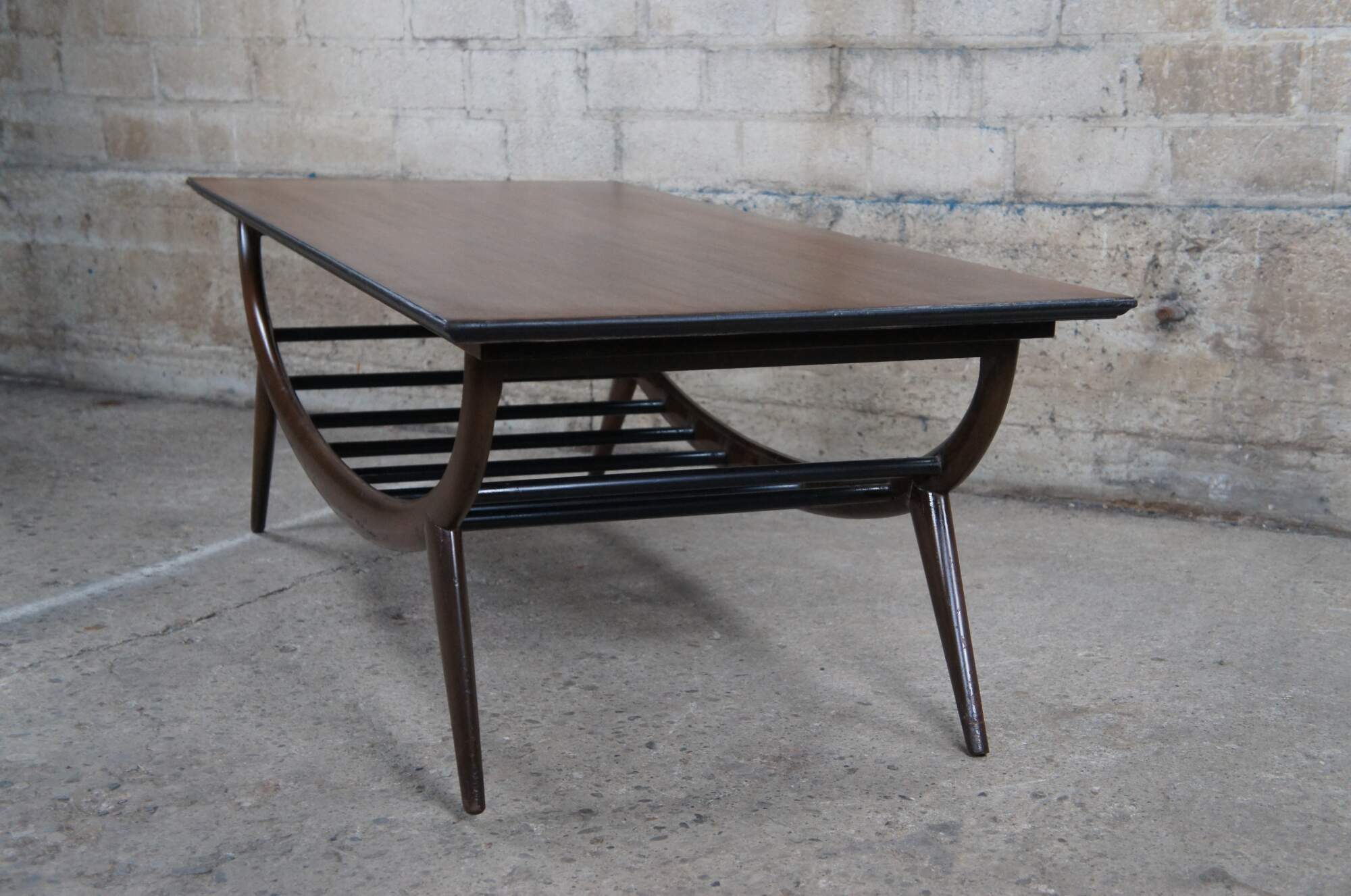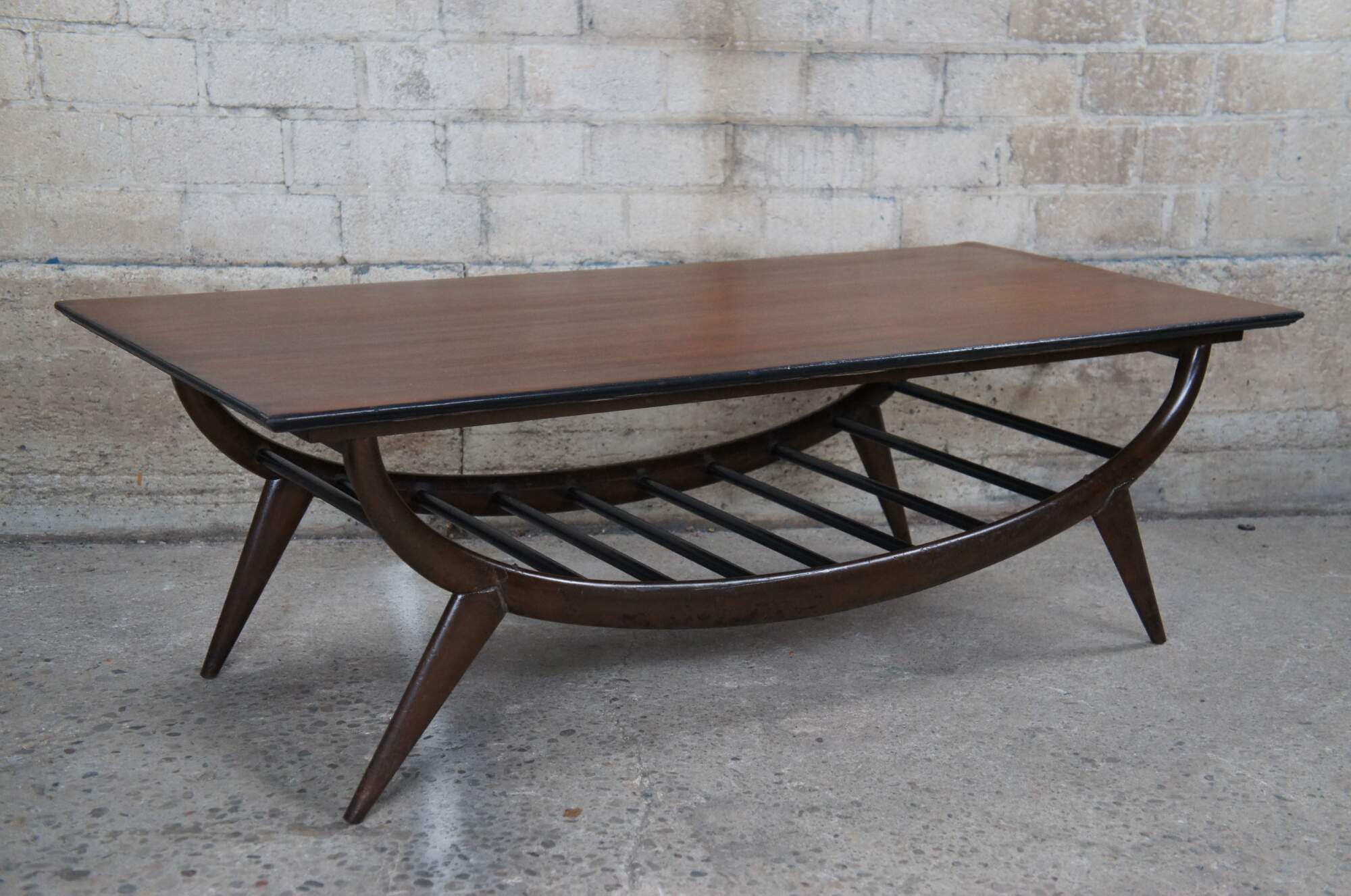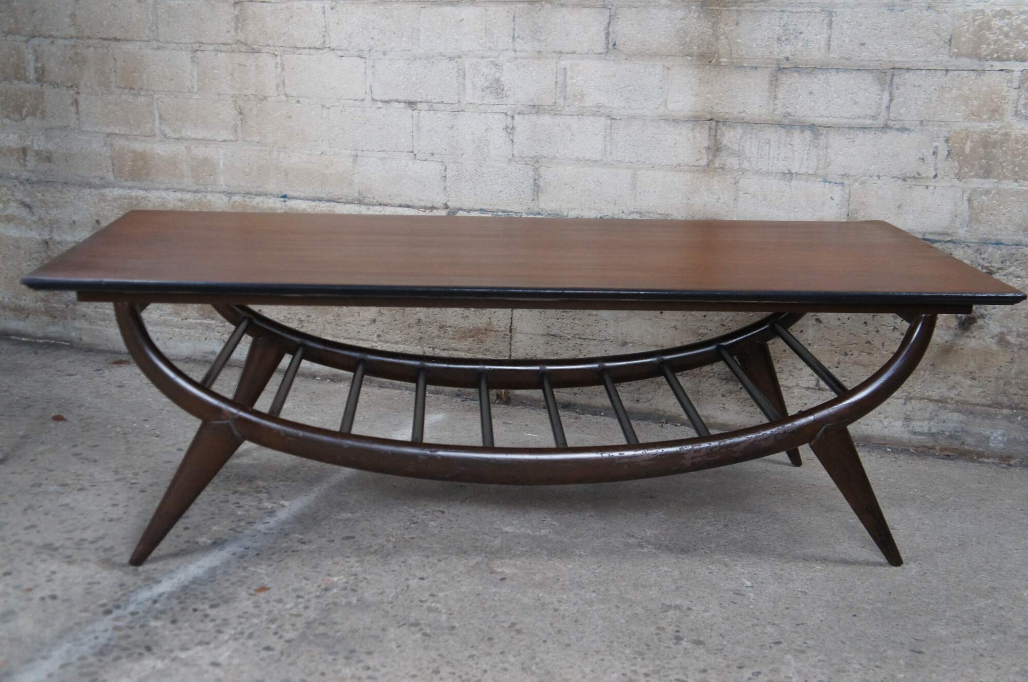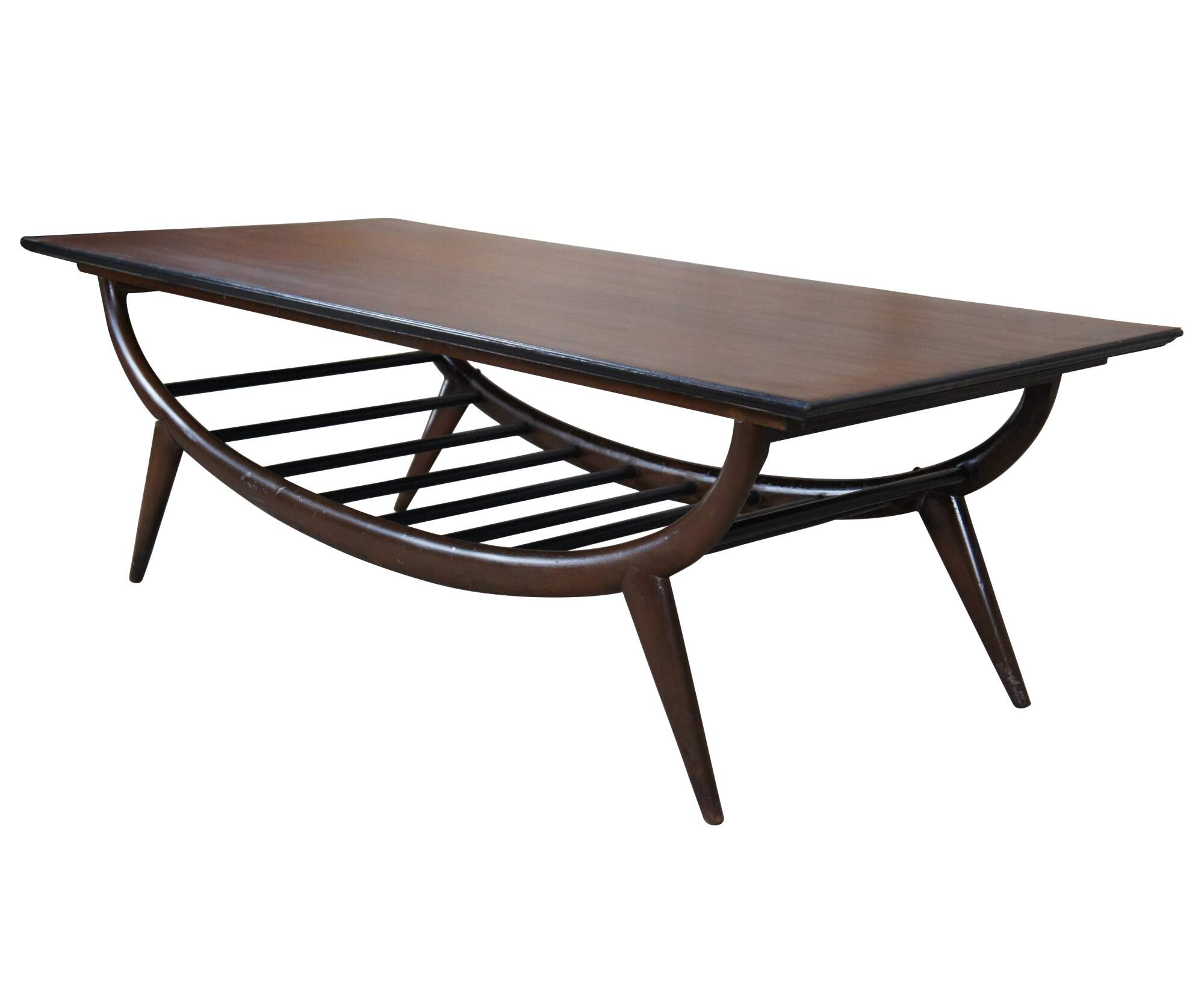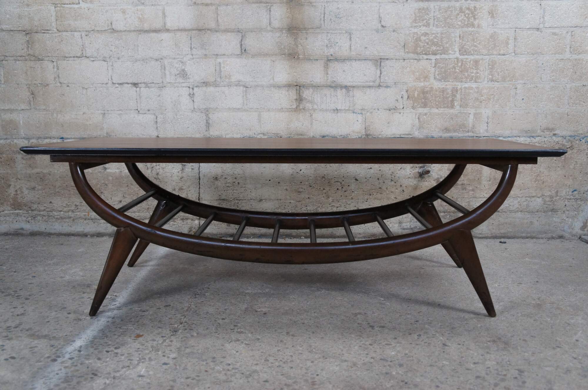 An impressive Mid Century Modern coffee table. Features a sculptural oak form with an open slatted base and tapered peg legs. Marked along underside 20529