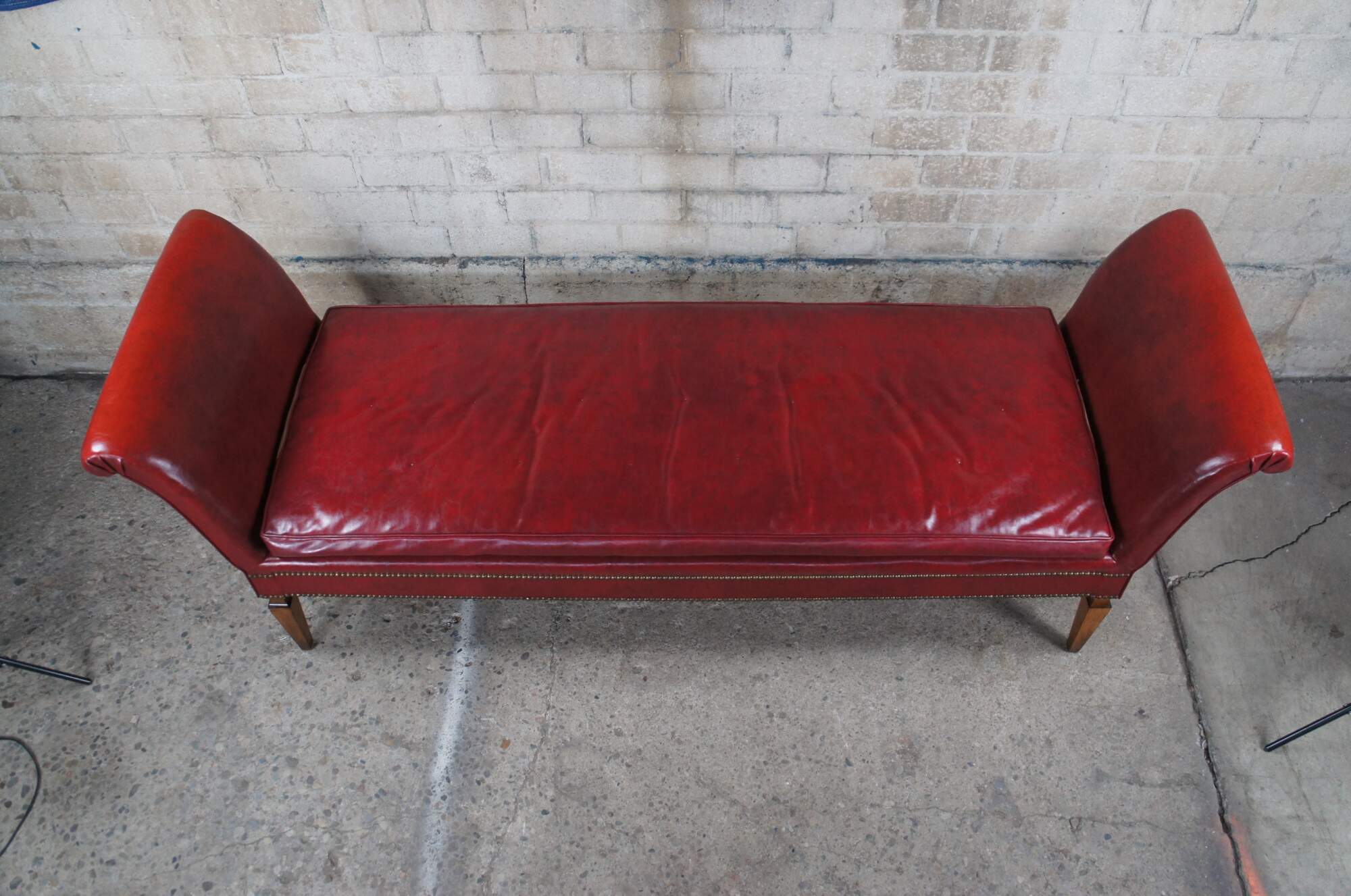Large Mid 20th Century Chaise Lounge, bench or daybed. Features a long red leather upholstered frame with flared and scrolled arms over square tapered mahogany feet. Includes nailhead trim.