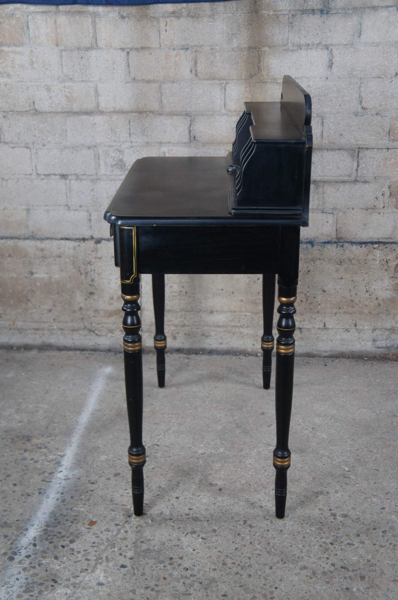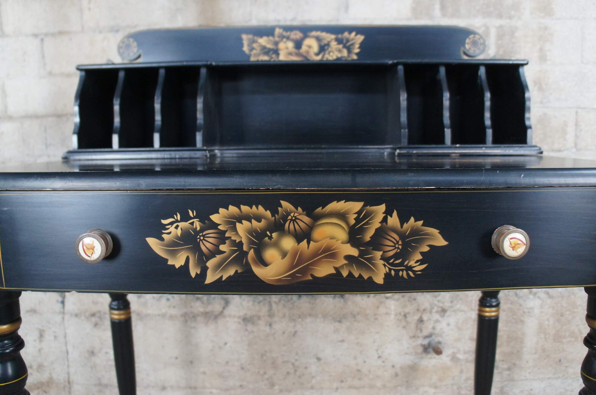 Mid 20th Century Lambert Hitchcock Black Forest stenciled ladies secretary writing desk or console table. Made of maple featuring black ebonized finish with gold accents and stenciled arrangement of gourds and vegetables. Includes porcelain knobs with an eagle carrying a flag. True Hitchcock secretary desks are becoming harder and harder to find.