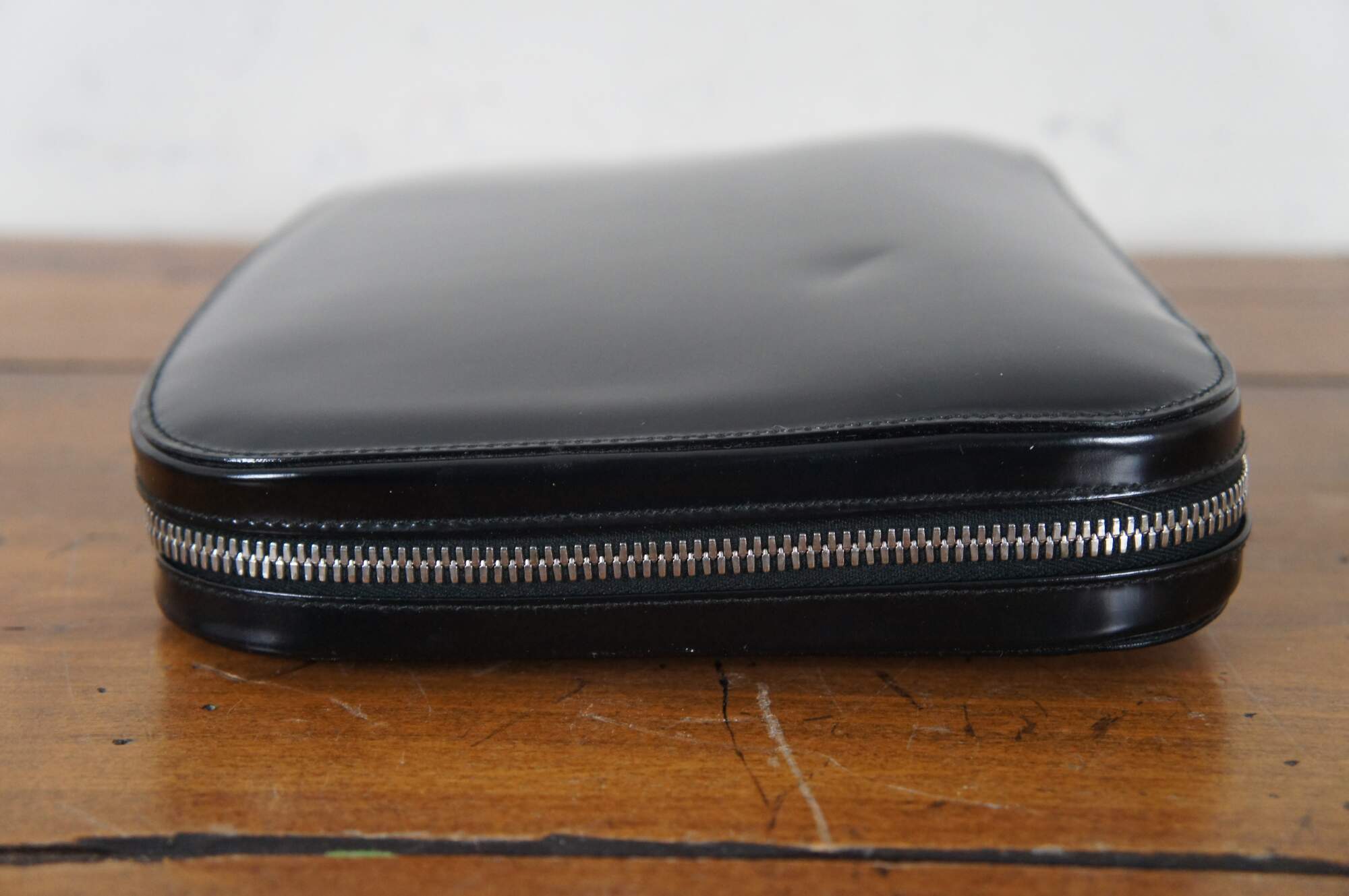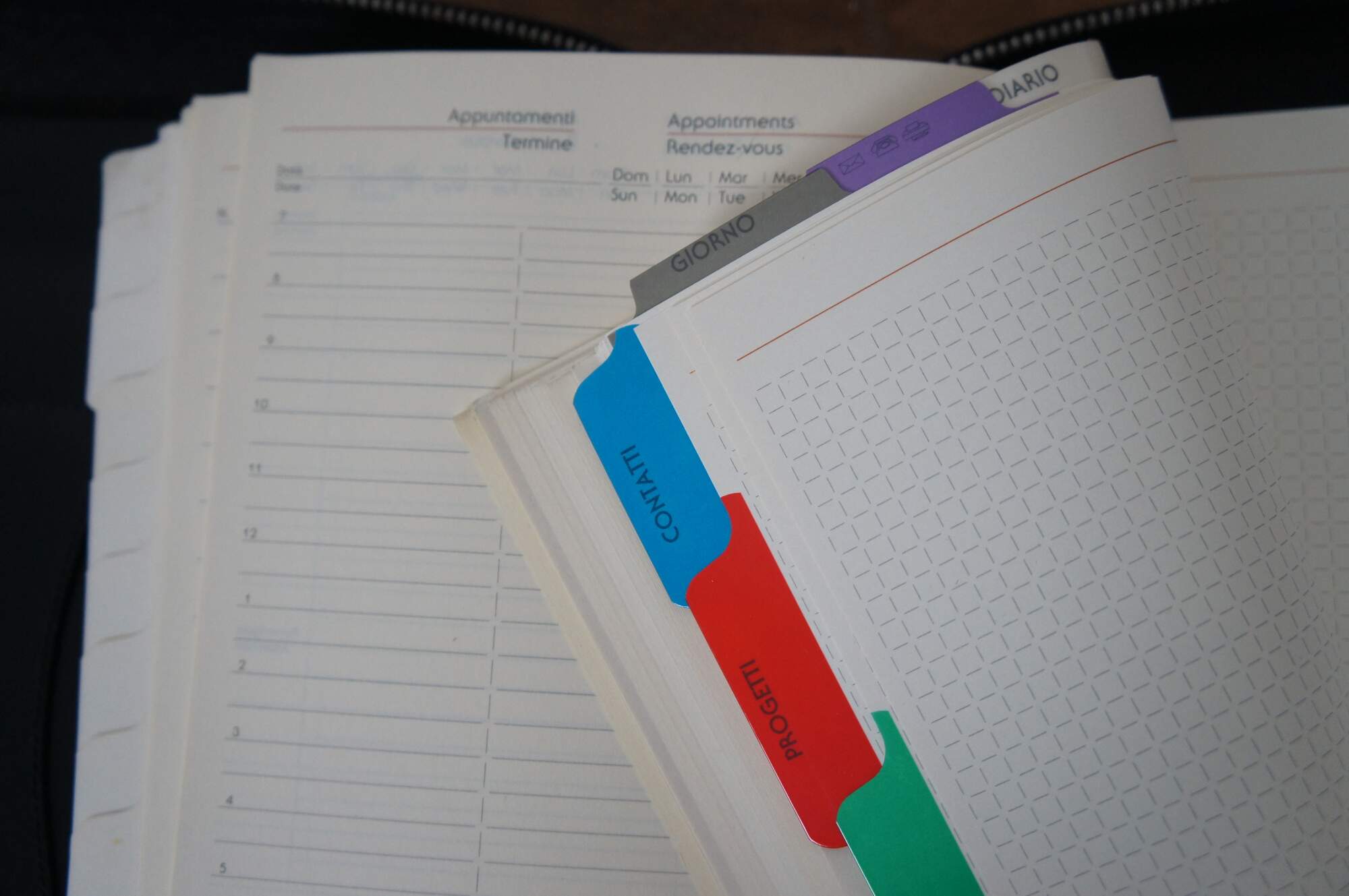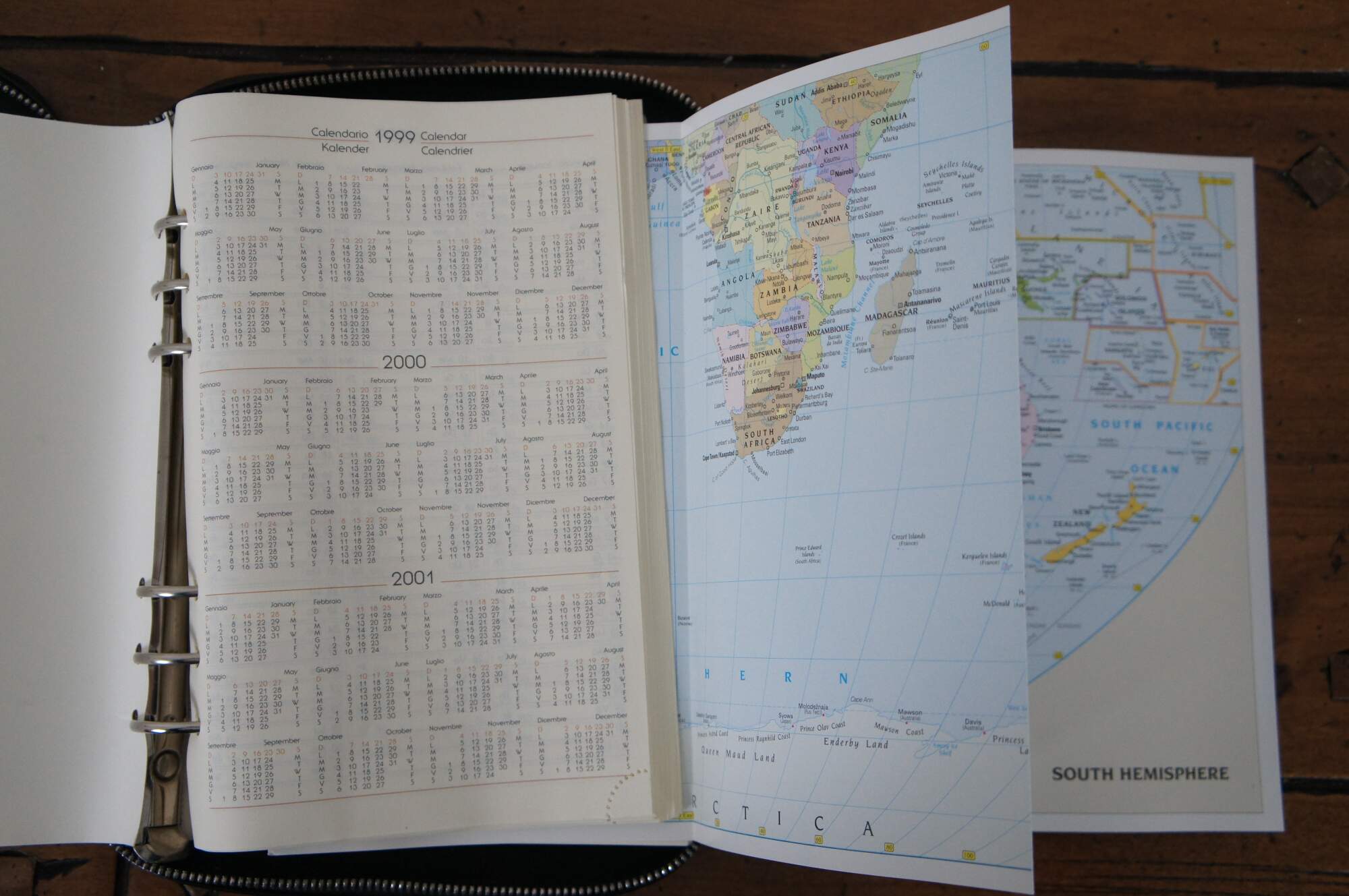 Vintage Bally of Switzerland black patent leather day planner / agenda / journal / notebook / organizer featuring three flat pockets in the front and a removable flat wallet with space for 9 cards plus cash. Original unused tabs / pages include an accordion style atlas / world map, 1999-2001 calendar, and sections for Contacts, Projects, Goals, Notes, Expenses (side edge), and Memo, Diary, Mail/Phone/Fax, and Day Planner (top edge). Page titles appear in English parallel with multiple languages. Tab labels are in English and Italian.