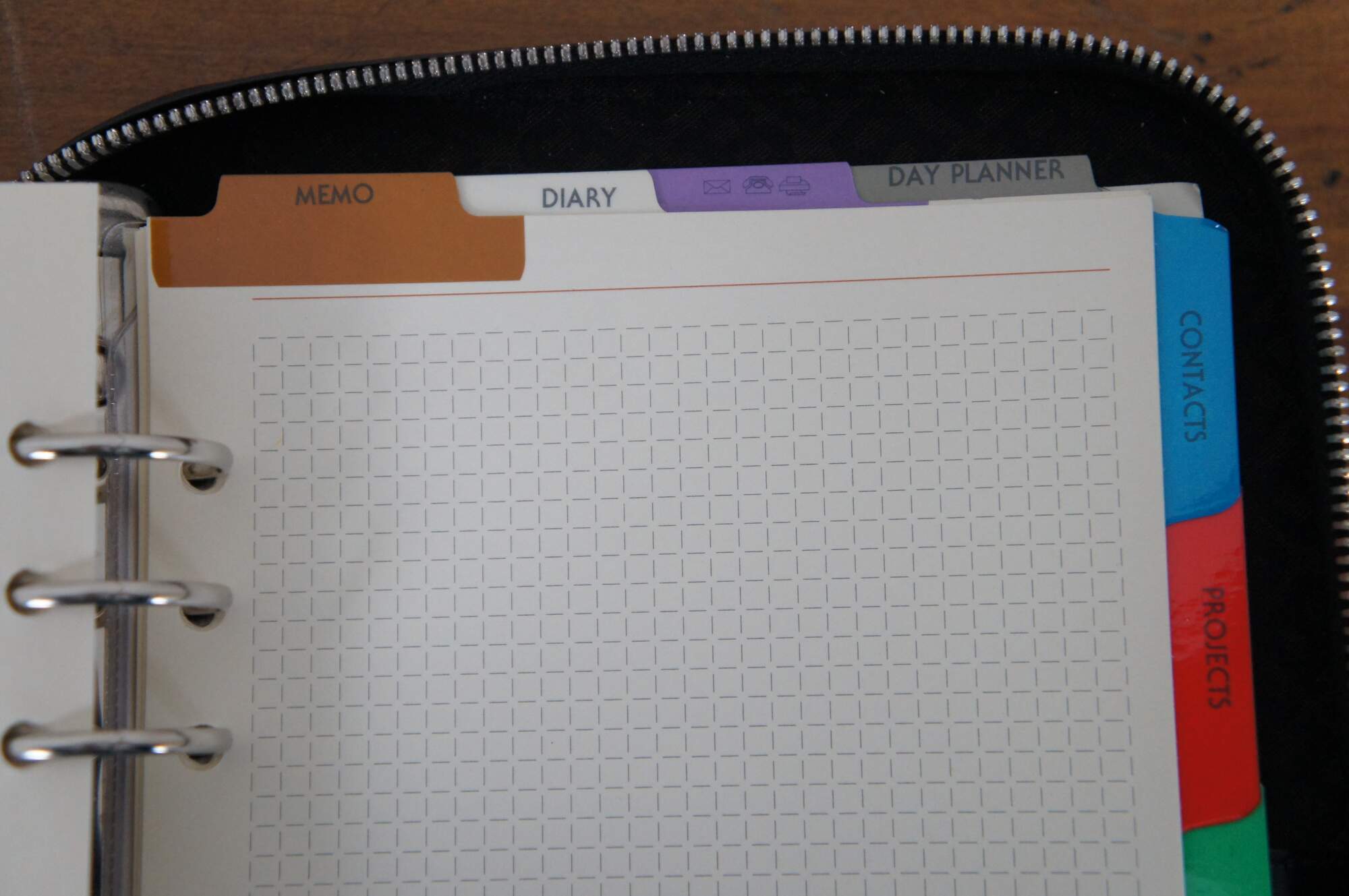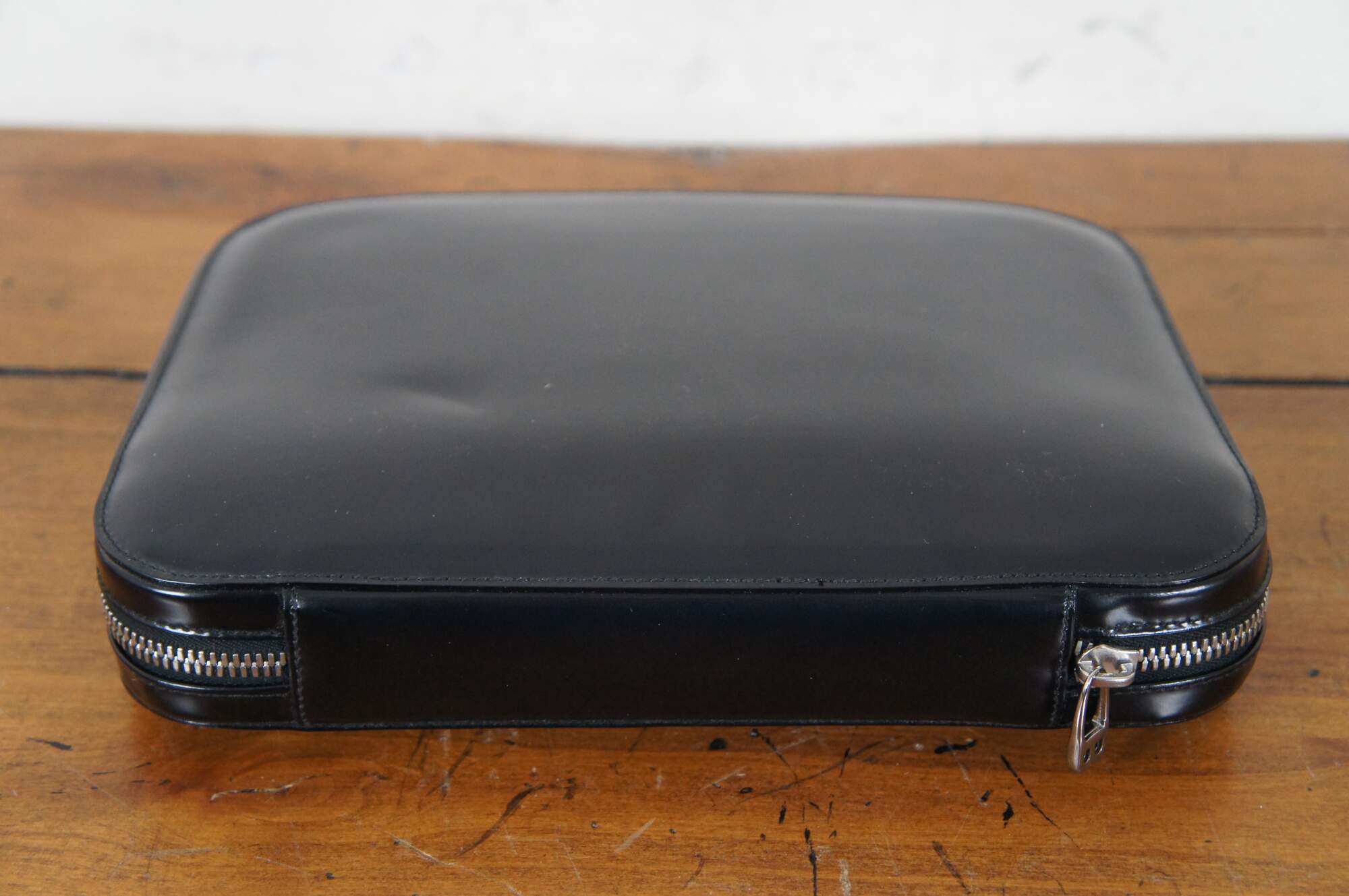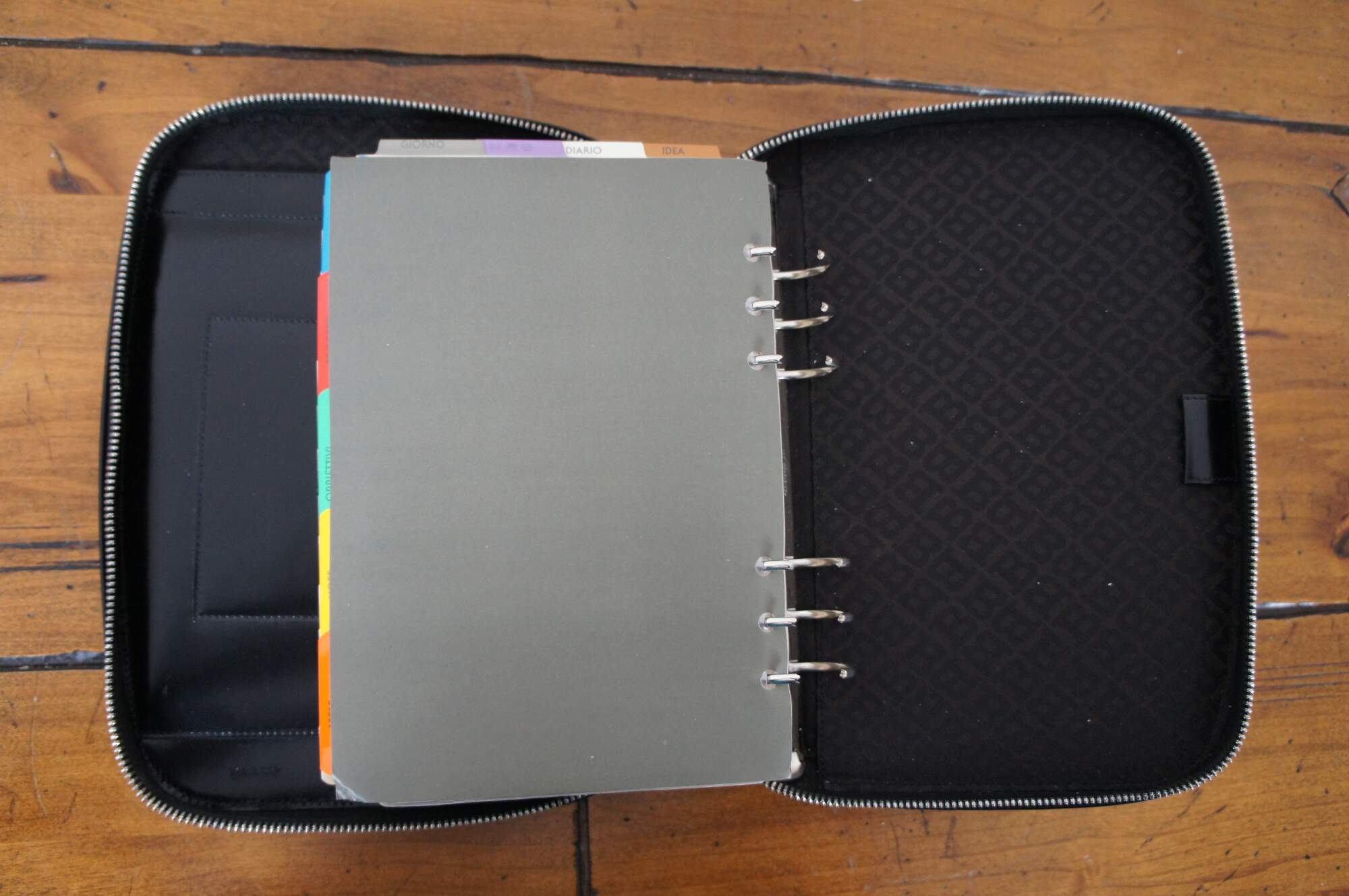 Vintage Bally of Switzerland black patent leather day planner / agenda / journal / notebook / organizer featuring three flat pockets in the front and a removable flat wallet with space for 9 cards plus cash. Original unused tabs / pages include an accordion style atlas / world map, 1999-2001 calendar, and sections for Contacts, Projects, Goals, Notes, Expenses (side edge), and Memo, Diary, Mail/Phone/Fax, and Day Planner (top edge). Page titles appear in English parallel with multiple languages. Tab labels are in English and Italian.