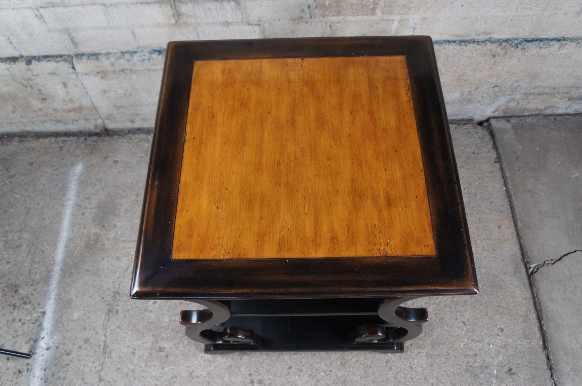A Theodore Alexander end table, part of Ateliers De La Madeleine Collection, with bold scrolling supports, distressed in two tone mahogany, conjoined with two tiers and resting on bracket feet. Naturally Distressed. Retains the brass Ateliers oval name plate