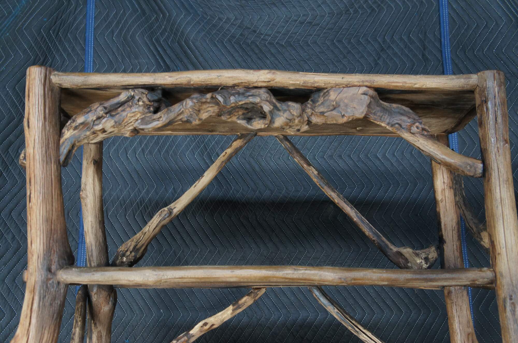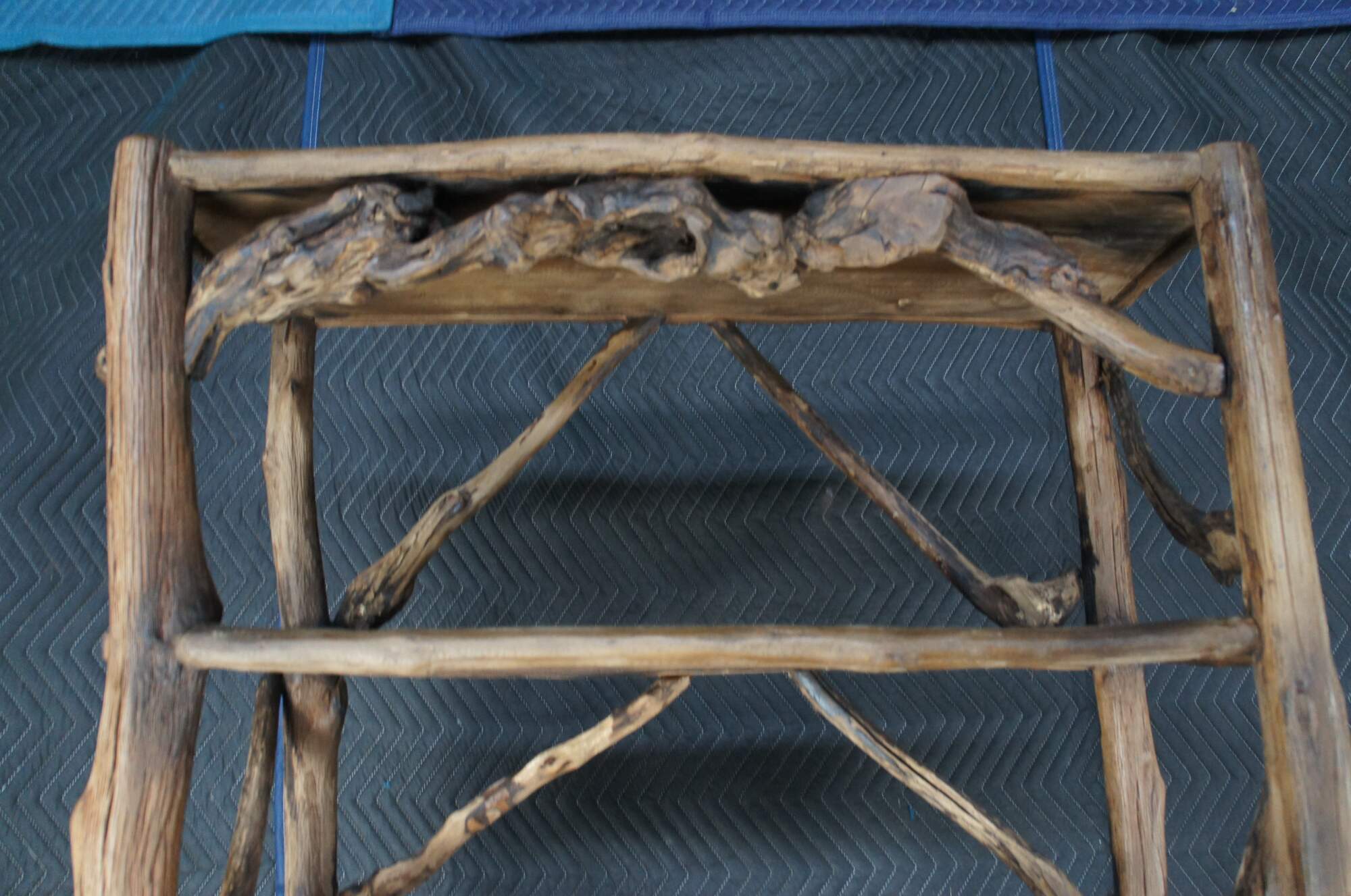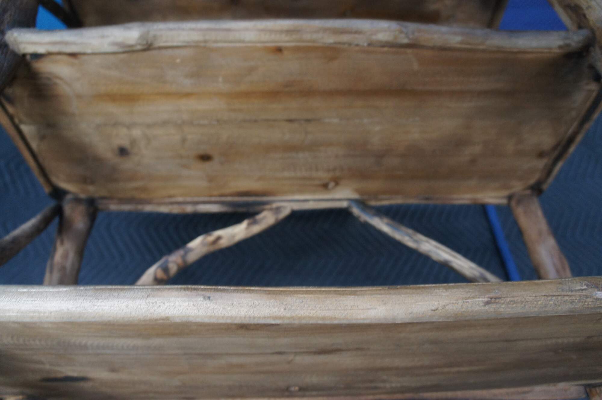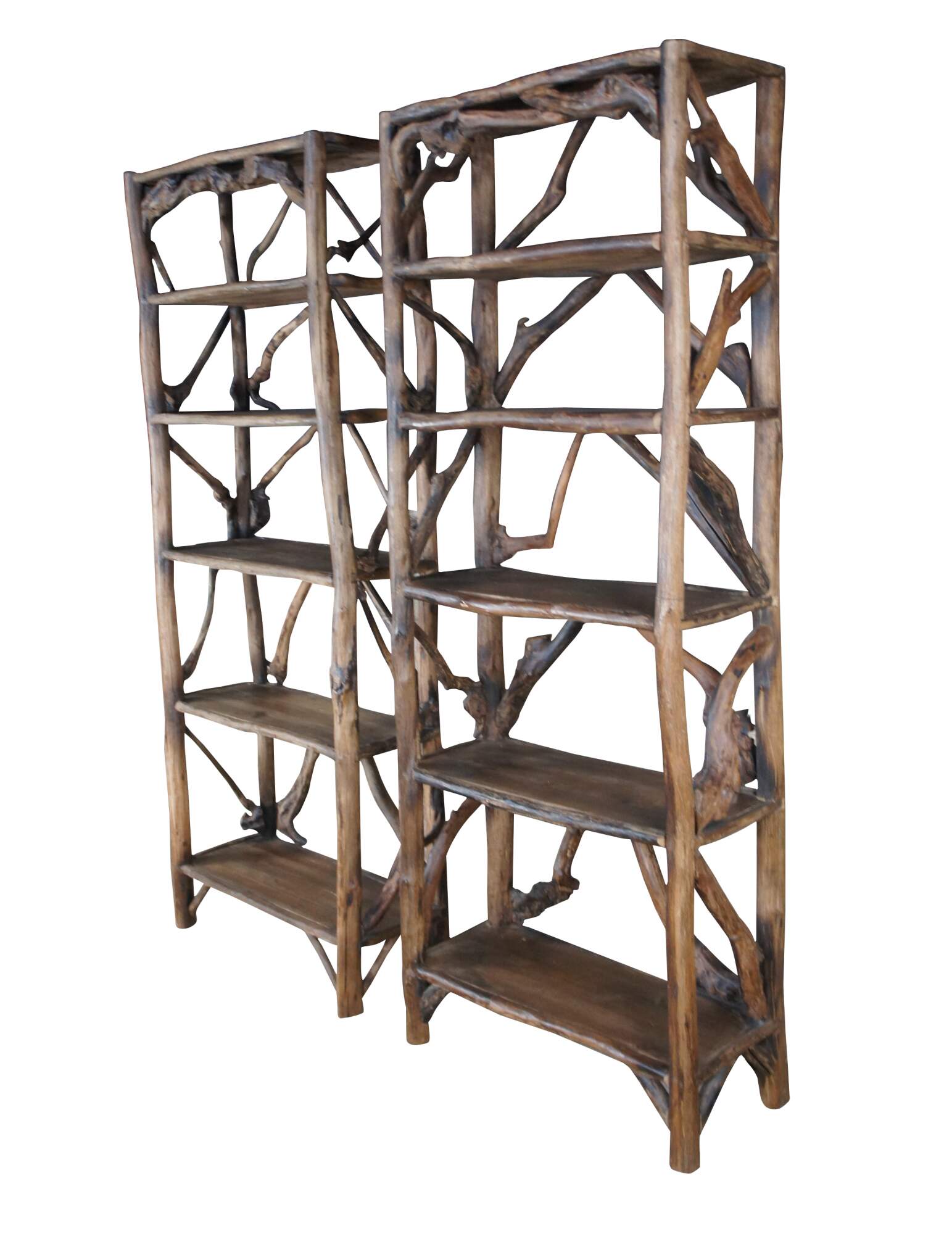 Beautiful pair of Artisan handmade Adirondack bookcases, circa late 20th century. Made from hickory branches with a freeform design featuring 5 shelves. The perfect rustic bookshelf to a library, lounge or living space.