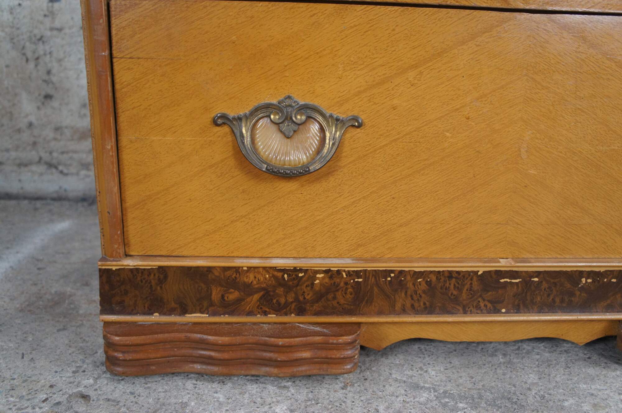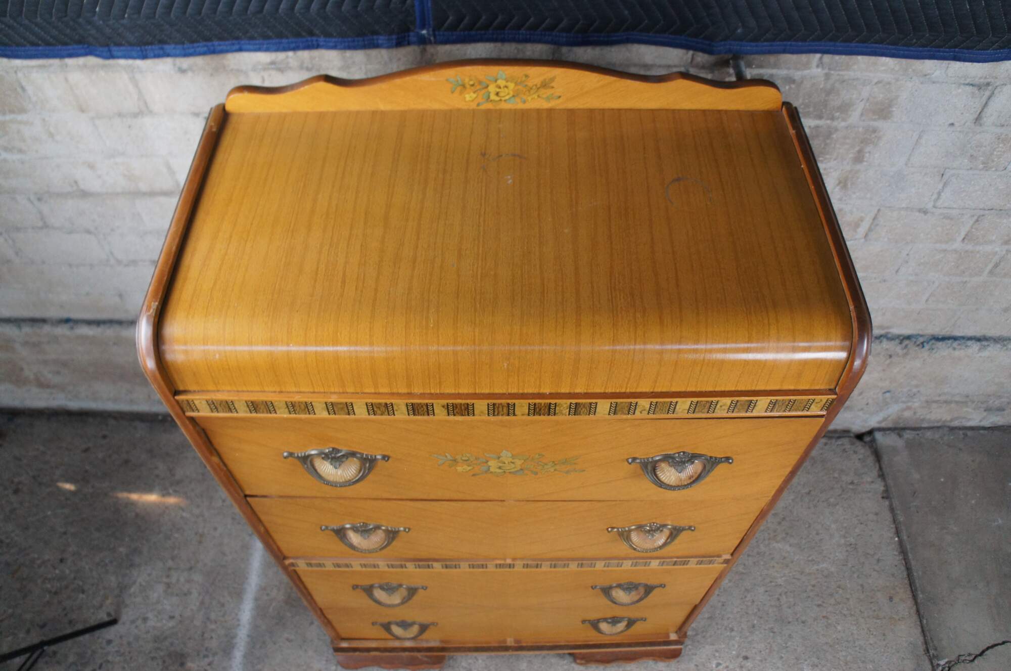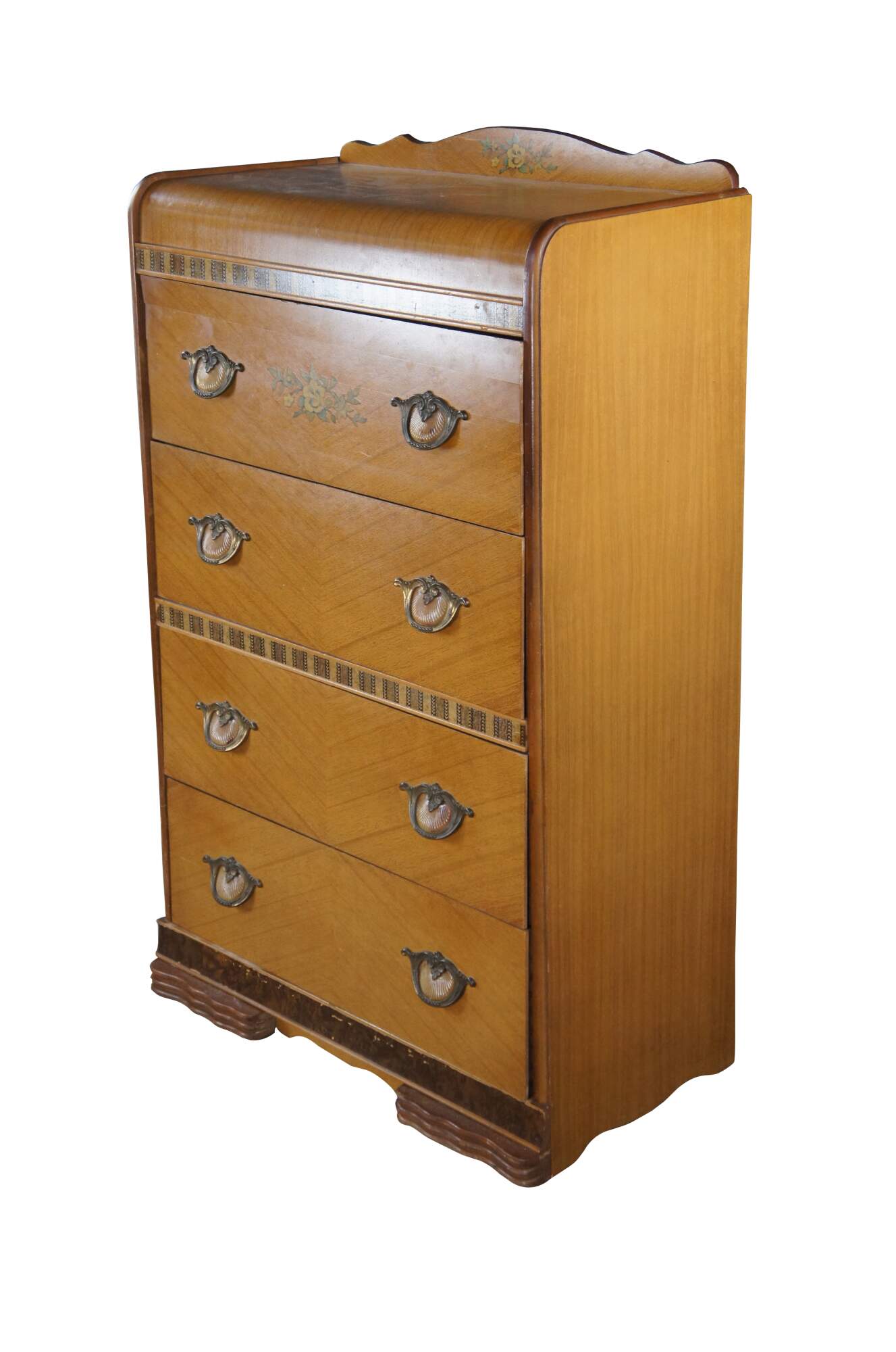 Mid 20th Century Art Deco waterfall chest of drawers. Made from mahogany with a matchbook "v" grain veneer along the front, faux burl / inlay and floral printed accents. The drawers are accented by brass and bakelite hardware. Marked along the back 205 Toast Chest, HDW.K6766. Finish is blonde