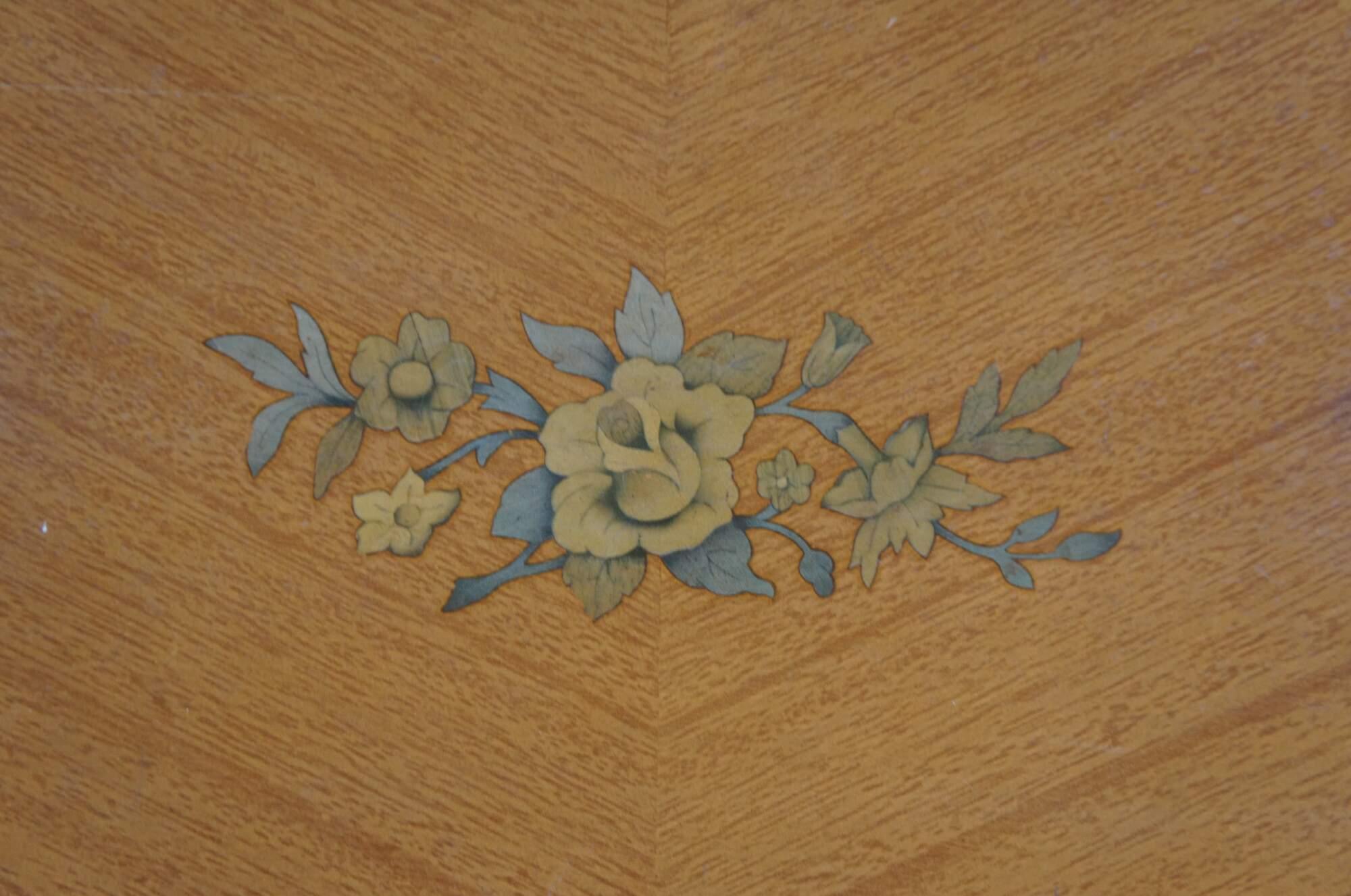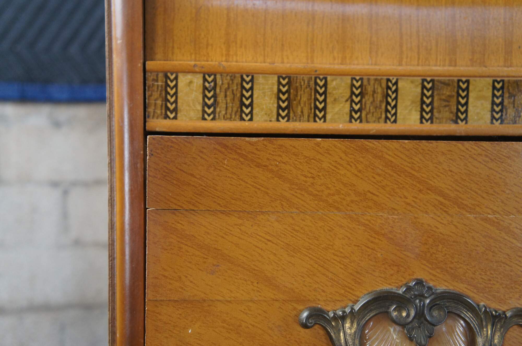 Good Condition with age and use related wear. some wear the the printed burl and designs. Edge wear and marking to frame. Split along top drawer.