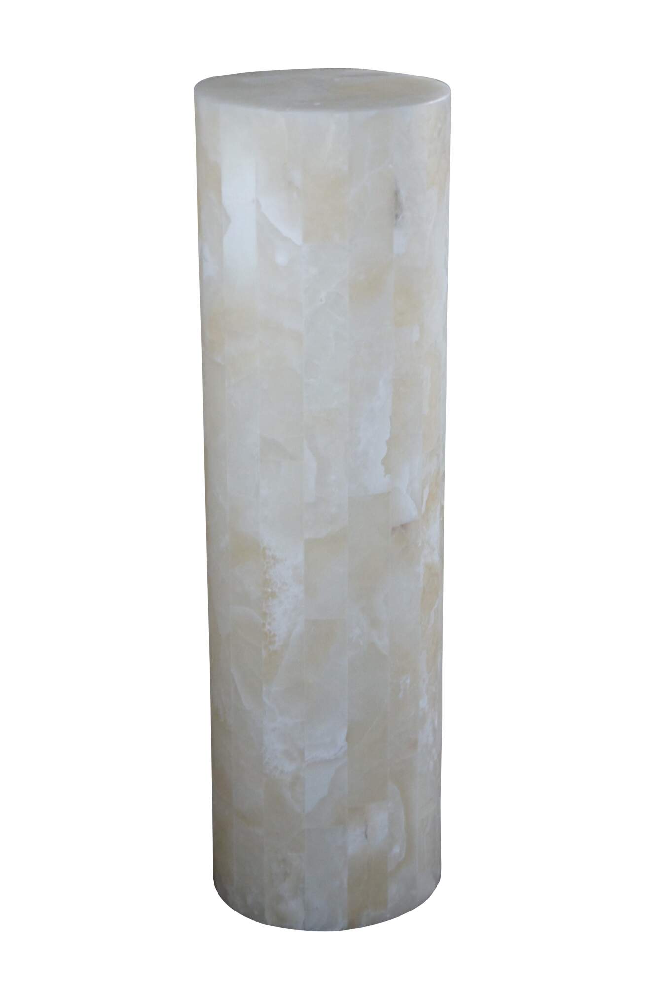 A stunning tessellated onyx illuminated column or floor lamp. Cylindrical form that is perfect for the display of a sculpture or as a stand alone. Features two bulbs on the inside that bring about a bright mesmorizing glow.