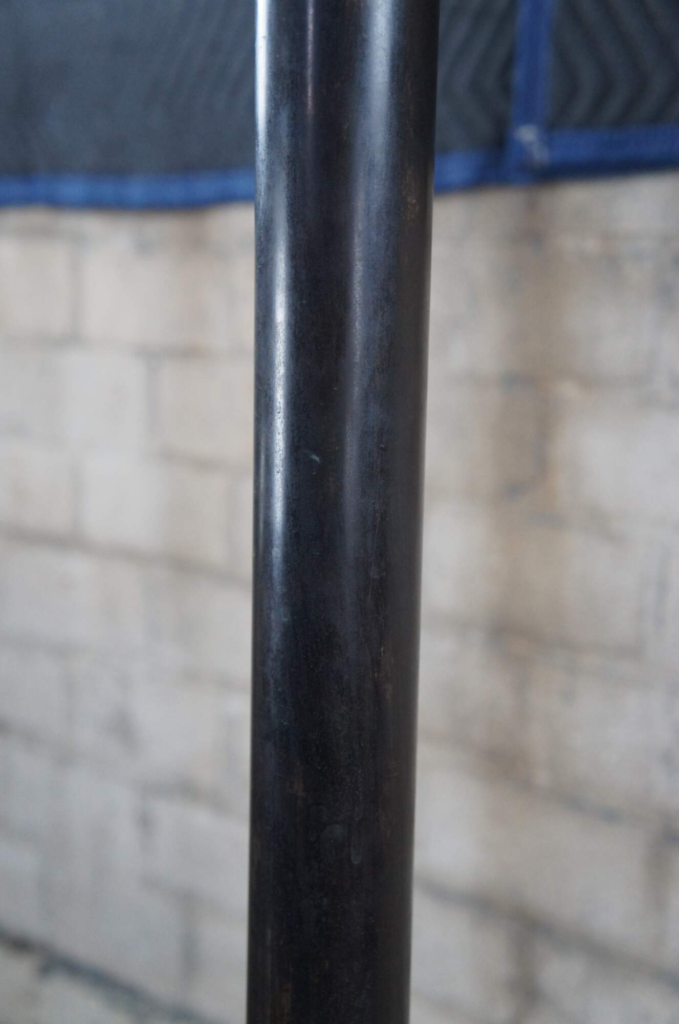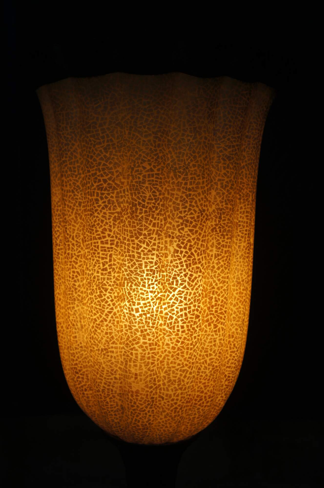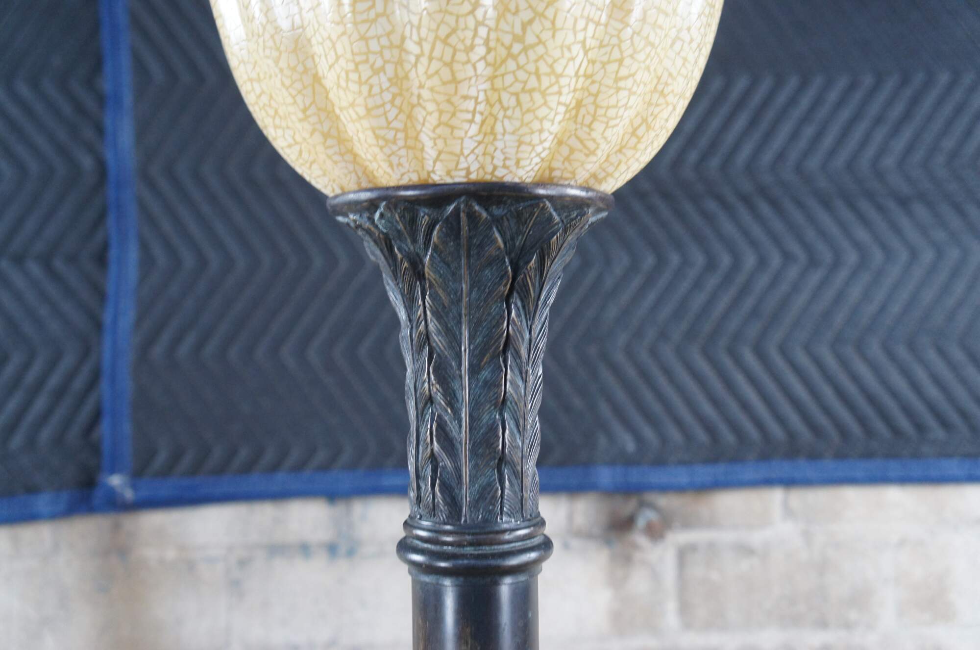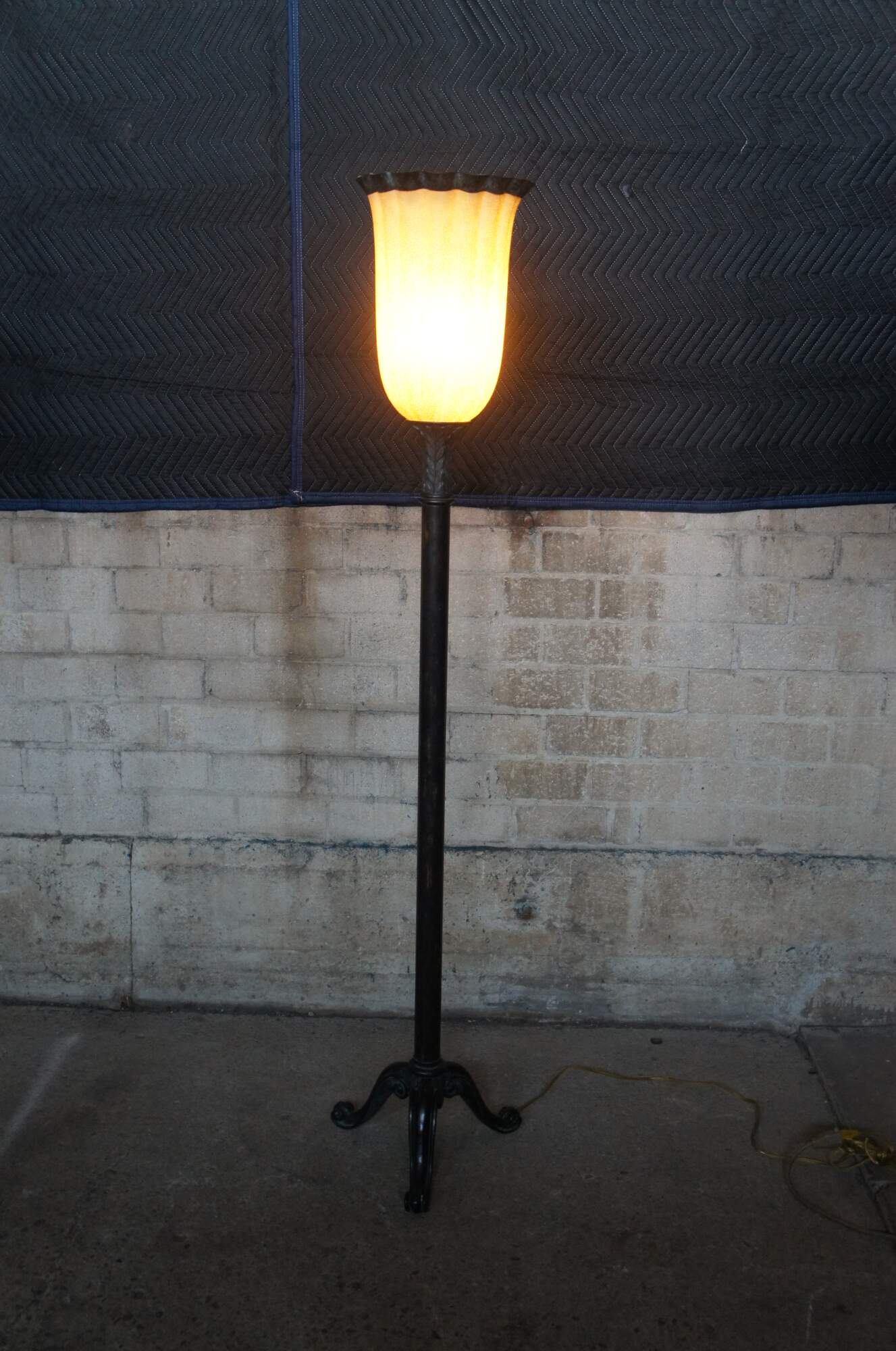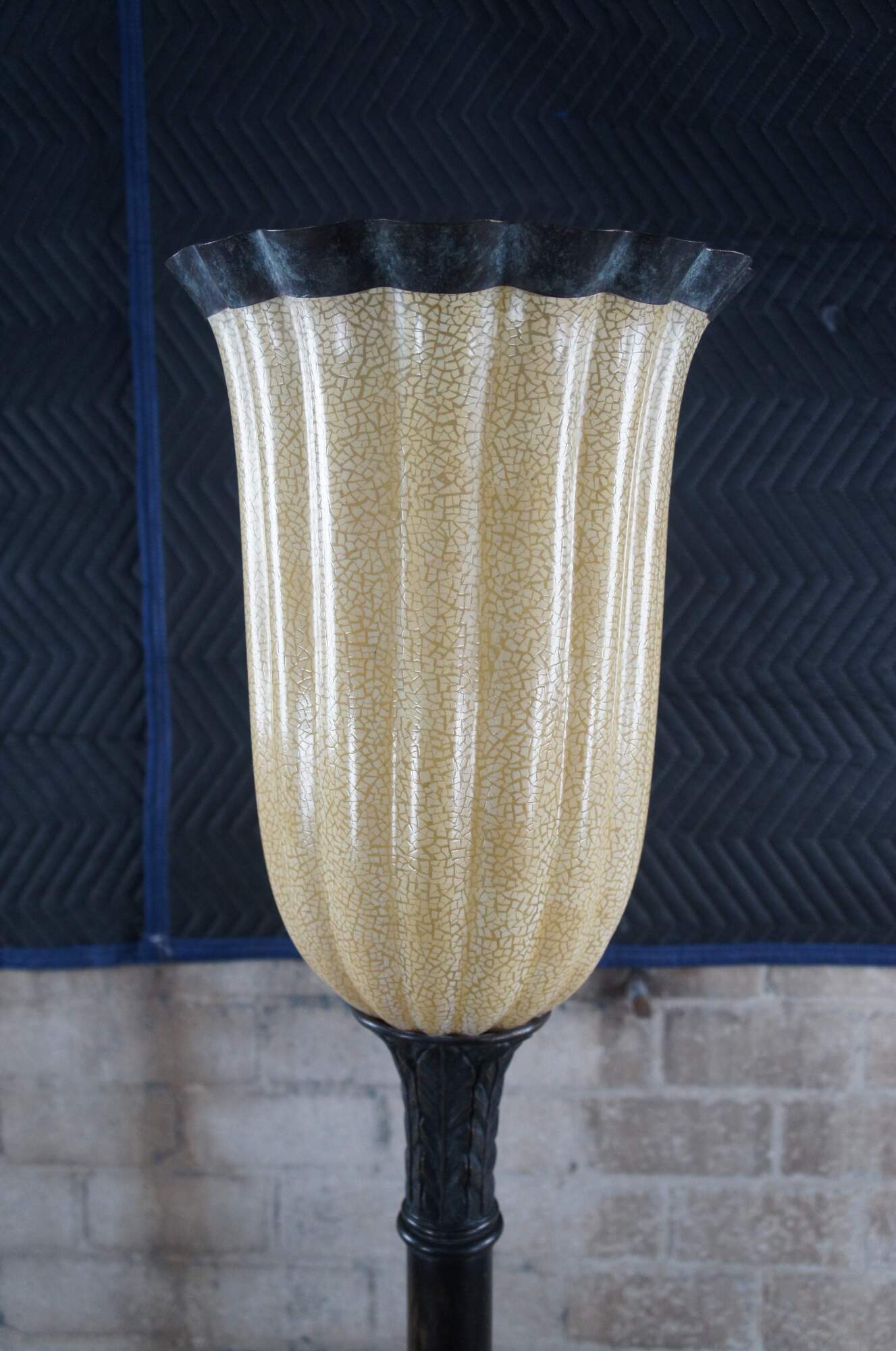 Late 20th century floor lamp by Maitland Smith. Features a tessellated shell shade that is fluted with a clambroth or crimped rim. The base is metal with leaf accents and a scrolled tirpod base.