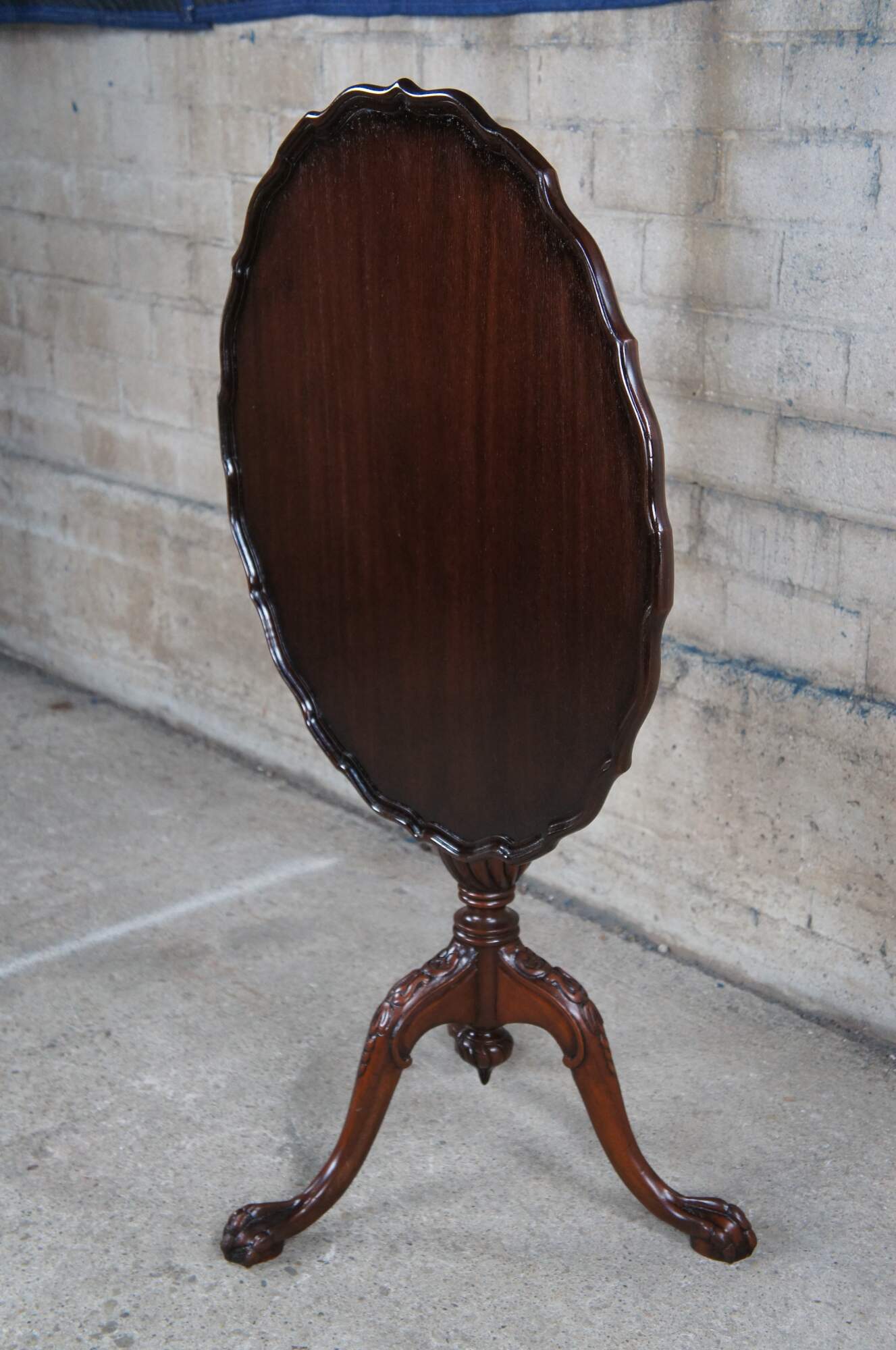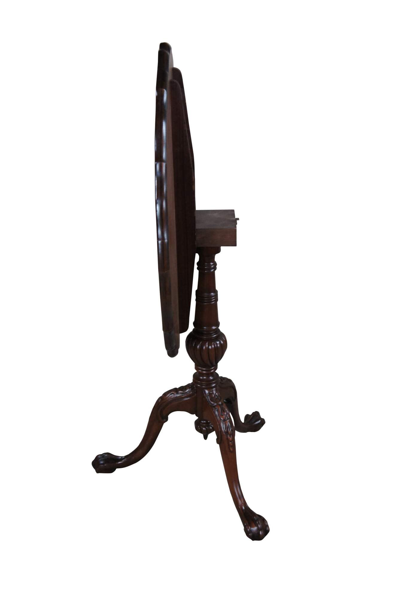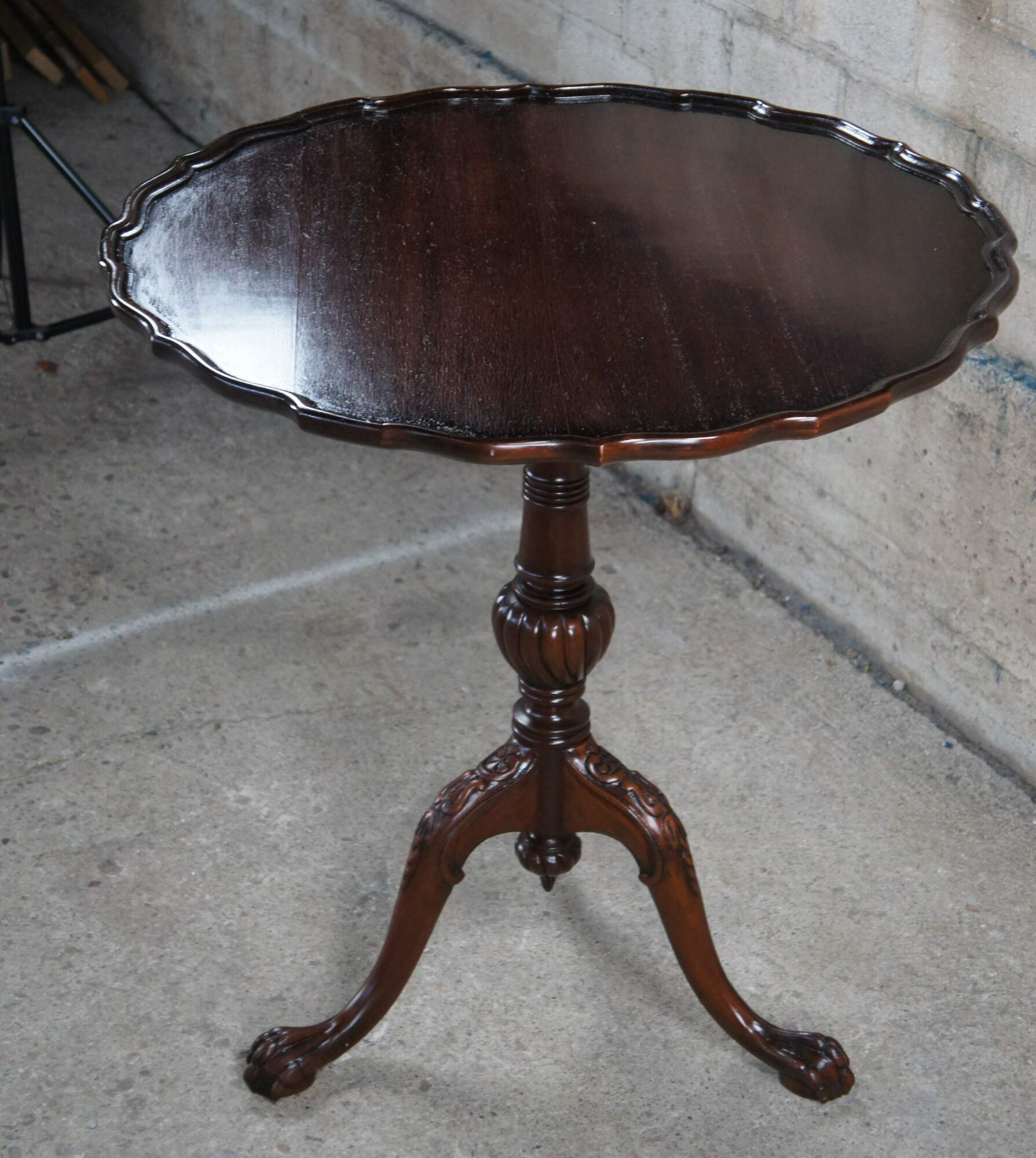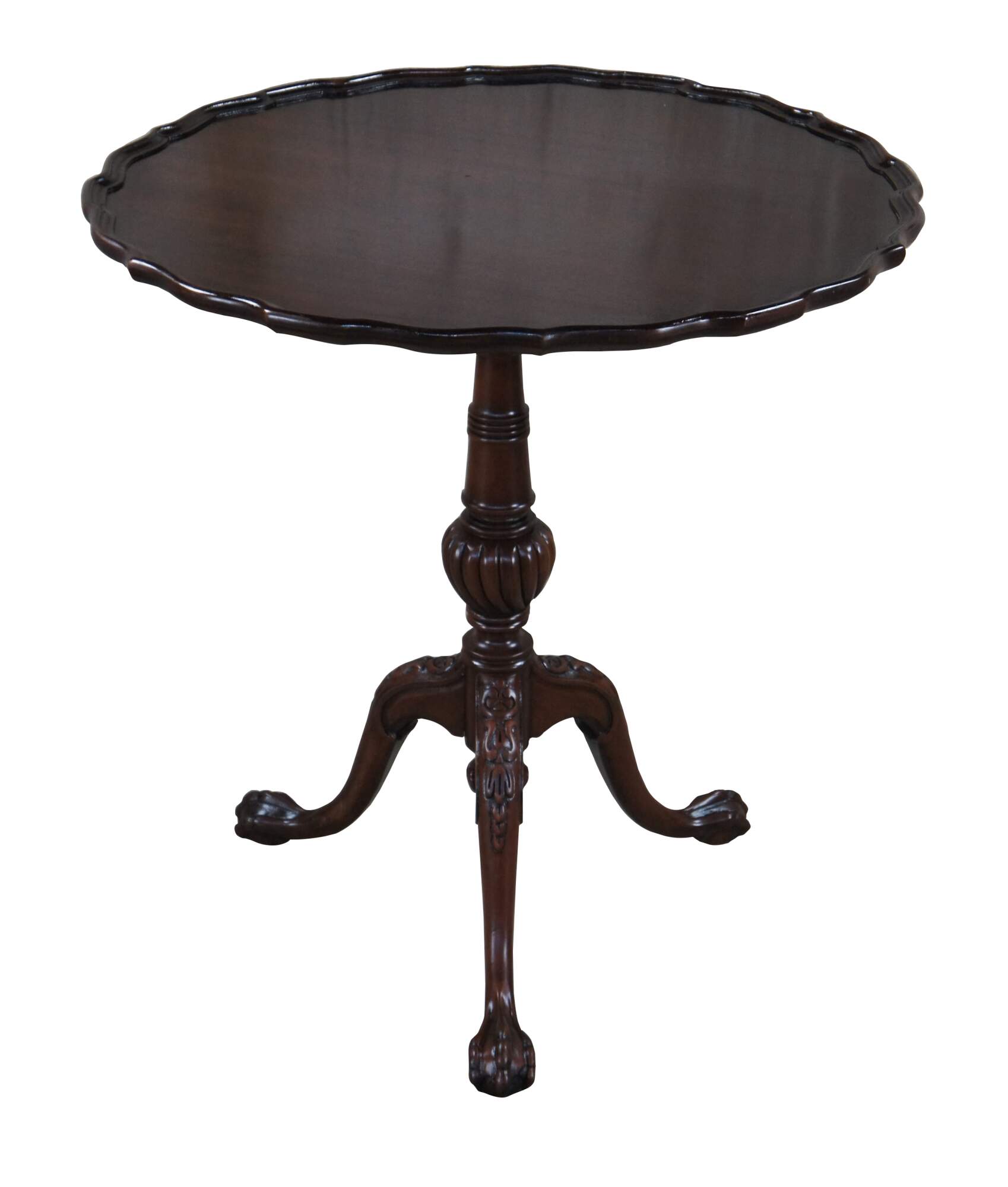 An antique English Chippendale style pie crust table, circa 1900s. Made from mahogany with a beautifully scalloped top over a turned and graduated center column, ribbed over a fluted and twised bulb. The table is supported by three downswept legs leading to ball and claw feet. Beneath the center is a lovely turned down finial that is turned to a point. The table top tilts via a brass latch allowing it to be tucked away while showcasing its beauty awaiting future use.