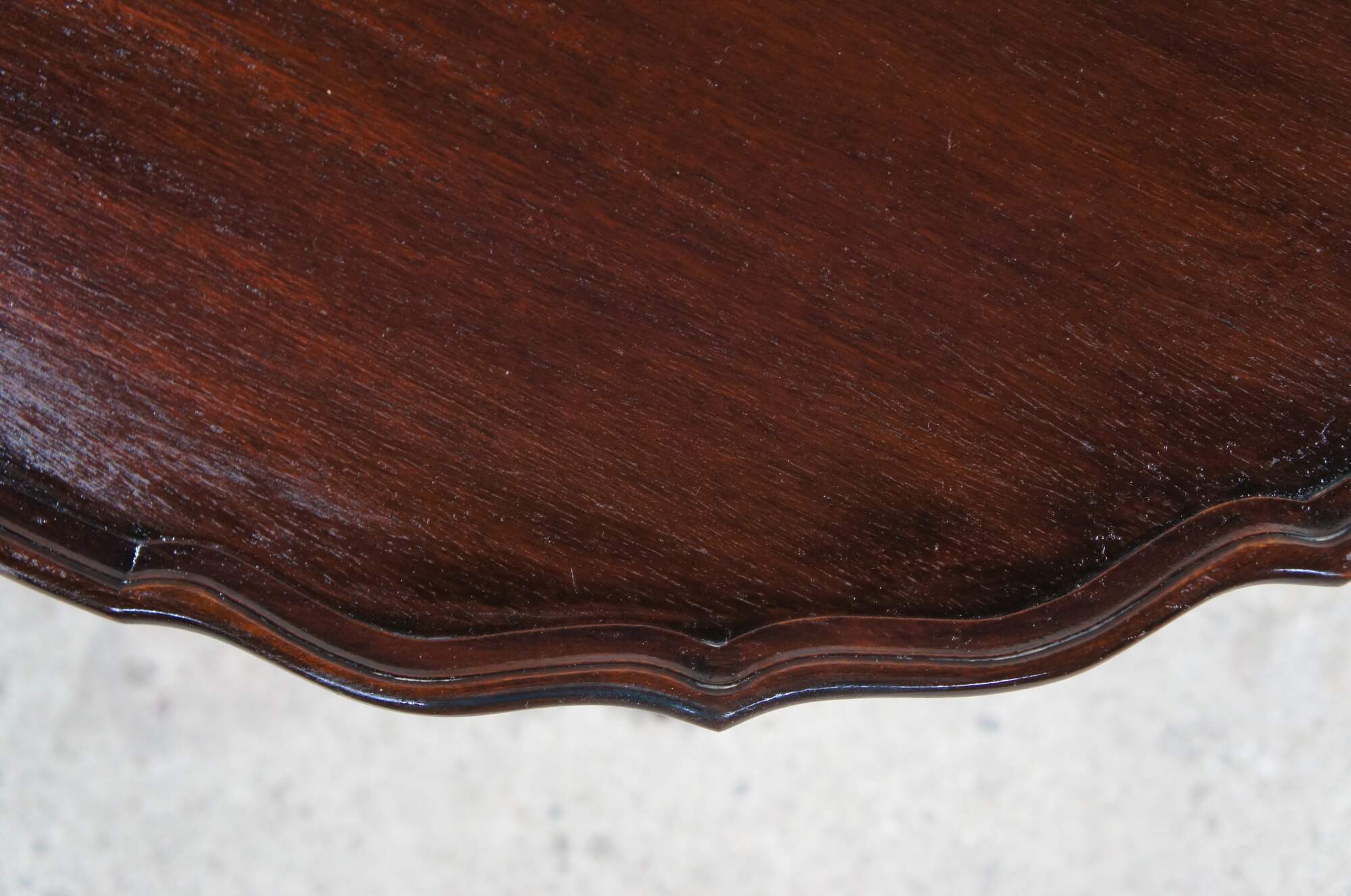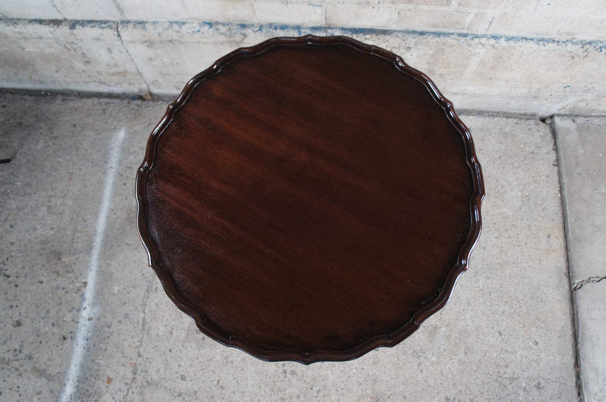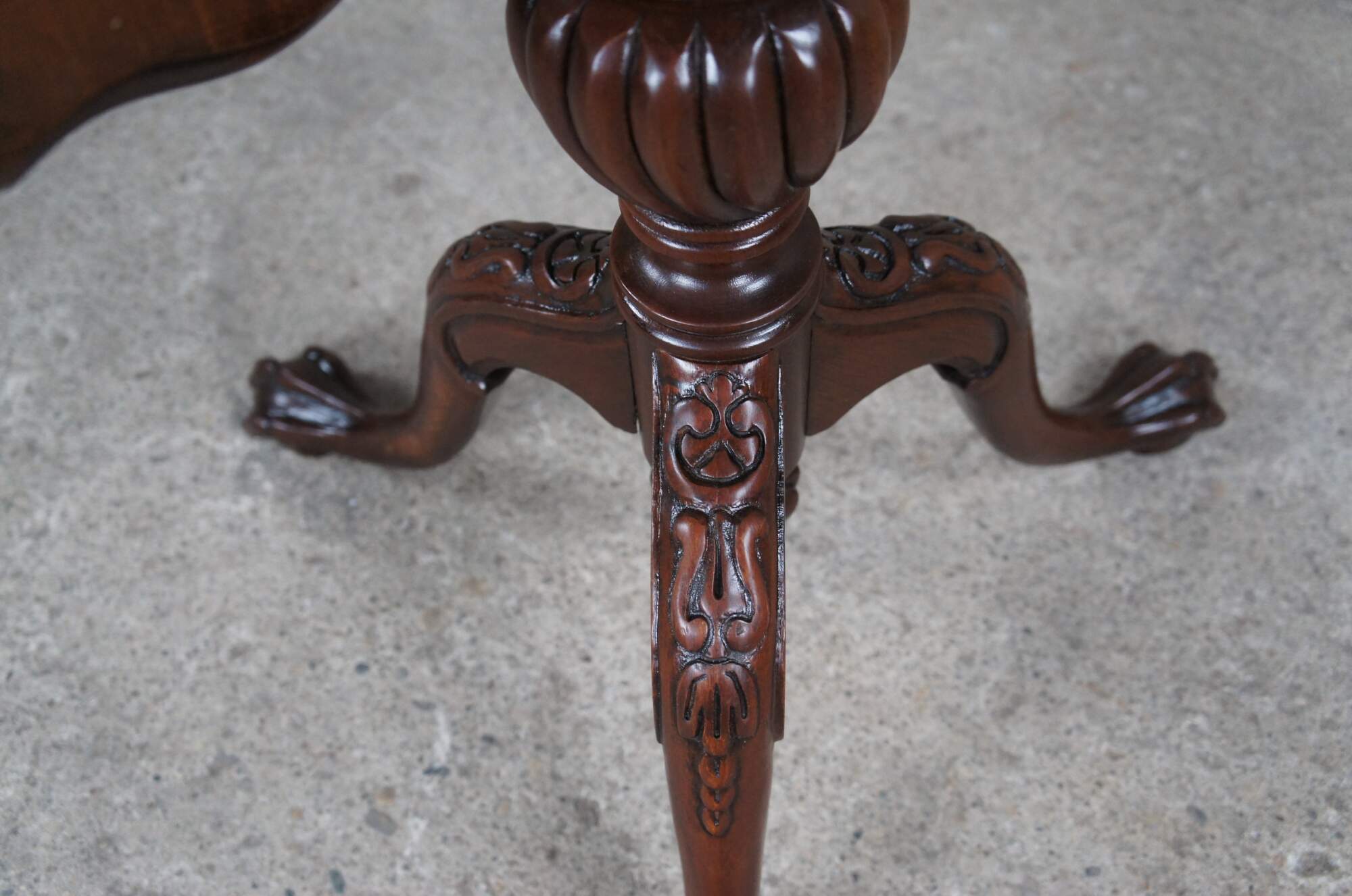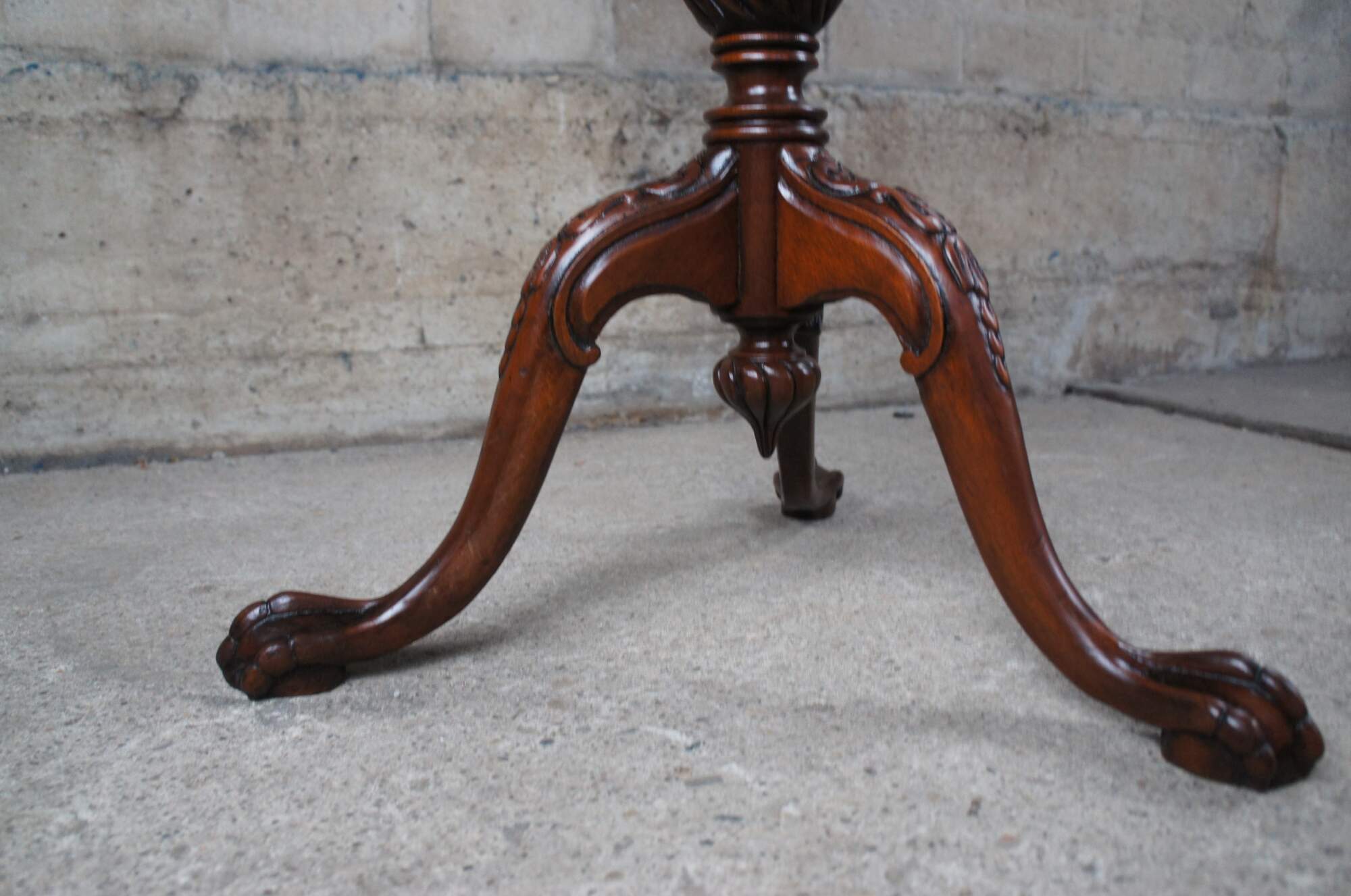 An antique English Chippendale style pie crust table, circa 1900s. Made from mahogany with a beautifully scalloped top over a turned and graduated center column, ribbed over a fluted and twised bulb. The table is supported by three downswept legs leading to ball and claw feet. Beneath the center is a lovely turned down finial that is turned to a point. The table top tilts via a brass latch allowing it to be tucked away while showcasing its beauty awaiting future use.