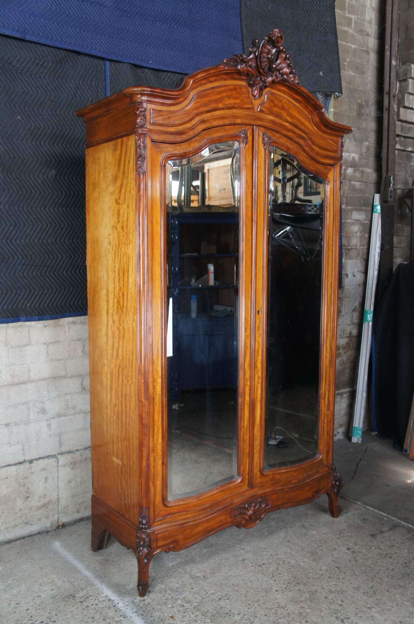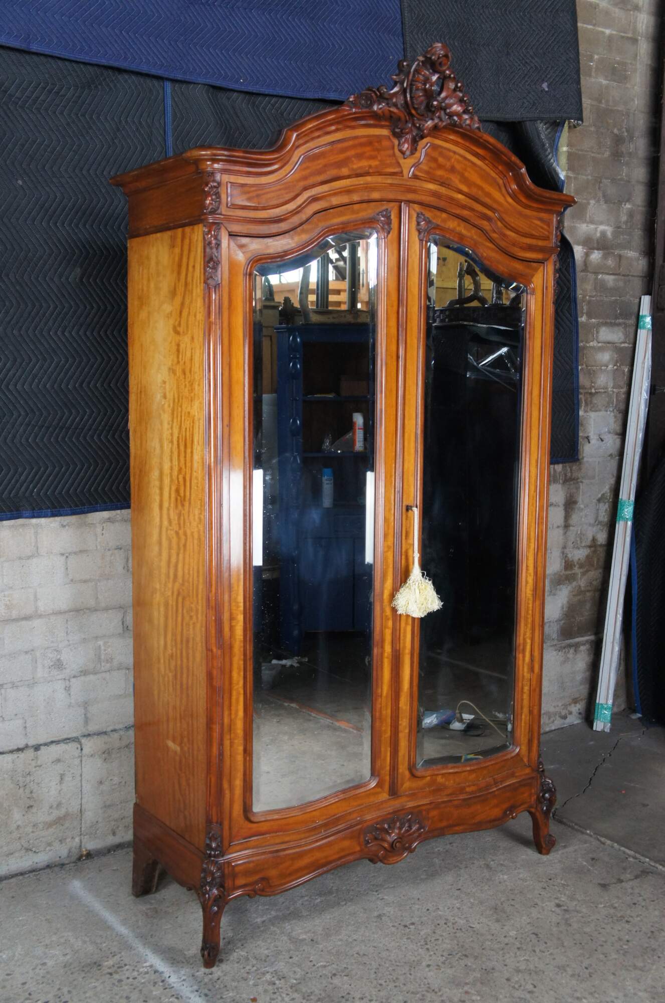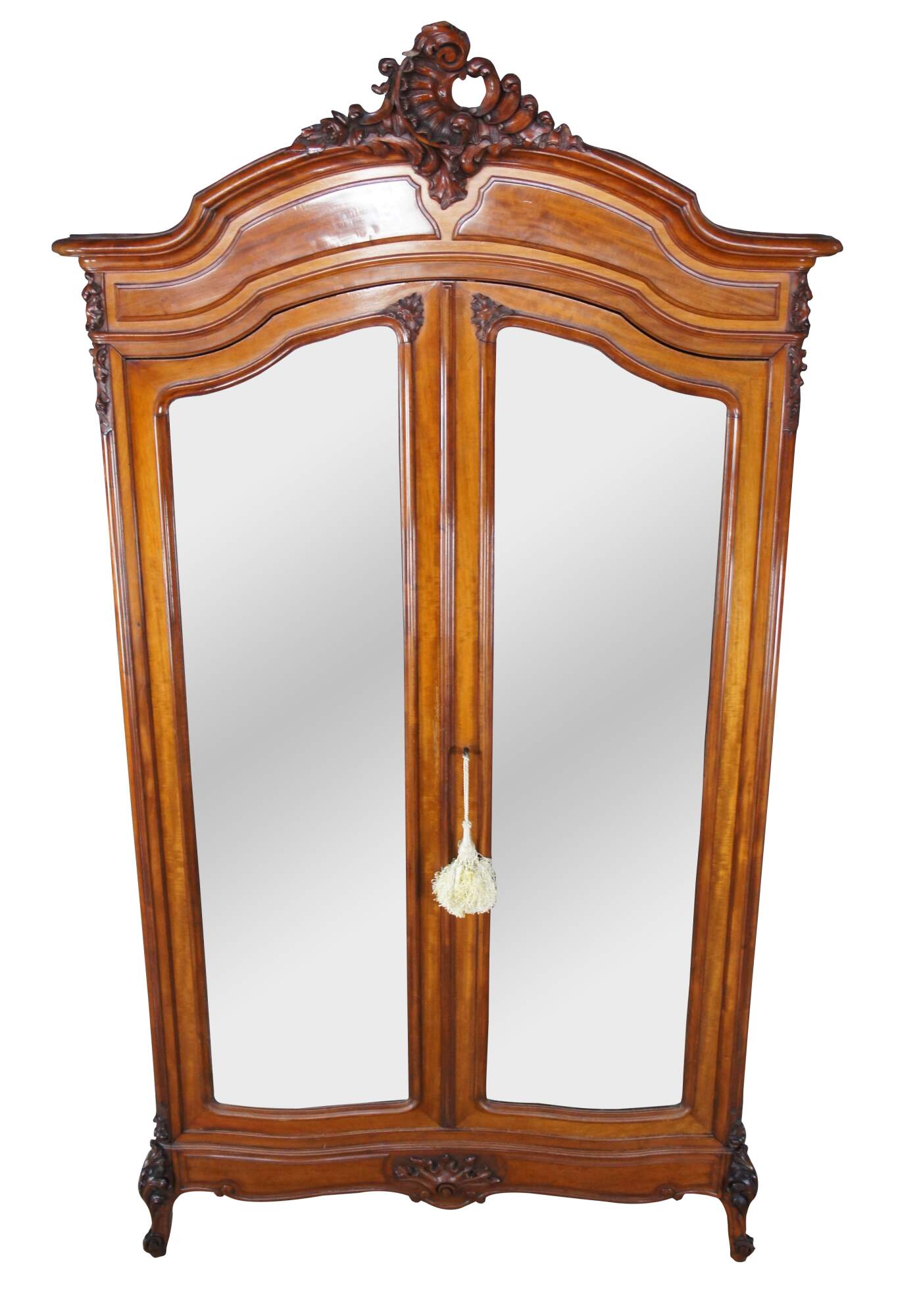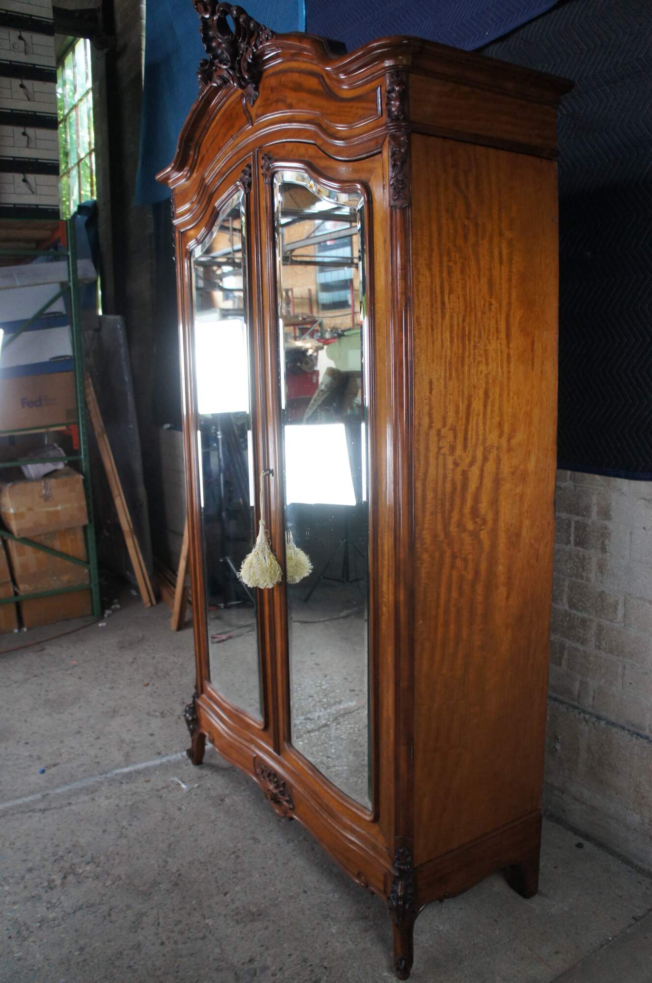 Monumental 19th century Louis XV / Rococo wardrobe or linen Press. Made of mahogany with a beautiful wood grain. Features serpentine aprons with magnificent foliate, acanthus and baroque inspired carvings. Includes large beveled mirrored doors and ornately scalloped cartouche. The wardrobe is supported by cabriole legs leading to scrolled feet. Opens to four adjustable shelves and lower lockable drawer.