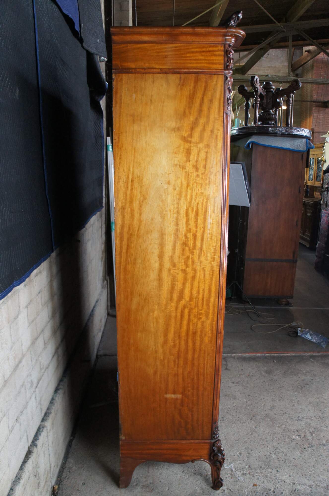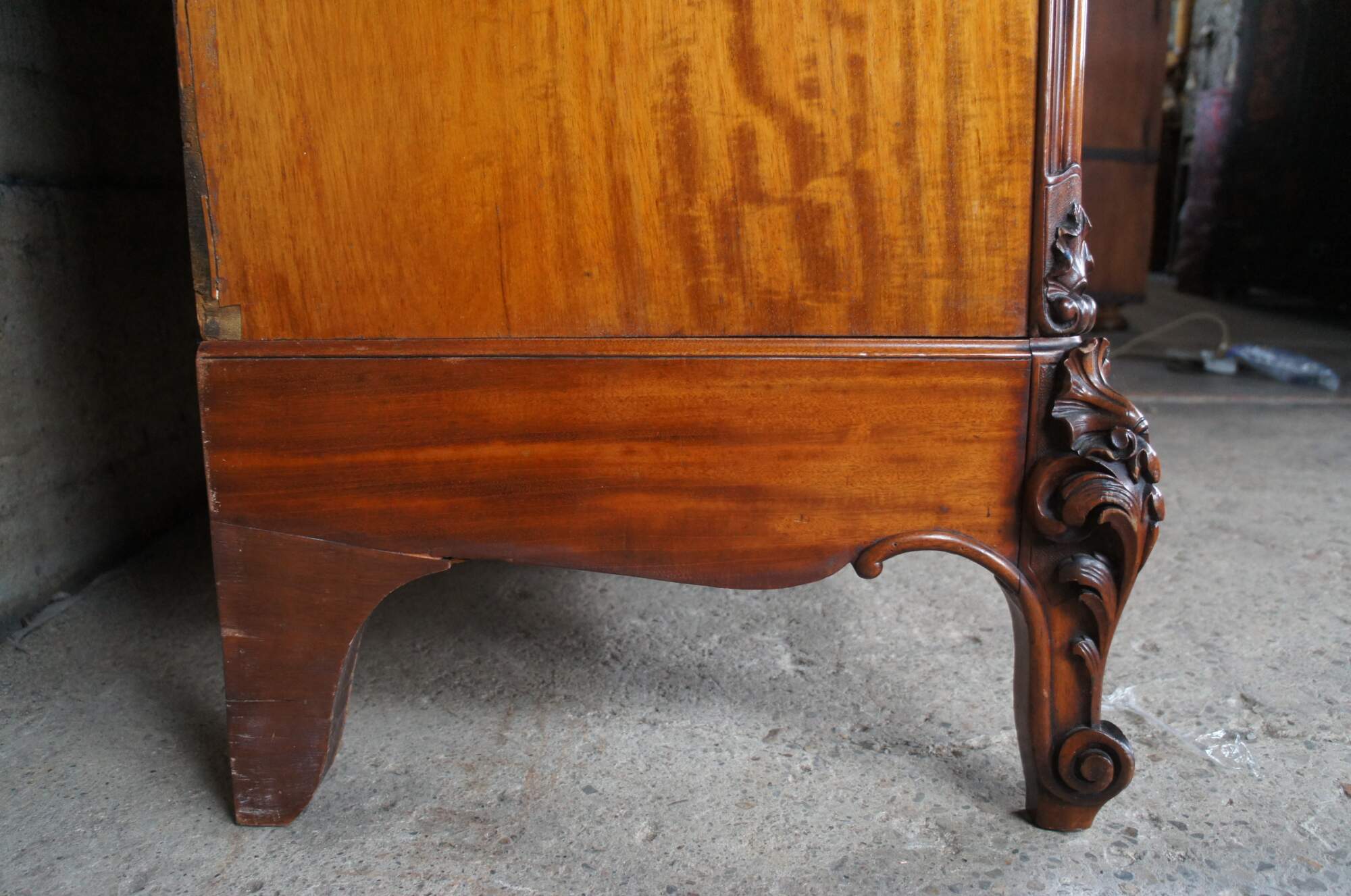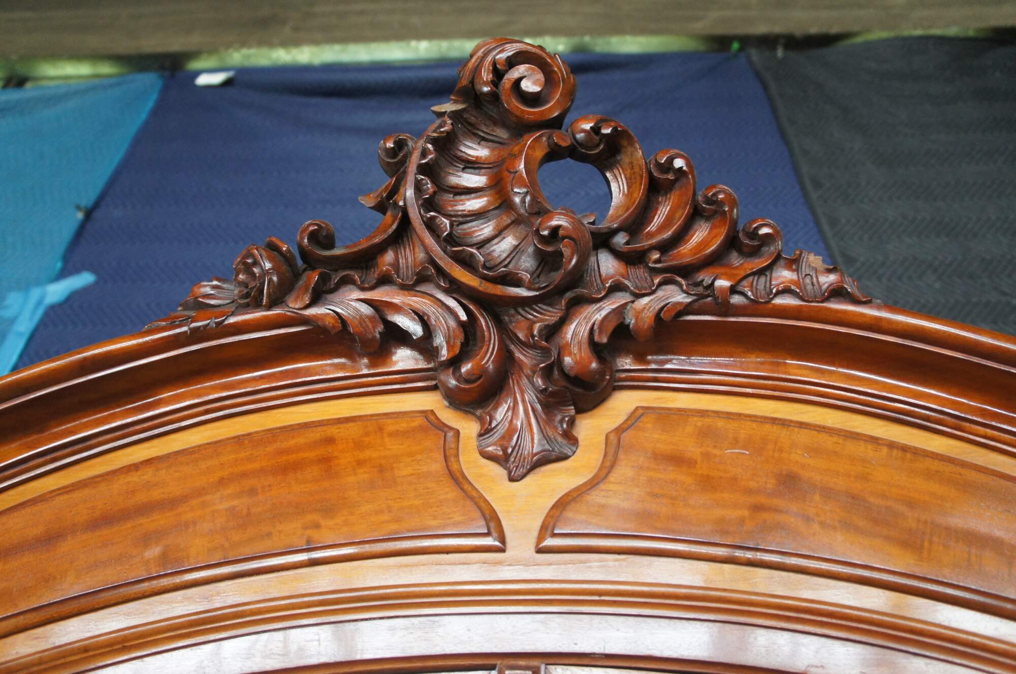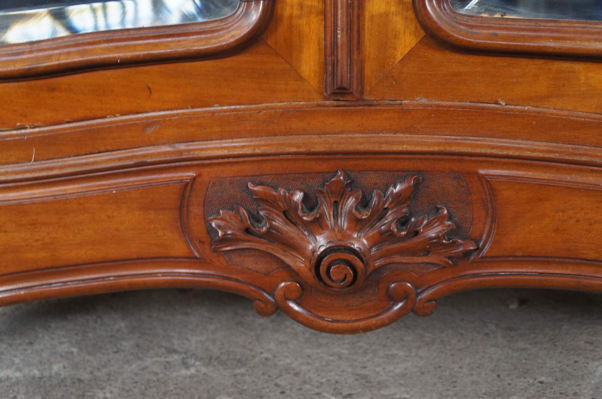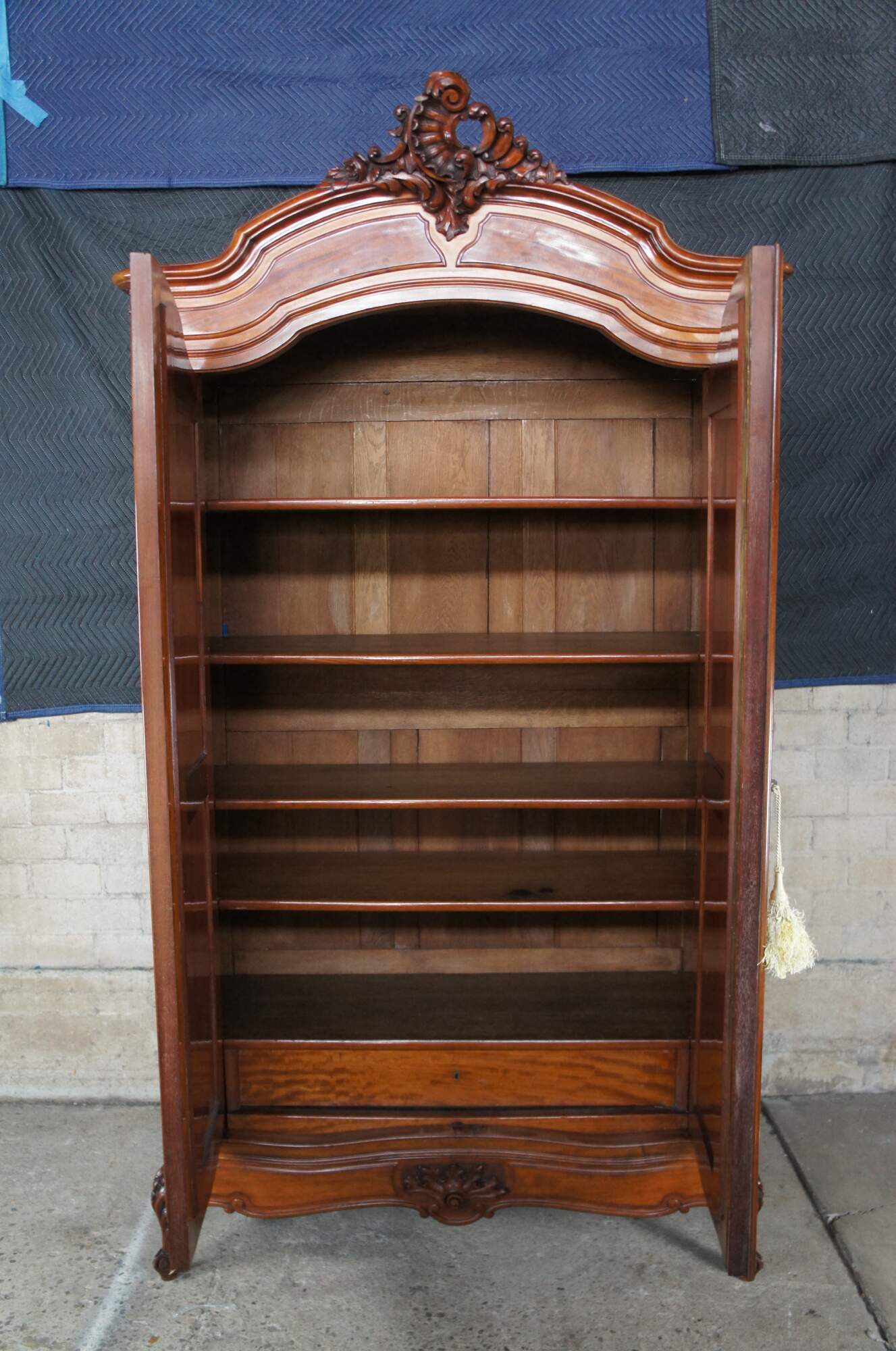 Monumental 19th century Louis XV / Rococo wardrobe or linen Press. Made of mahogany with a beautiful wood grain. Features serpentine aprons with magnificent foliate, acanthus and baroque inspired carvings. Includes large beveled mirrored doors and ornately scalloped cartouche. The wardrobe is supported by cabriole legs leading to scrolled feet. Opens to four adjustable shelves and lower lockable drawer.