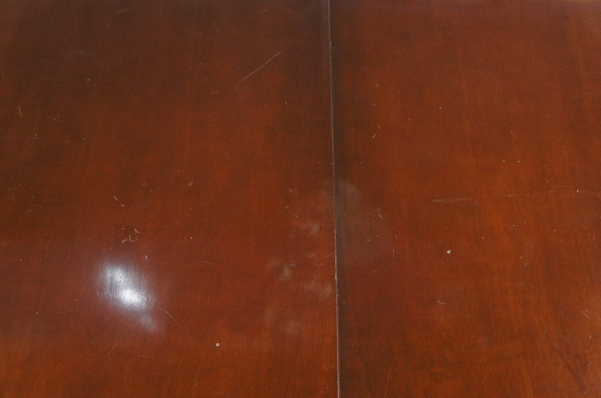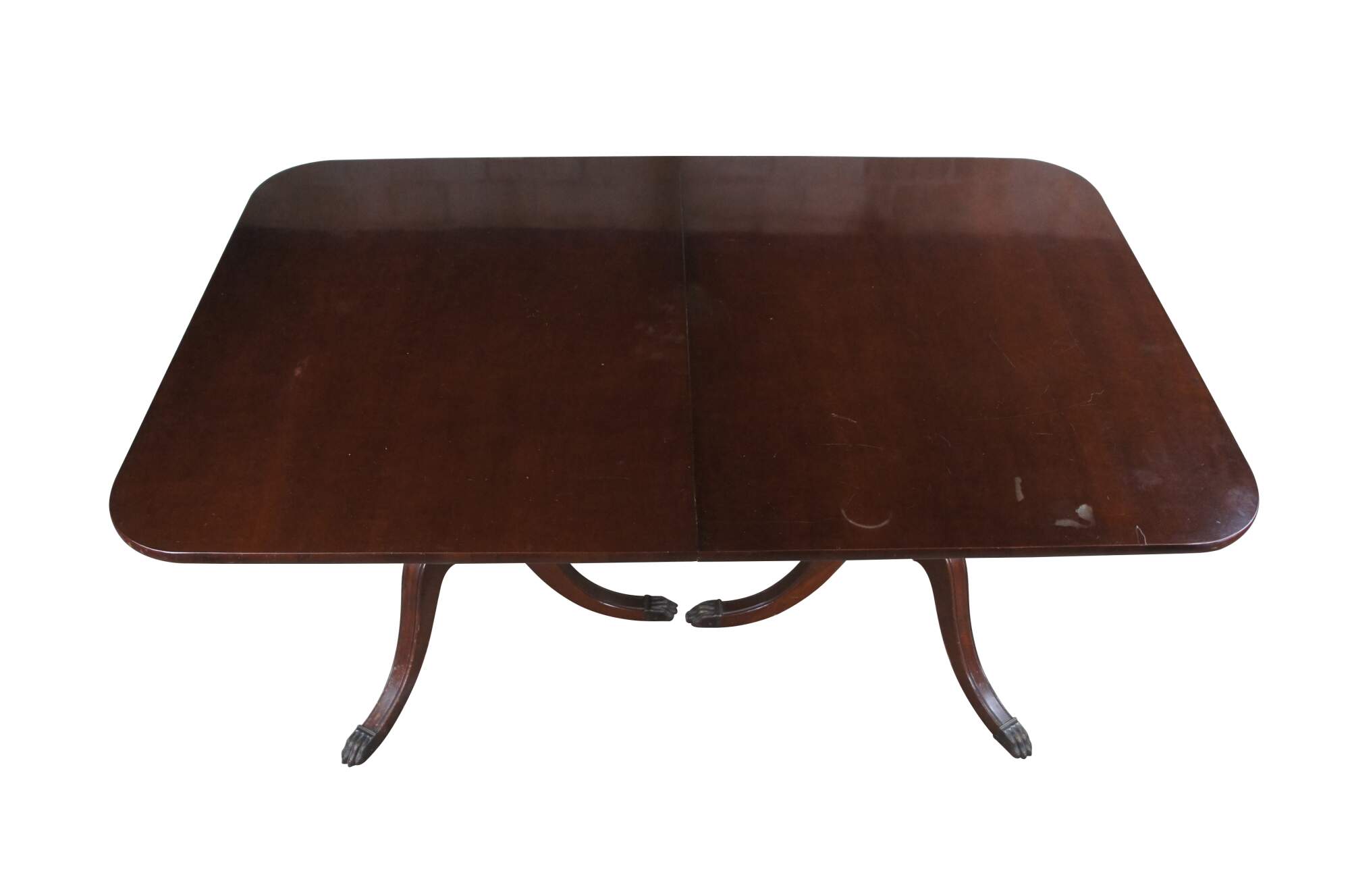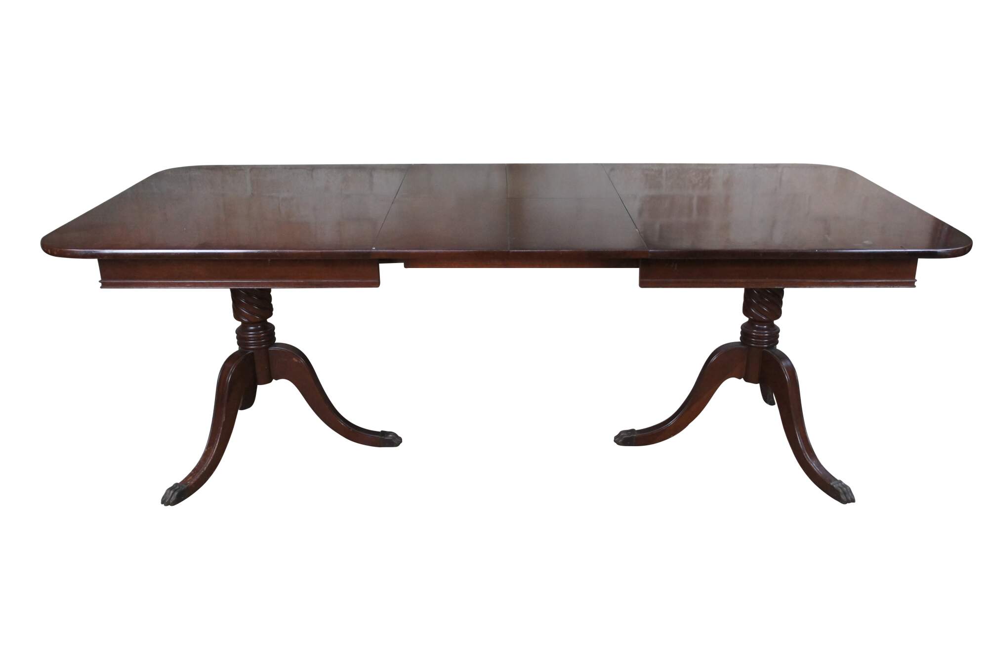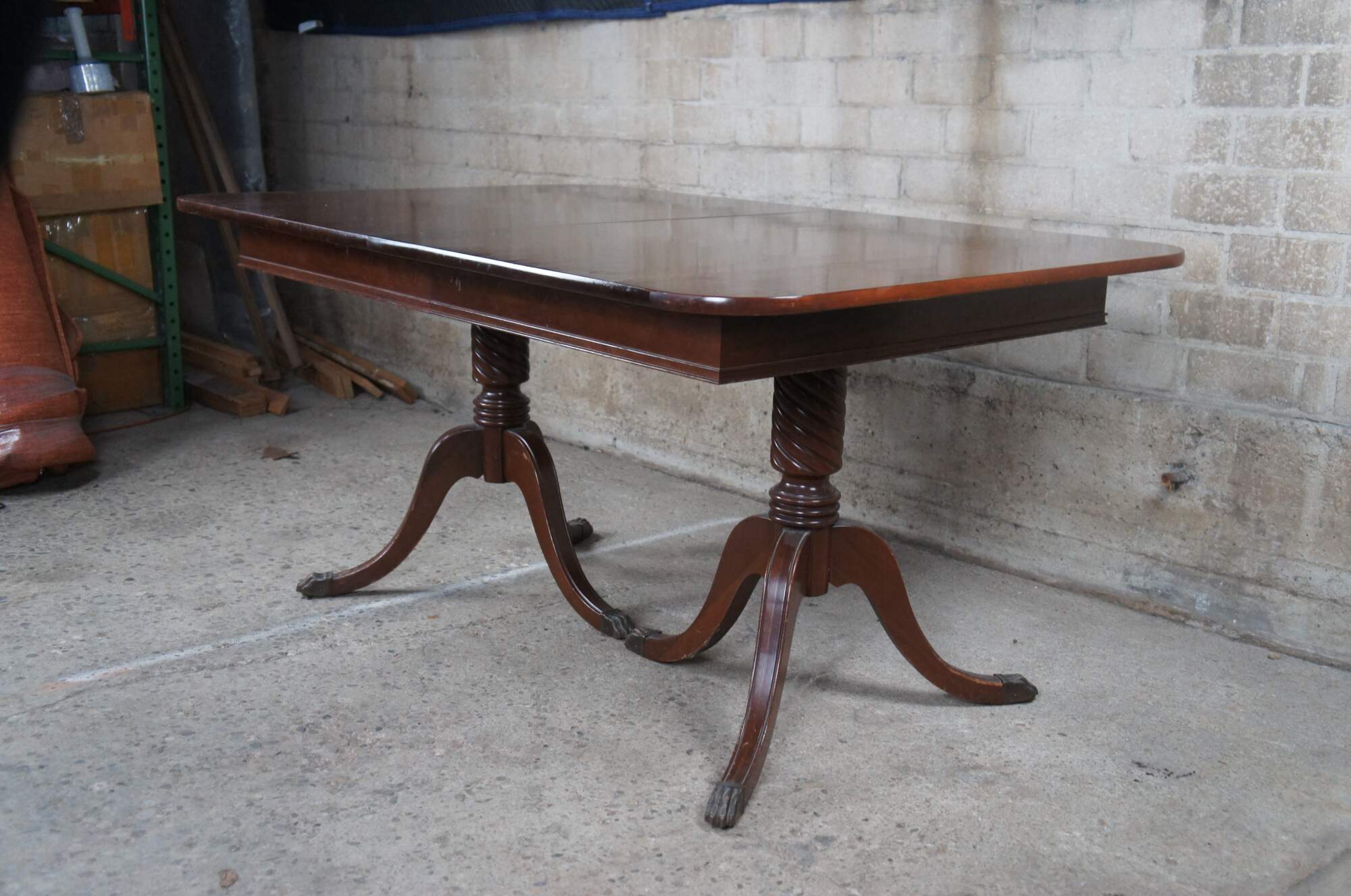Mid century, circa 1940s, Duncan Phyfe dining table. Made of mahogany featuring rectangular form with built in extendable leaves and two tripod bases that feature barley twisted supports and claw feet.