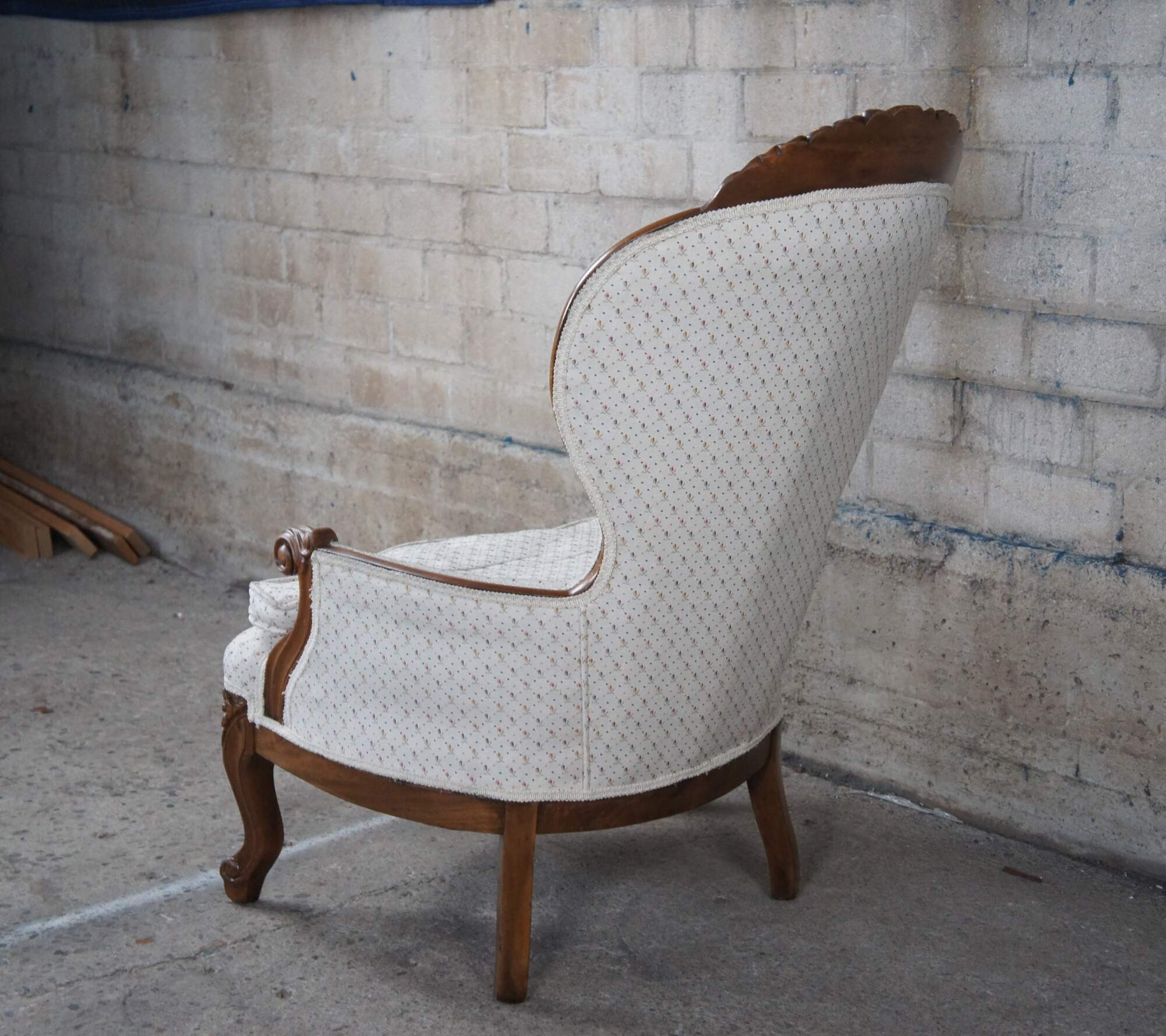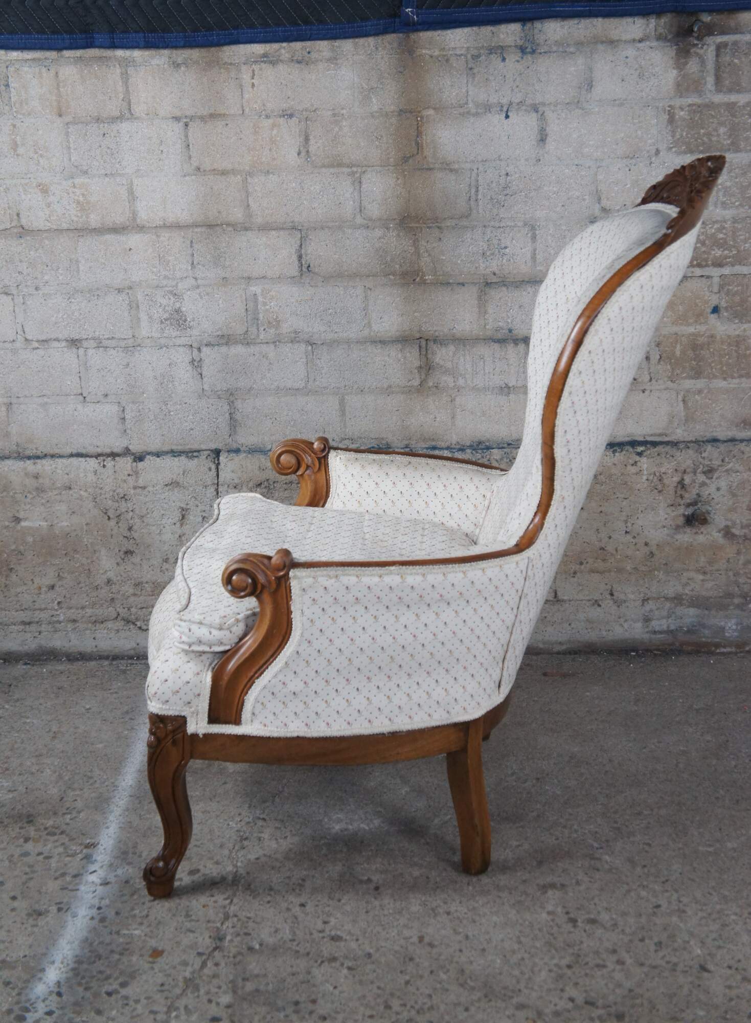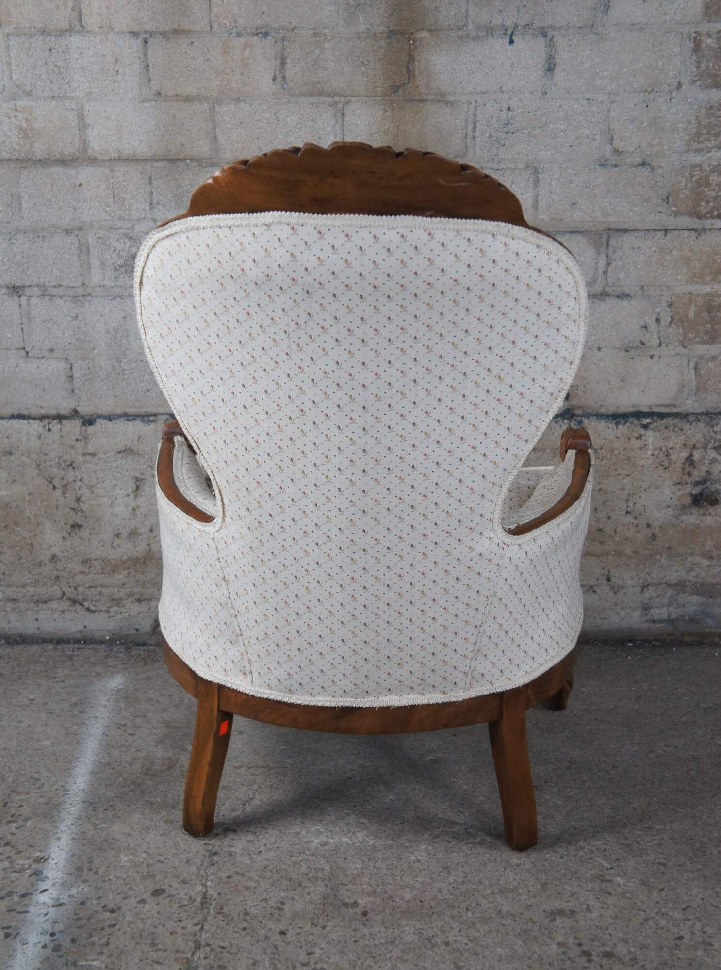 Antique Victorian Eastlake spoon back armchair. Made of walnut featuring serpentine form with low relief carved floral crown, tufted back, scrolled arms and cabriole legs.