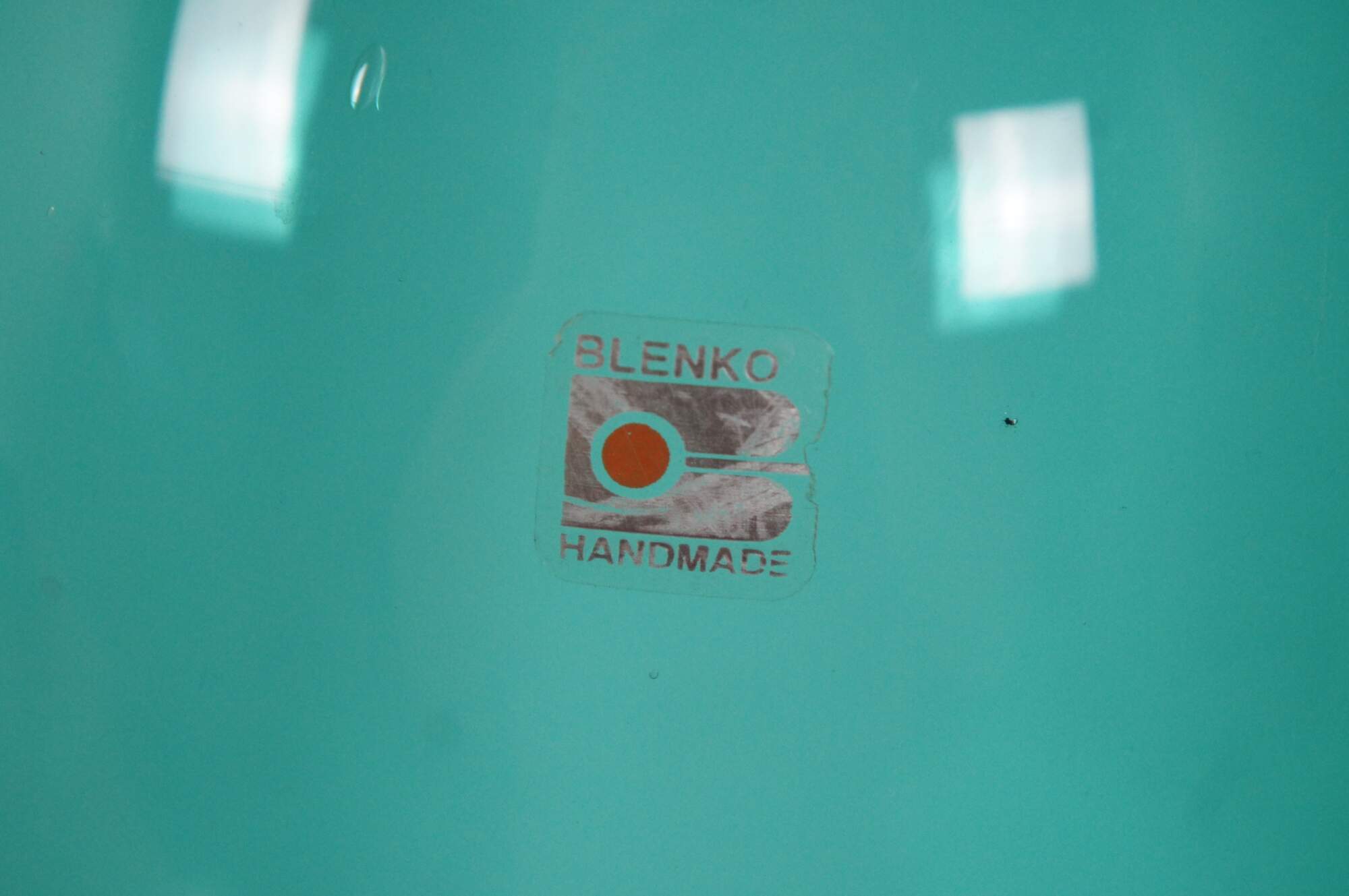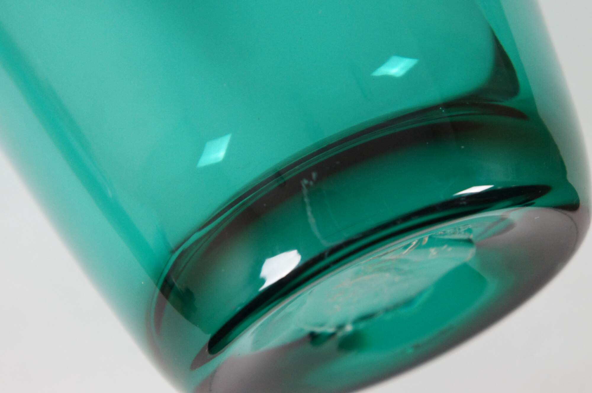 Mid century modern (1960s) large Blenko hand blown emerald green / teal glass vase featuring a rounded body with tapered base, narrower neck, and a flat disc shaped rim. Original sticker on side.