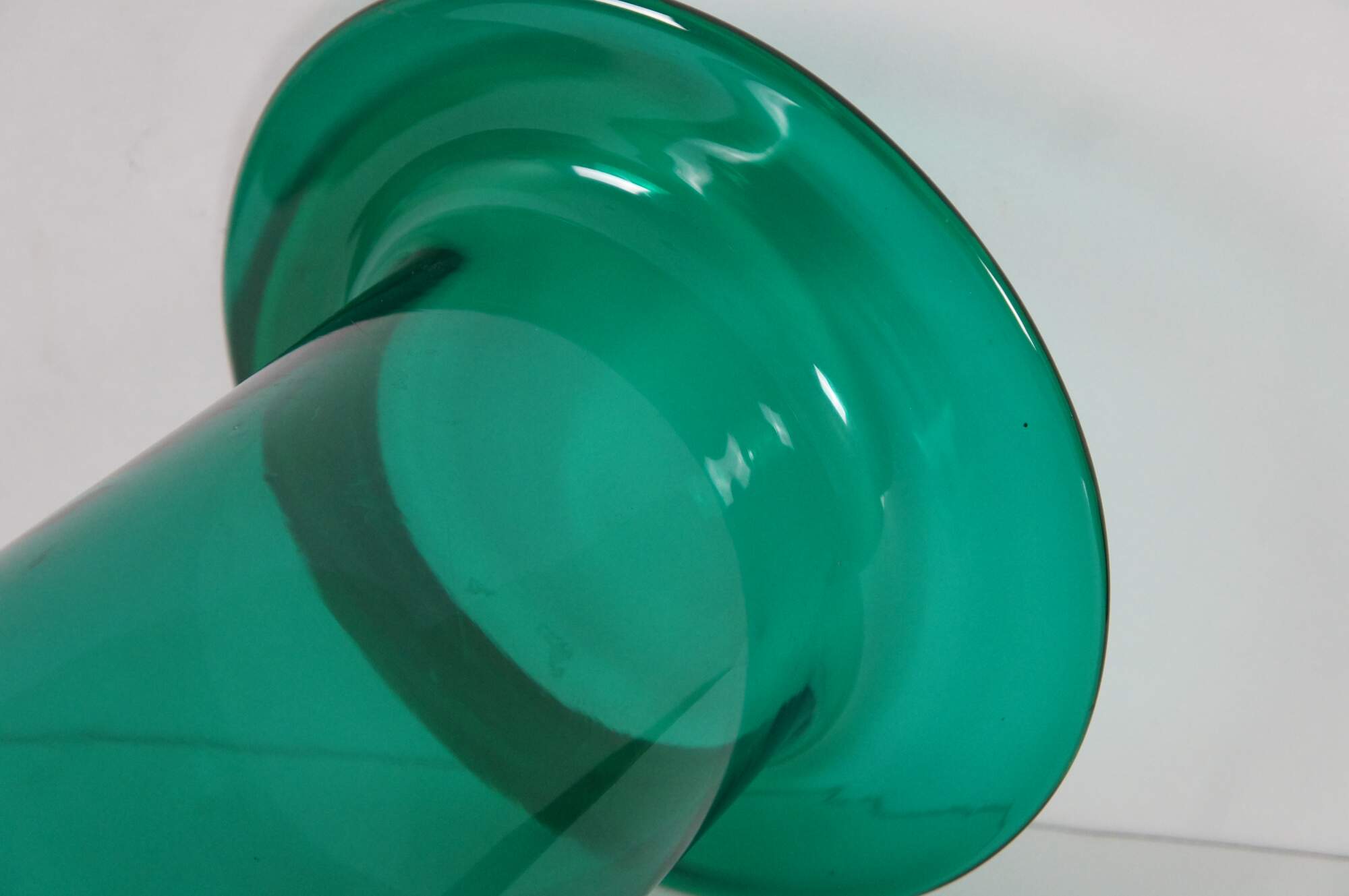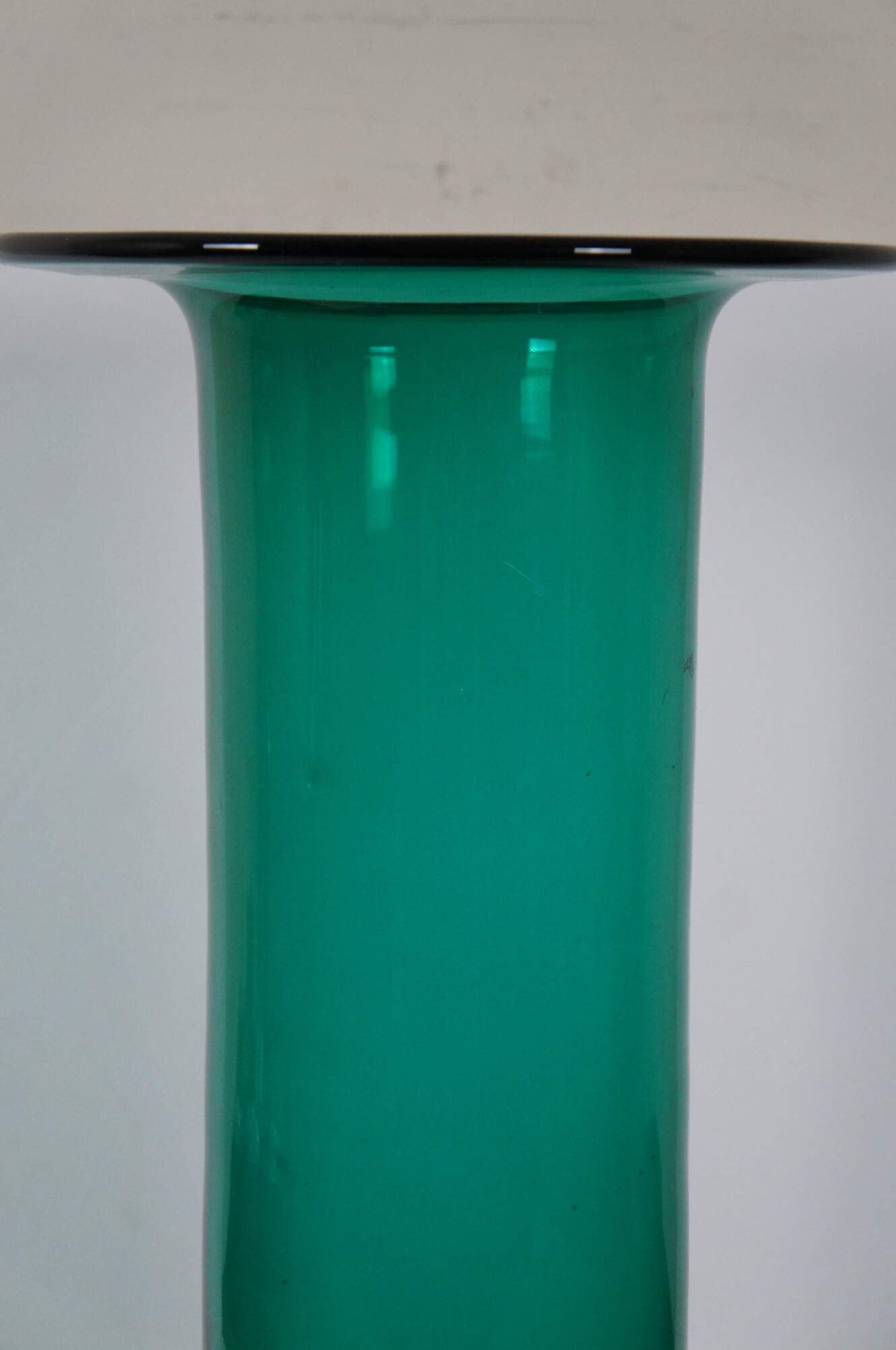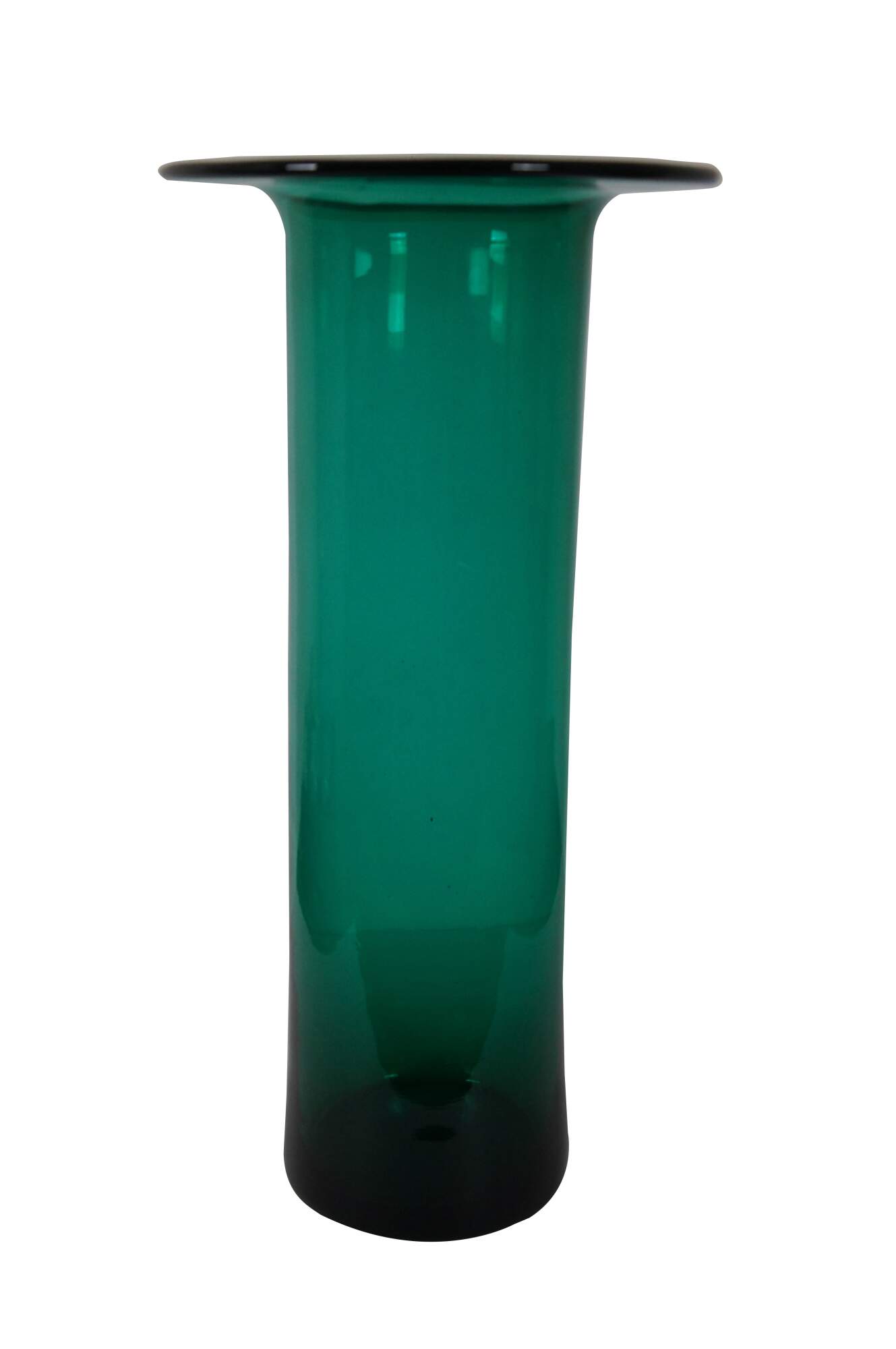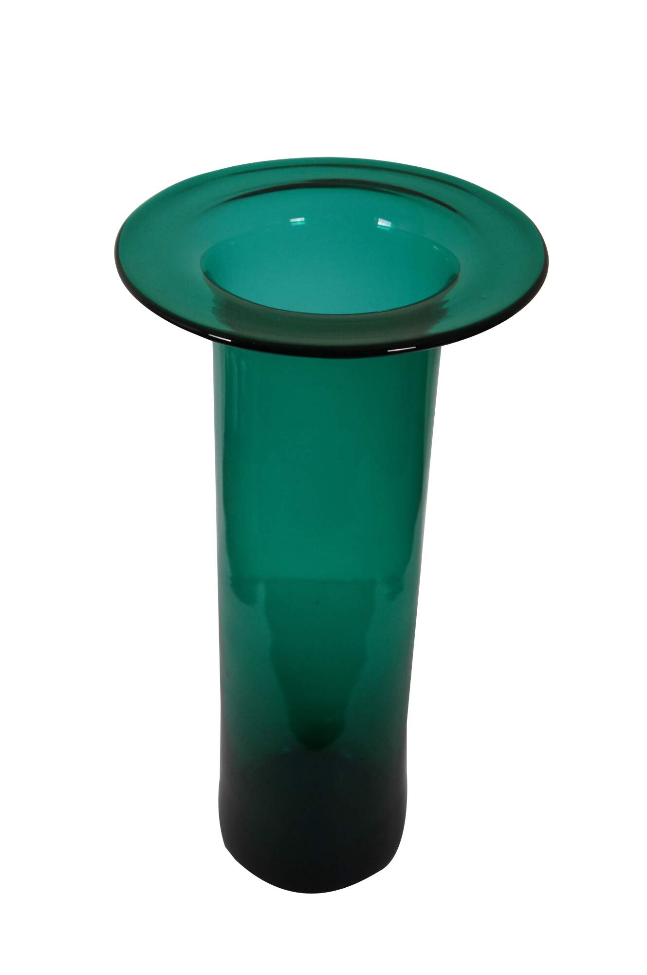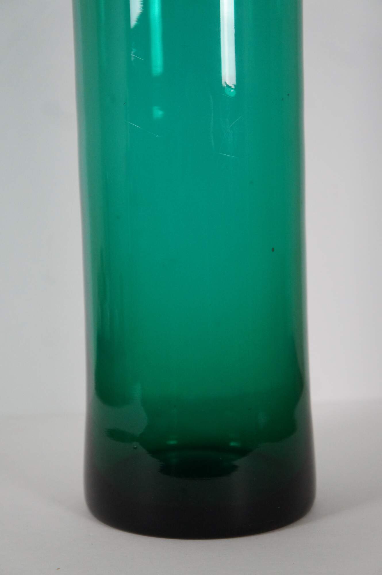 Mid century modern (1960s) large Blenko hand blown emerald green / teal glass vase featuring a tall cylindrical form with smoked base and a flat disc shaped rim.