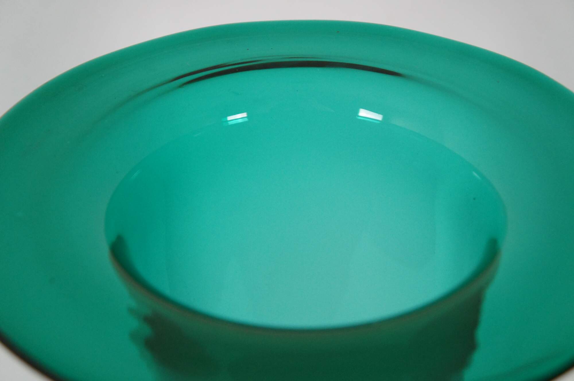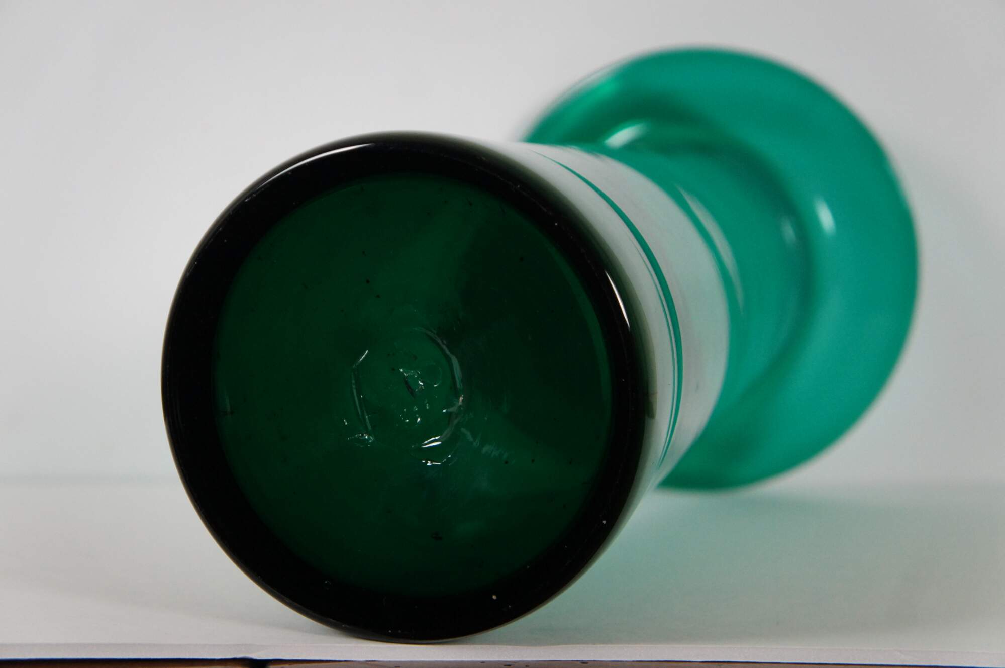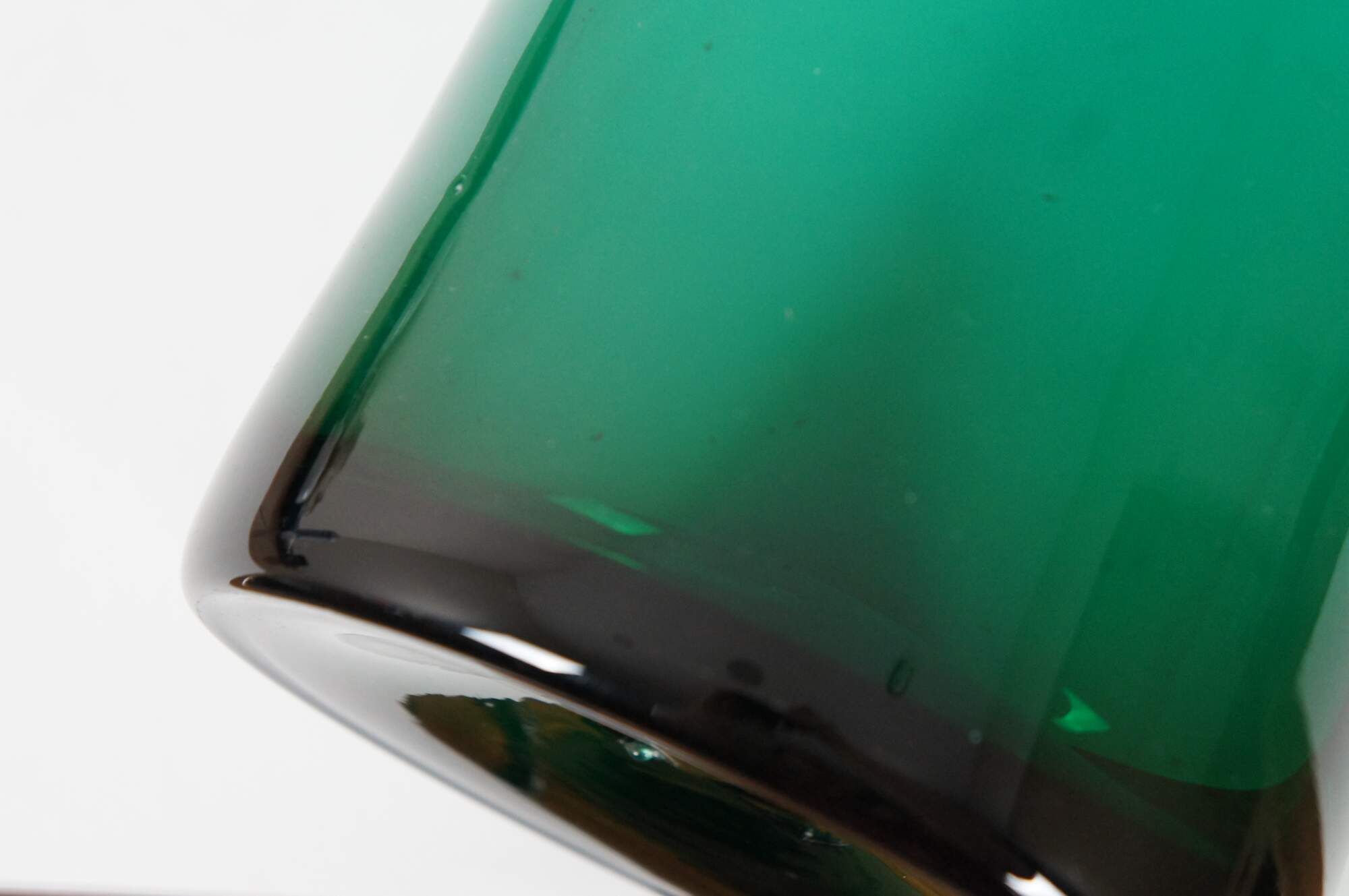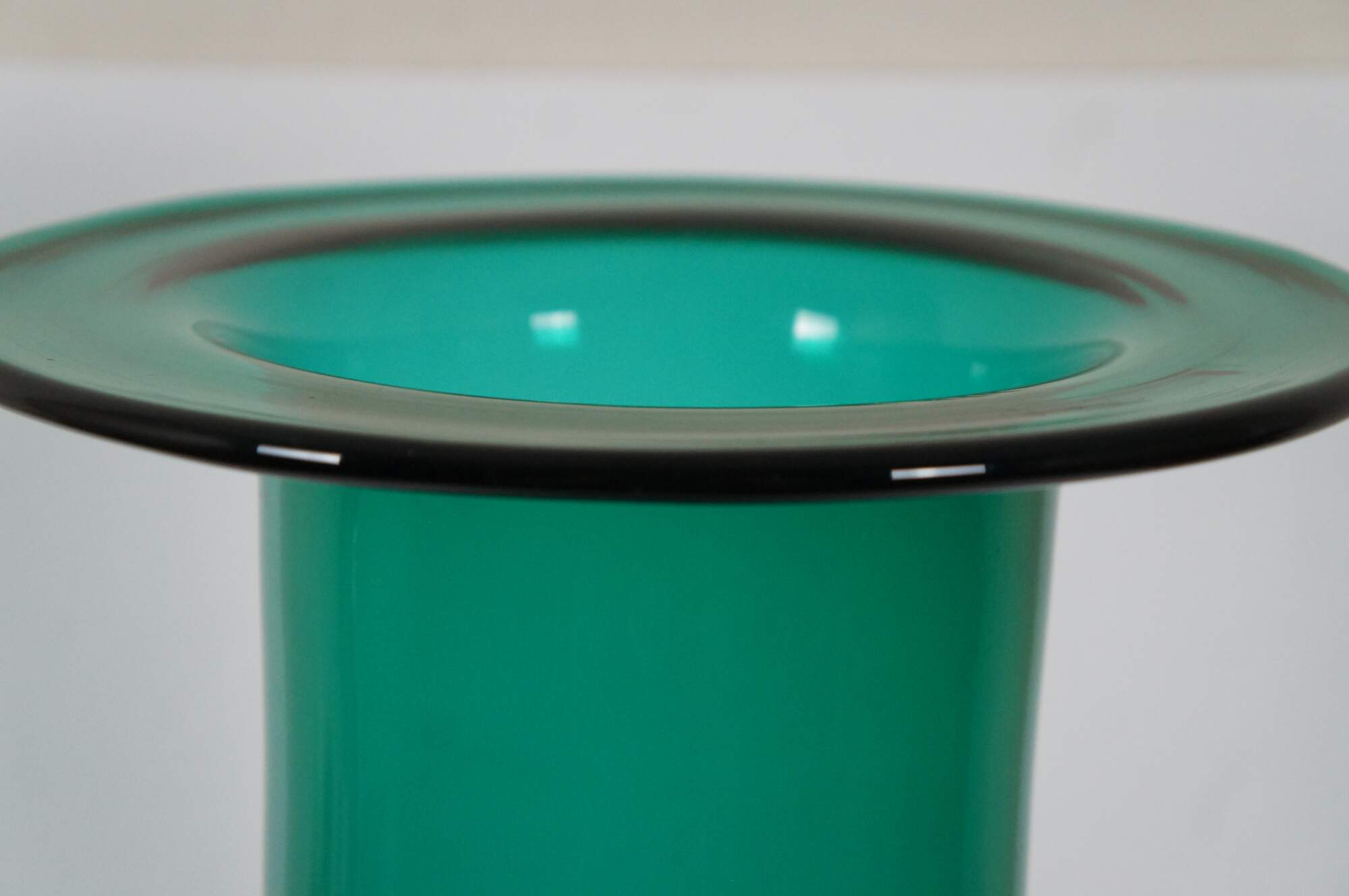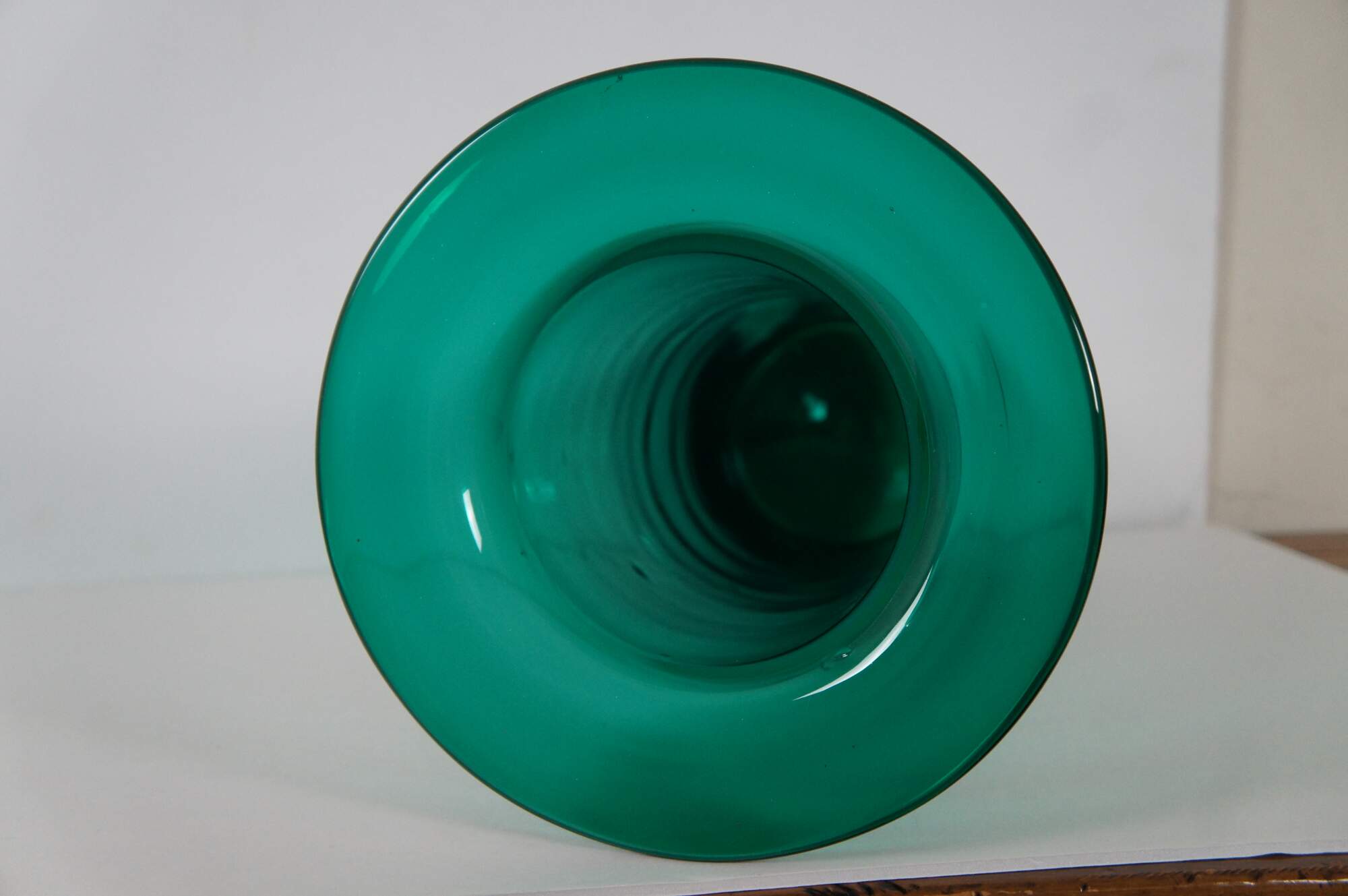 Mid century modern (1960s) large Blenko hand blown emerald green / teal glass vase featuring a tall cylindrical form with smoked base and a flat disc shaped rim.