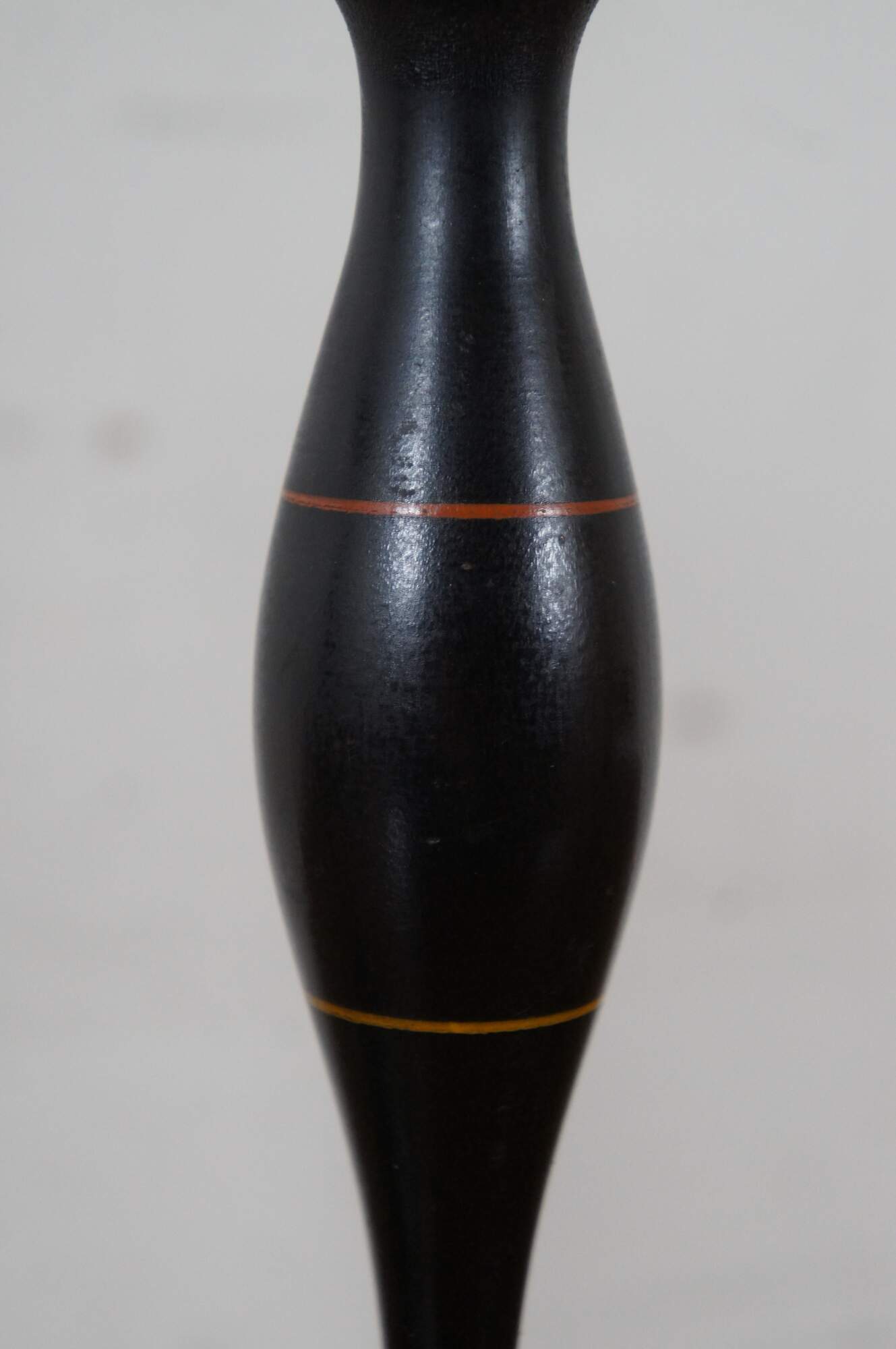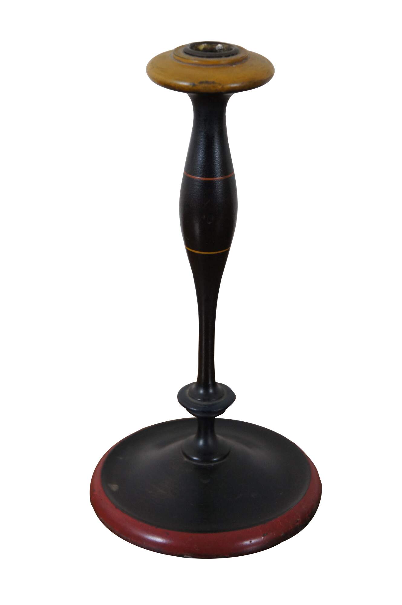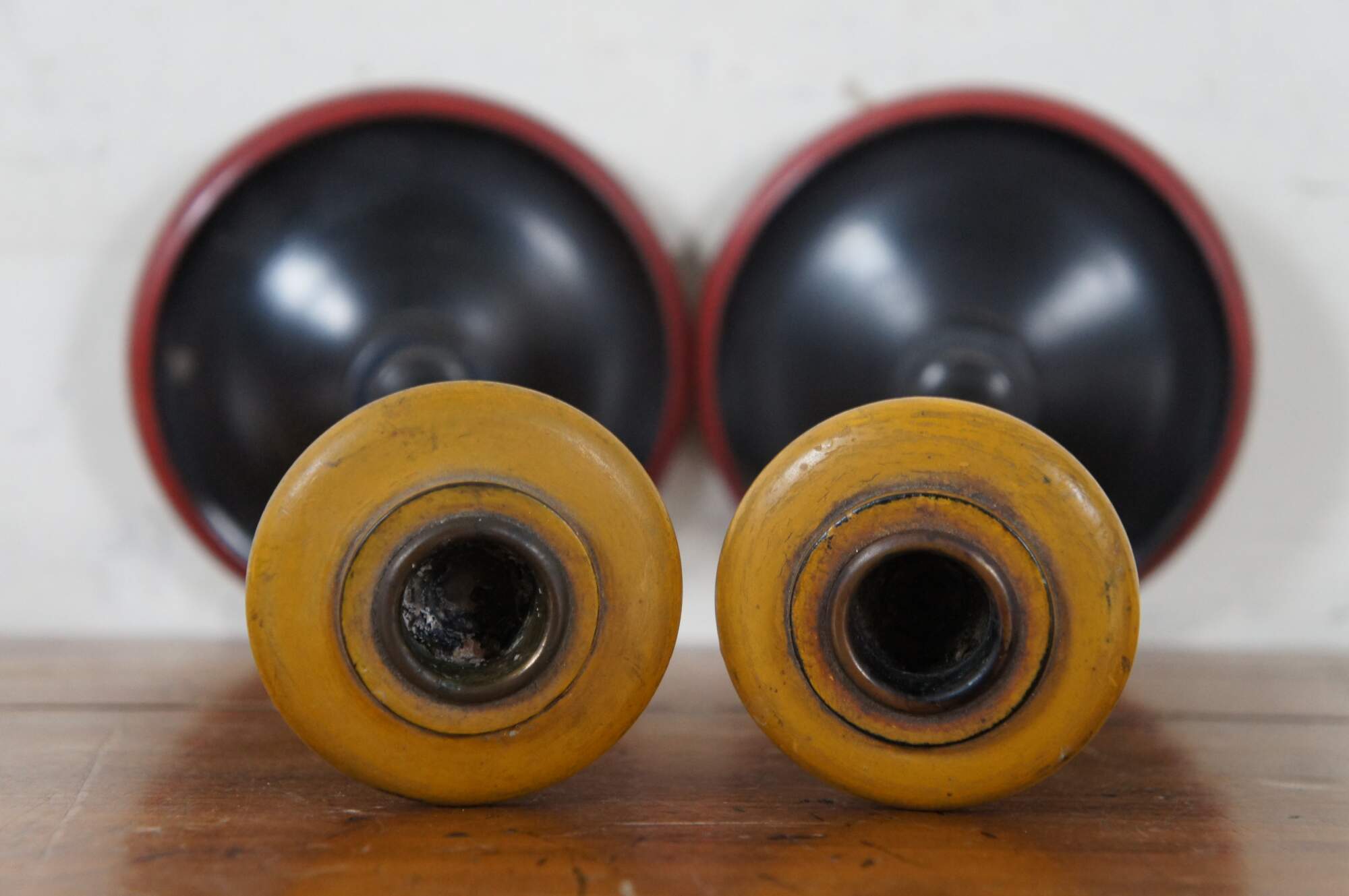Pair of vintage wooden candlesticks / taper candle holders, painted in black with red around the base and yellow at the cups.