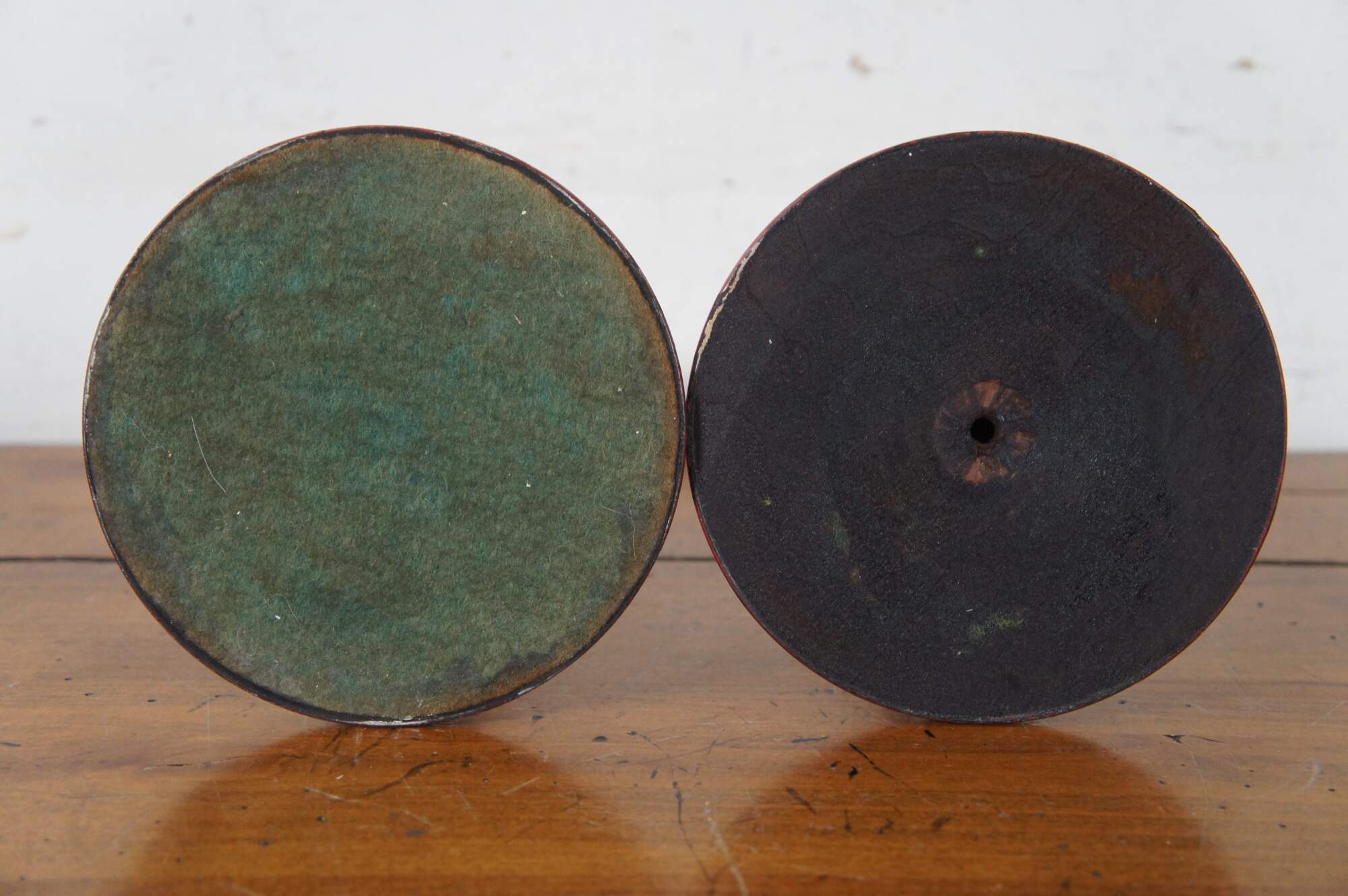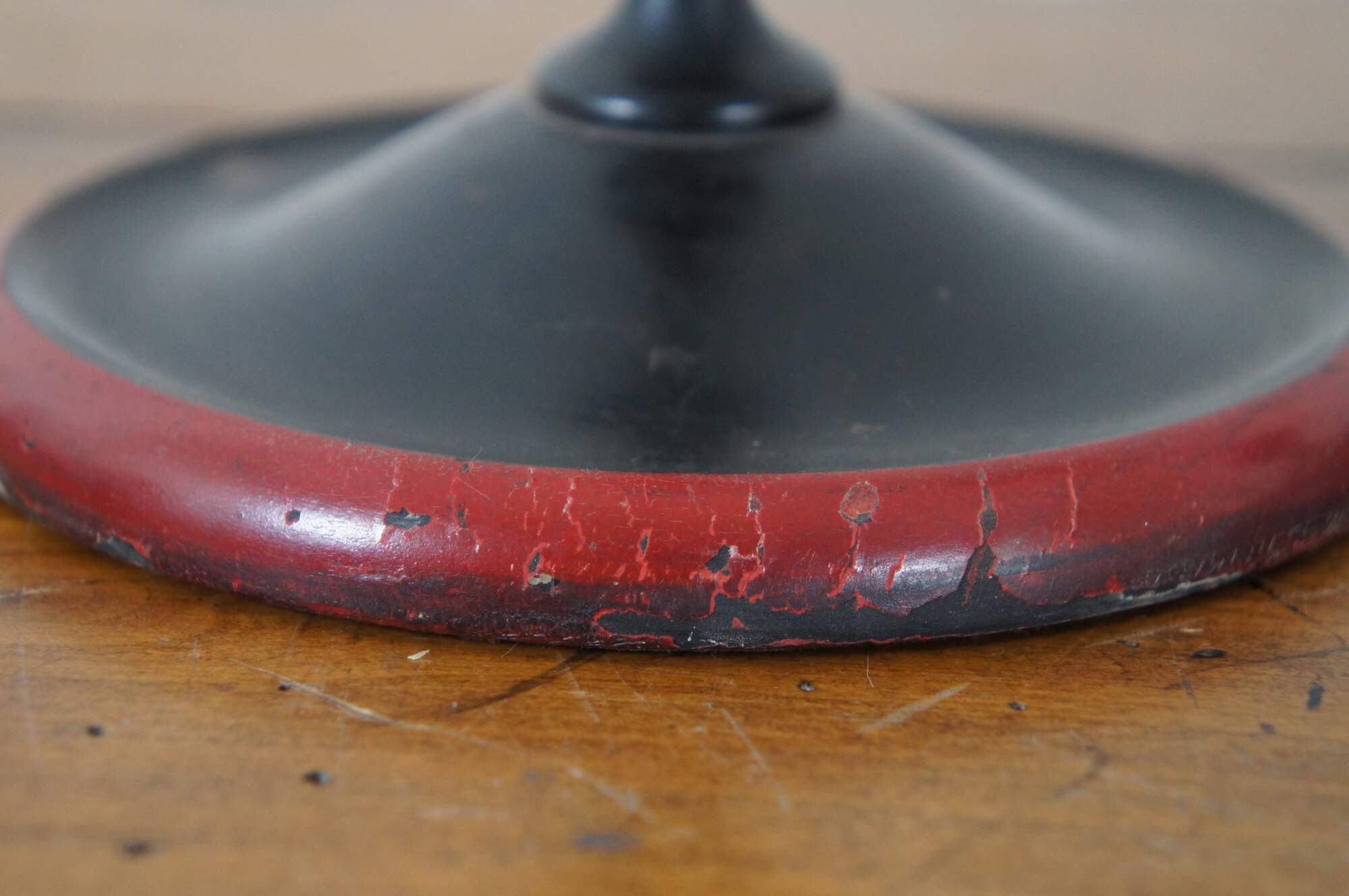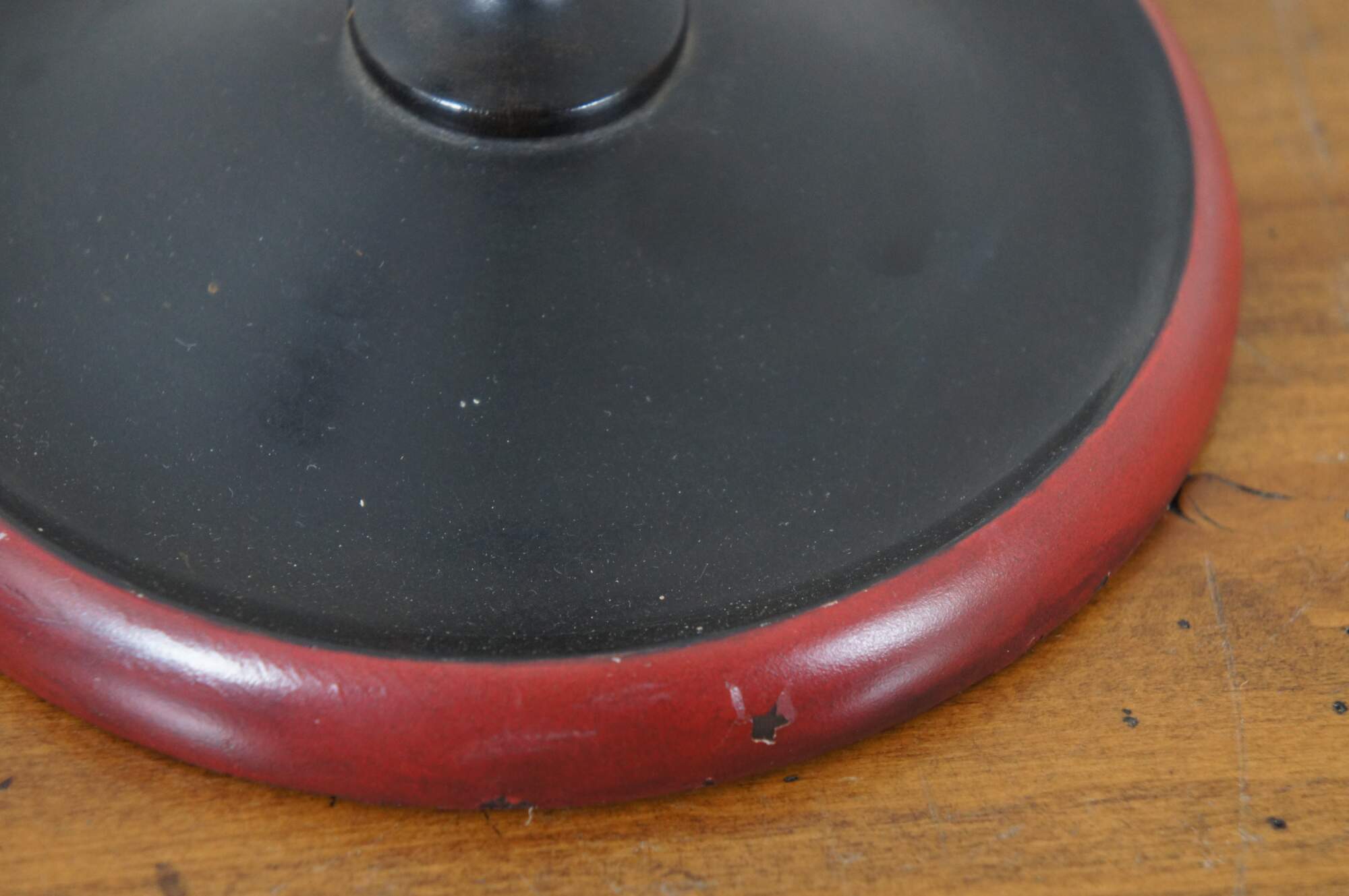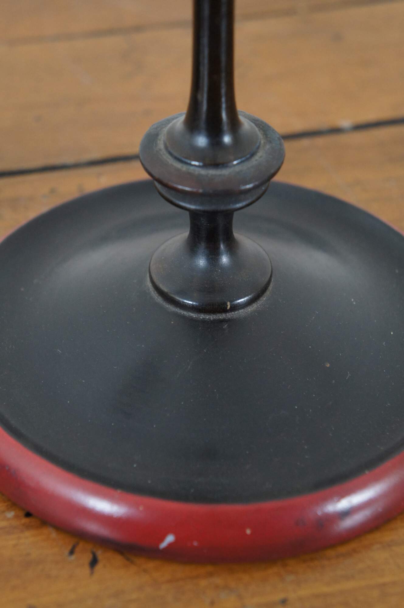 Pair of vintage wooden candlesticks / taper candle holders, painted in black with red around the base and yellow at the cups.