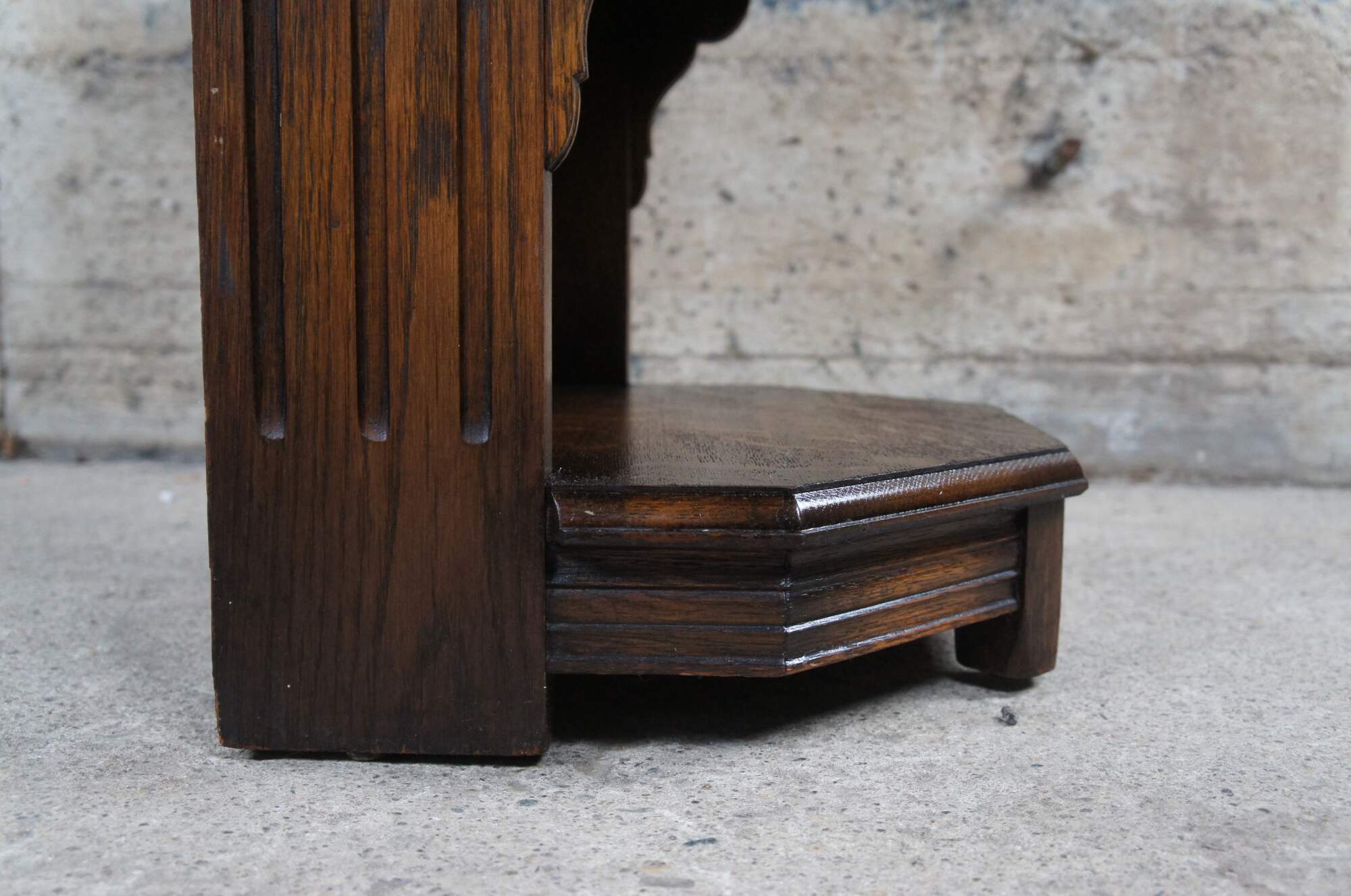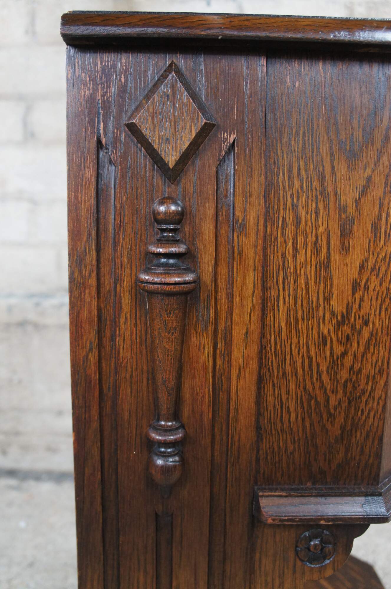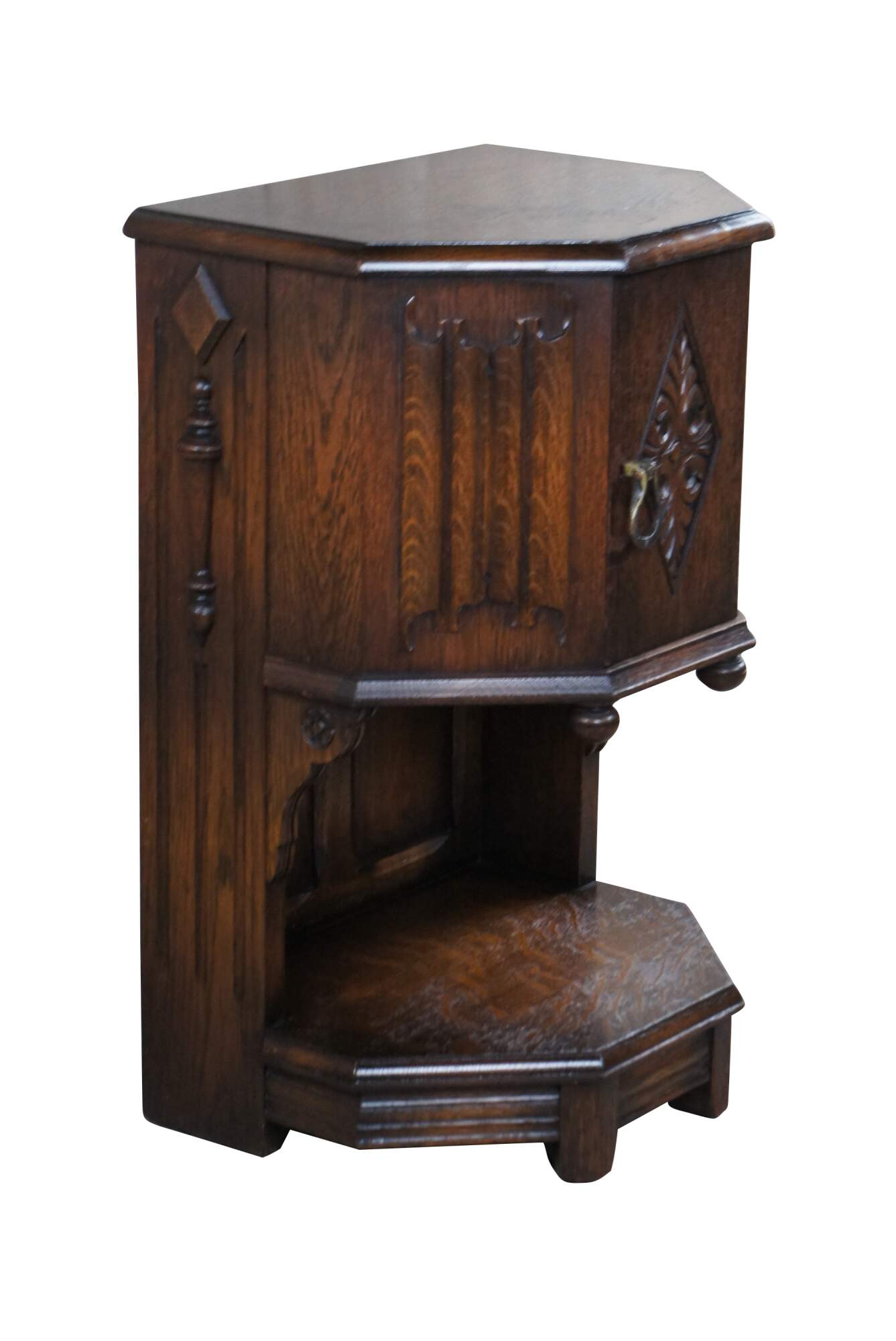 An impressive Spanish or Gothic Revival bedside table by Saginaw Furniture, circa late 1930s to early 40s. Made from oak with intriguing linen fold and diamond pattern acanthus carved accents. Sides are accented by quarter cut turned and applied spindles, raised diamonds and fluted accents. Opens to an interior compartment. Includes iron pull with a rustic gold toned finish.