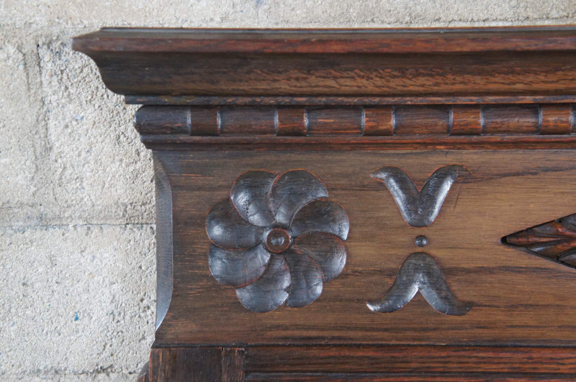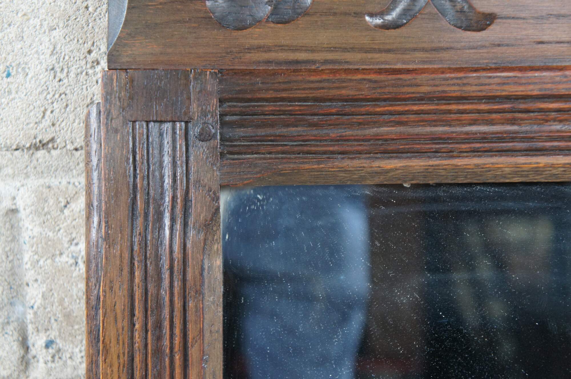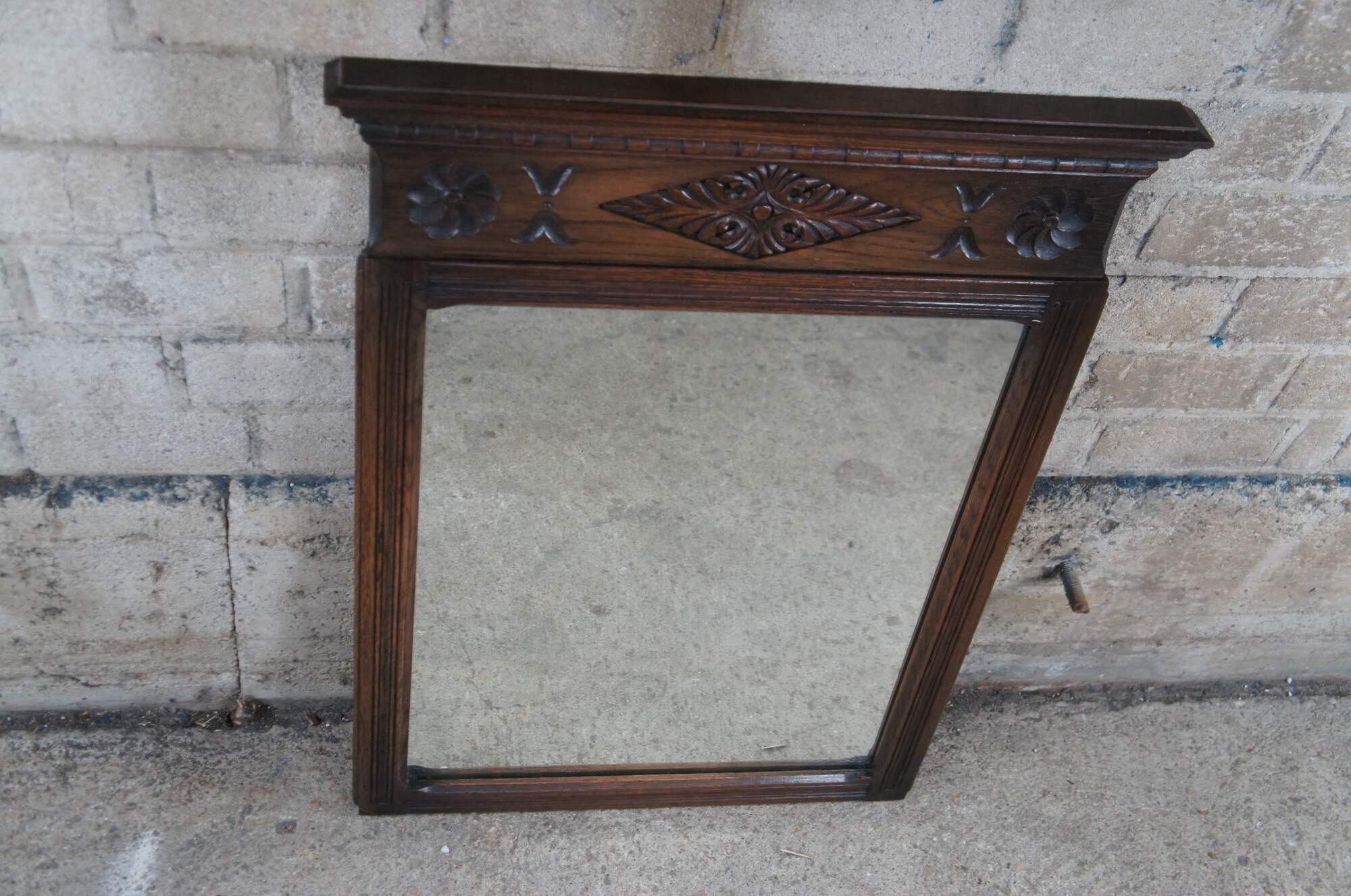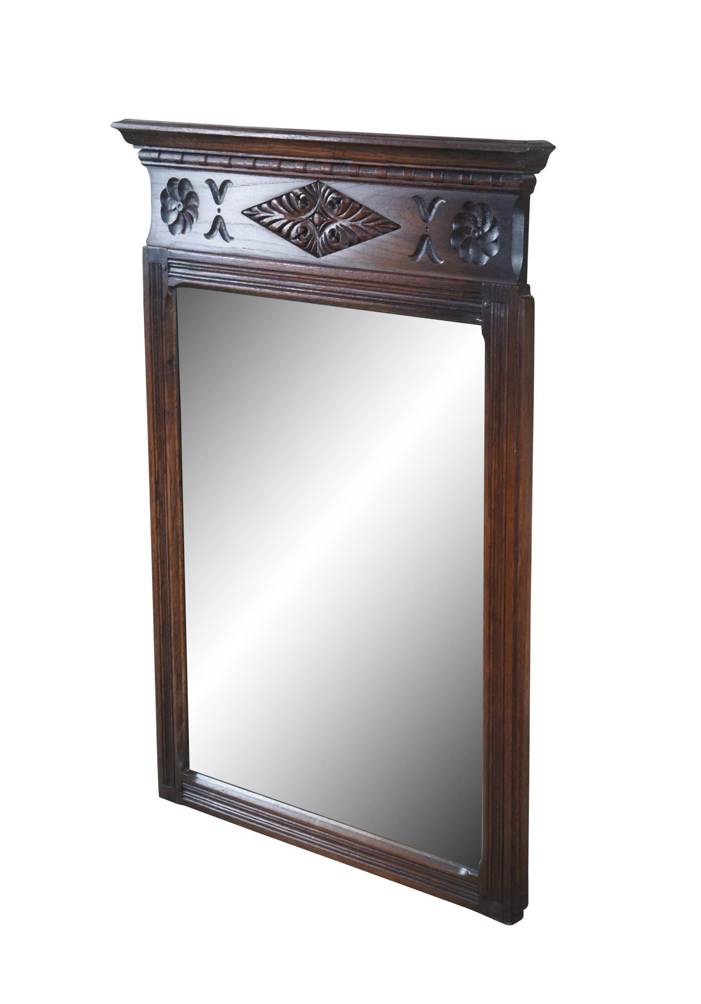 Spanish Revival mirror by Saginaw Furniture, circa late 1930s to early 40s. Made from oak with diamond pattern acanthus carved accents flanked by pinwheels.