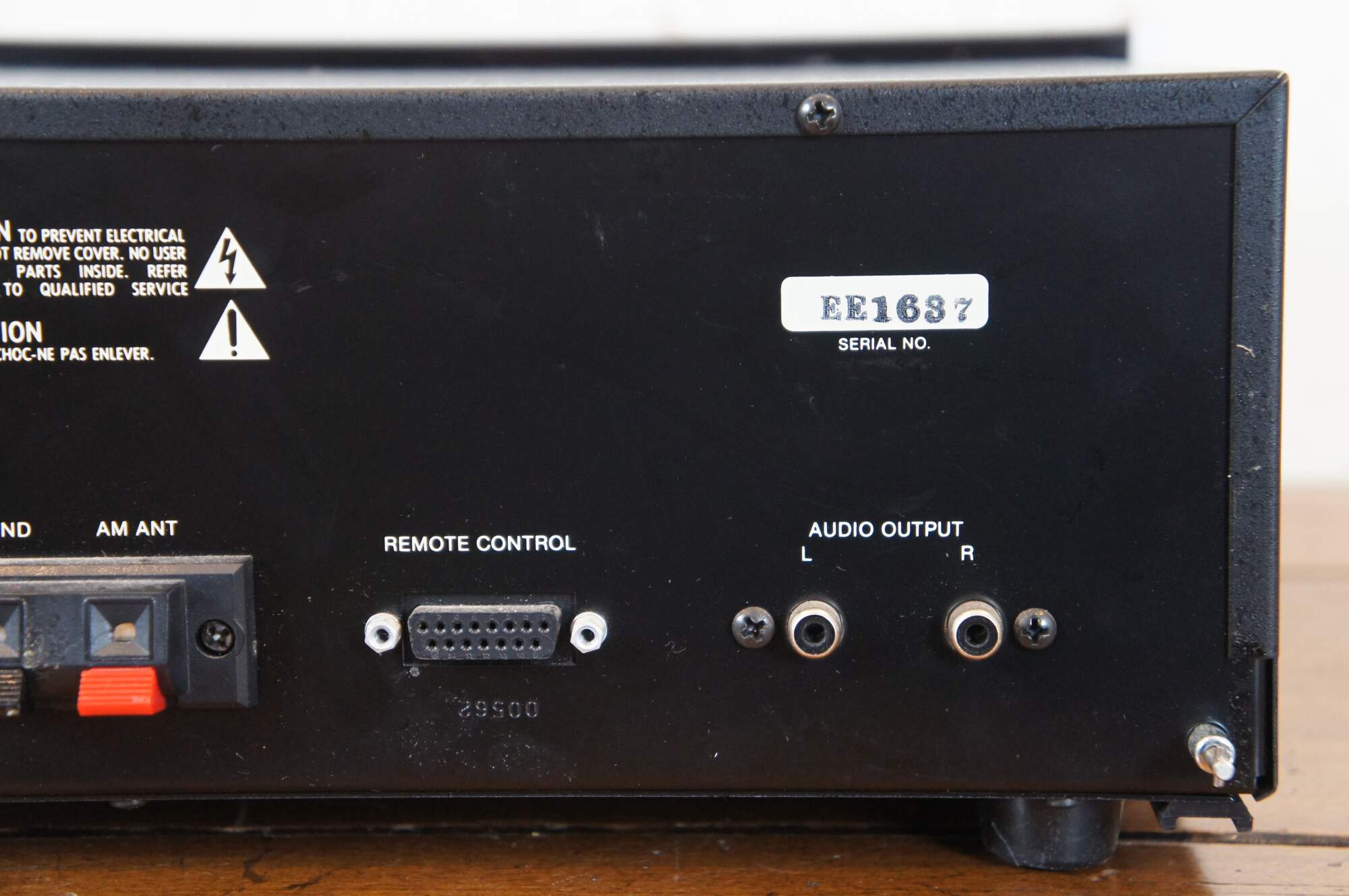 Back Panel: Power cord. 75 ohm fm antenna coax input. Push terminals for ground and external AM antenna. 15 pin remote control connector. Left and right fixed audio output. Late units had fixed and variable outputs with an output level adjustment. Panloc mounting.
