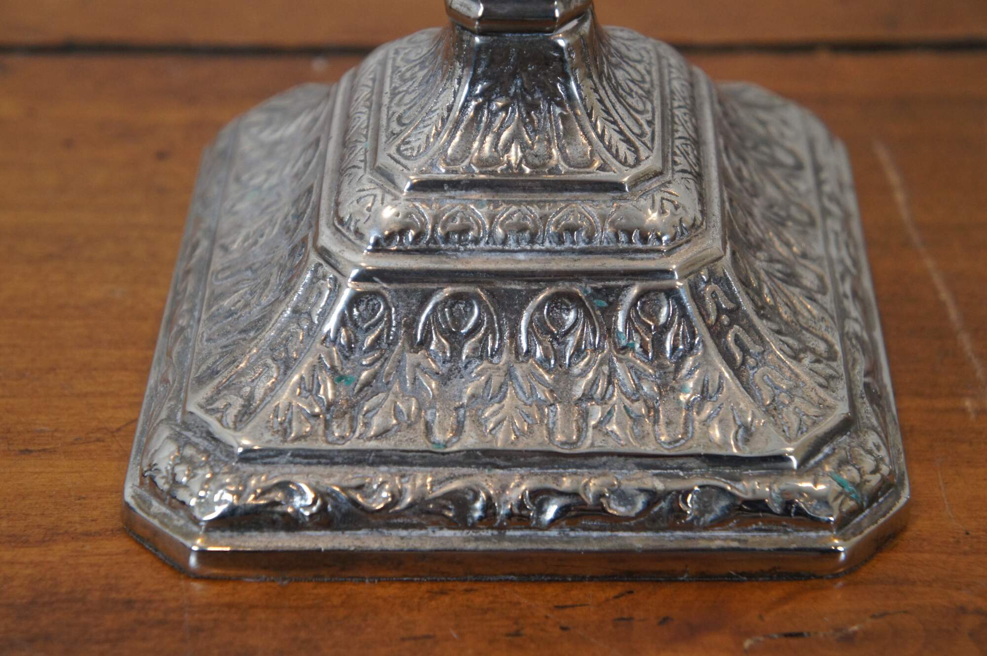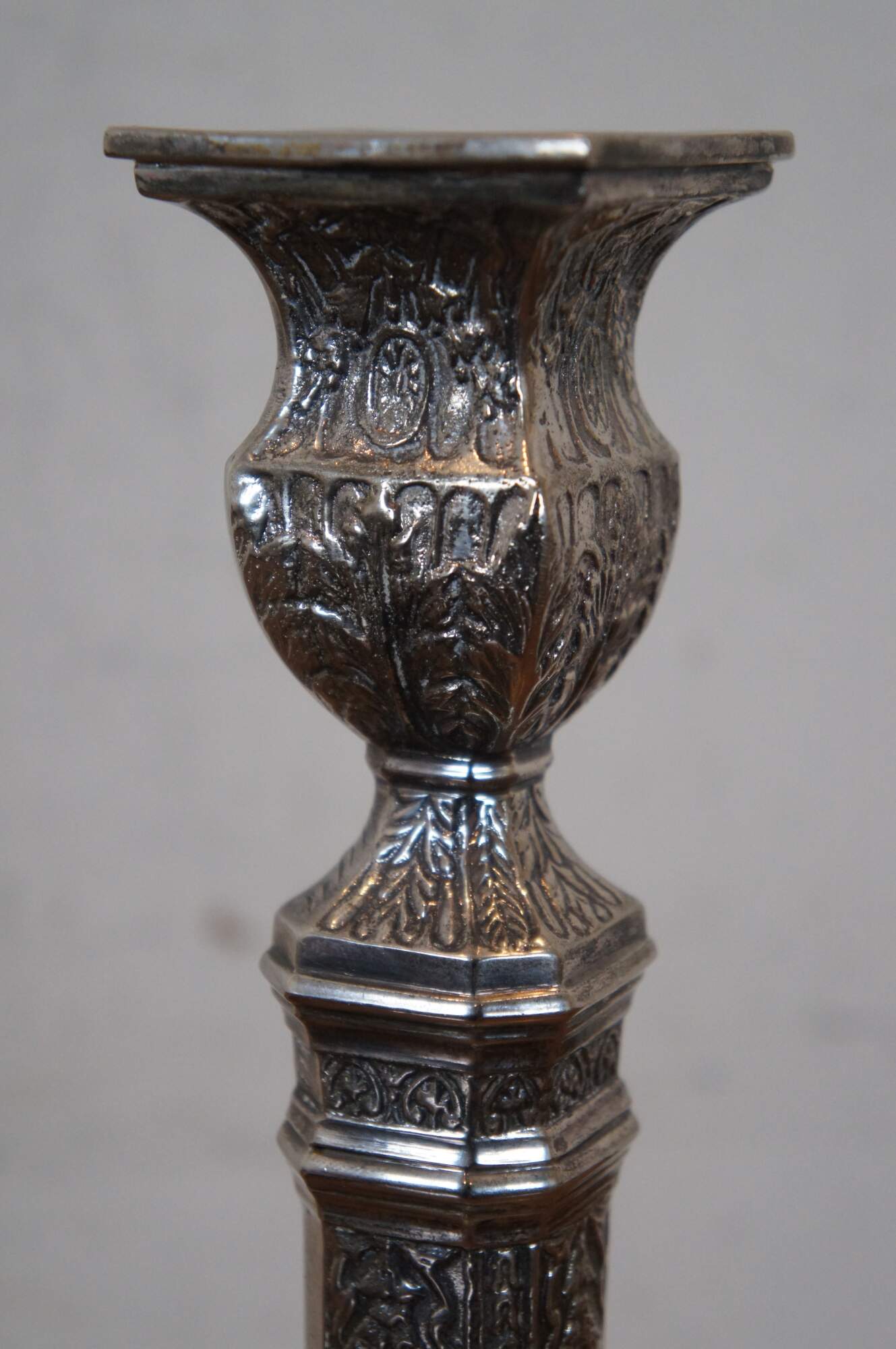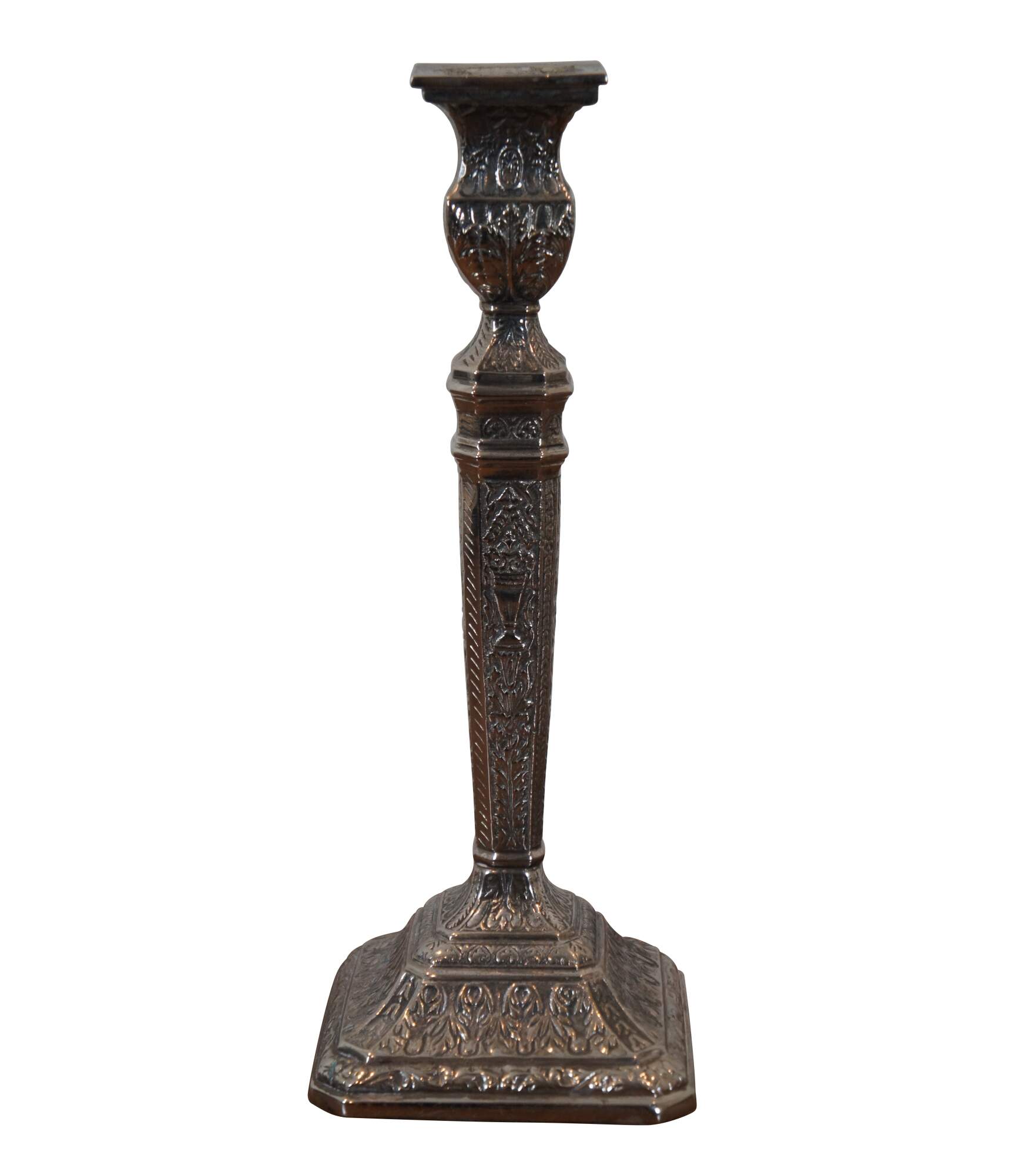 Pair of heavy, antique Georgian style repousse silver plate candlesticks / taper candle holders. Square cut corner base and tapered column with planter-urn shaped top, ornately decorated with swags of foliage, flowers and Neoclassical vases. Bottom of base covered in blue velvet.