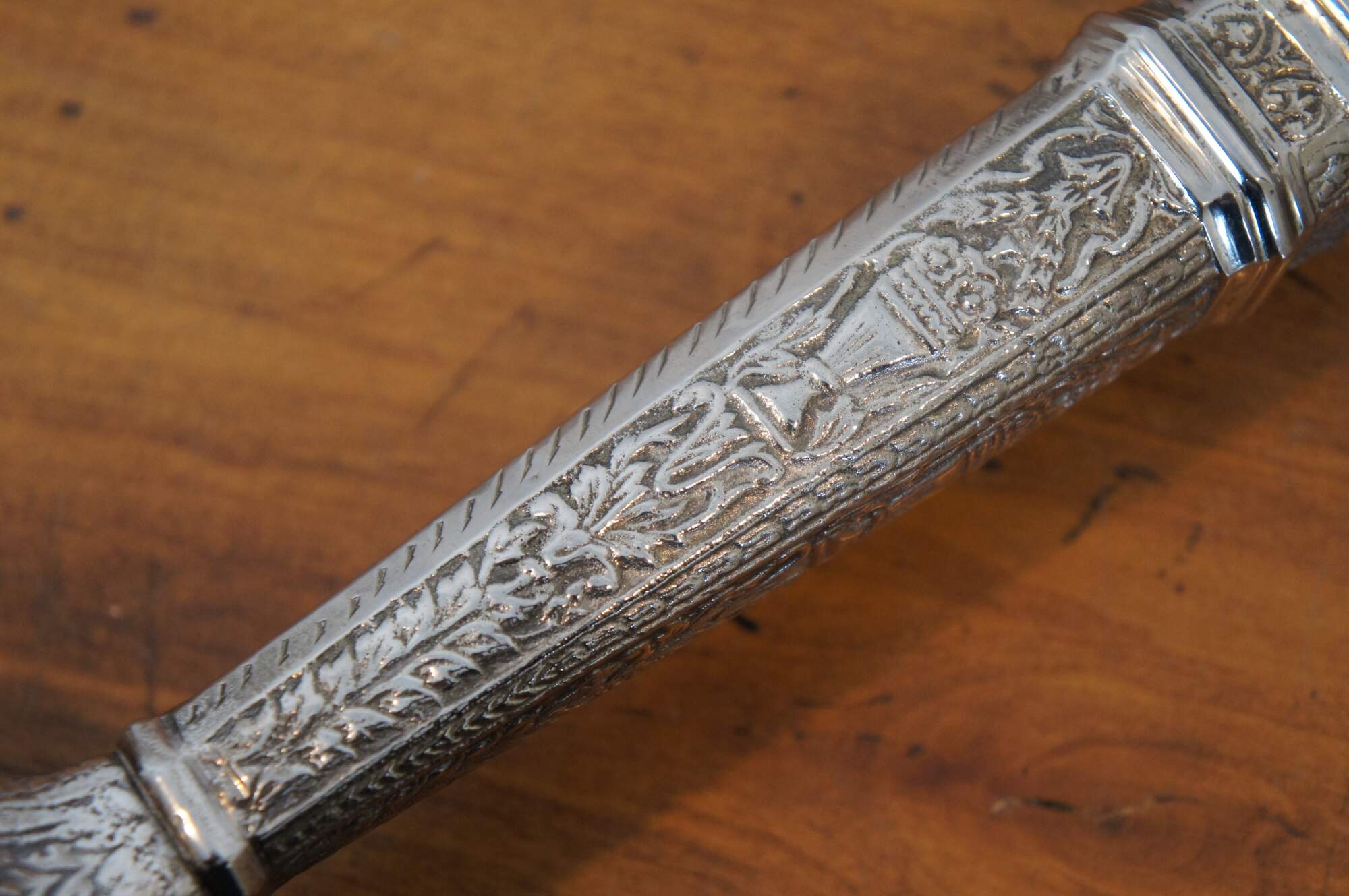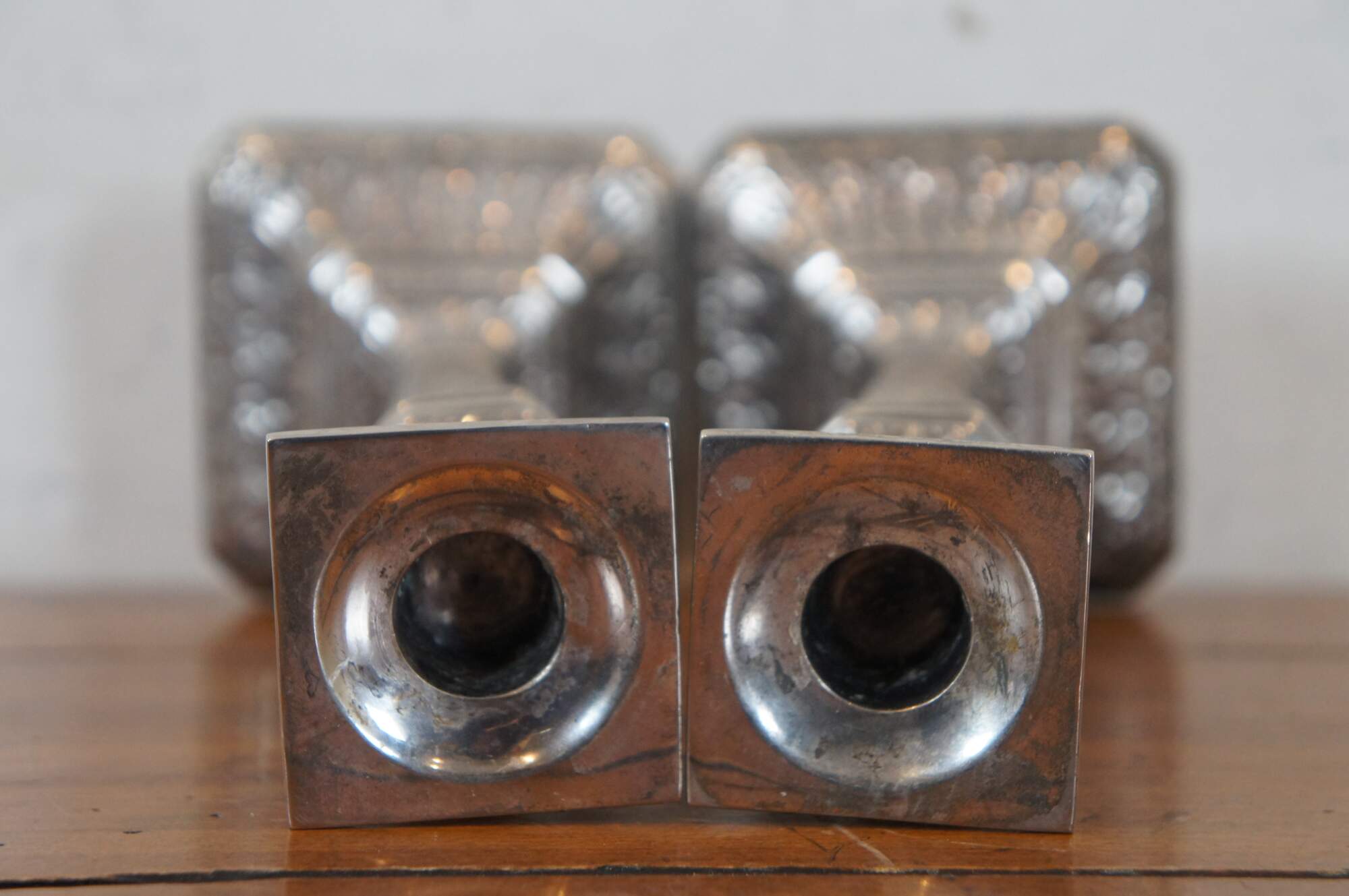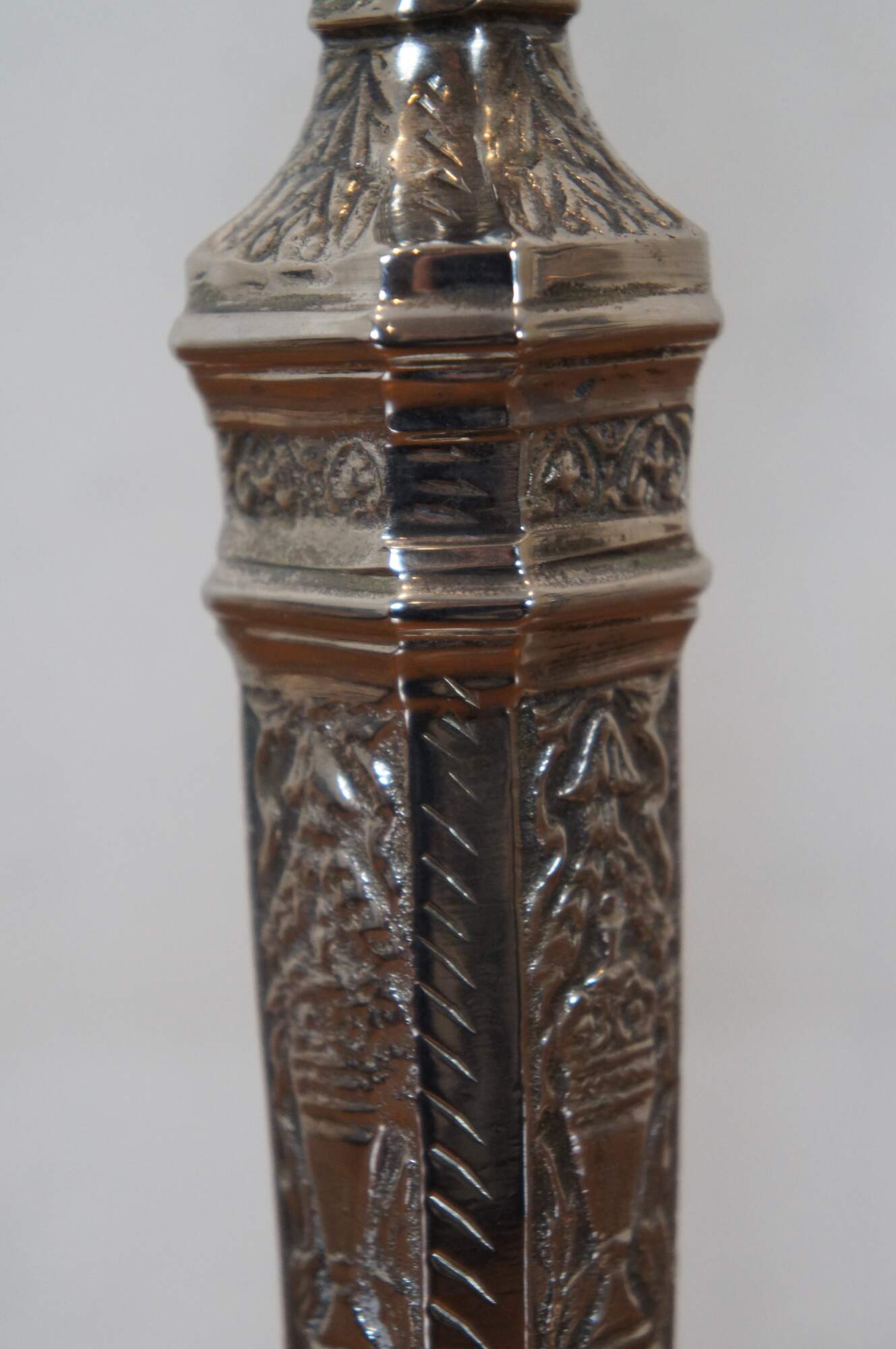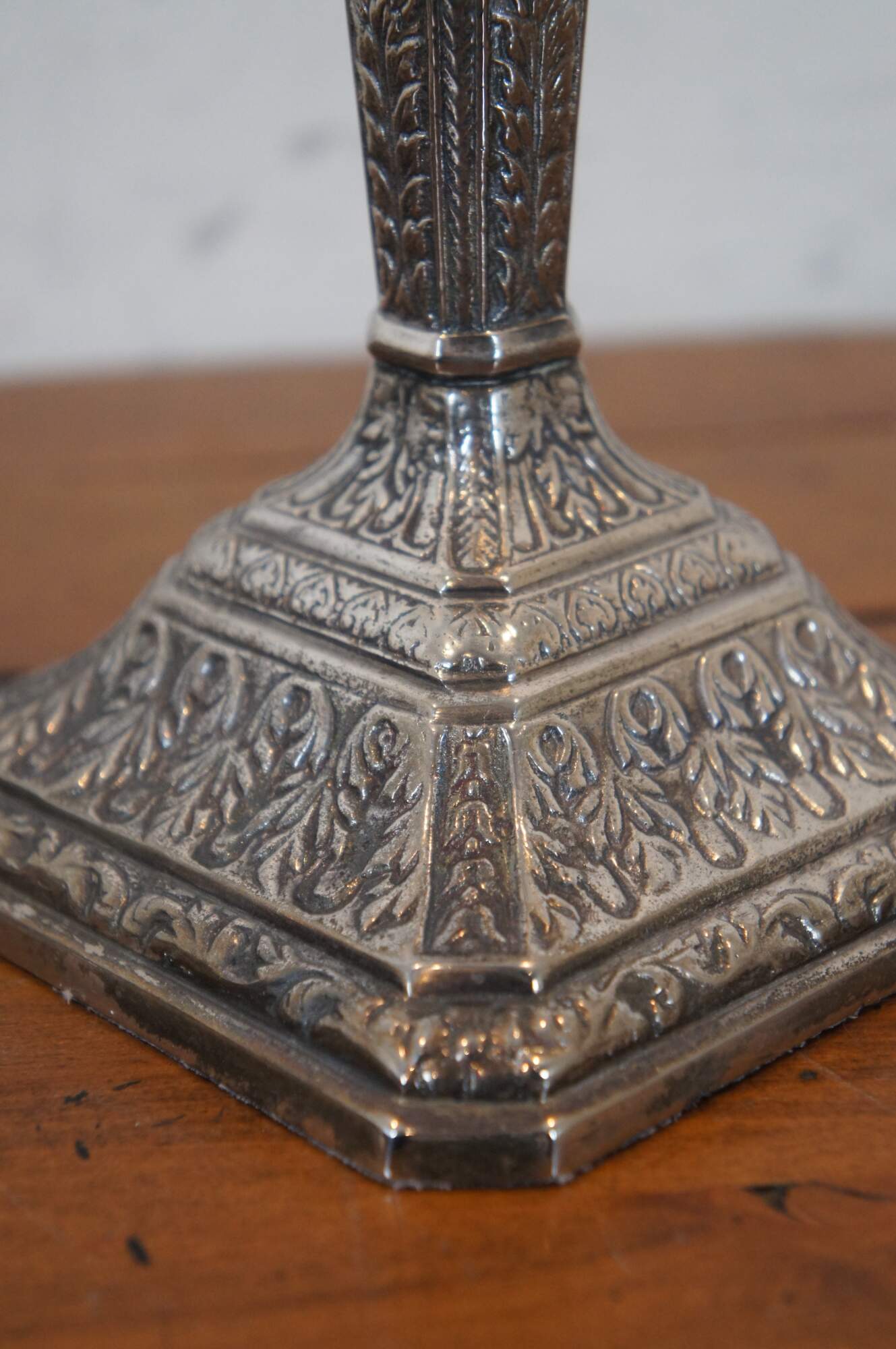 Pair of heavy, antique Georgian style repousse silver plate candlesticks / taper candle holders. Square cut corner base and tapered column with planter-urn shaped top, ornately decorated with swags of foliage, flowers and Neoclassical vases. Bottom of base covered in blue velvet.