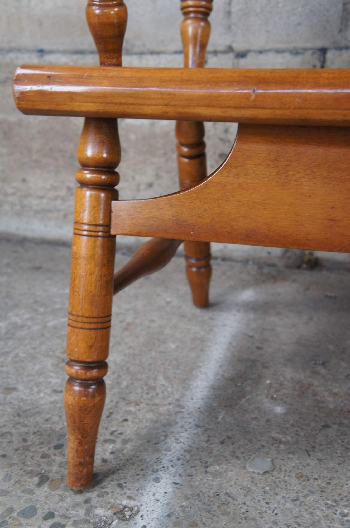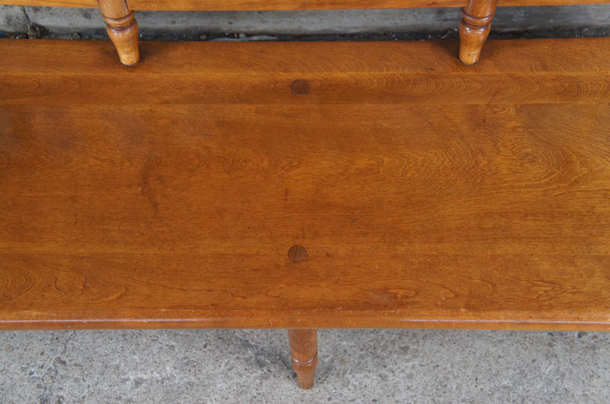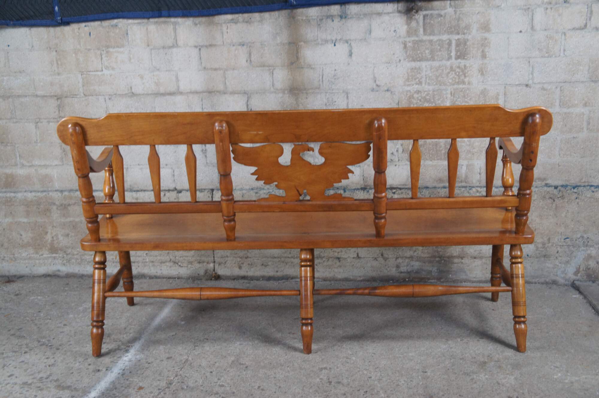 Vintage Cushman Colonial Creations settee bench. Made of maple featuring slatted back with sloped arms and carved eagle. # 6031.