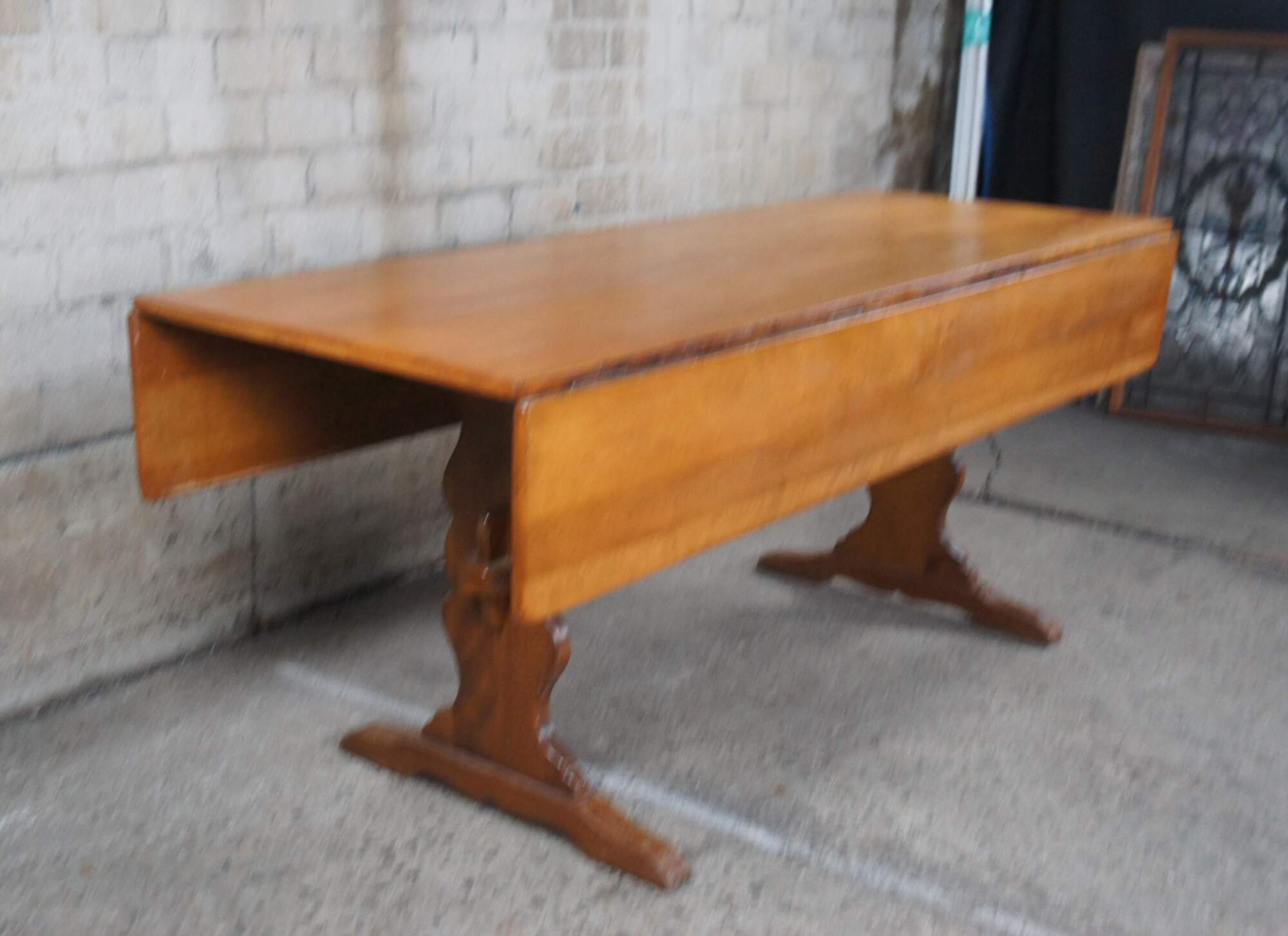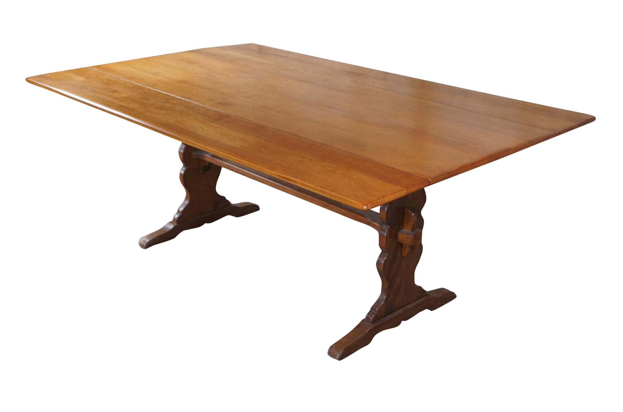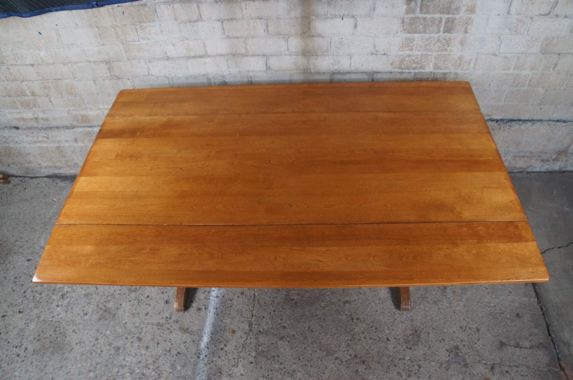 Vintage Cushman Colonial Creation drop leaf country farmhouse dining table. Made of rock maple featuring rectangular form with two large long drop leaves over a serpentine trestle base. A Genuine Cushman Colonial Creation made in Bennington Vermont.