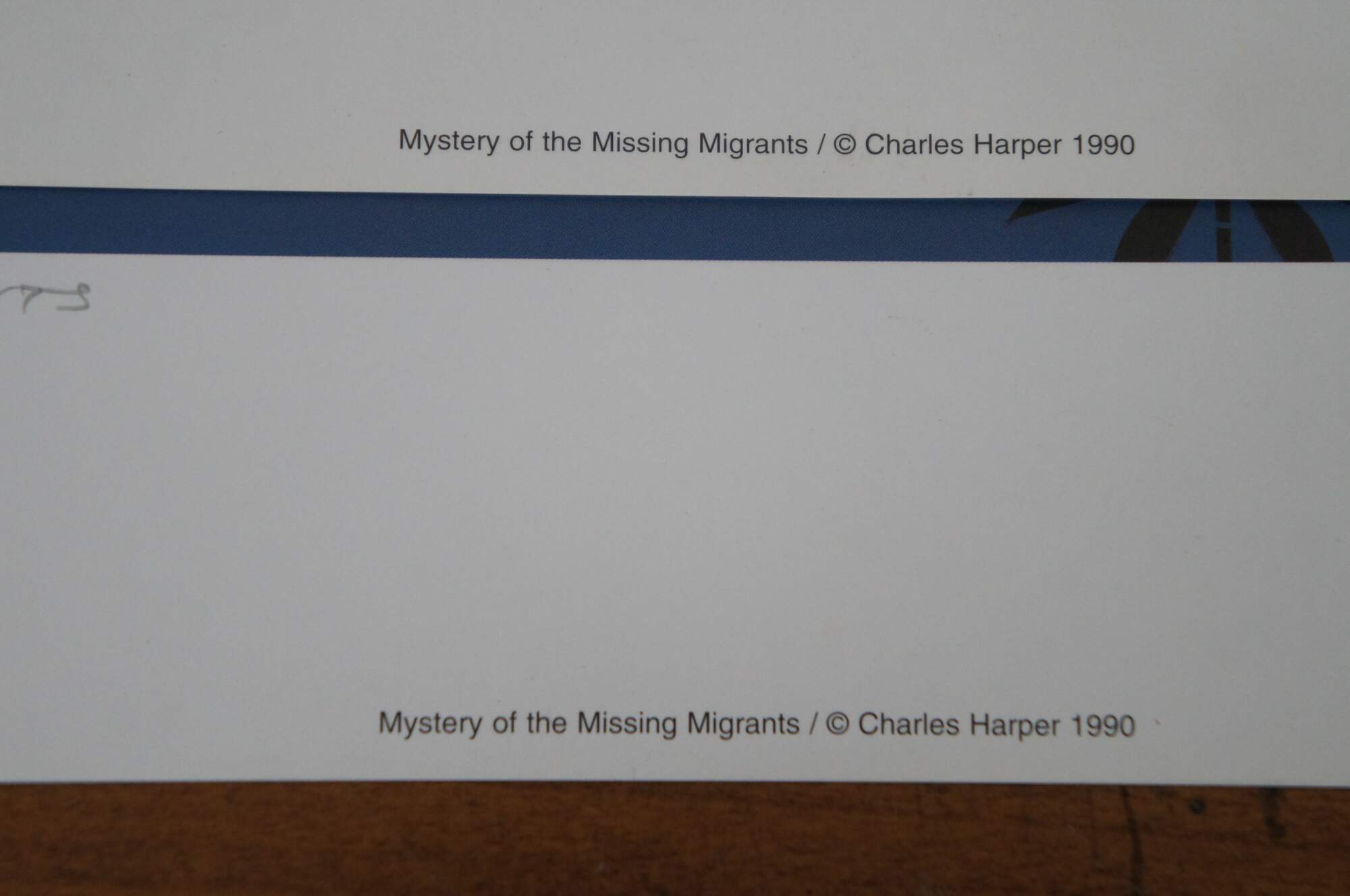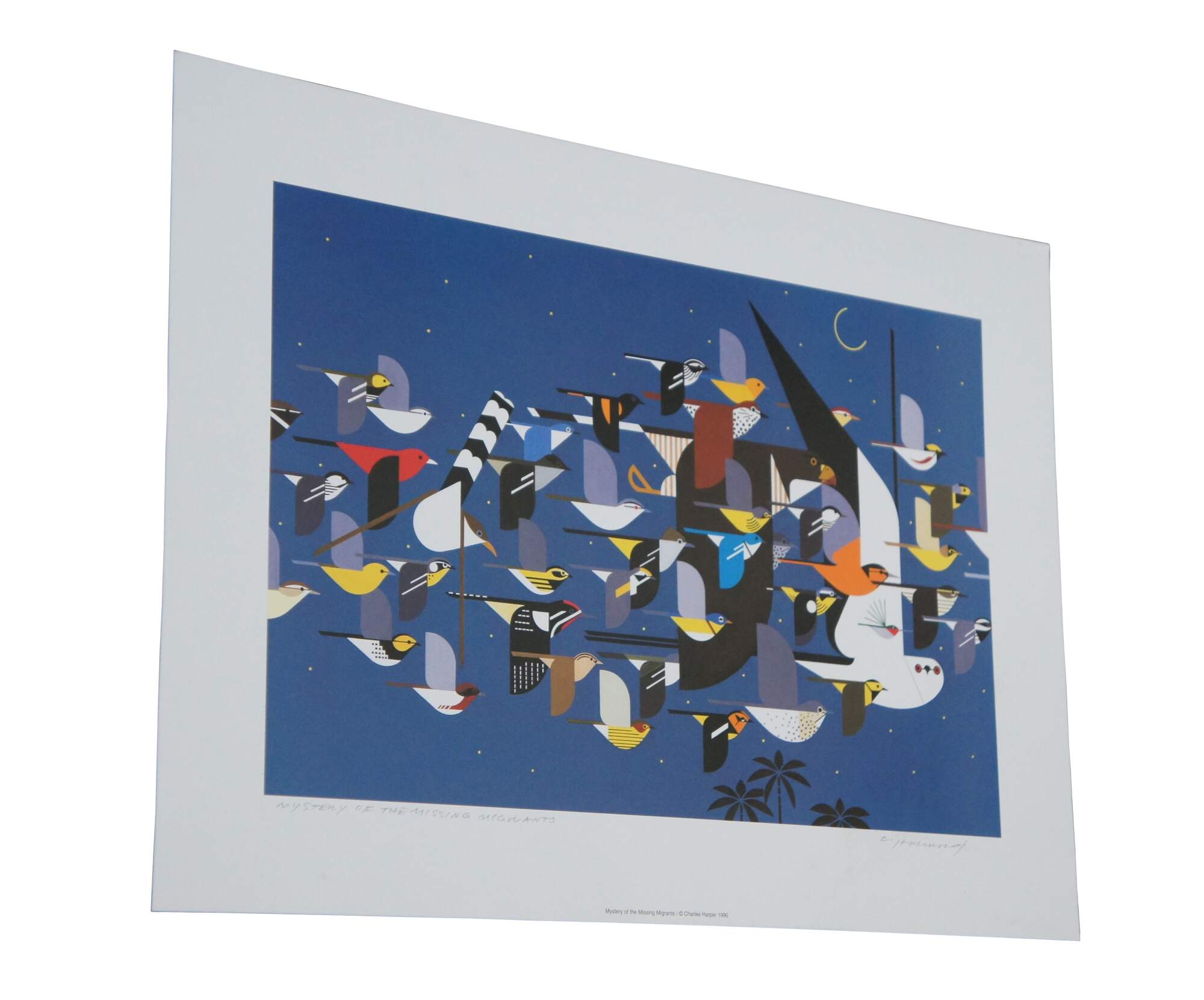 Vintage 1990 print of Mystery of the Missing Migrants by Charley Harper, showing a flock of a variety of migratory birds flying through a blue starry sky. Lithograph on paper. Pencil titled and signed.