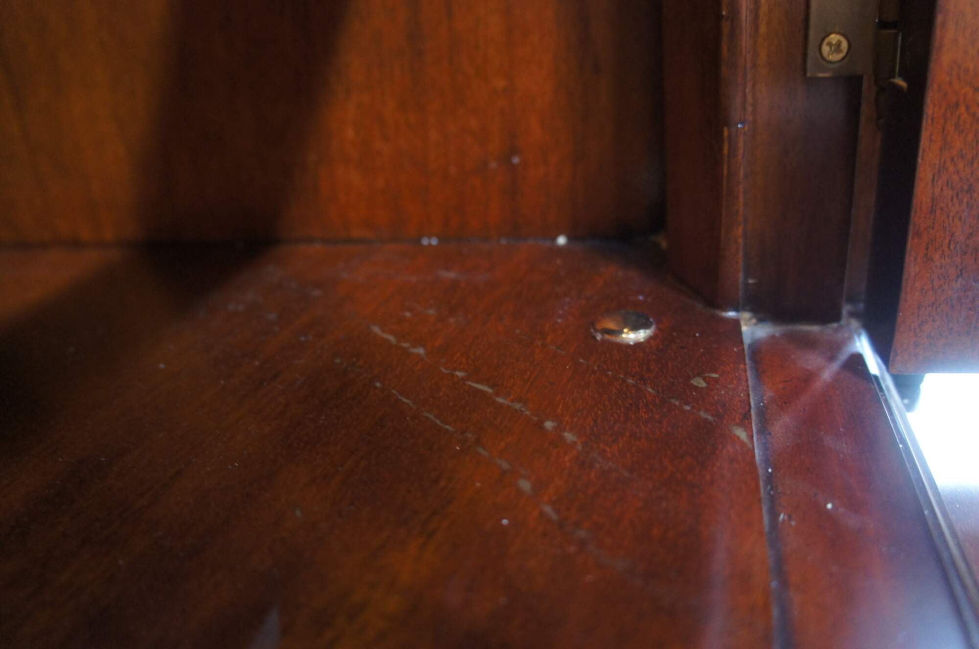 Ralph Laurens Noble Estate Bunching China 1840-22 , circa last quarter 20th century. An exceptional display cabinet drawing inspiration from English Georgian and Chippendale styling. Made from mahogany with two outer cabinets that break forward from the central unit adding depth and dimension. Features an illuminated interior with brass lattice covered doors and wooden shelves with glass inserts. The lower cabints showcase flame mahogany doors flanked by beautifully turned columns. Opens to shelving for additional storage and a silverware drawer. Interior lighting is adjusted to one of three settings by the touch of a button. Lattice brass hinges open for ease of cleaning the glass.