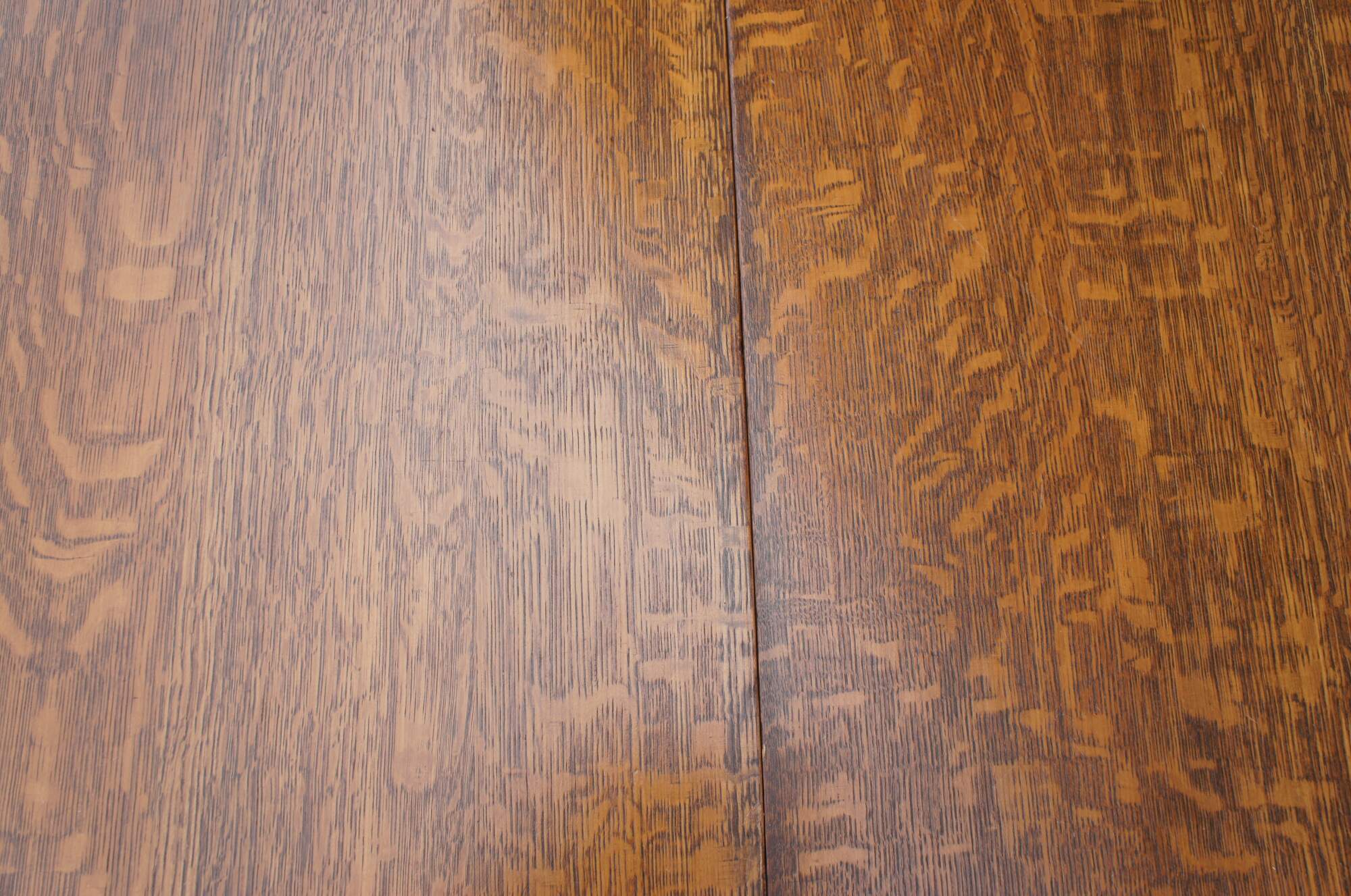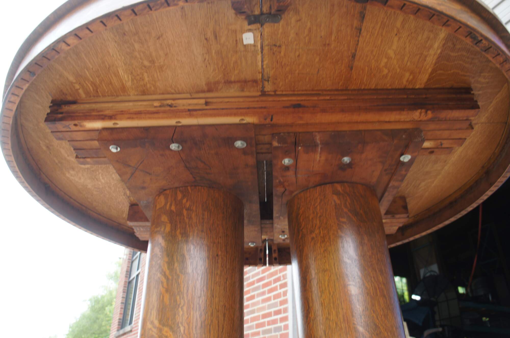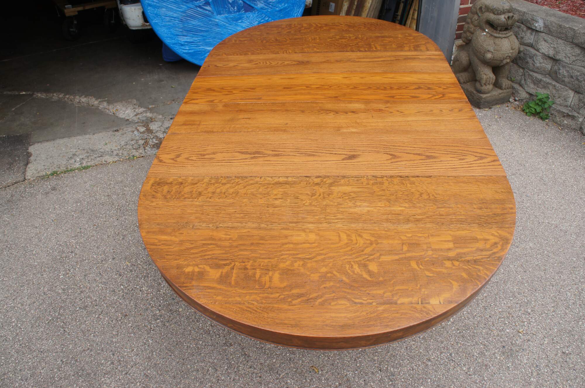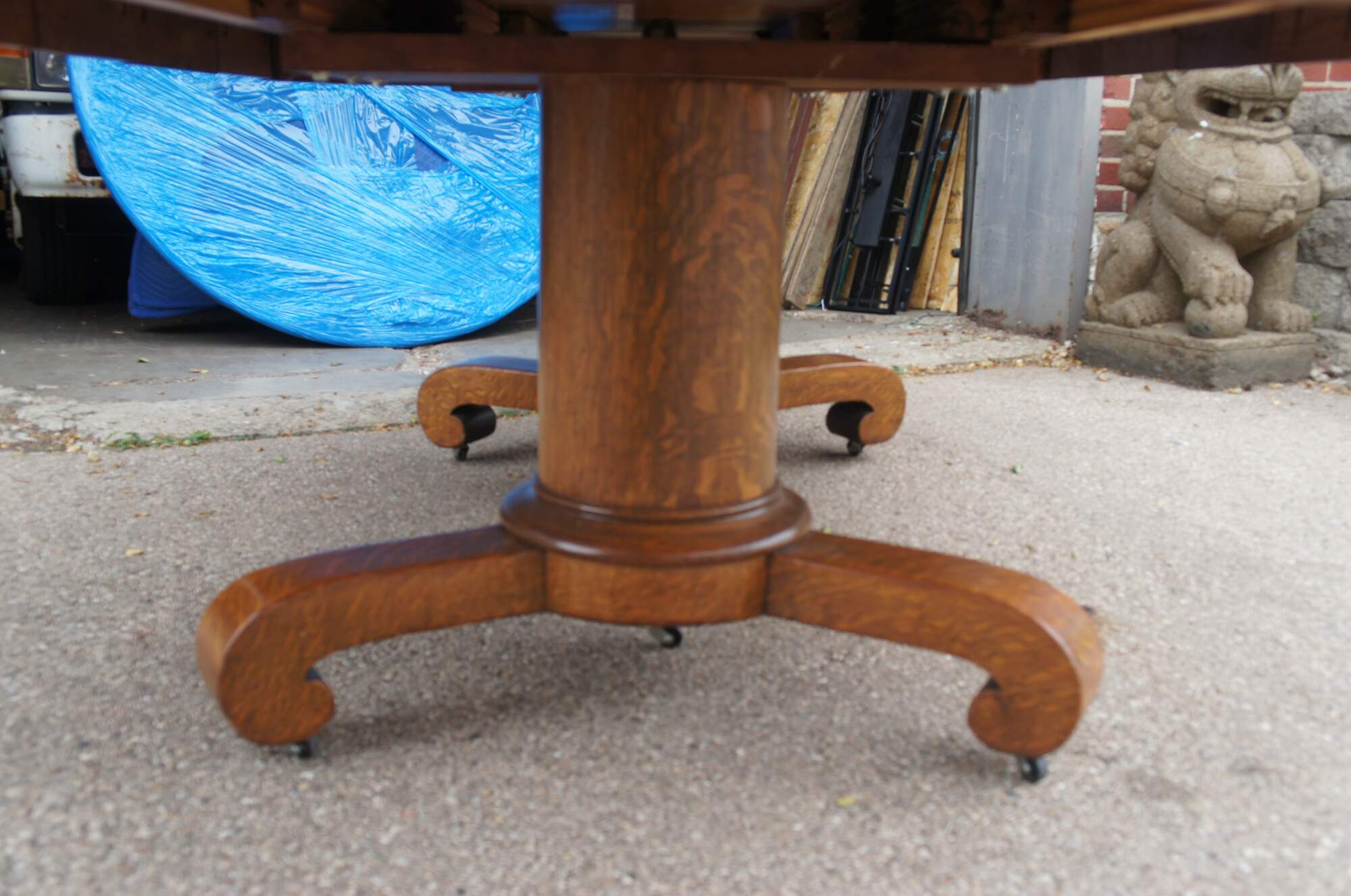 Late 19th century American Empire / Mission double pedestal dining table. Made from Quartersawn Oak. Features an extendable oval top over thick cylindrical pedestal bsses with scrolled feet. Includes 4 leaves for extension. Table is on casters for ease of movement.