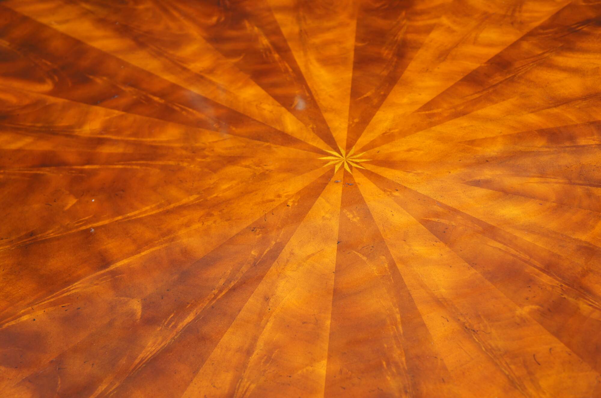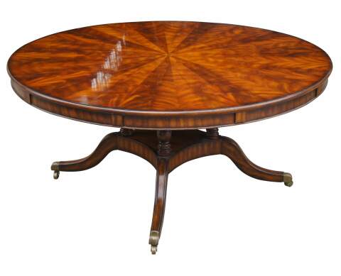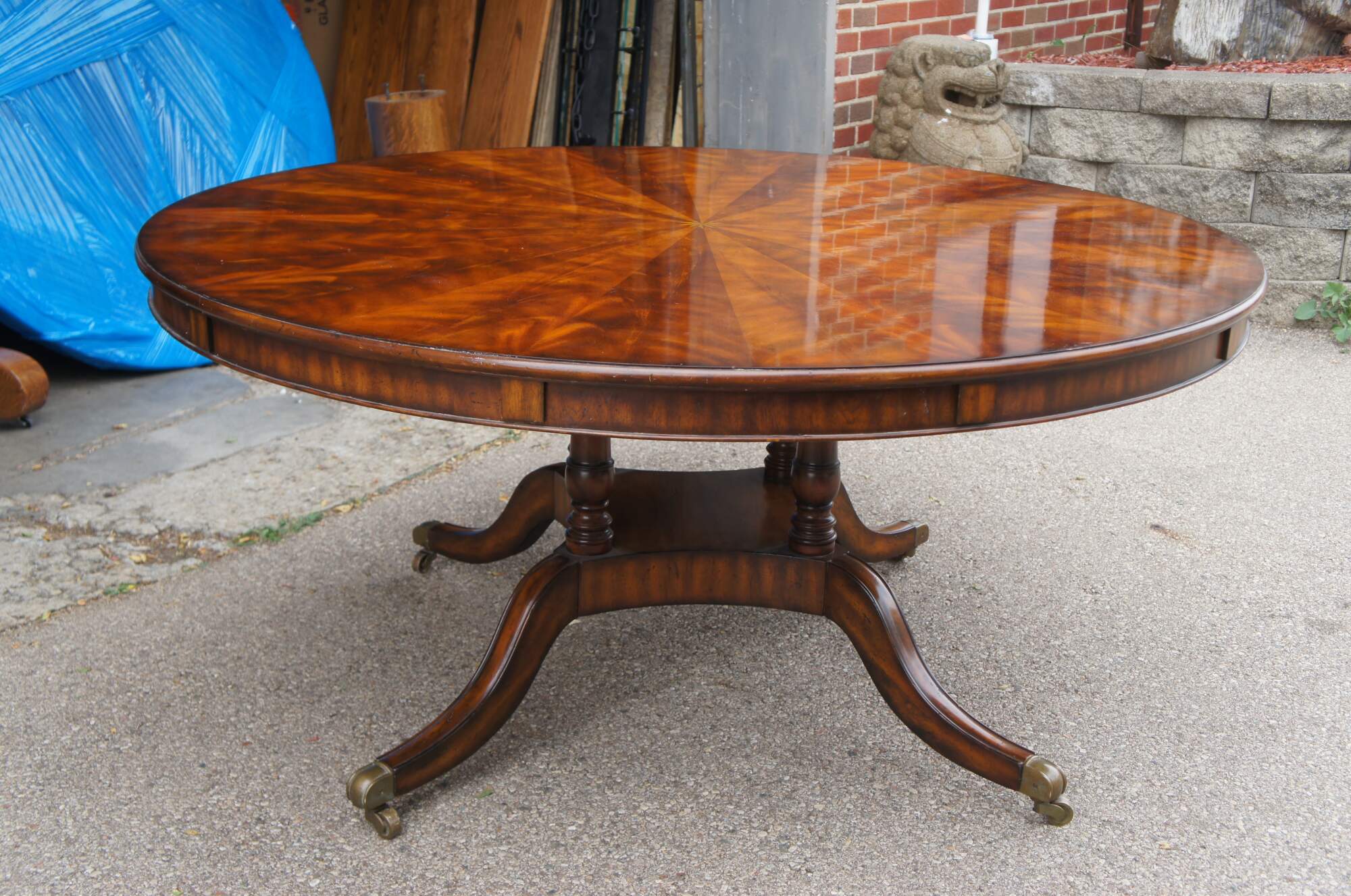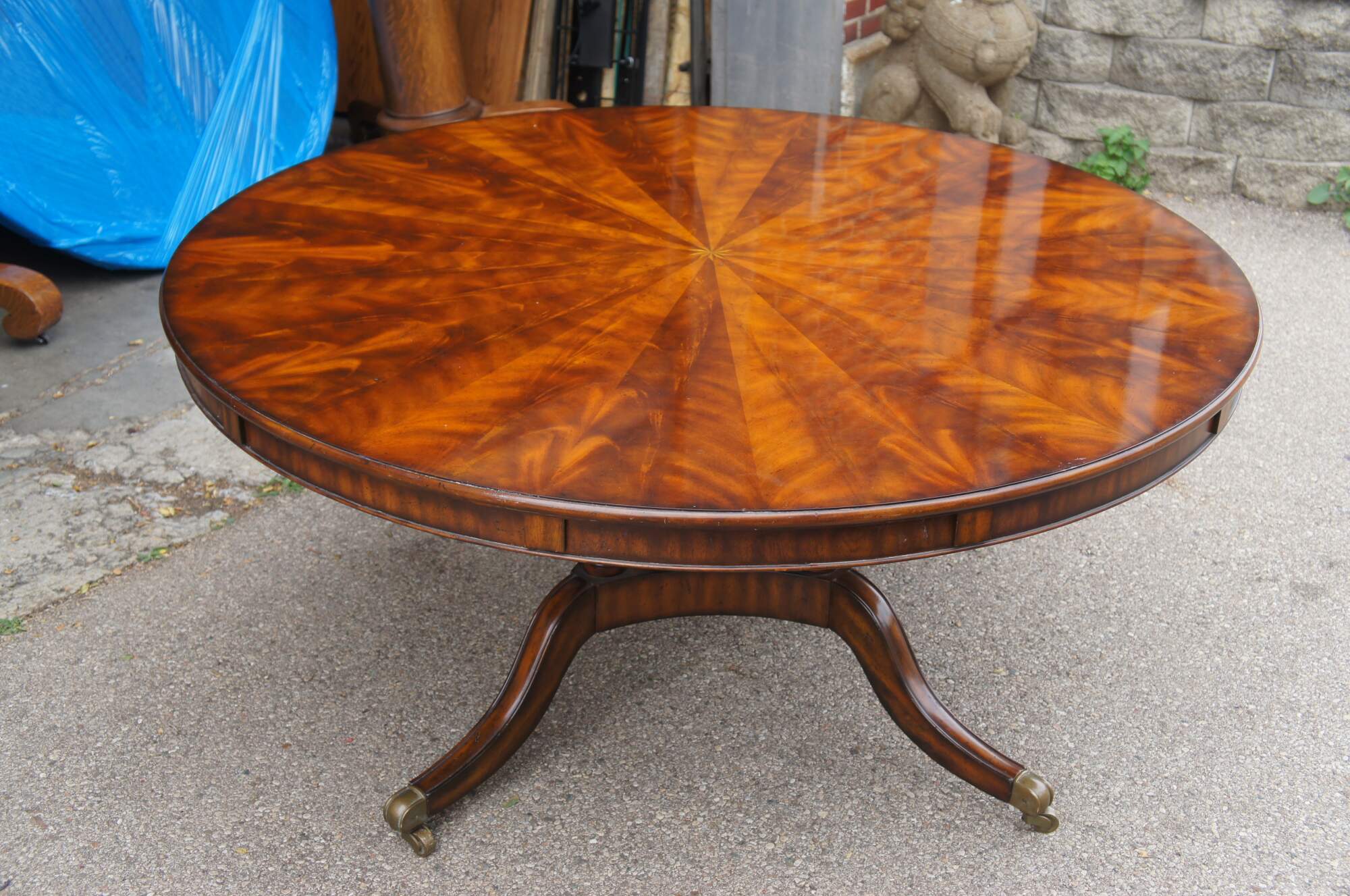 Maitland Smith Roundabout Dining Table. Inspired by English Regency styling. Features a two tone crotch mahogany extendable top with star inlay at the center over a birdcage base with turned baluster supports leading to downswept legs with brass casters. The table extends by pulling out the square extensions along the apron and inserting the (5) crescent shaped leaves. Aged / Distressed finish. Extends from 64-88