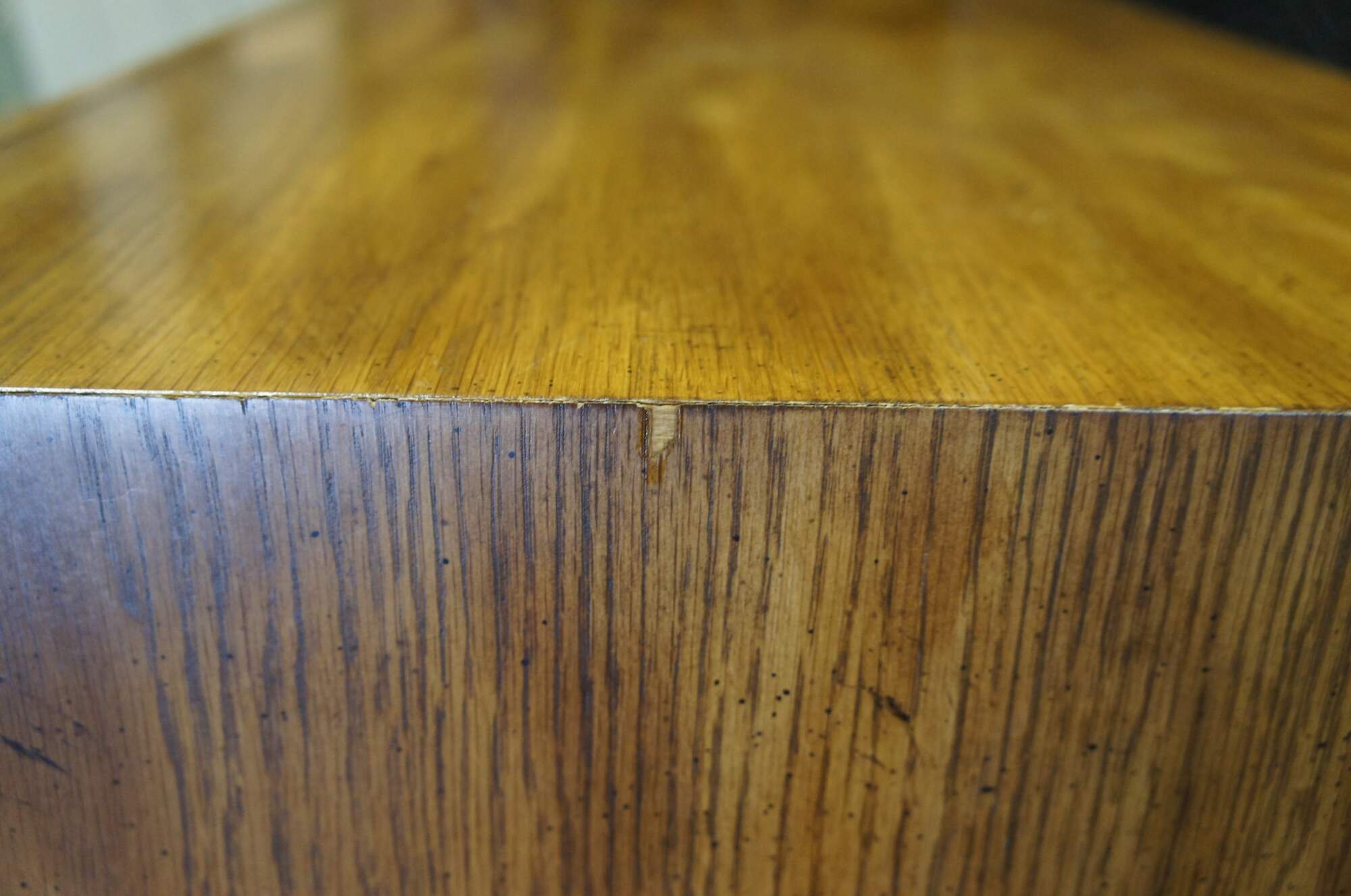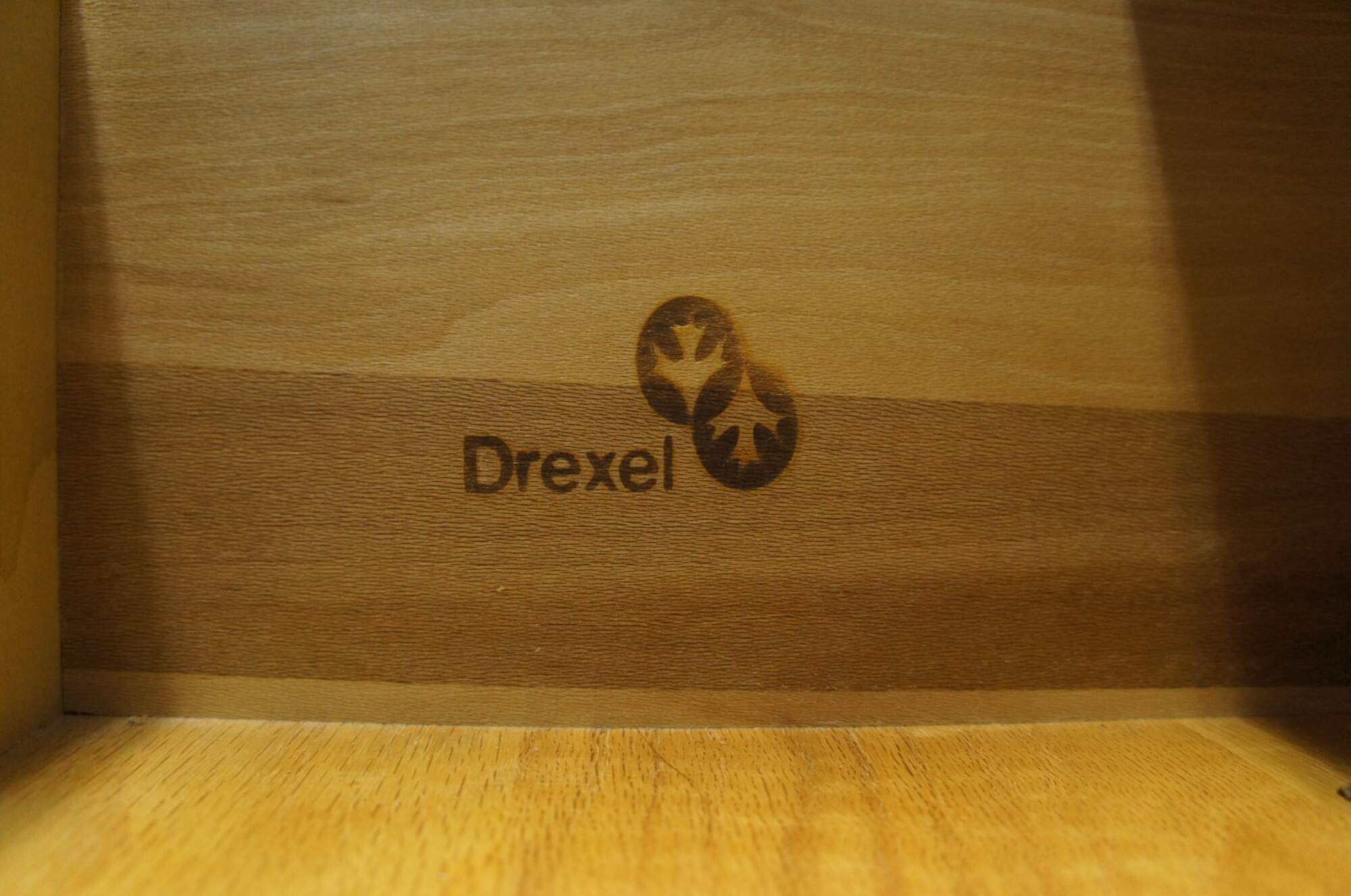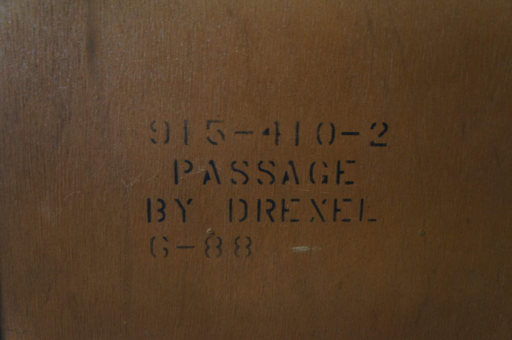 Drexel Heritage Passage Collection Highboy Dresser, circa 1988, no 915-410-2. Features a rectangular frame made from oak with 5 dovetailed drawers featuring inset brass drawer pulls. A great addition to any mid century modern space.