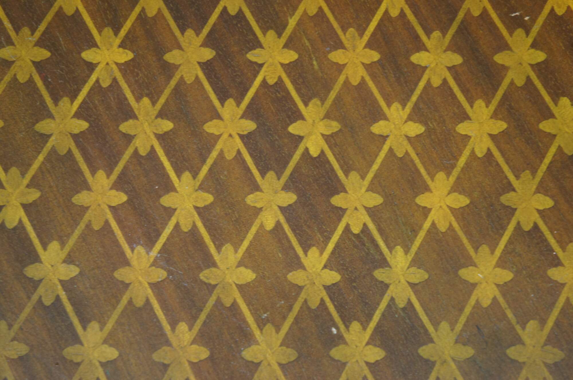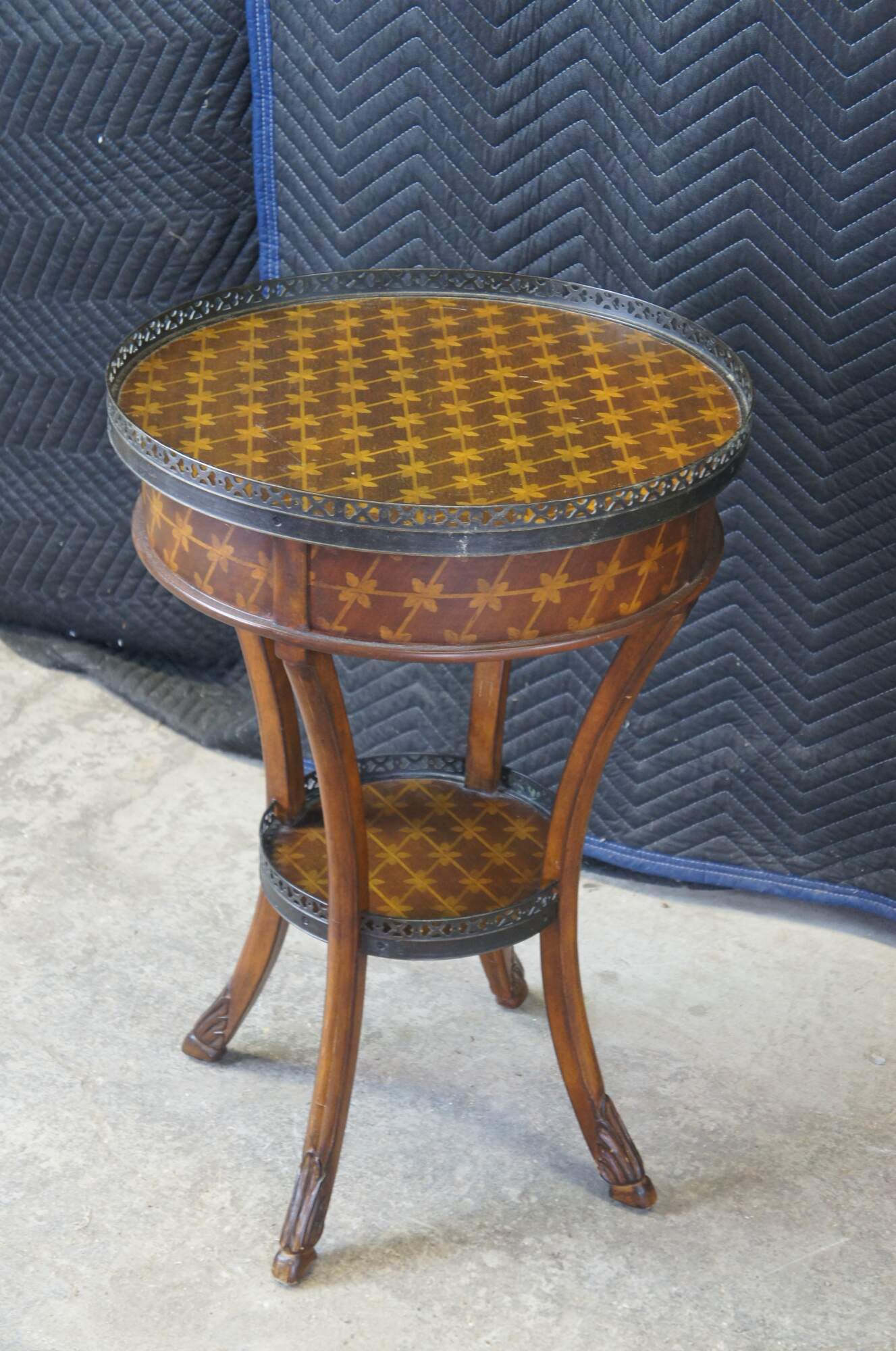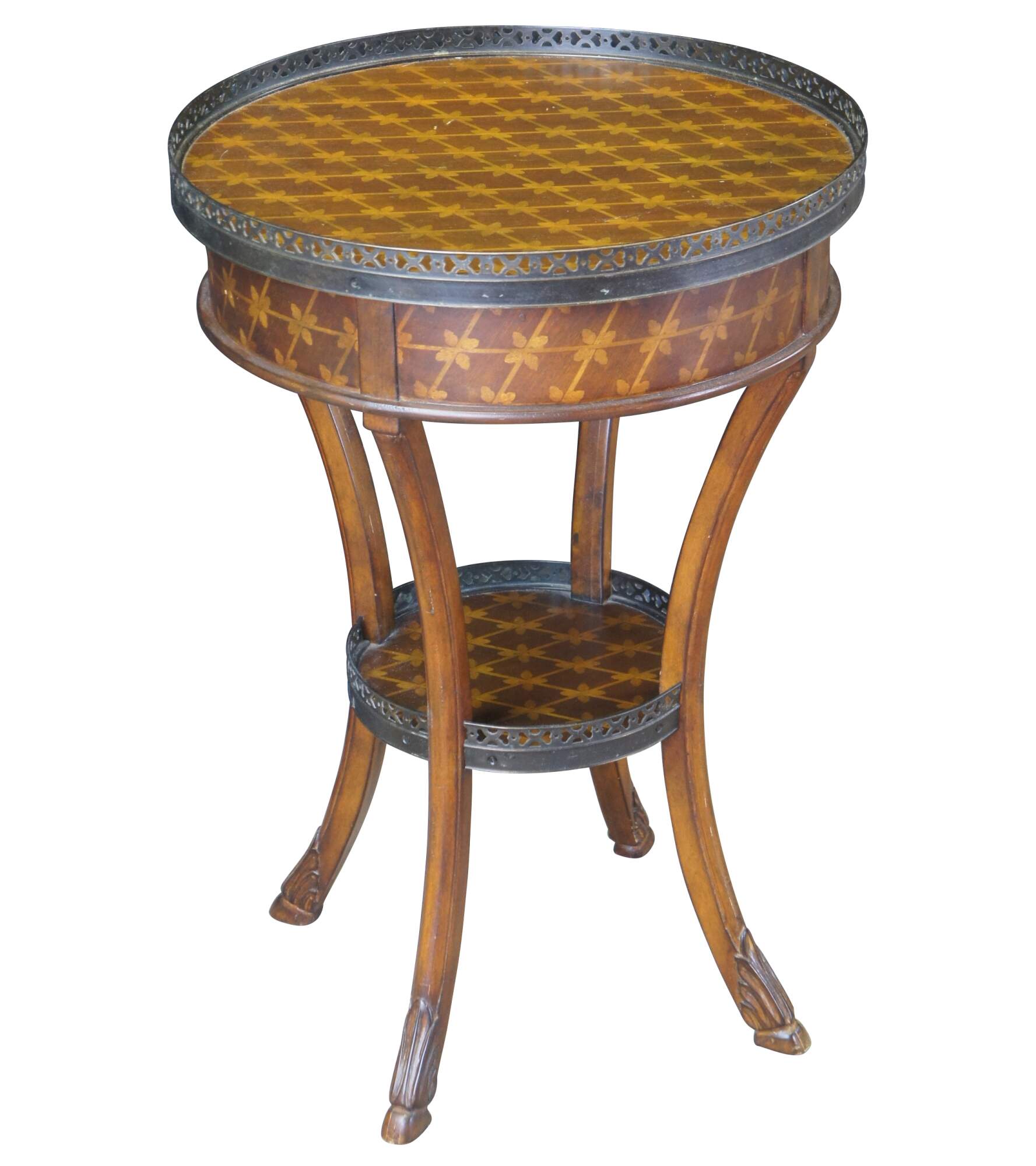 A lovely French inspired side table by Maitland Smith. Features a round form with two tieres with a metal piered gallery. Made from mahogany with a diamond pattern marquetry inlay. The table is supported by downswept legs with acanthus carved designed and hoof feet.
