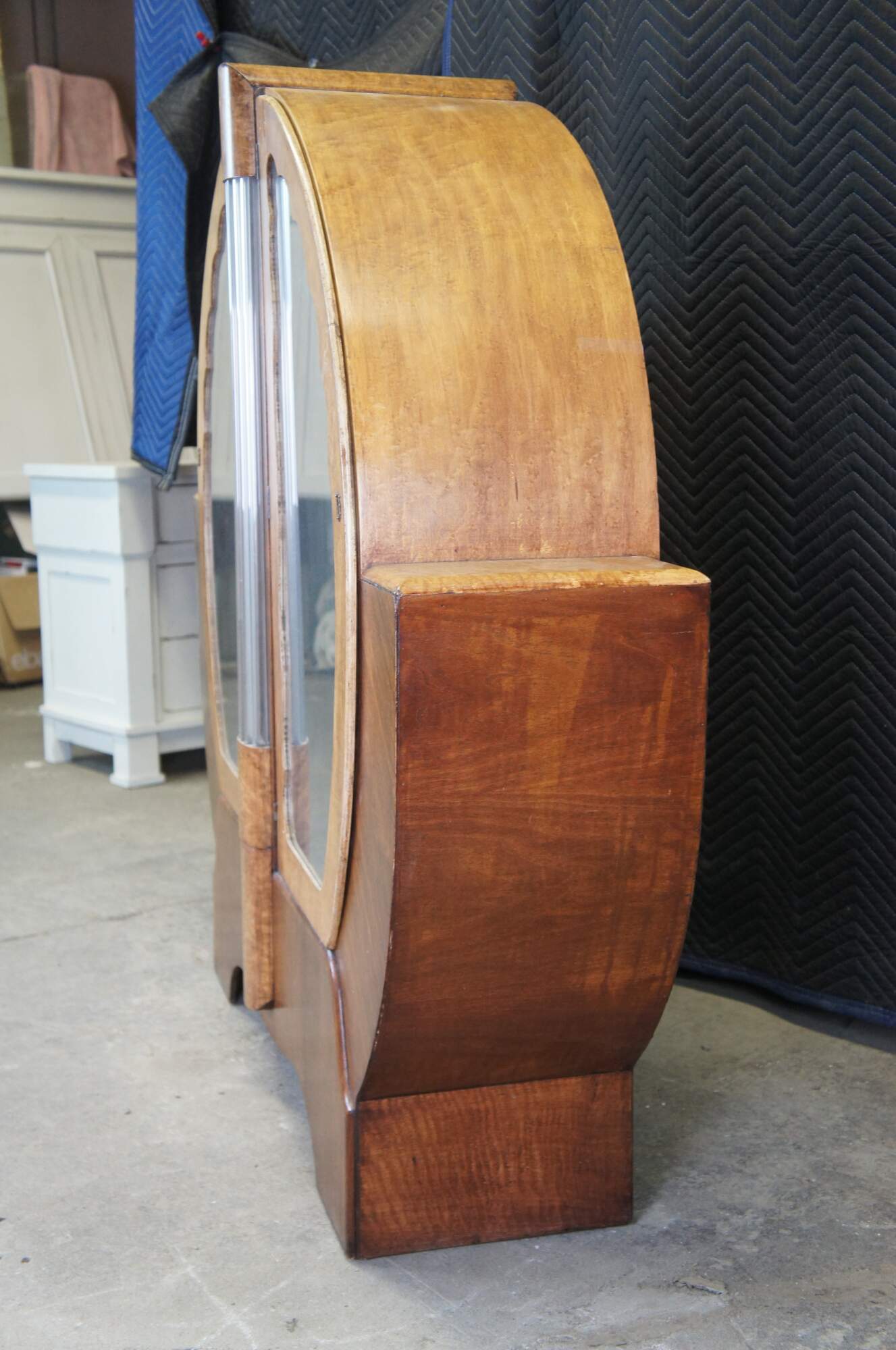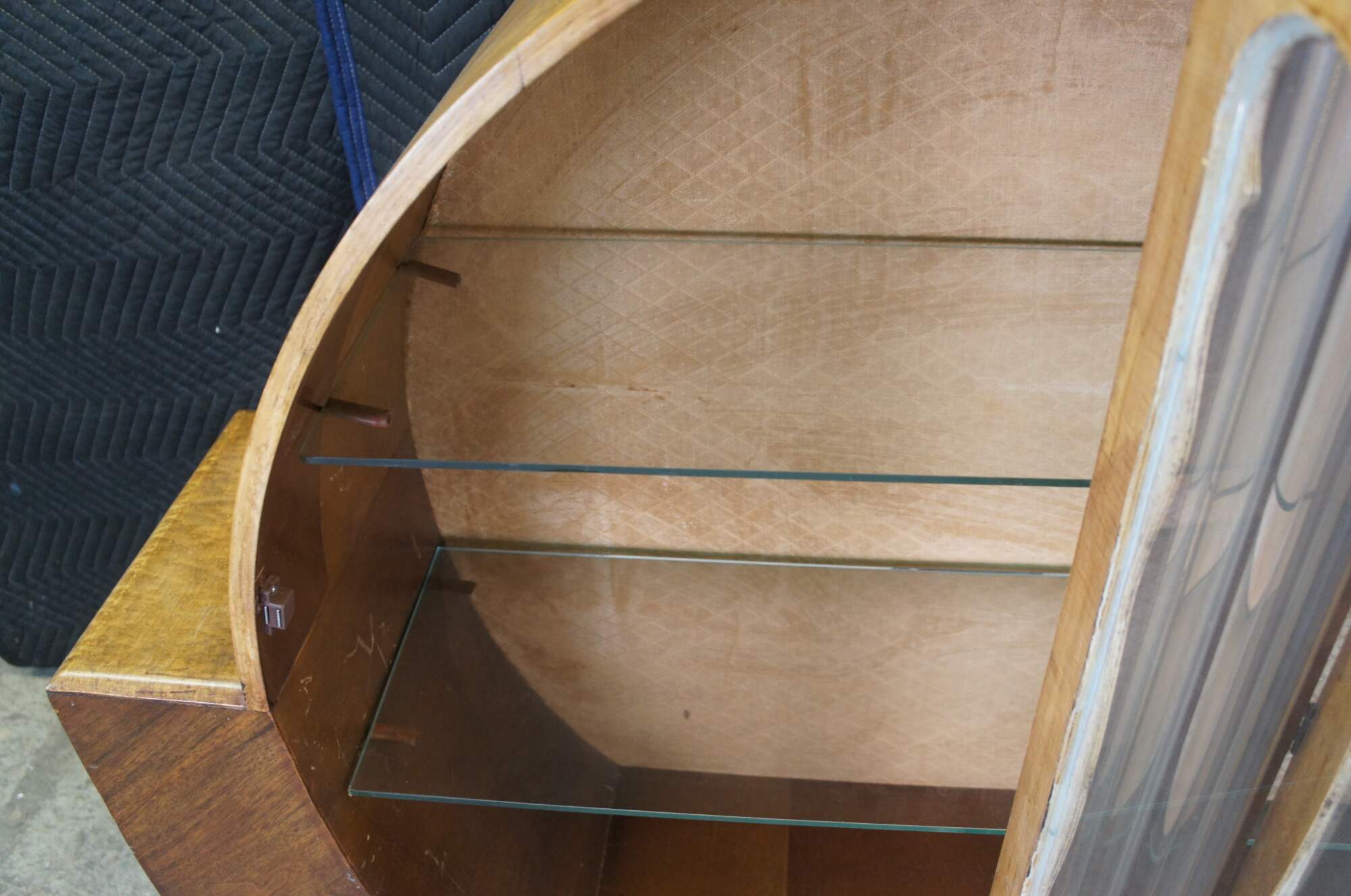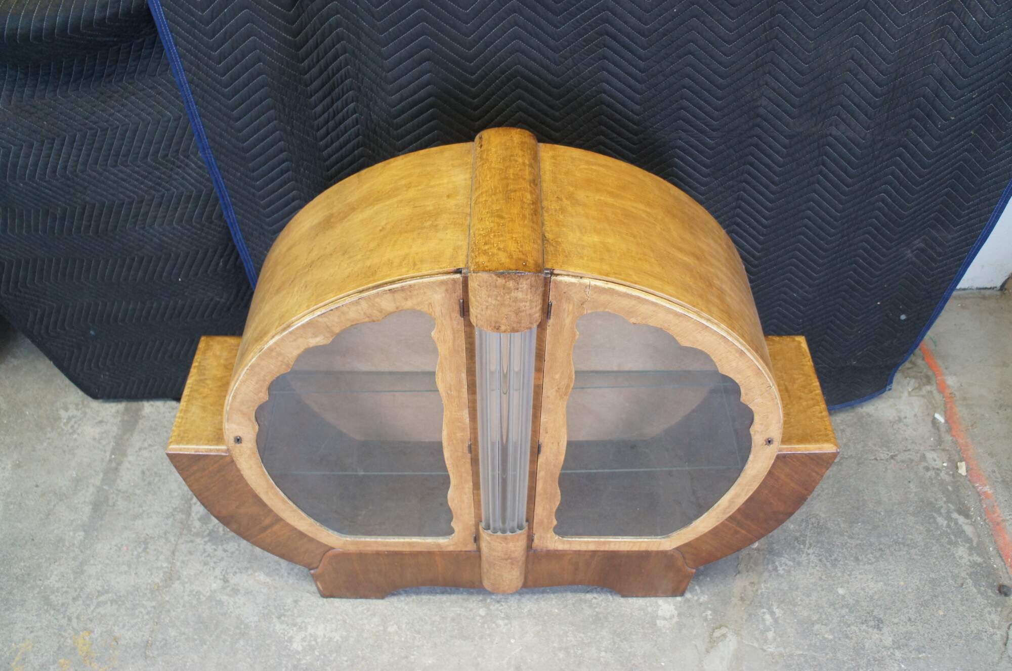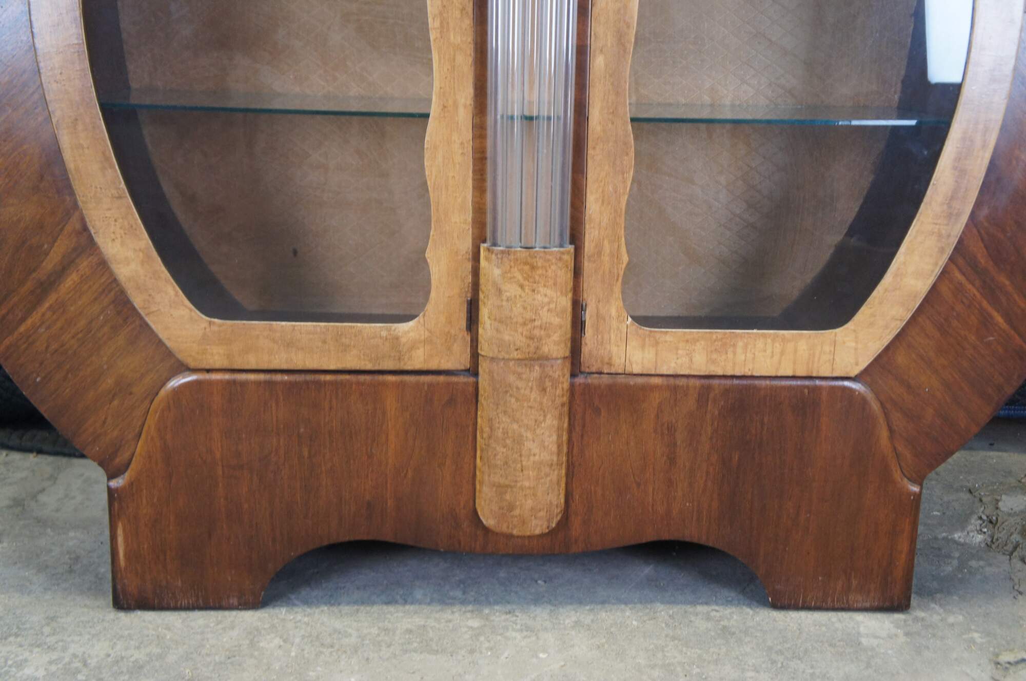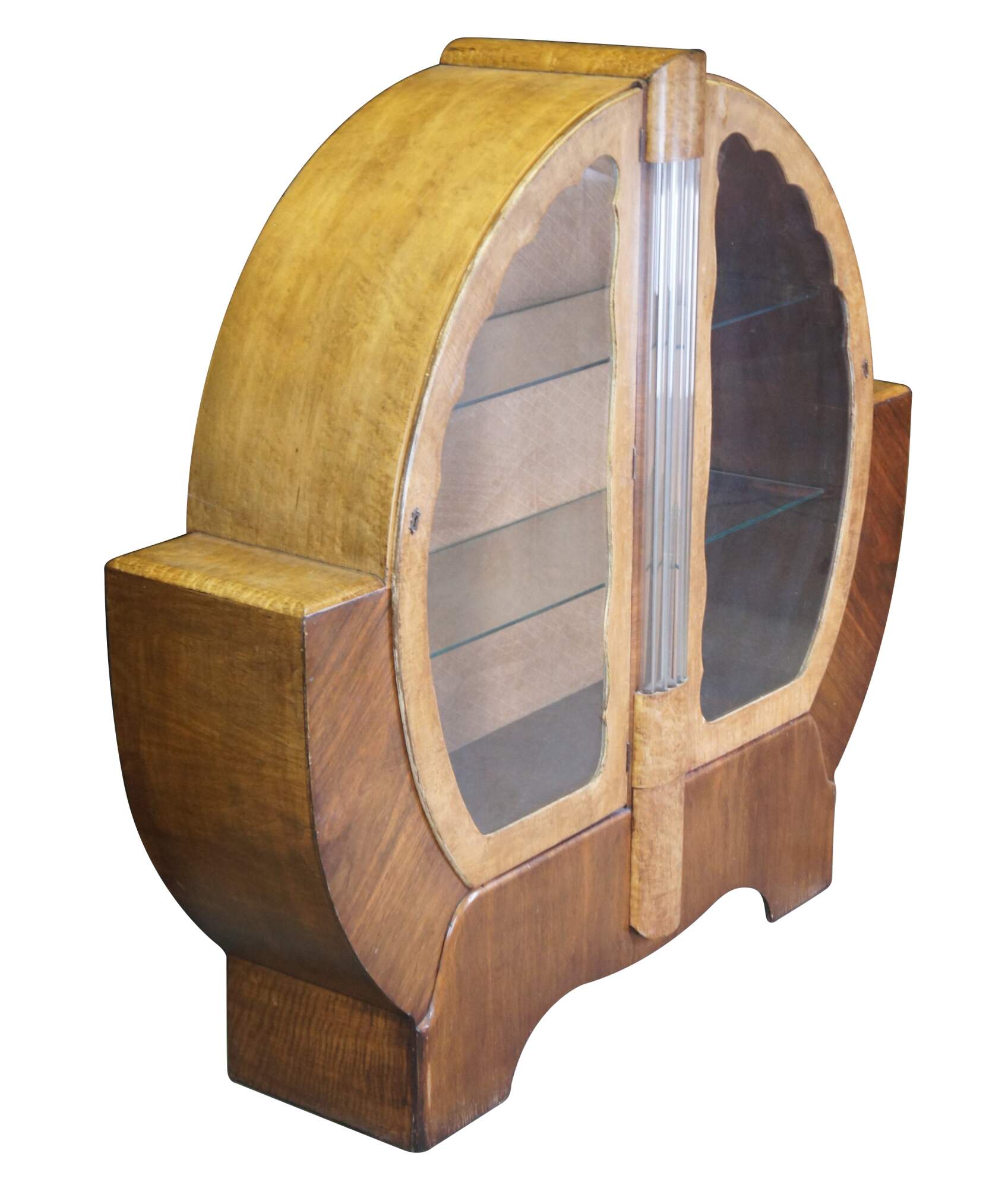 An exquisite English Art Deco showcase or bar cabinet, circa 1930s. Made from walnut and maple with a two tone rounded geometric form featuring 2 glass shelves and tubular glazed glass centerpiece. Glass shelves are fitted with polished edge. Includes original backing with lattice (diamond) pattern design.
