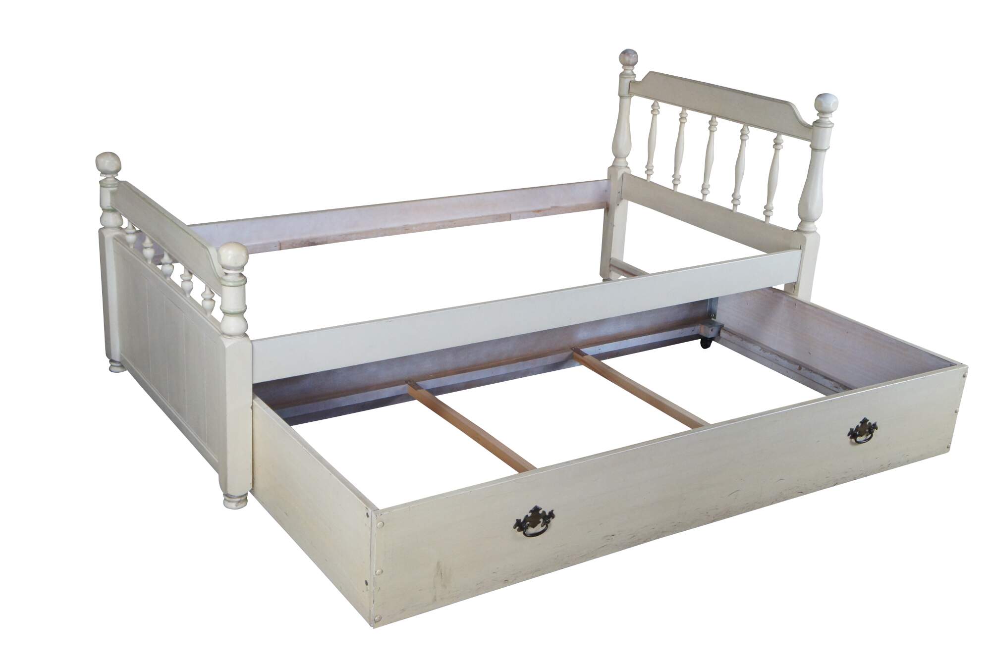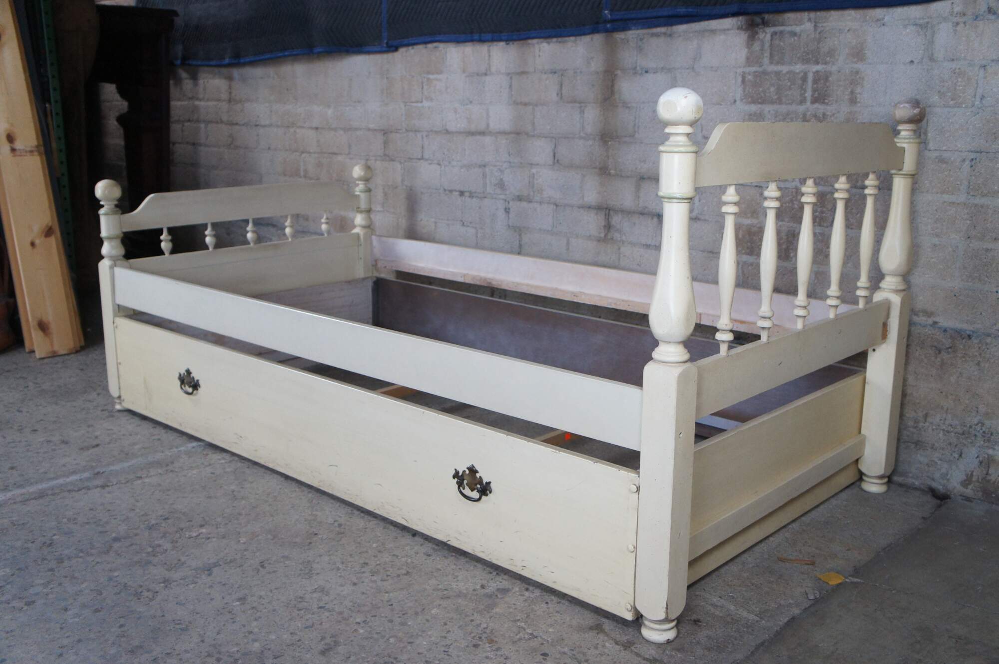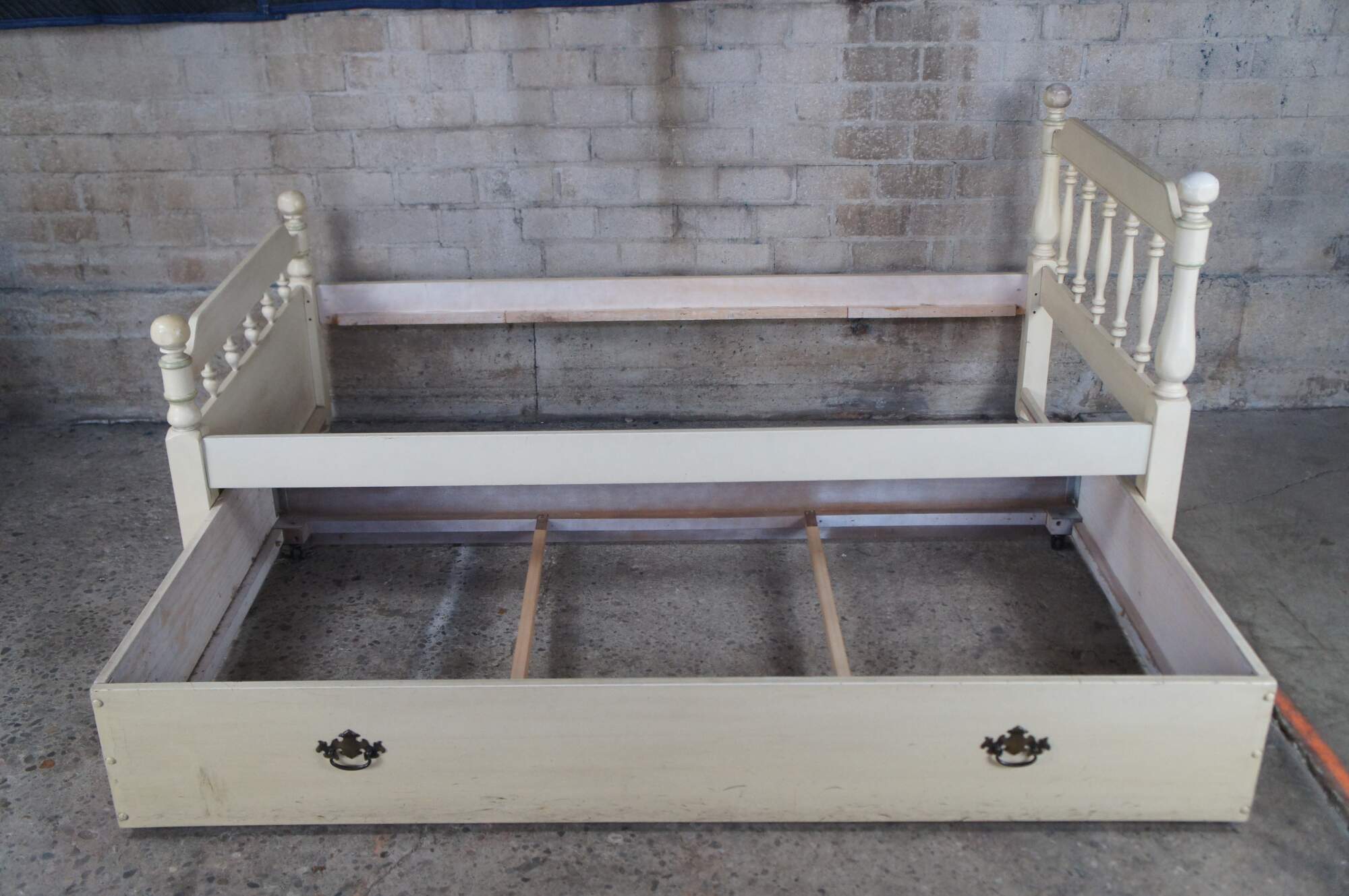 A charming French Provincial farmhouse twin size trundle bed, circa 1960s. Features solid wood, cannonball posts, turned spindles and pull out trundle.