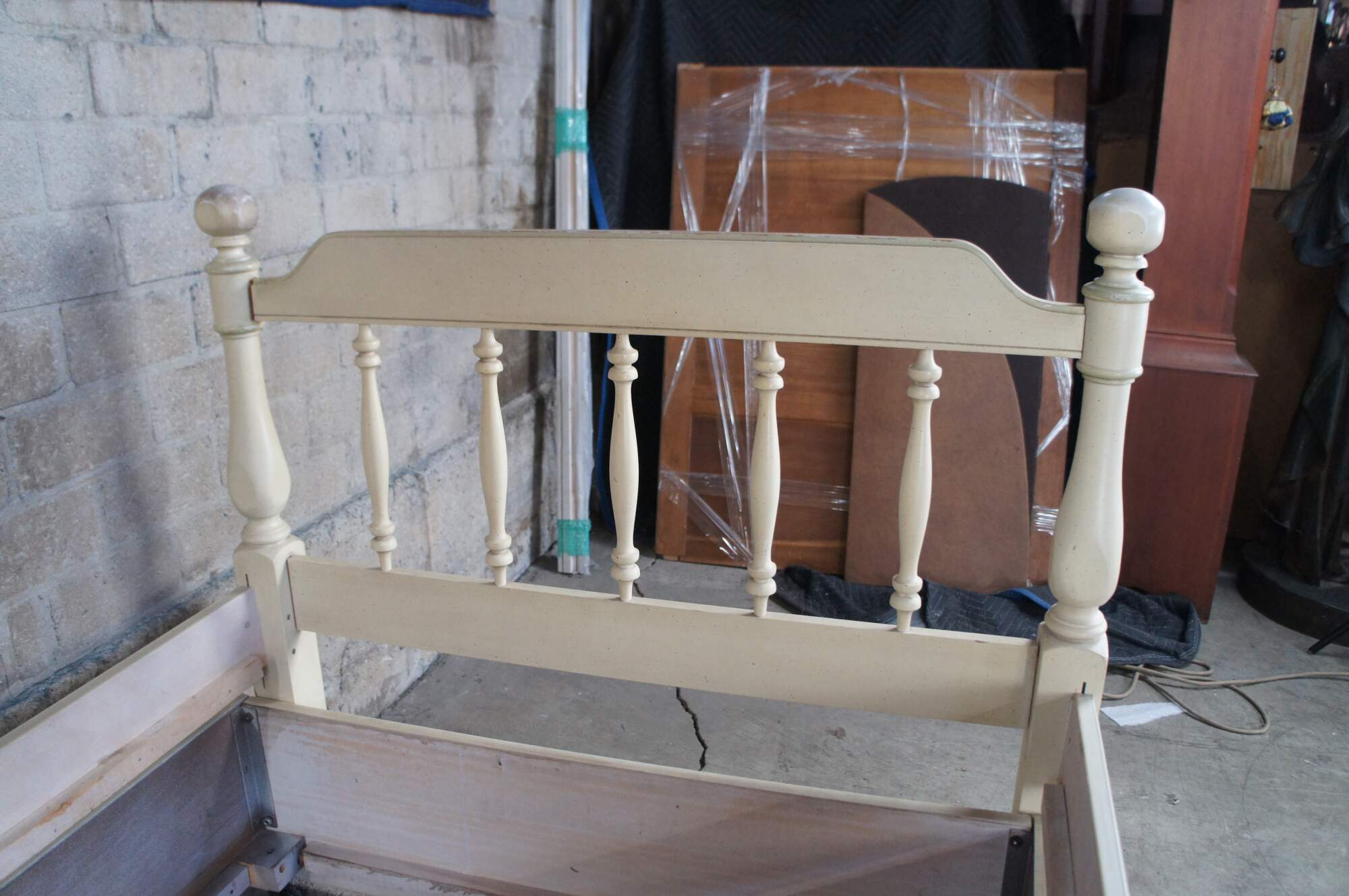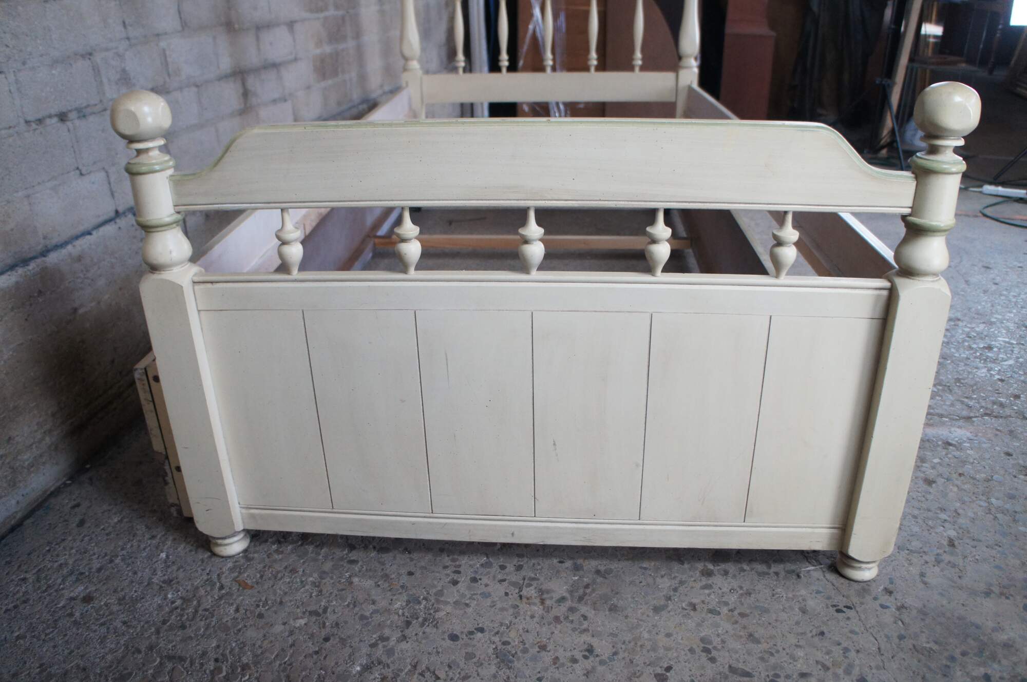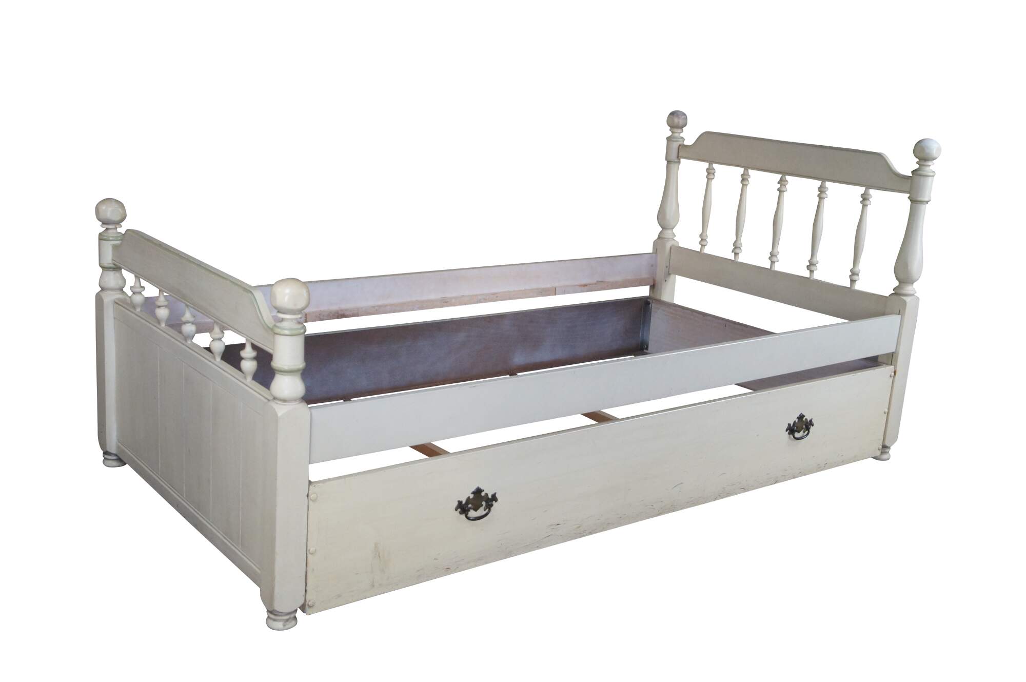 A charming French Provincial farmhouse twin size trundle bed, circa 1960s. Features solid wood, cannonball posts, turned spindles and pull out trundle.